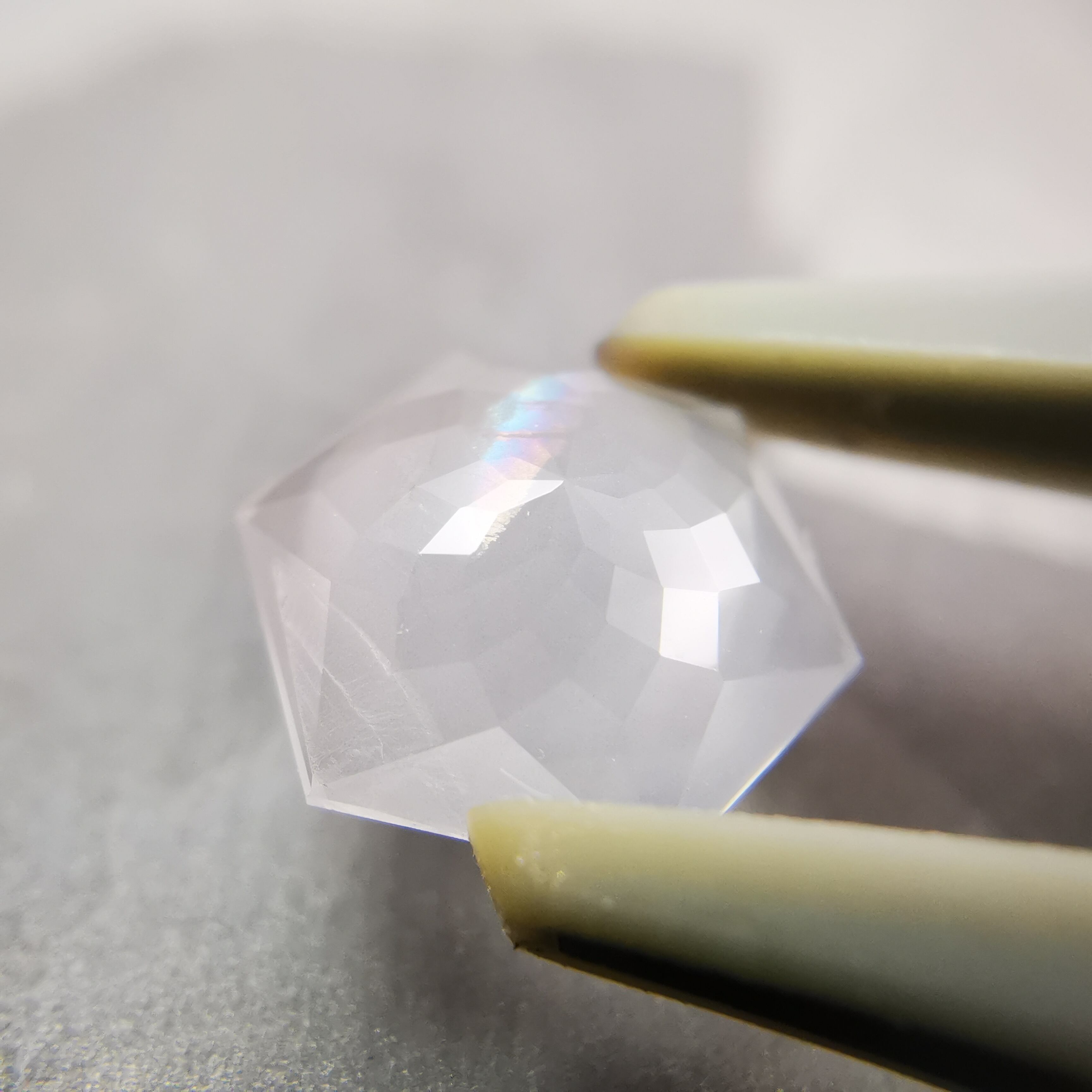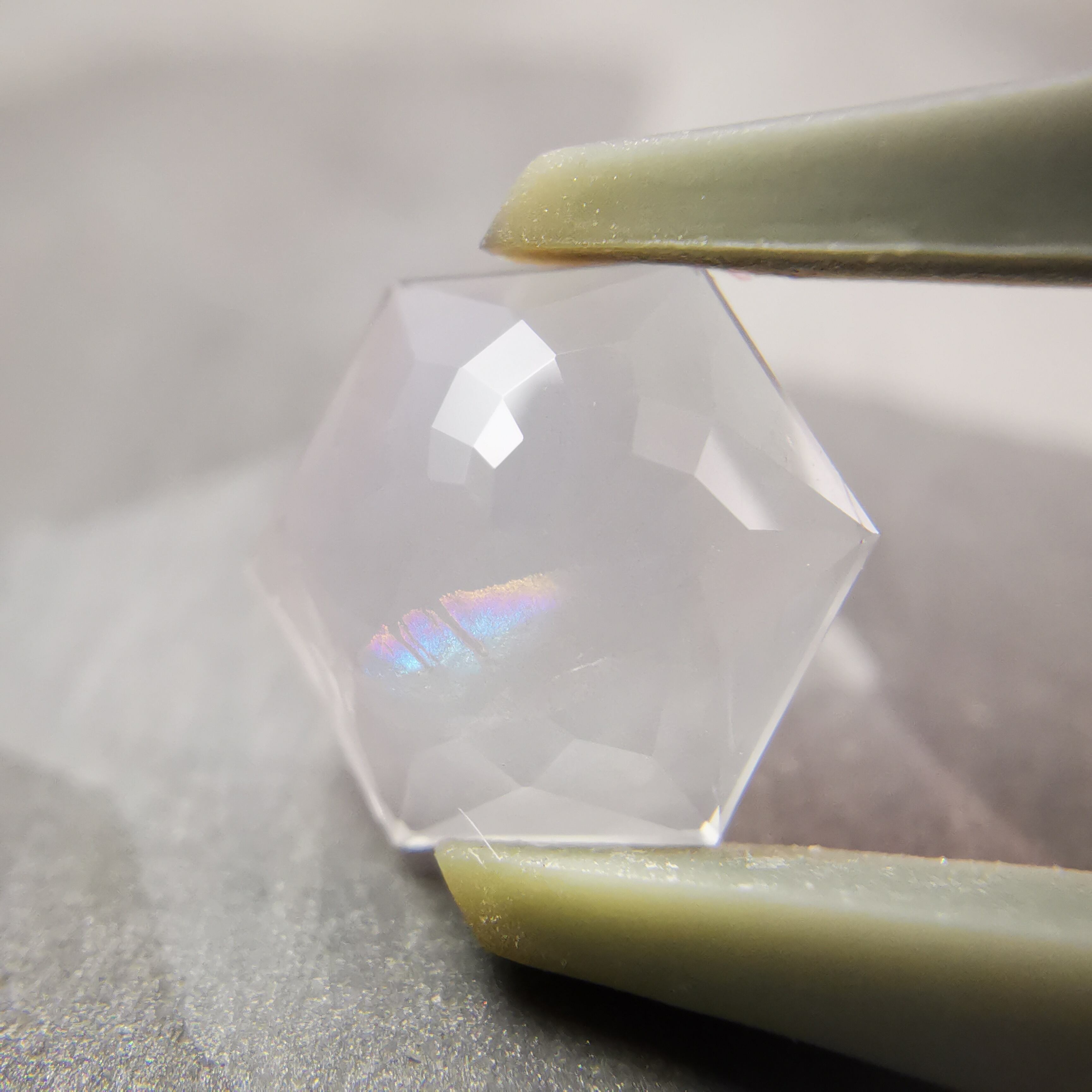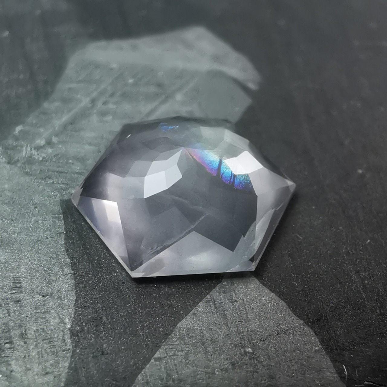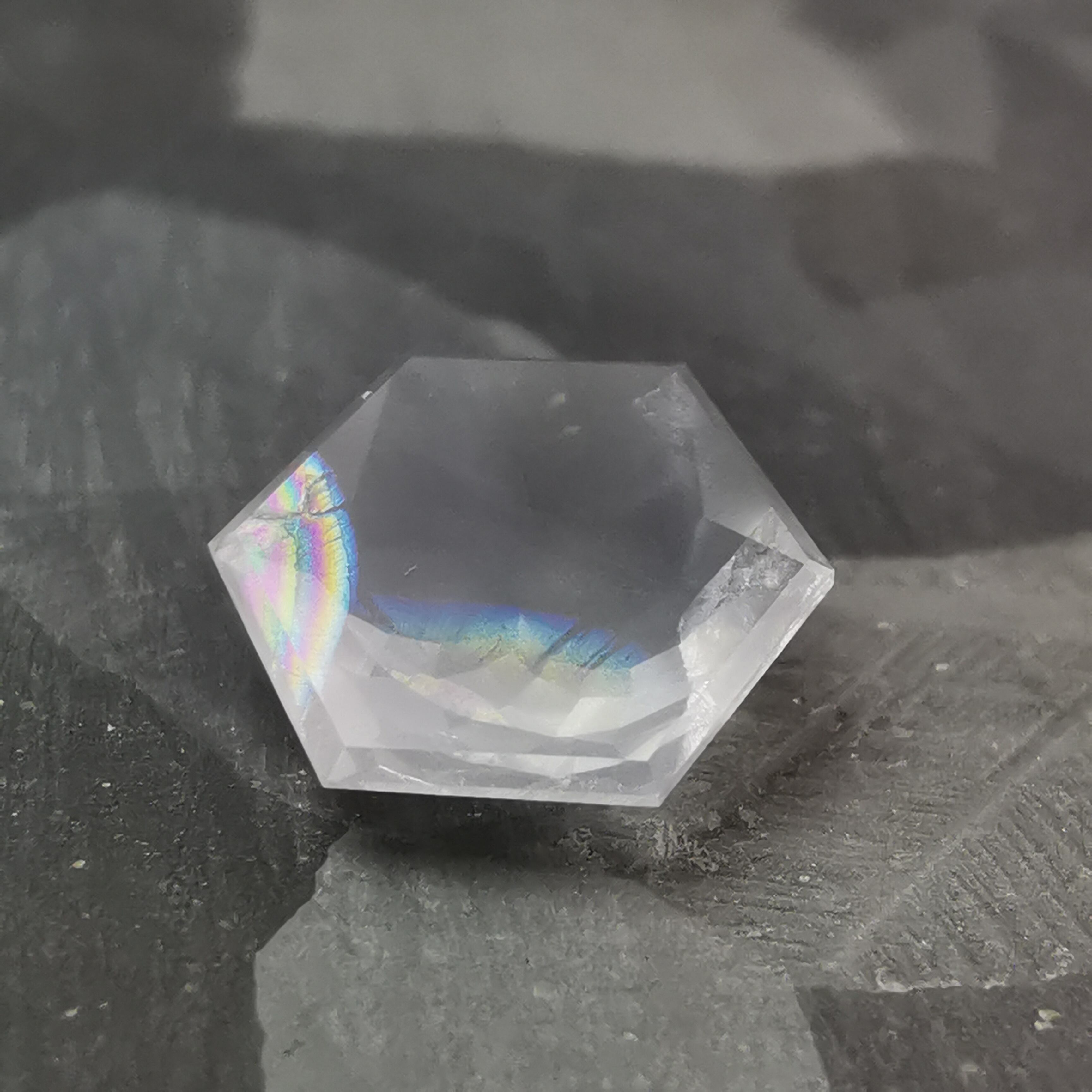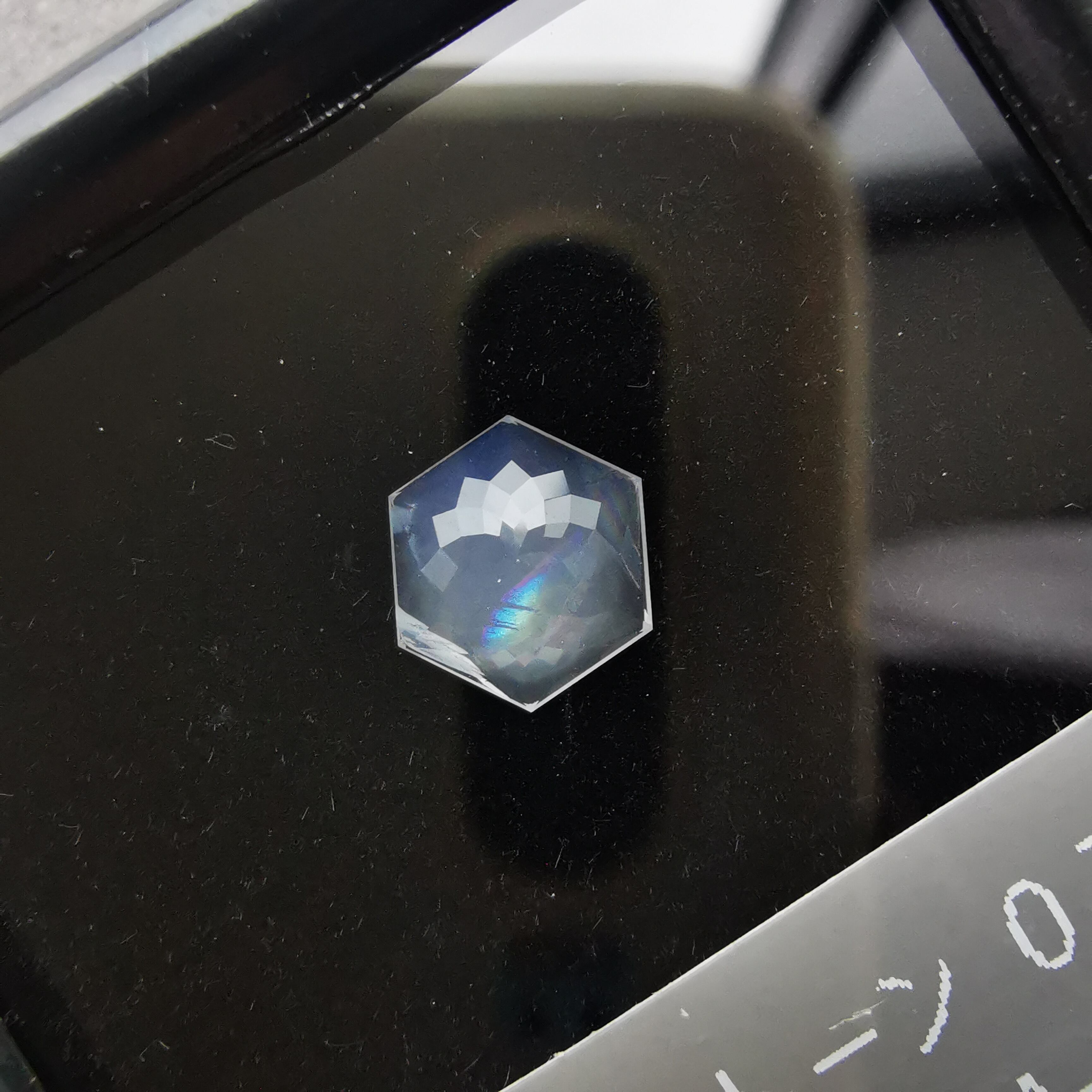 ヘキサンゴンローズカットの登頂に近い部分にフラクチャーがあり、動かすたびに繊細なローズカットの面と、内部の虹色がきらめきます。