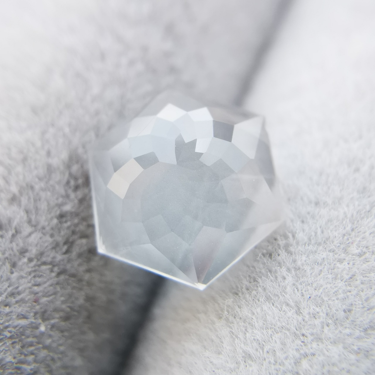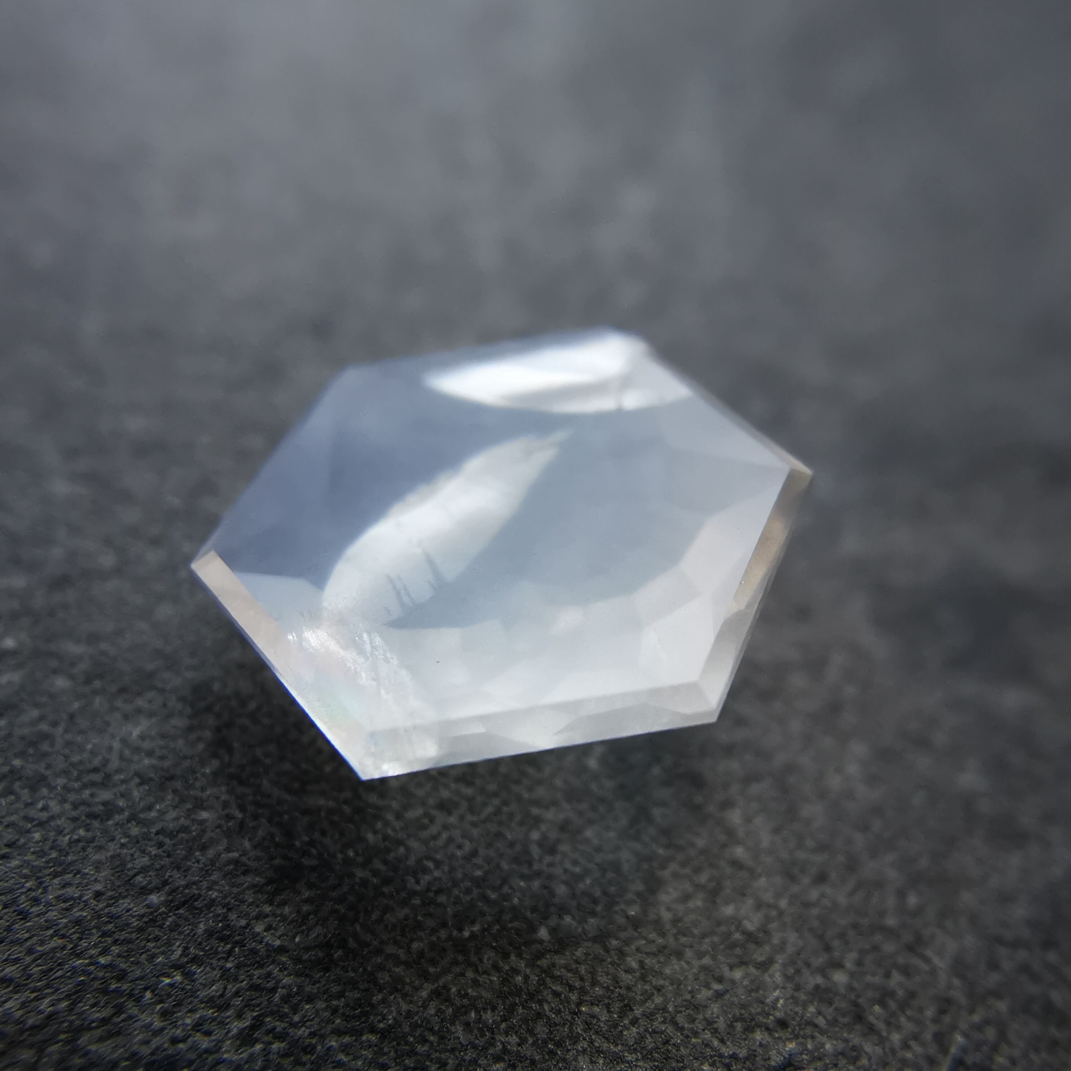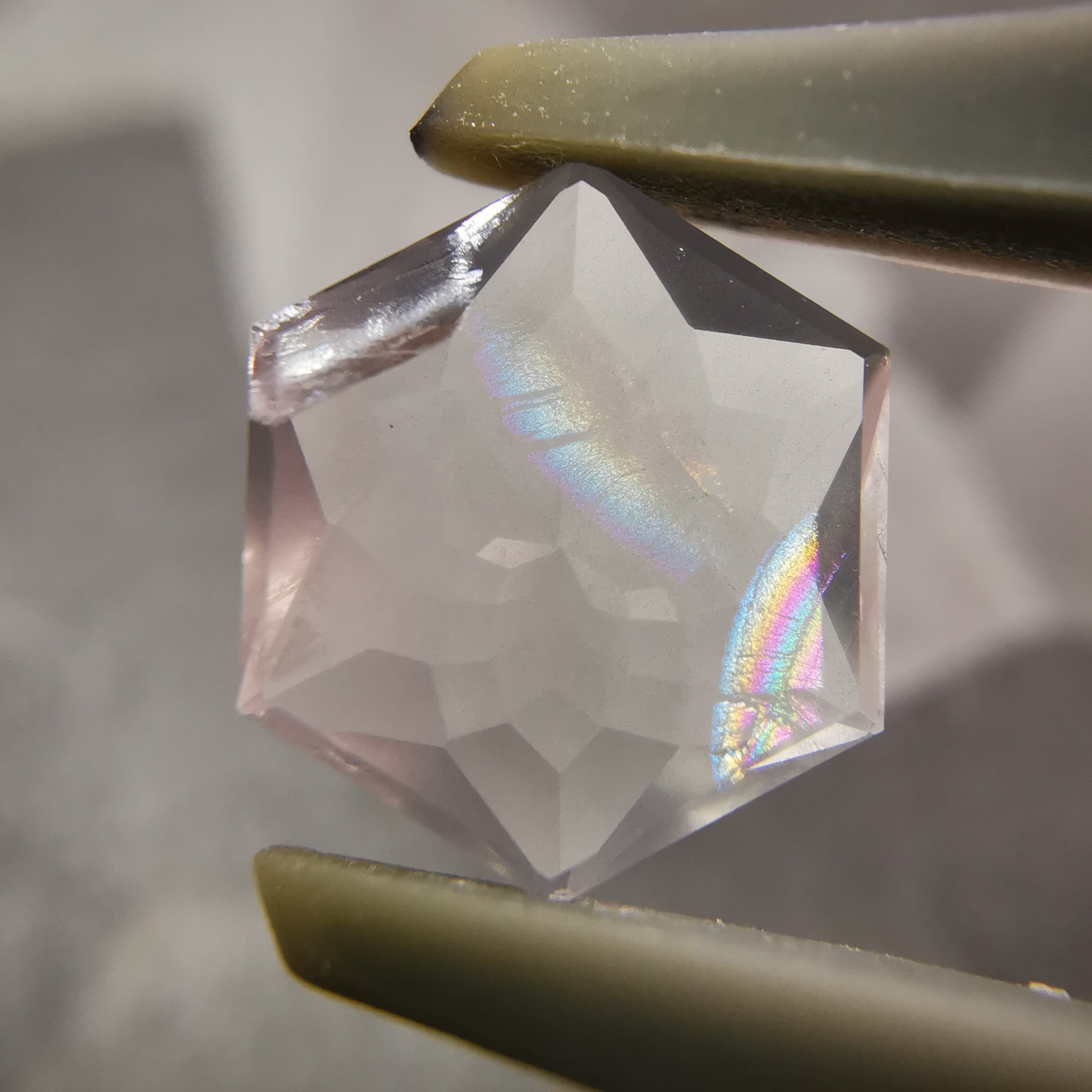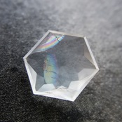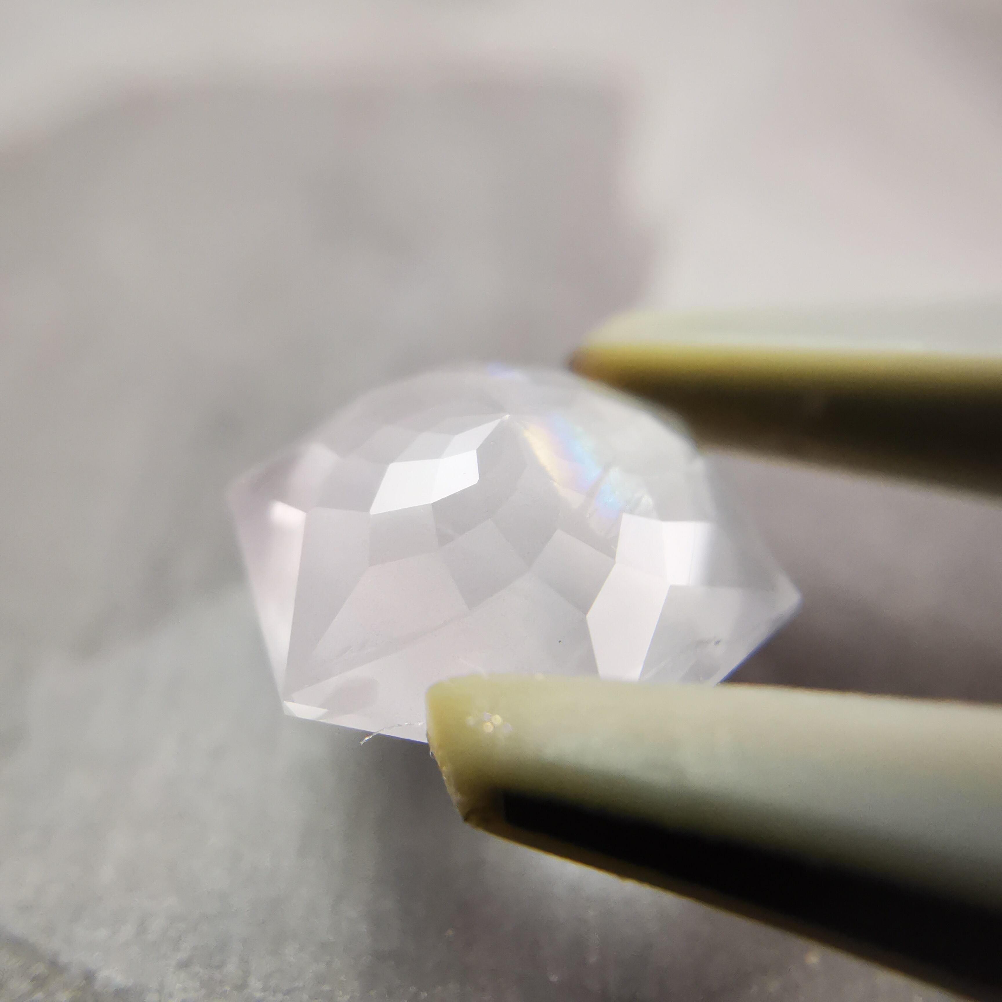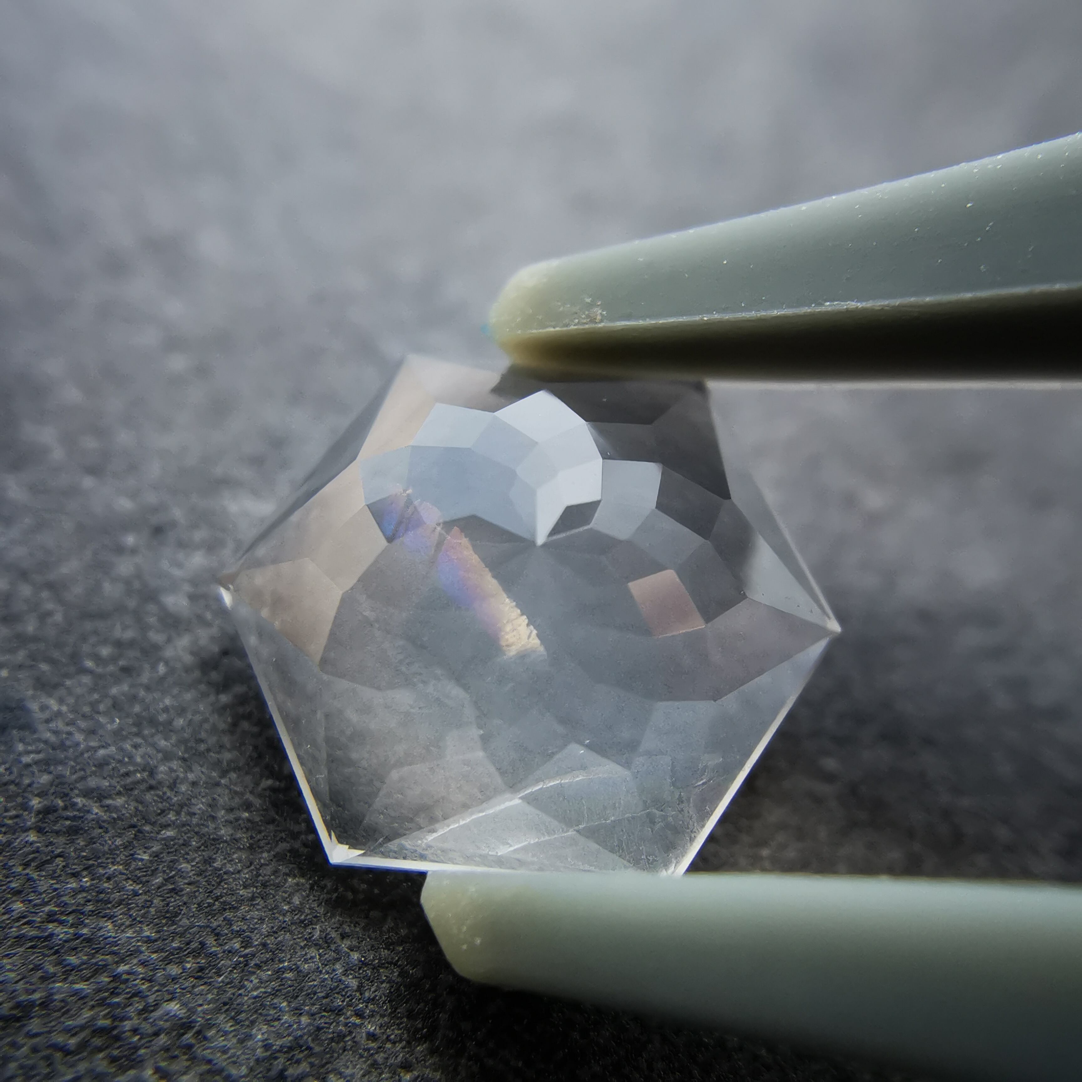 ヘキサンゴンローズカットの登頂に近い部分にフラクチャーがあり、動かすたびに繊細なローズカットの面と、内部の虹色がきらめきます。