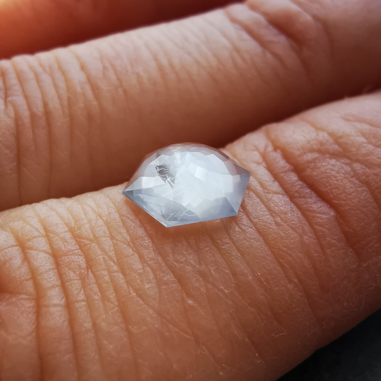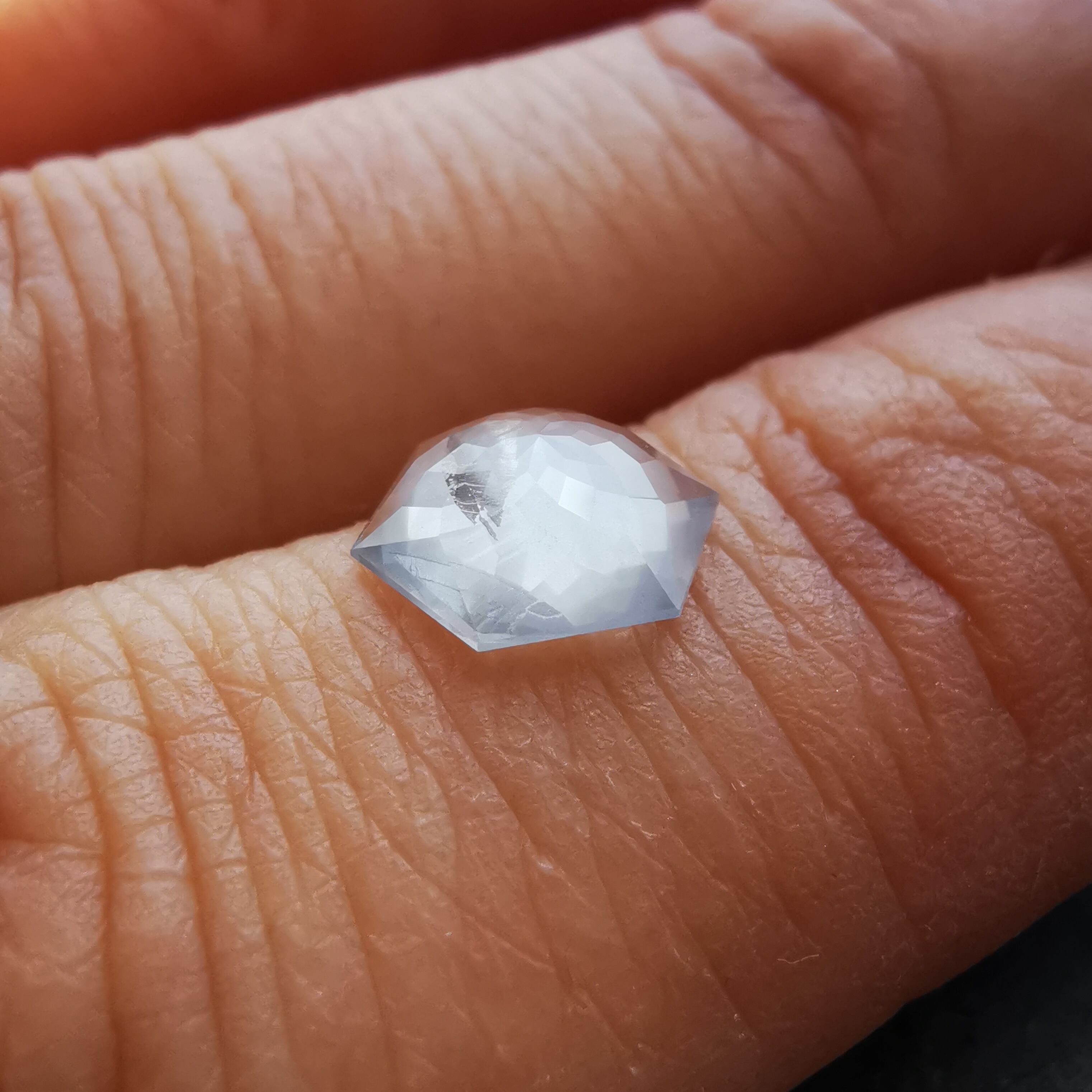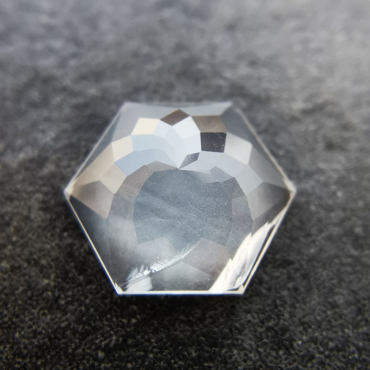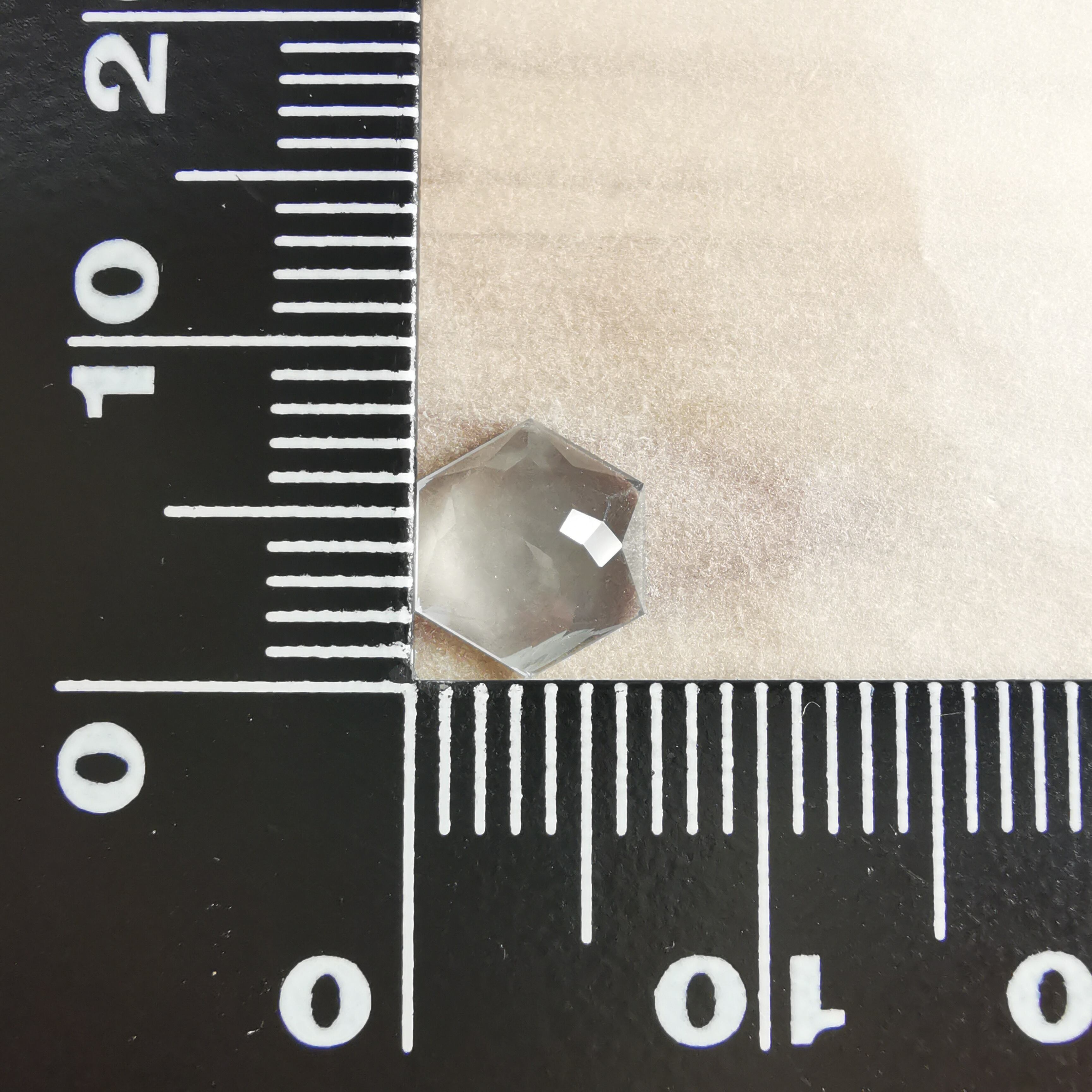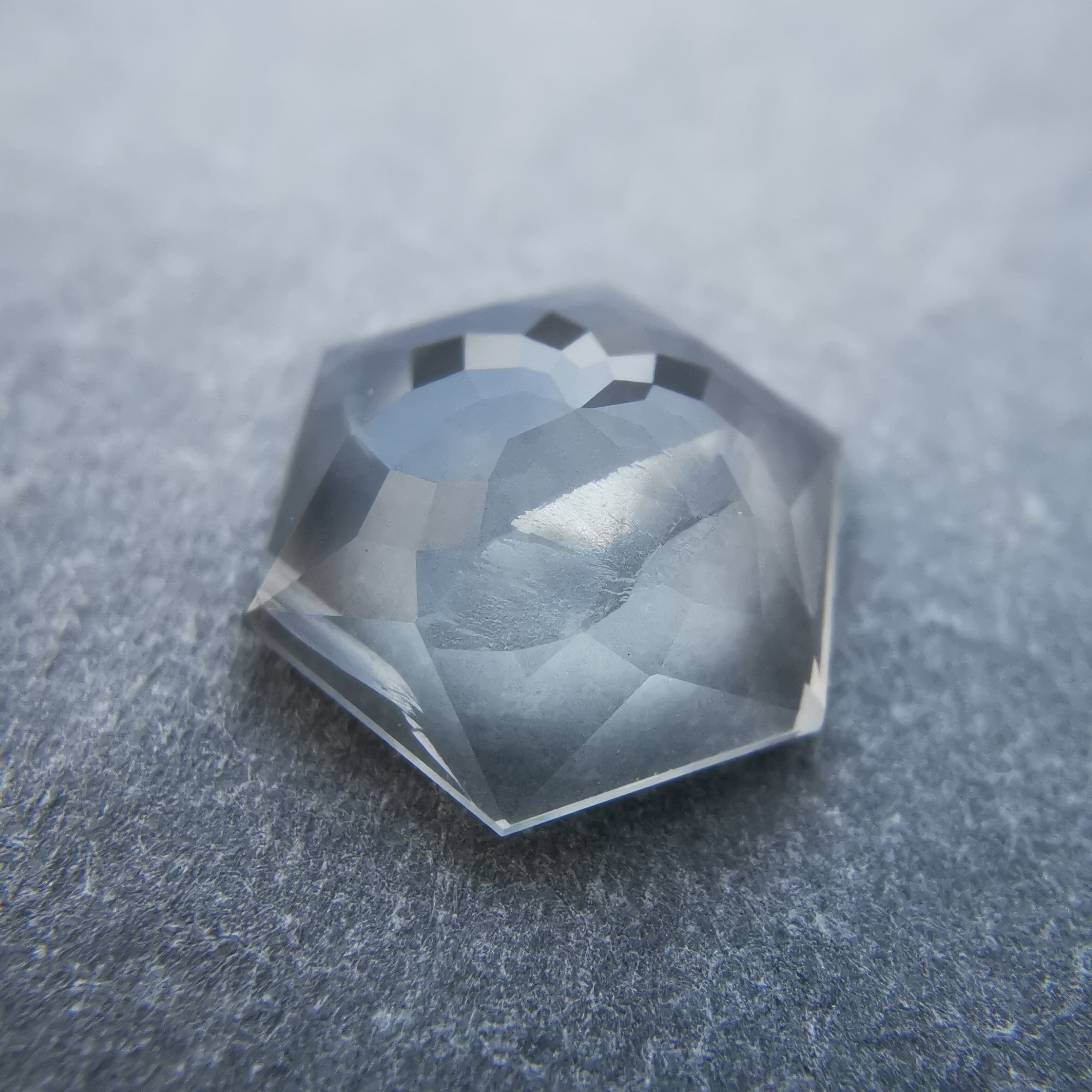 ヘキサンゴンローズカットの登頂に近い部分にフラクチャーがあり、動かすたびに繊細なローズカットの面と、内部の虹色がきらめきます。