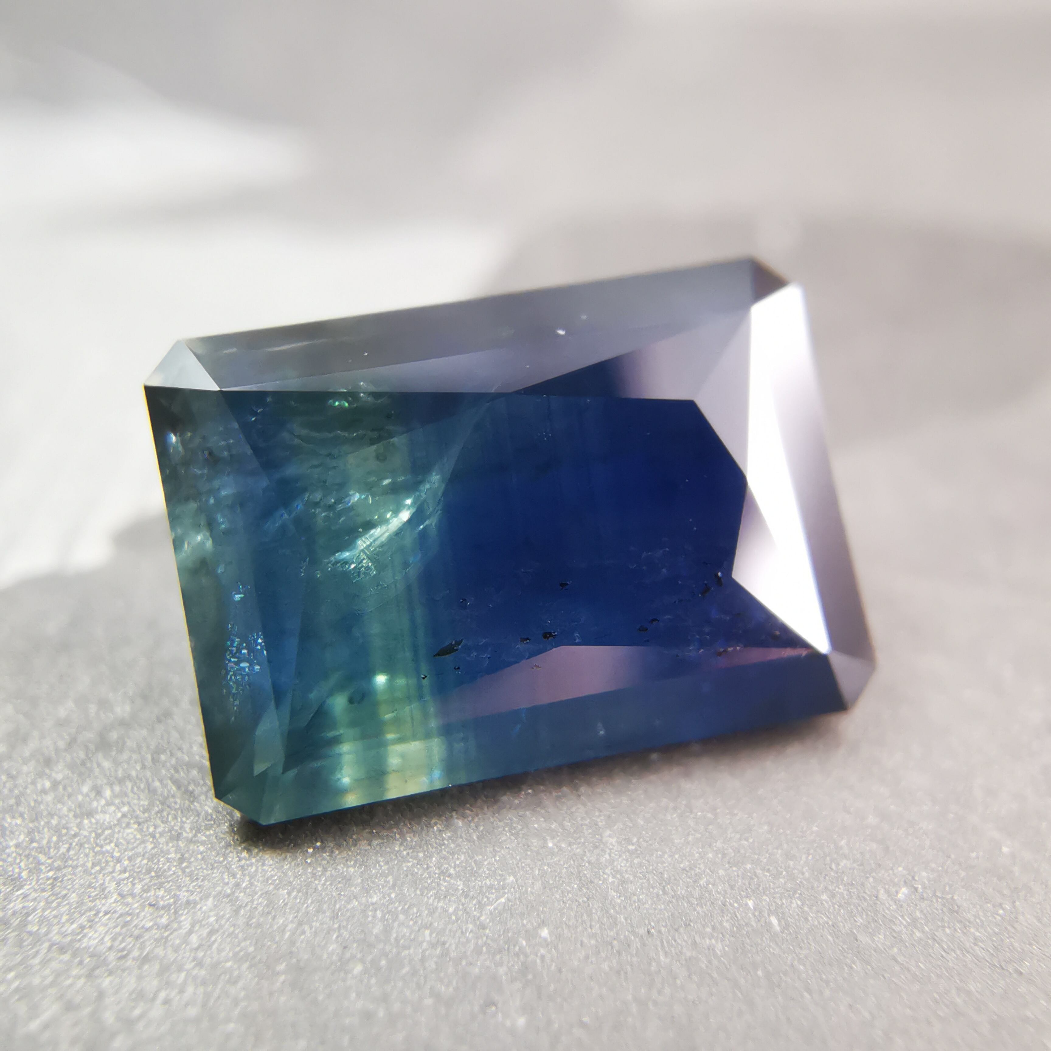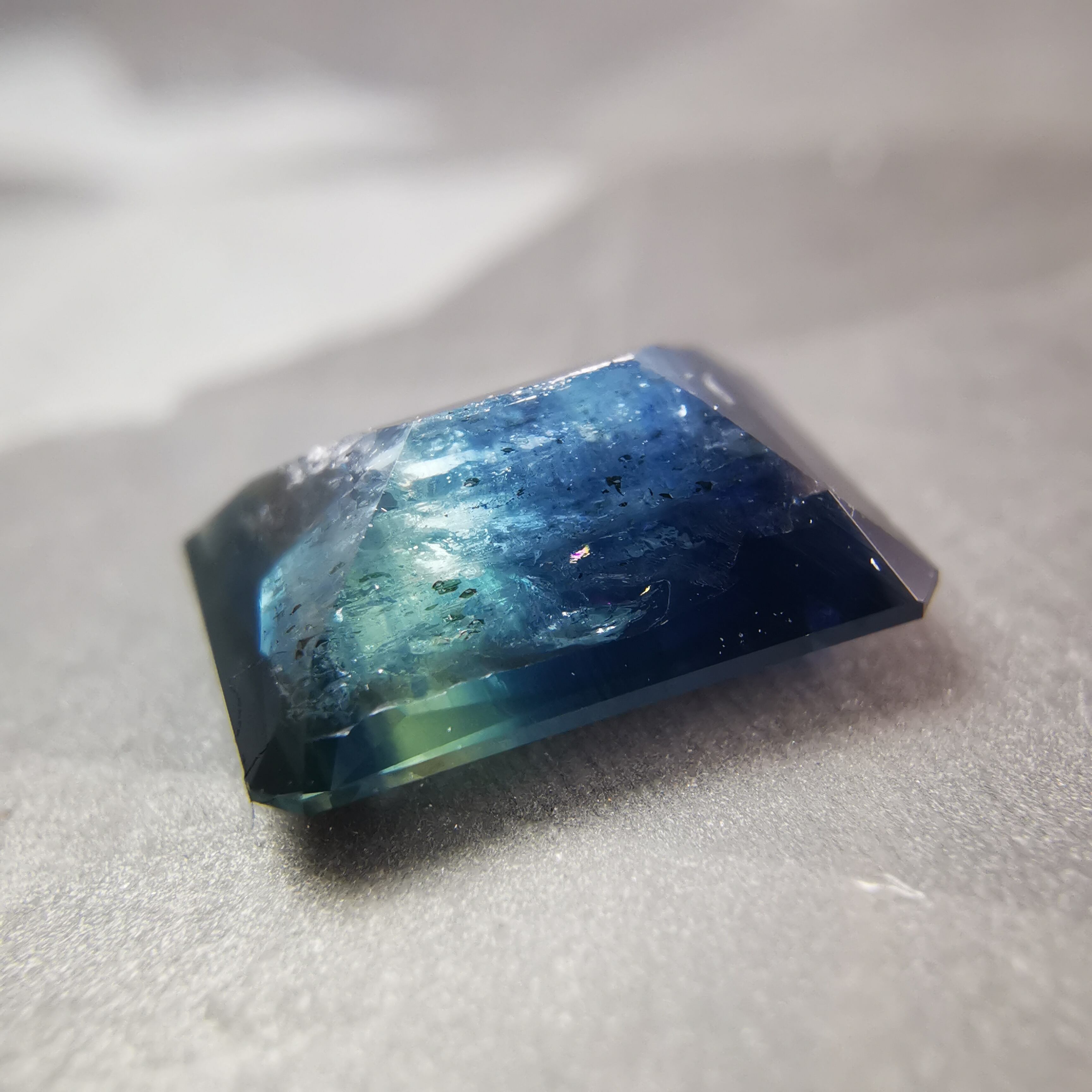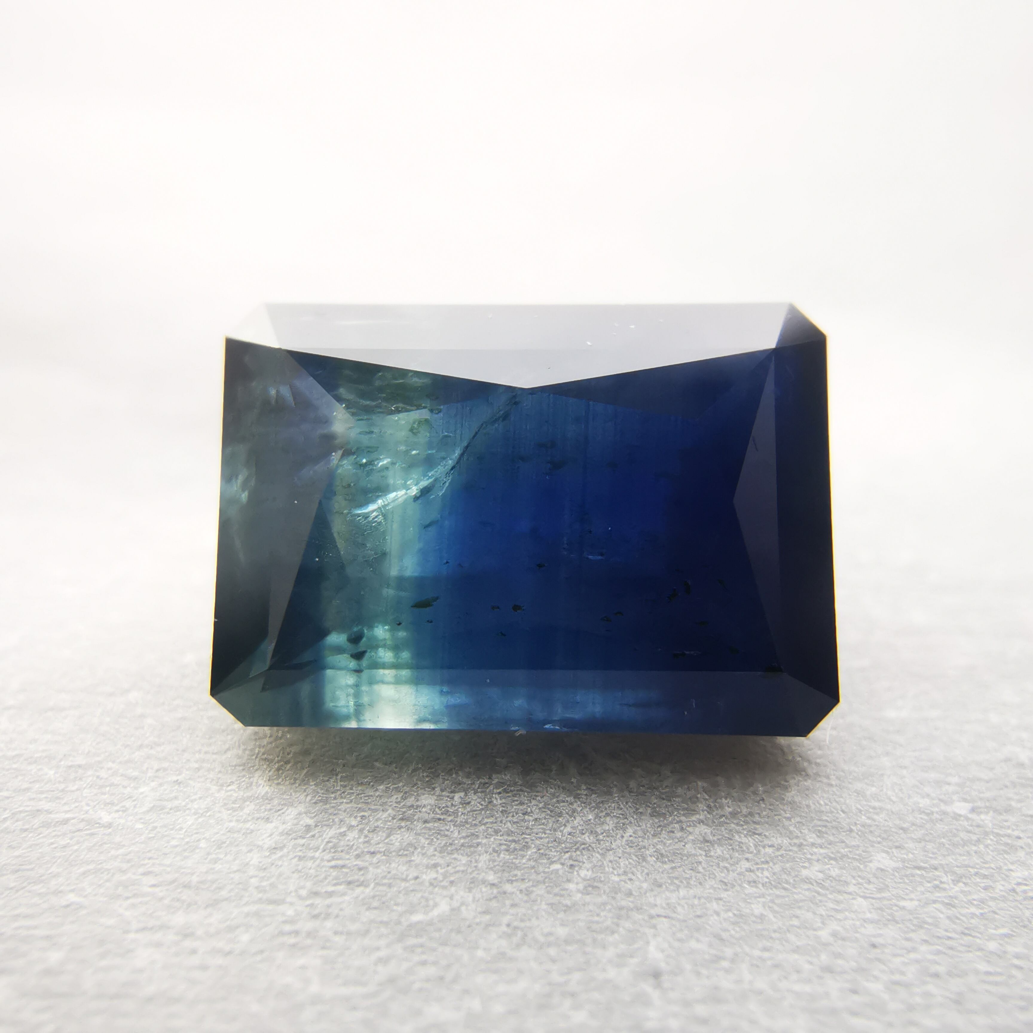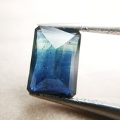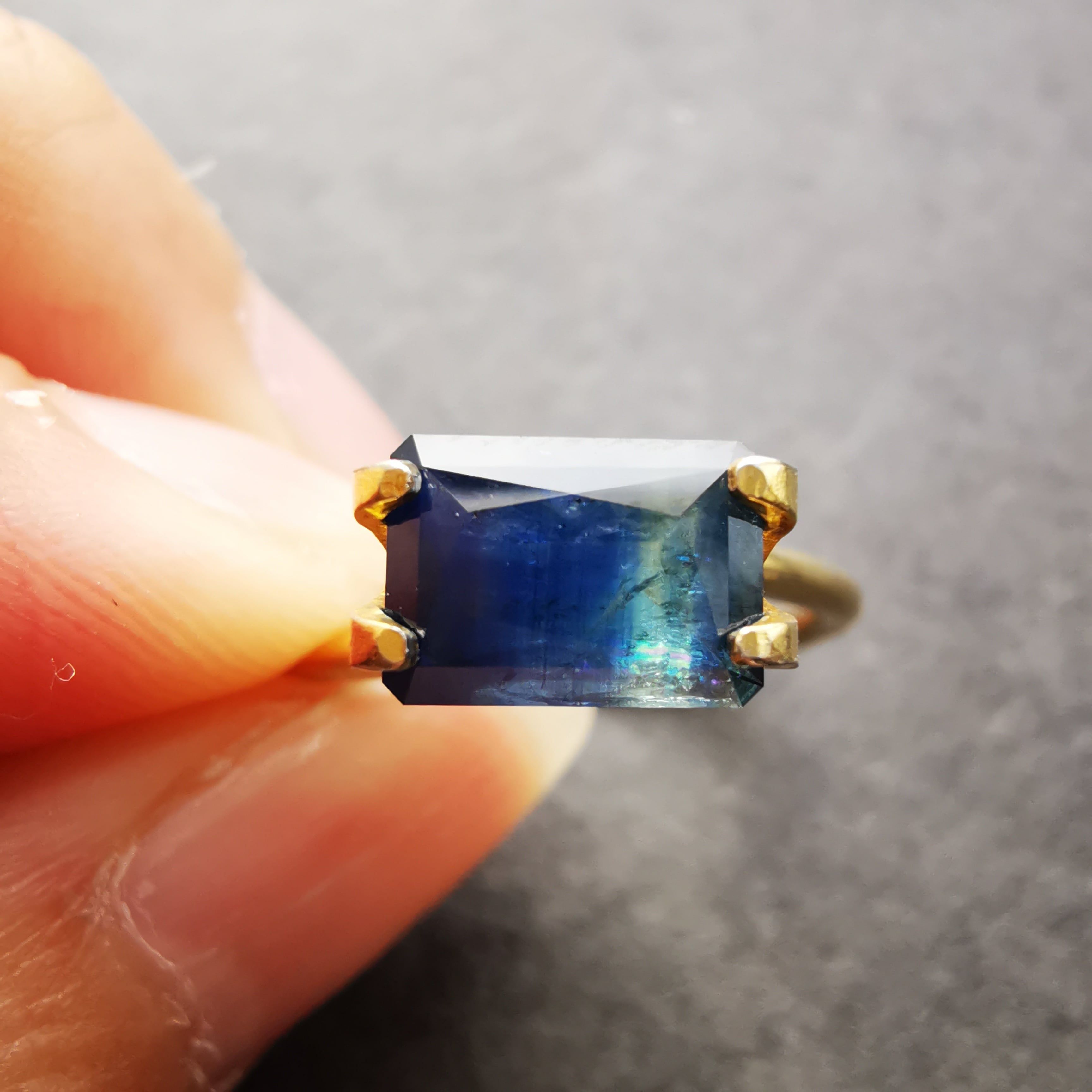 濃紺から淡いイエローグリーンの間に、幾筋もカラーバンドが入った、印象的なグラデーションのサファイアです。