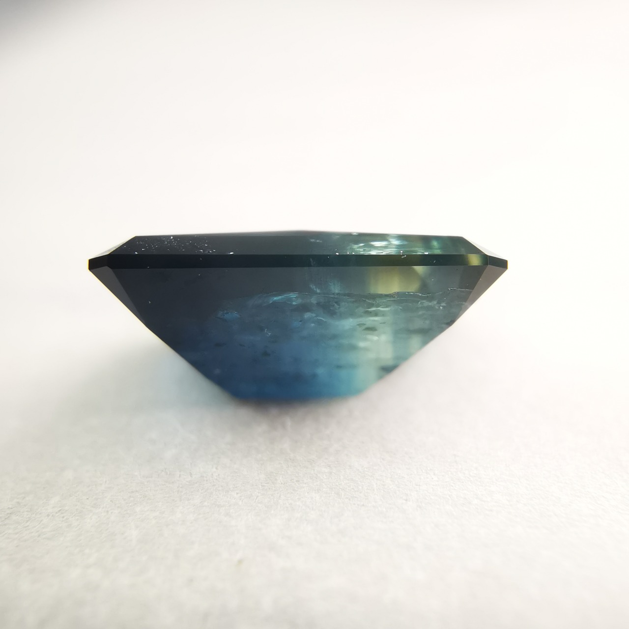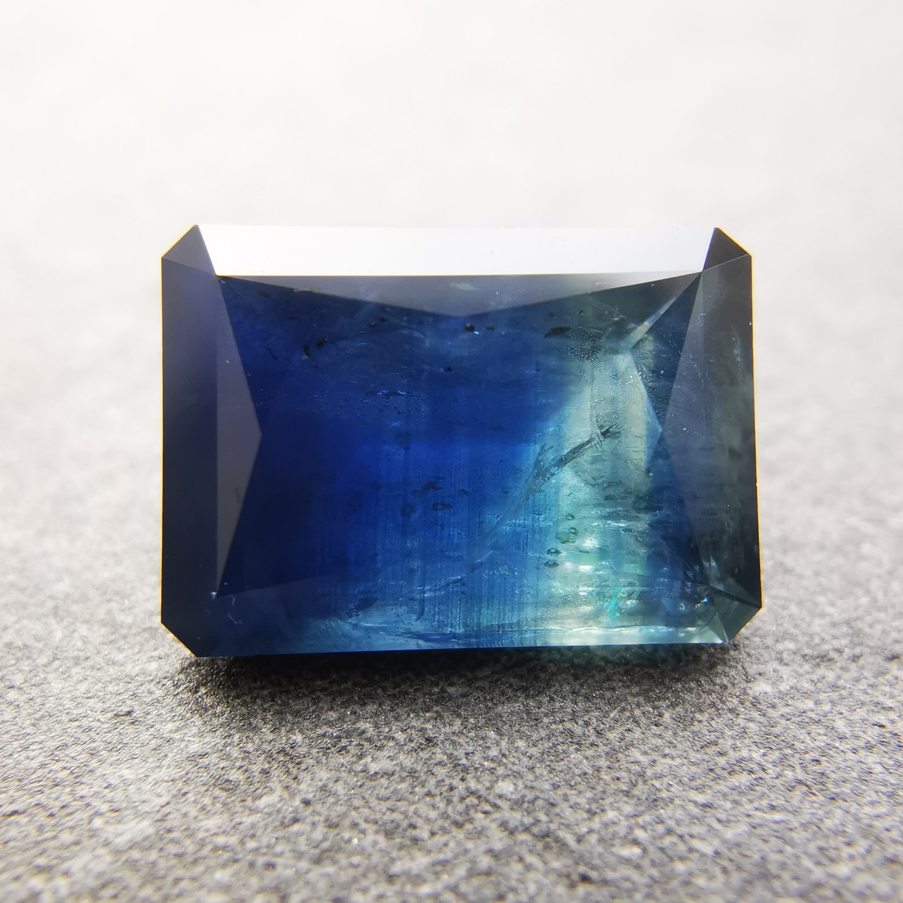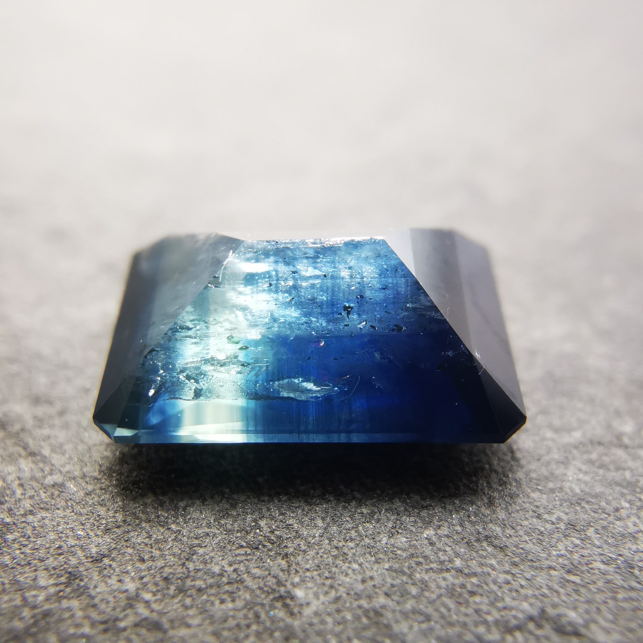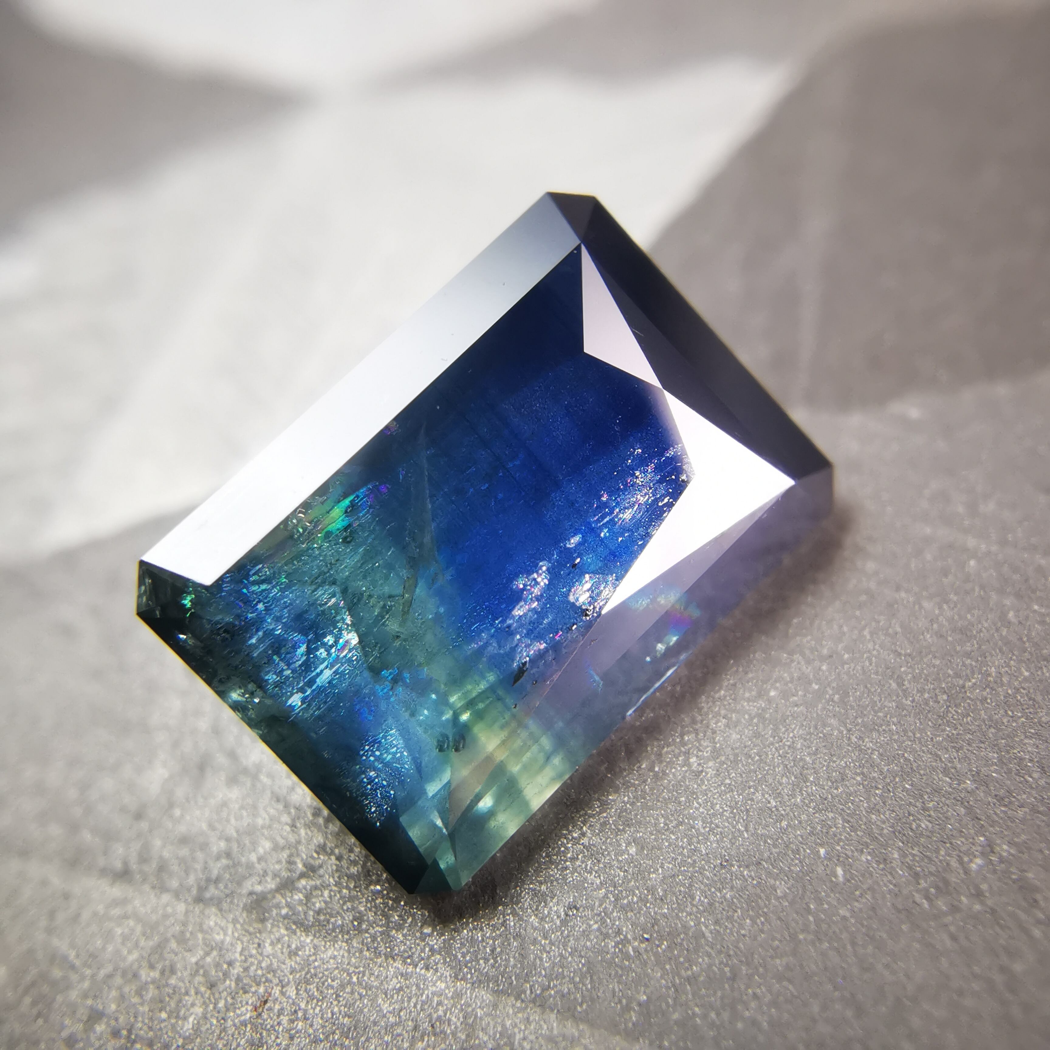 濃紺から淡いイエローグリーンの間に、幾筋もカラーバンドが入った、印象的なグラデーションのサファイアです。