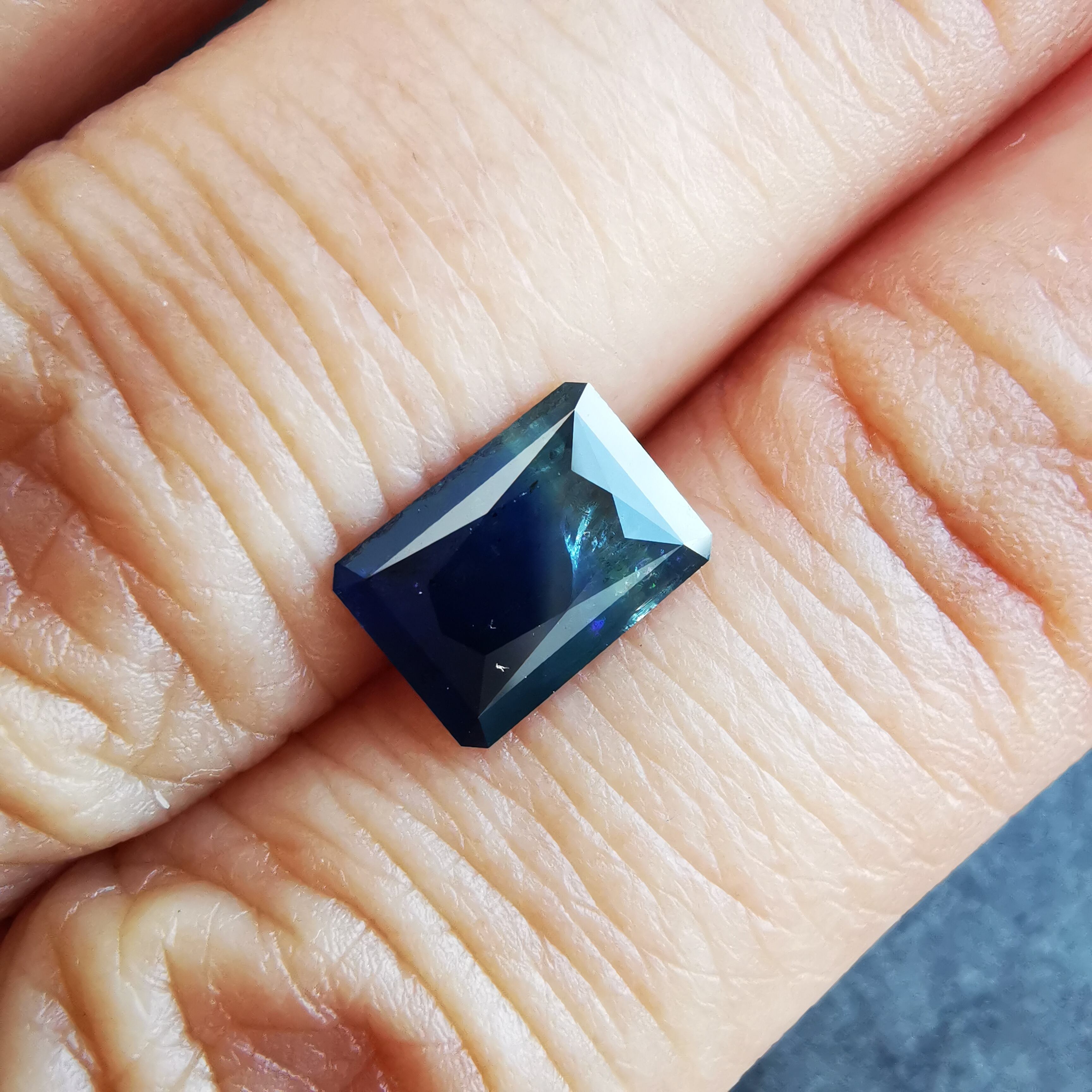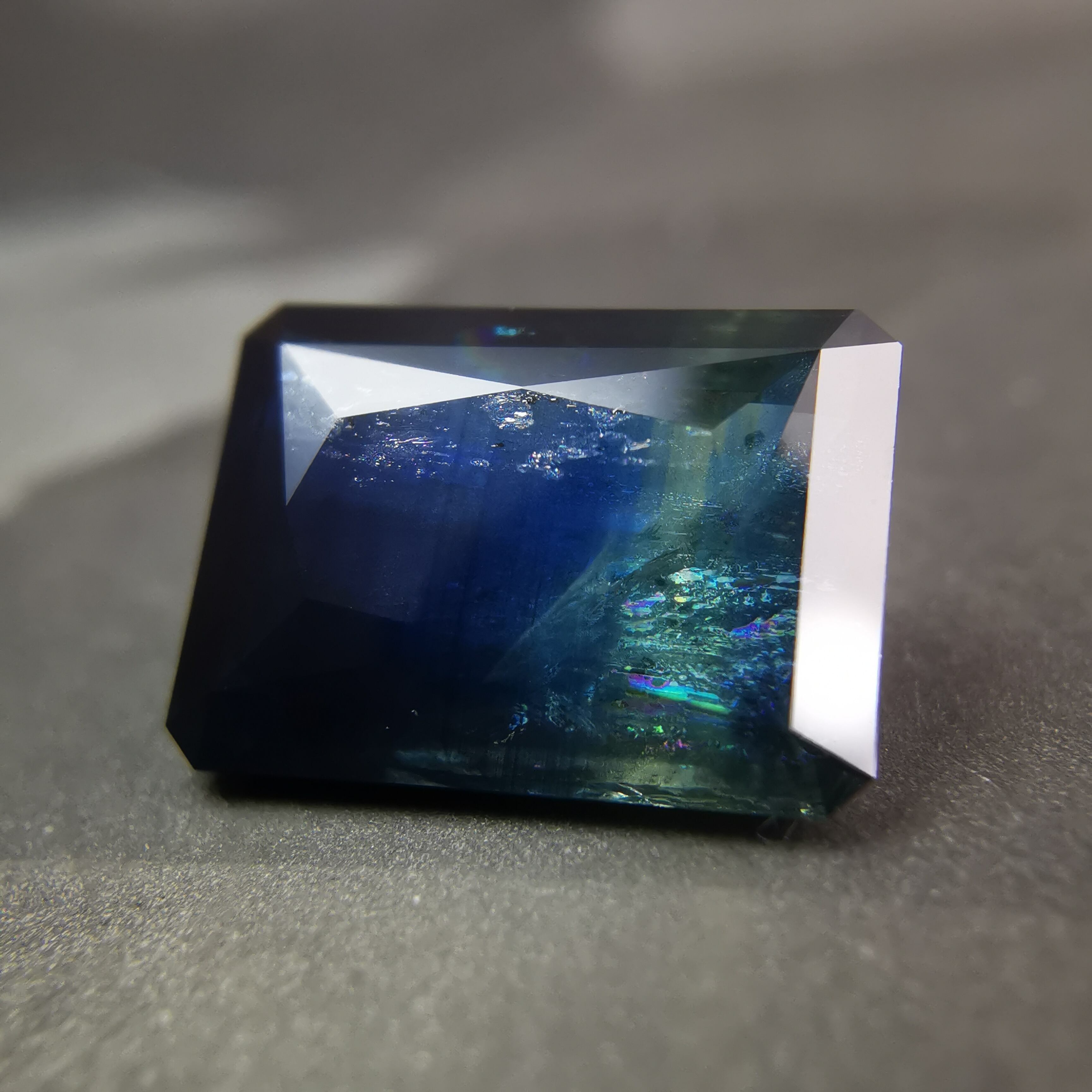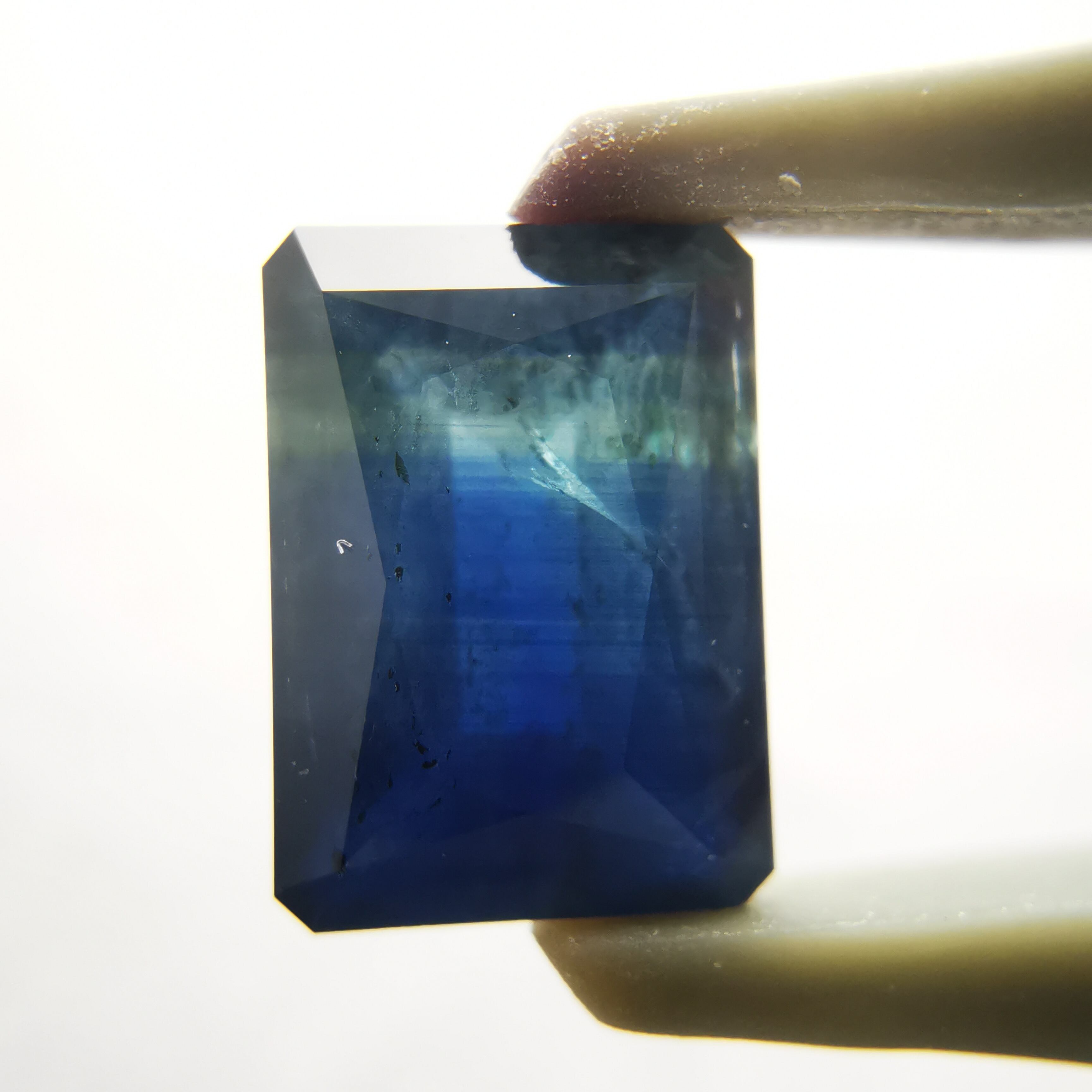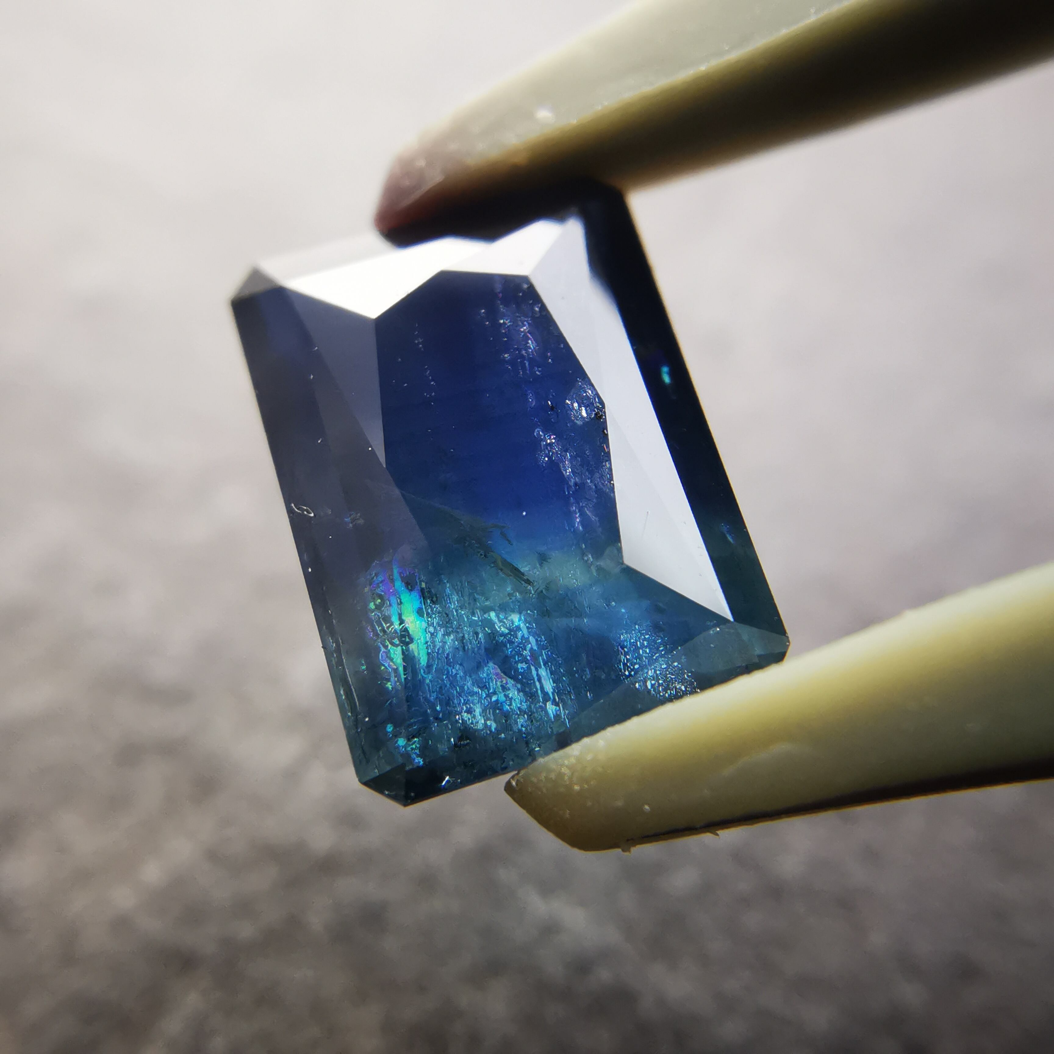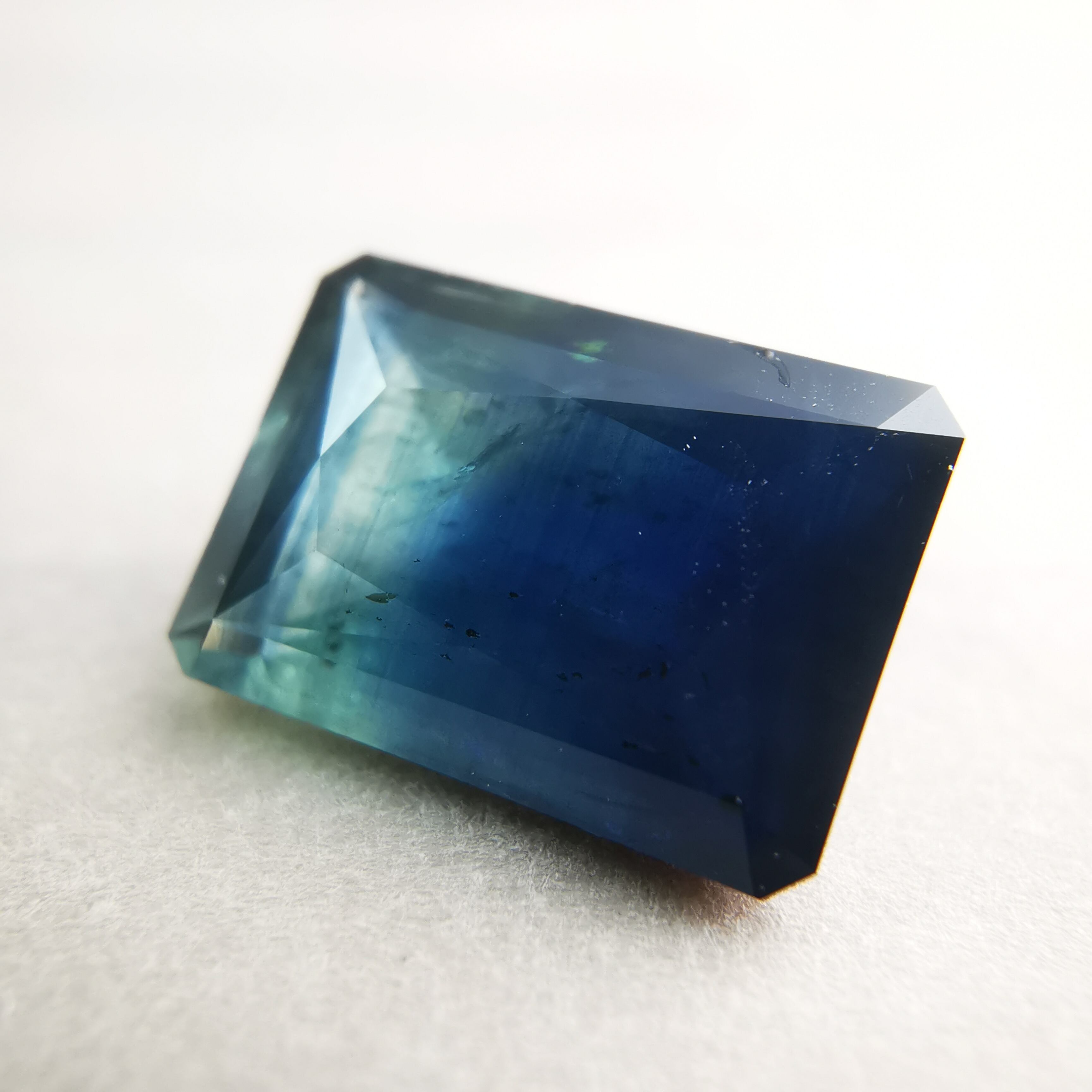 濃紺から淡いイエローグリーンの間に、幾筋もカラーバンドが入った、印象的なグラデーションのサファイアです。