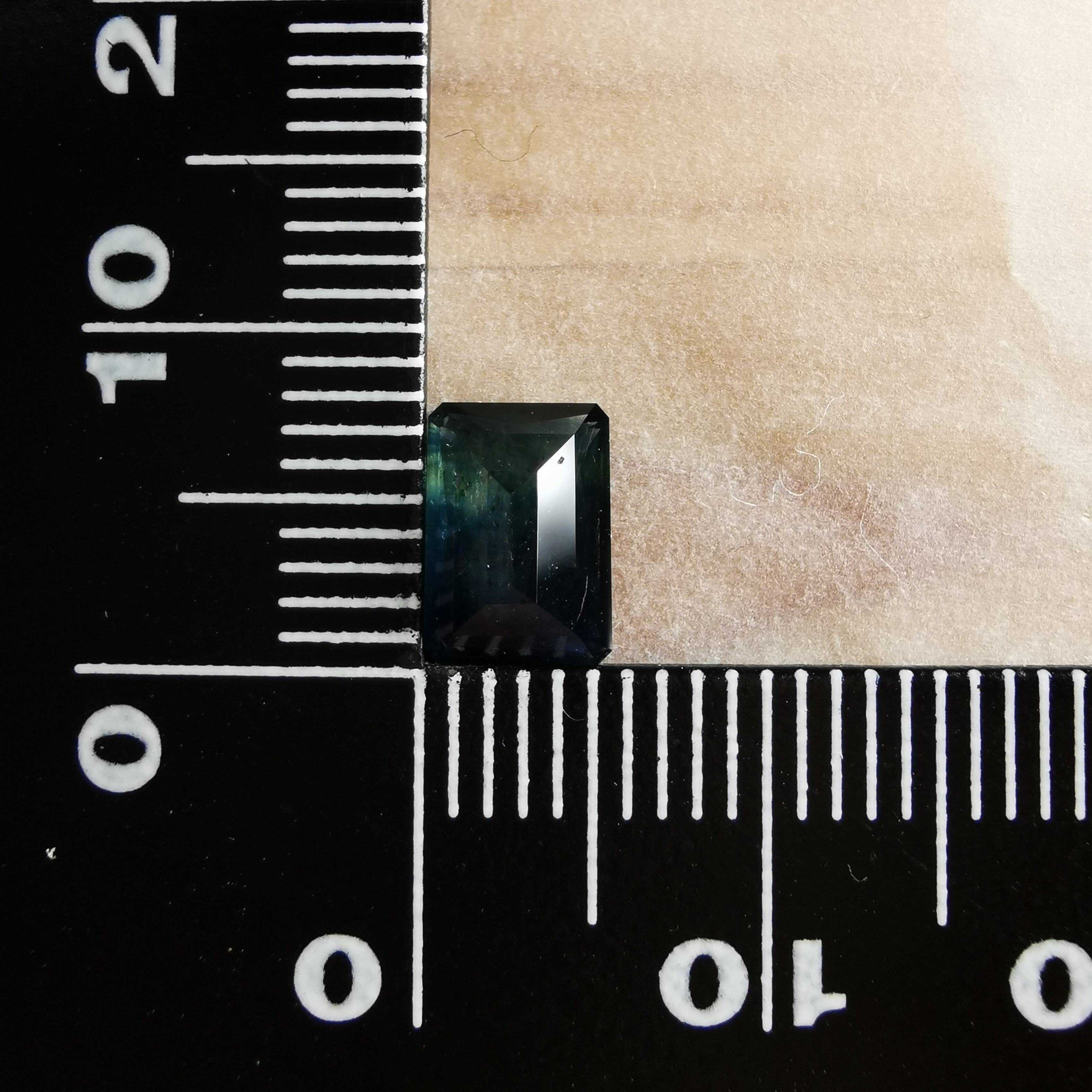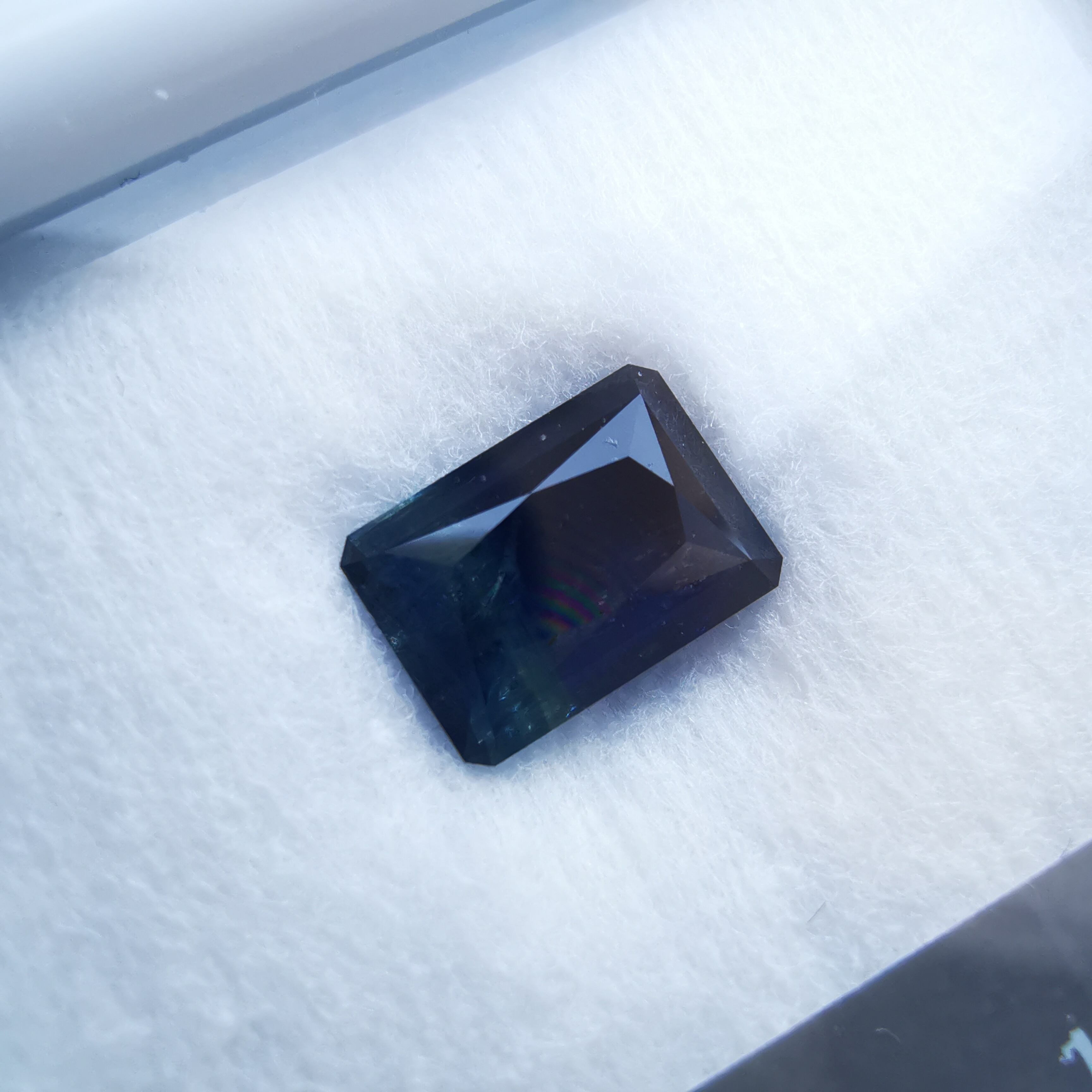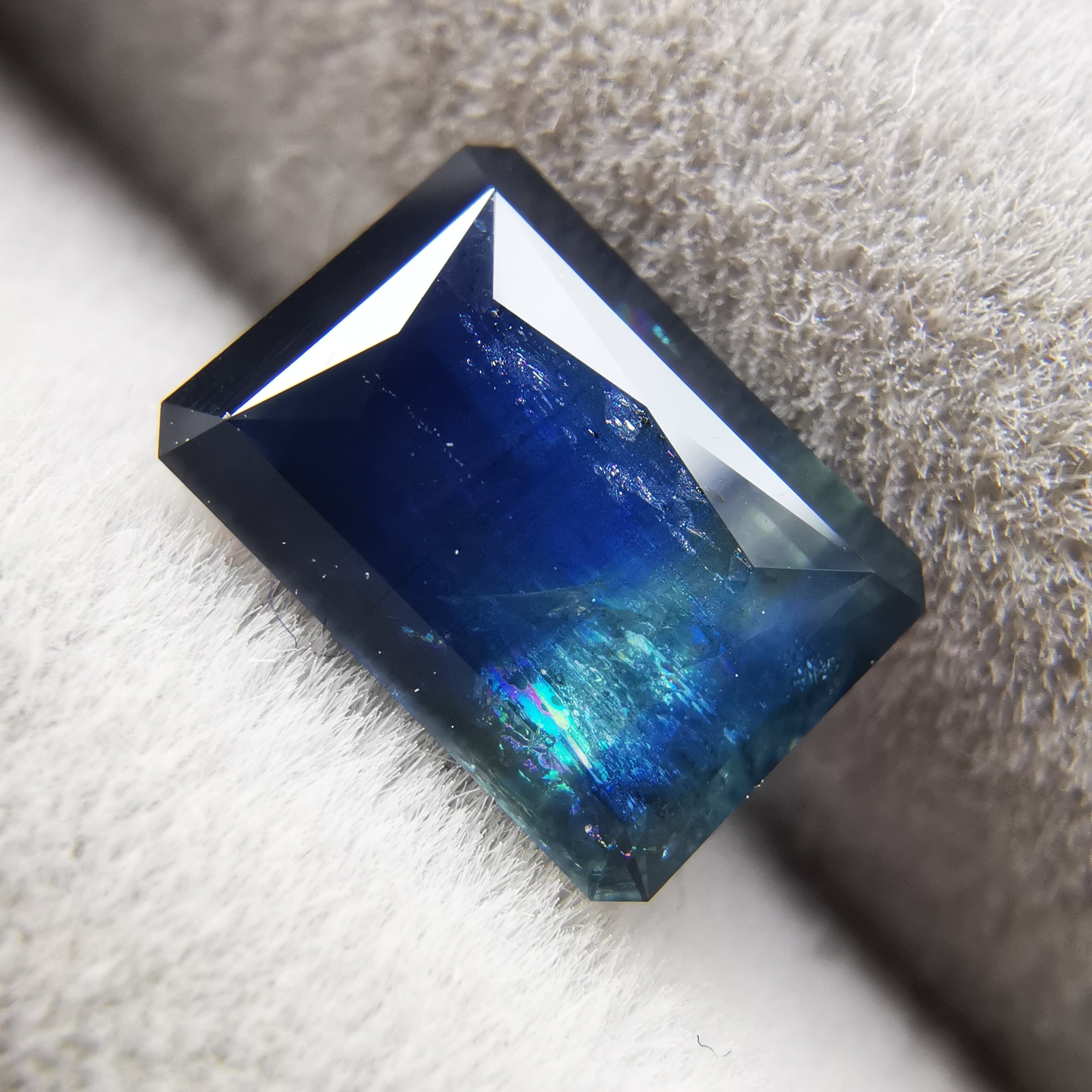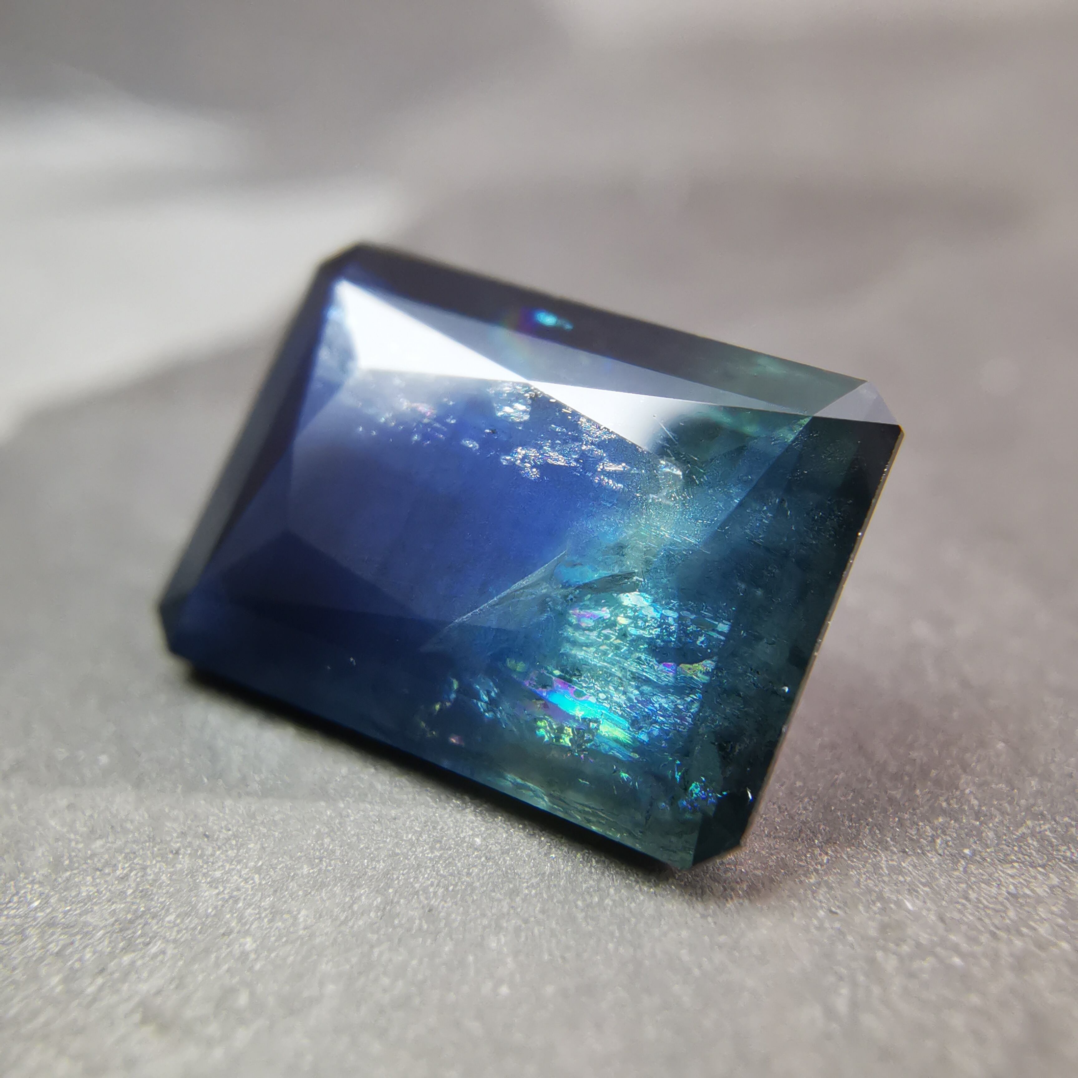 濃紺から淡いイエローグリーンの間に、幾筋もカラーバンドが入った、印象的なグラデーションのサファイアです。