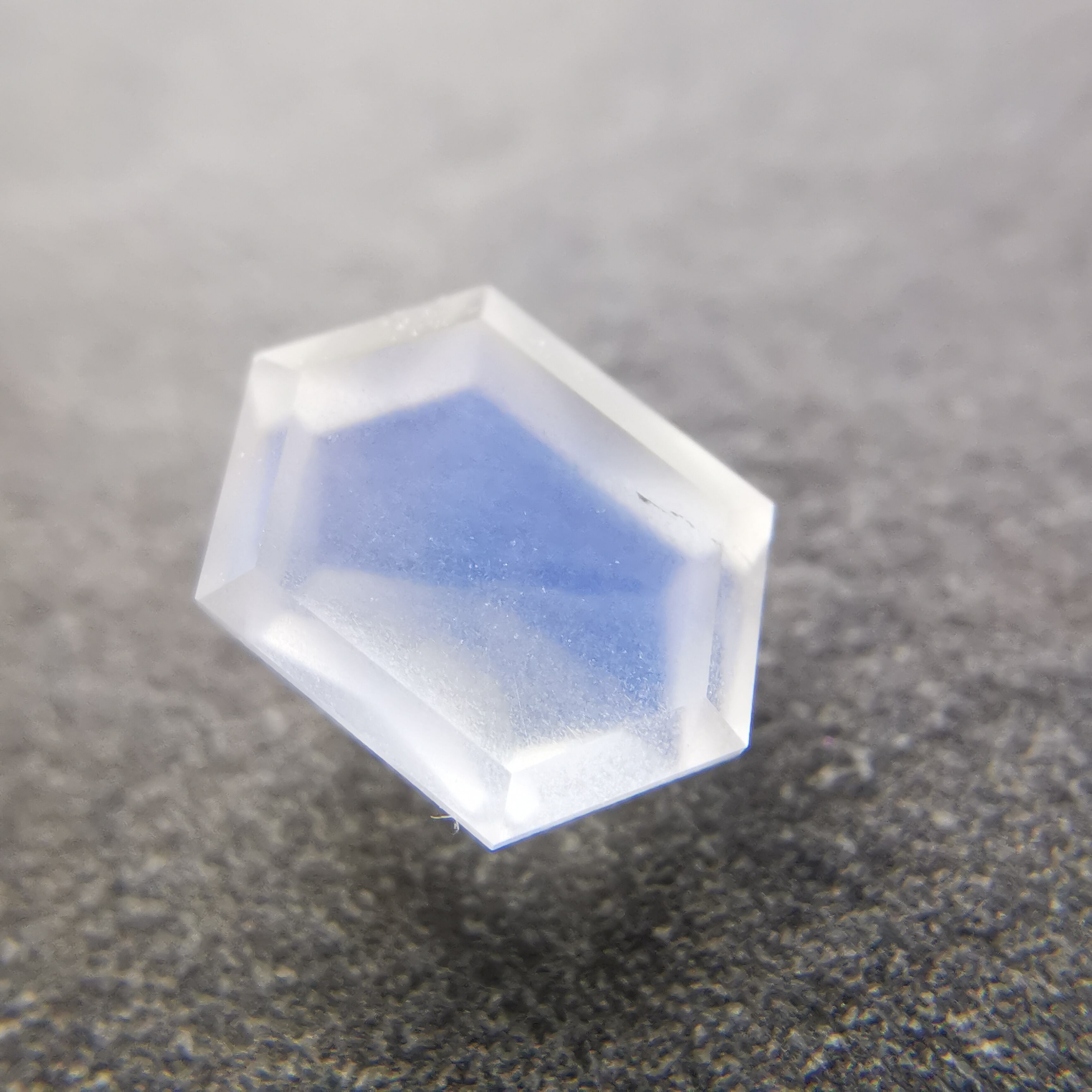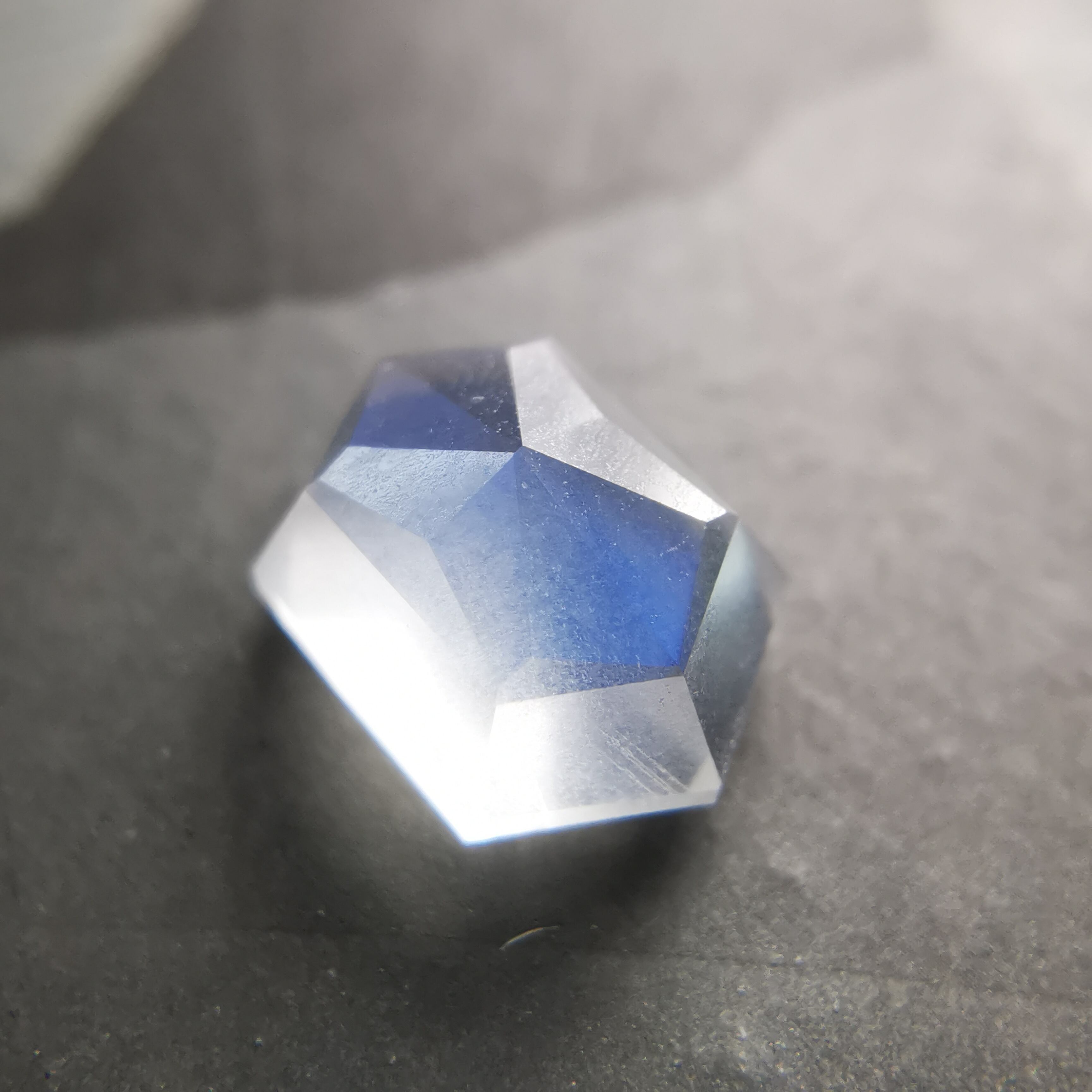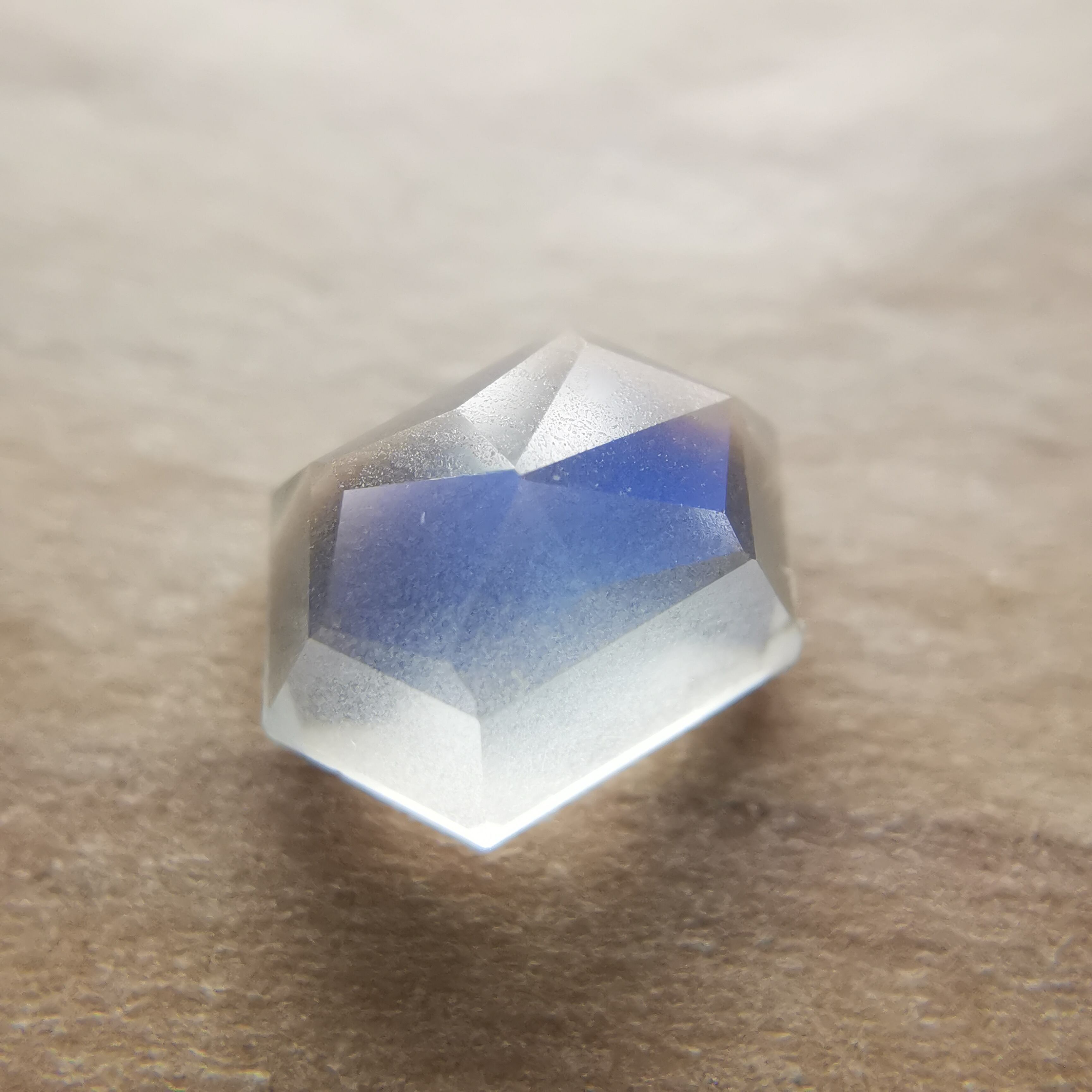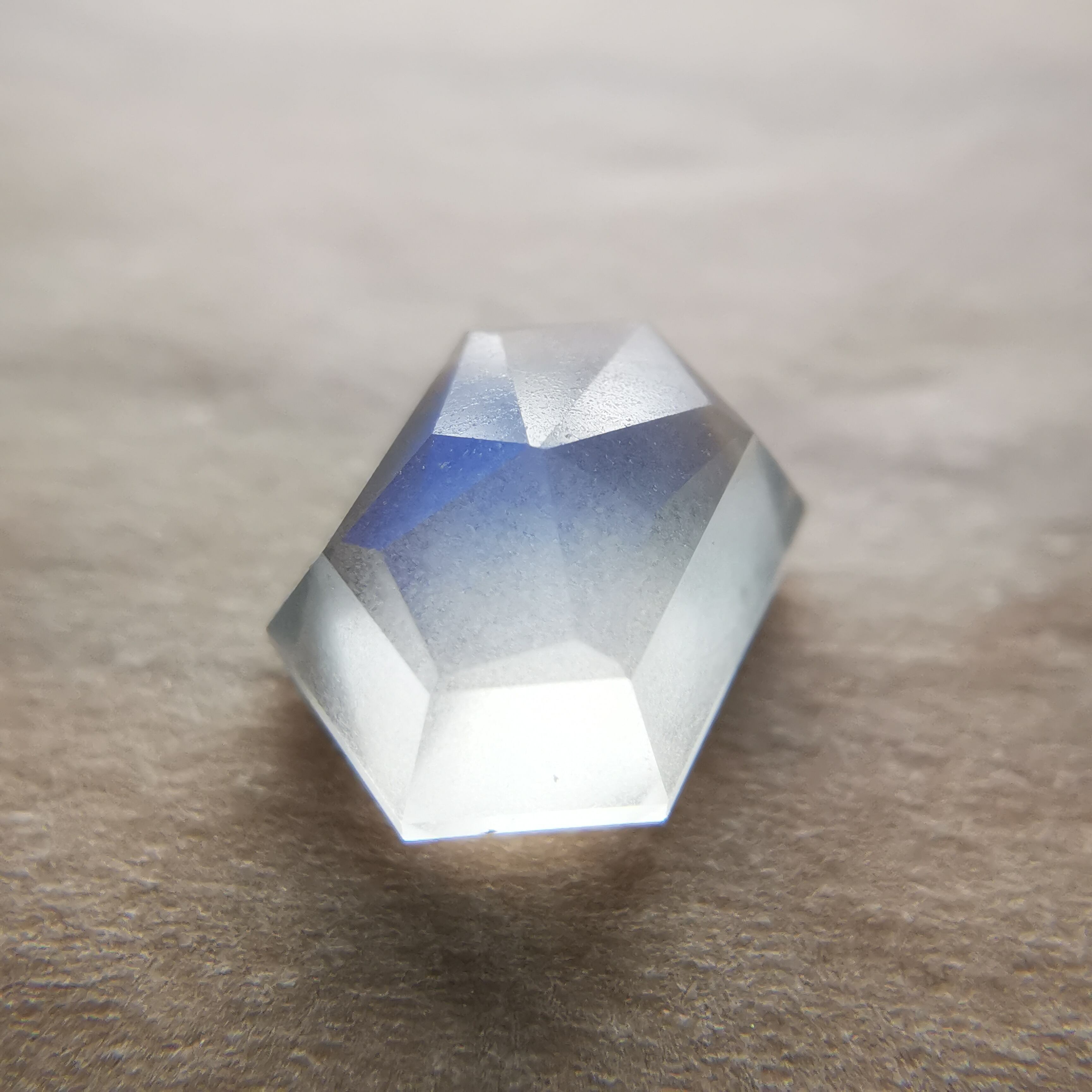 灰みの半透明の石の表面を、鮮やかなブルーが覆うムーンストーンです。