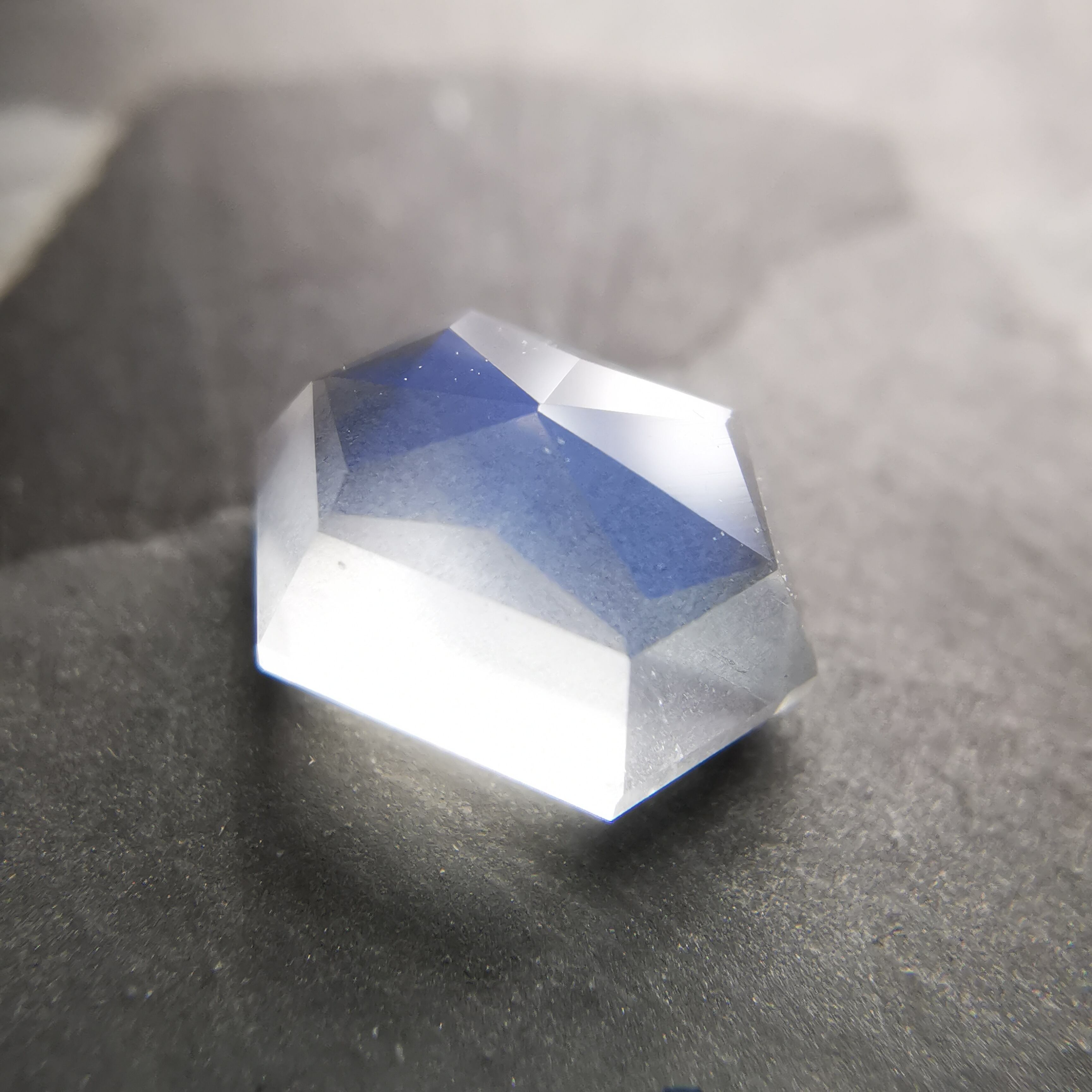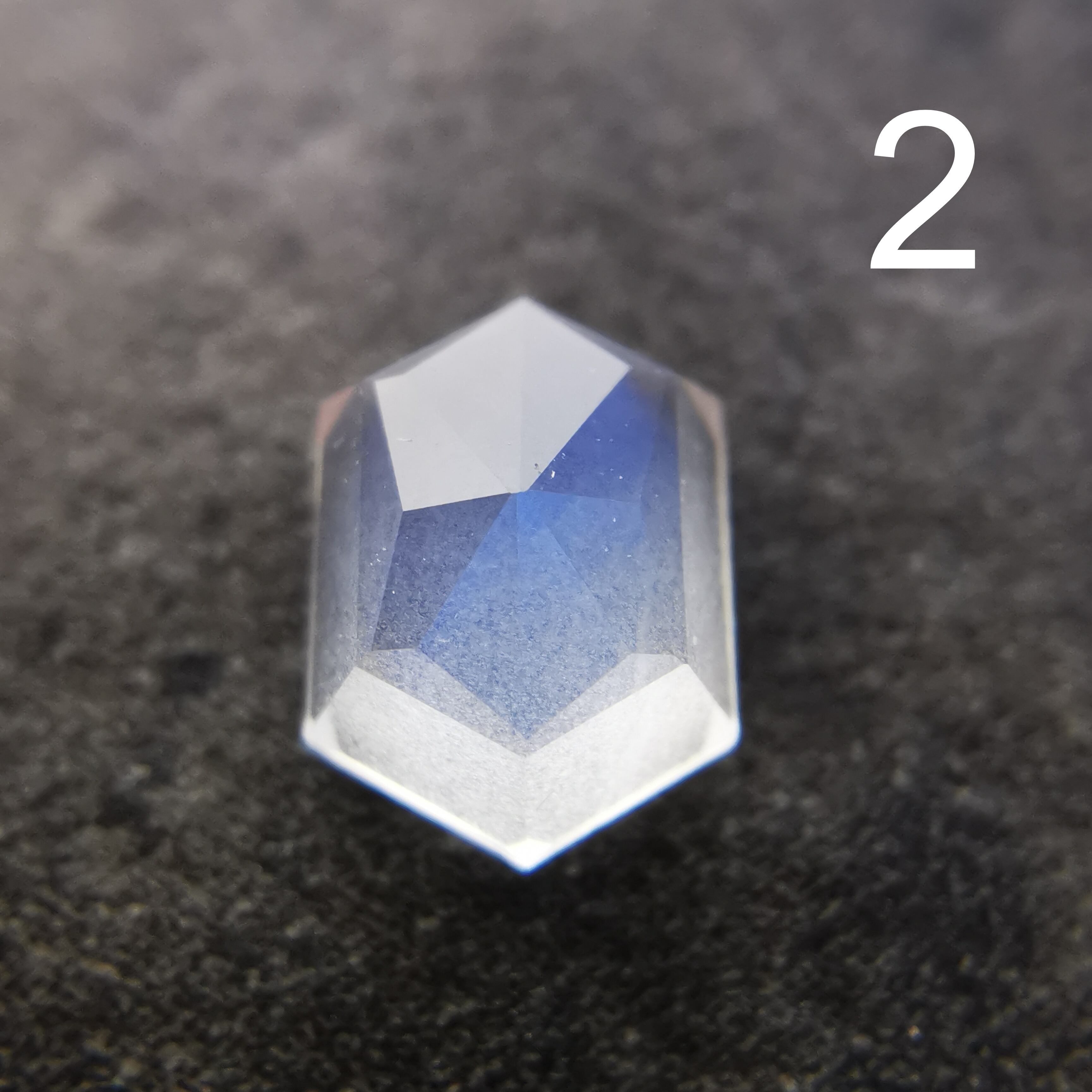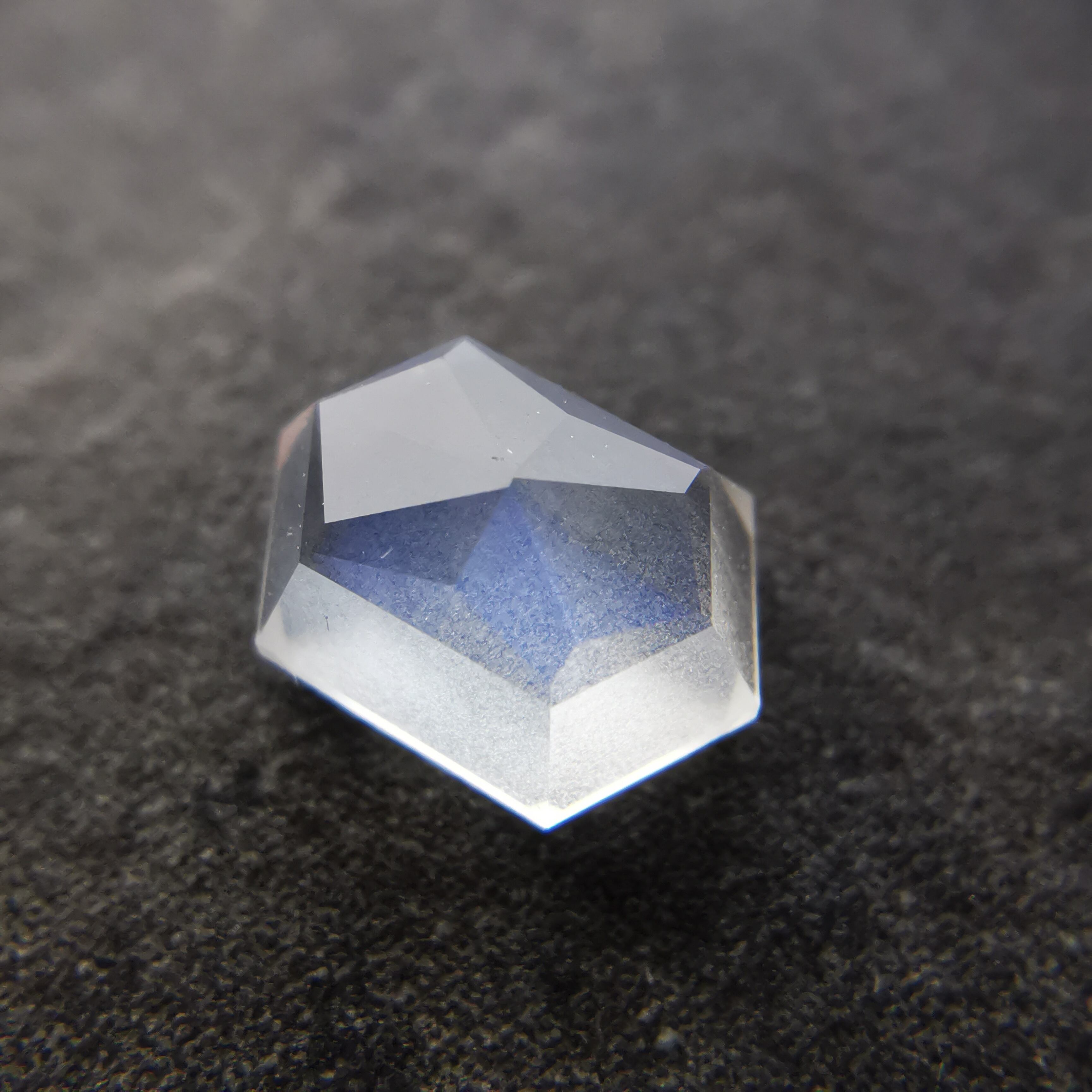 灰みの半透明の石の表面を、鮮やかなブルーが覆うムーンストーンです。