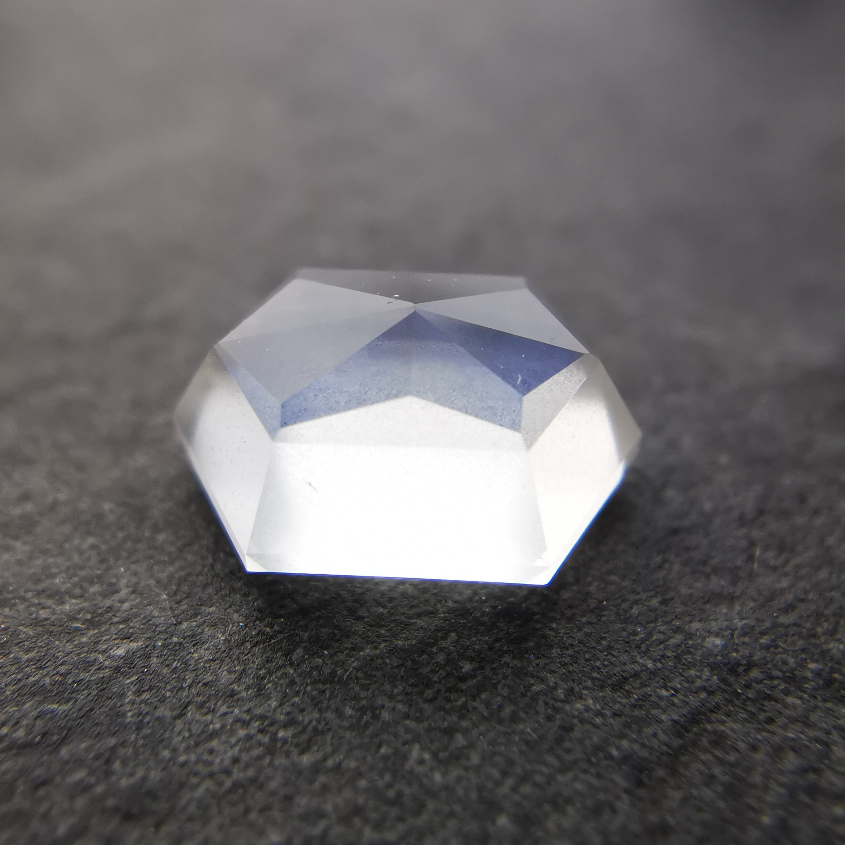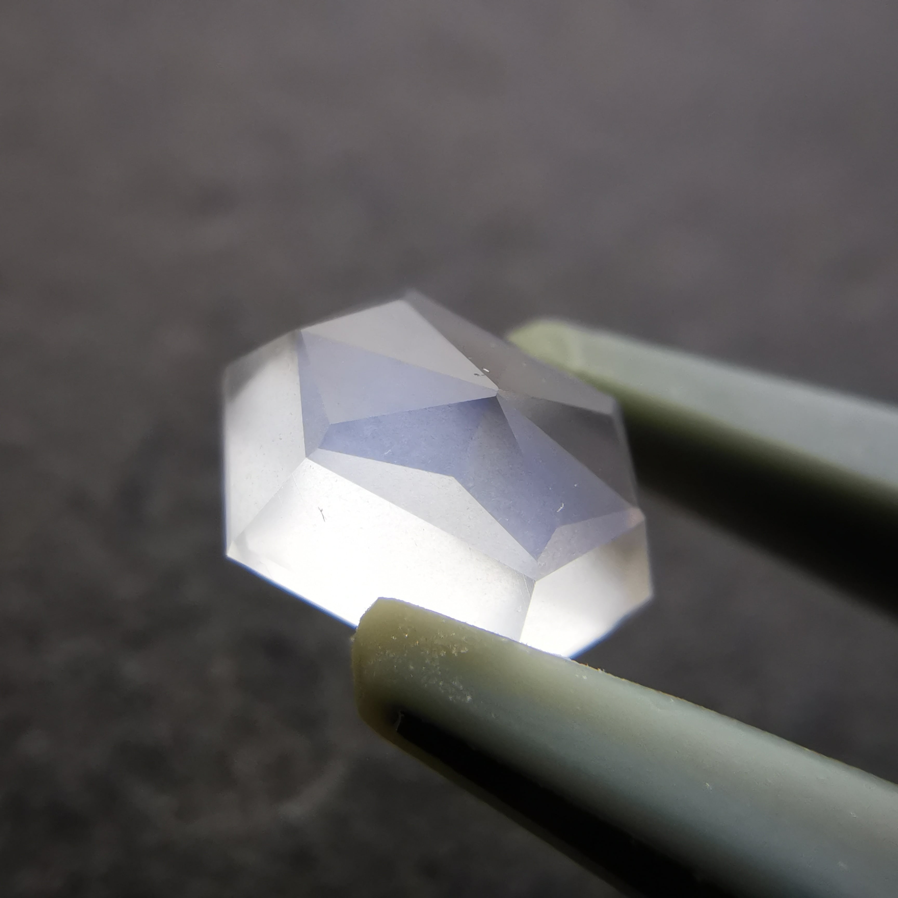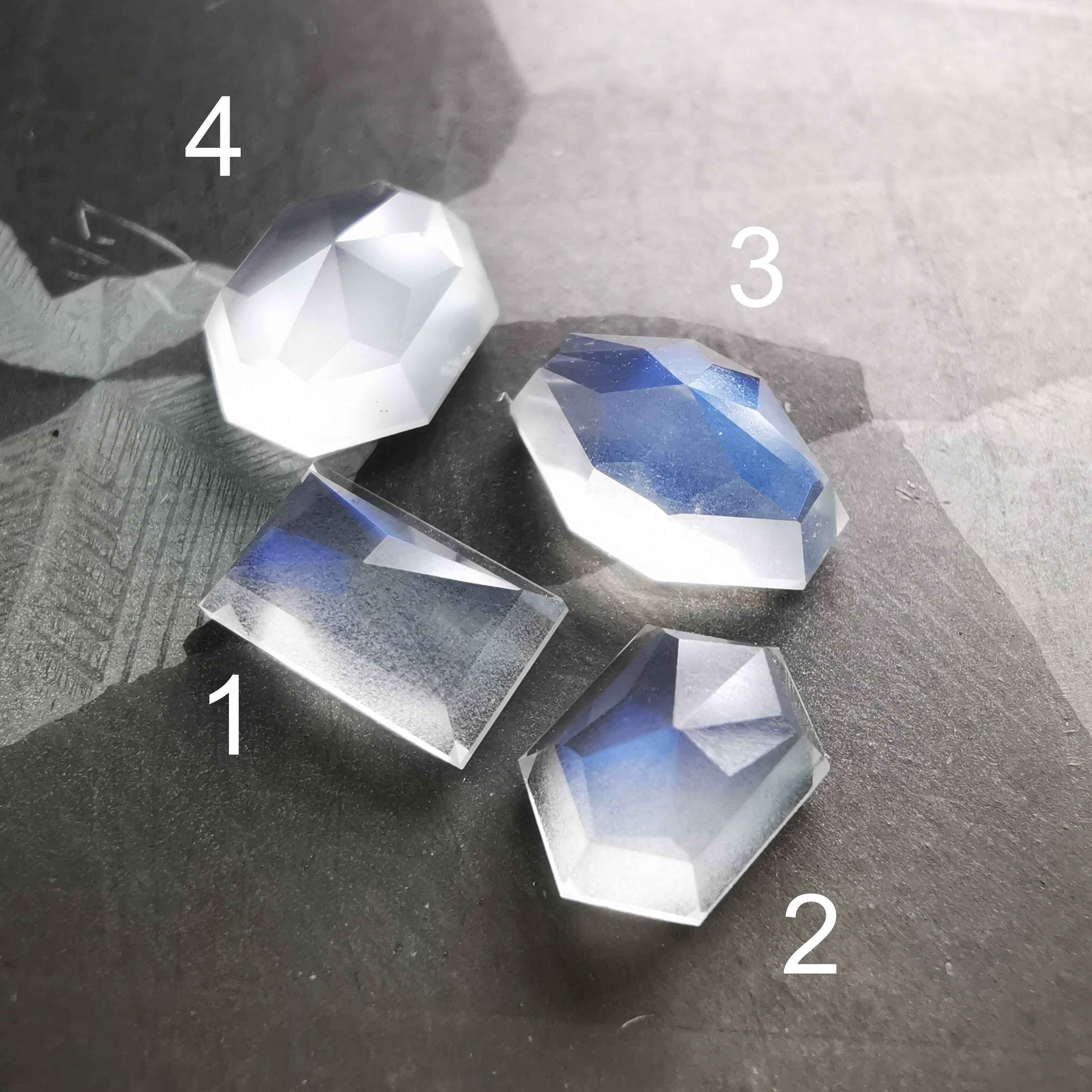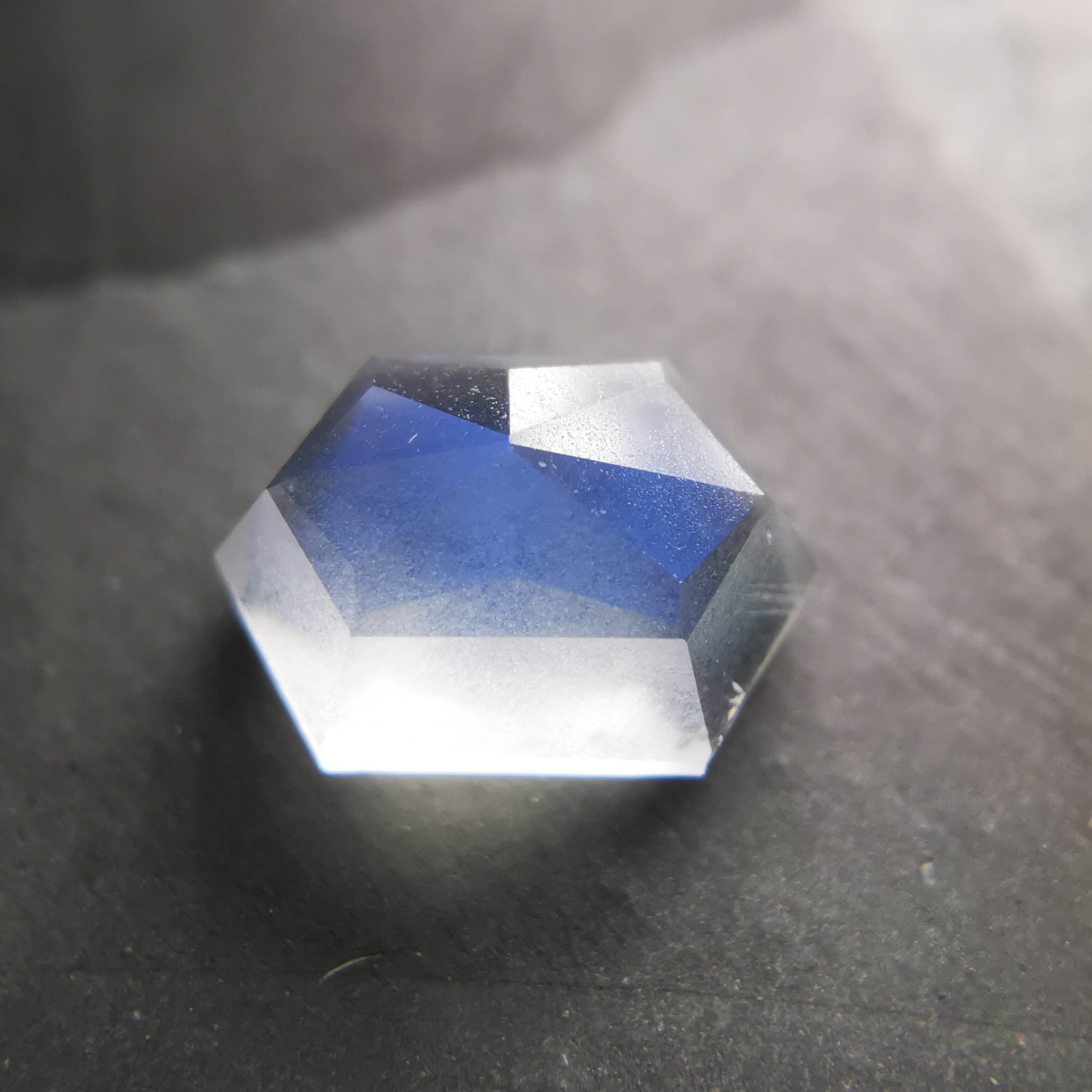 灰みの半透明の石の表面を、鮮やかなブルーが覆うムーンストーンです。