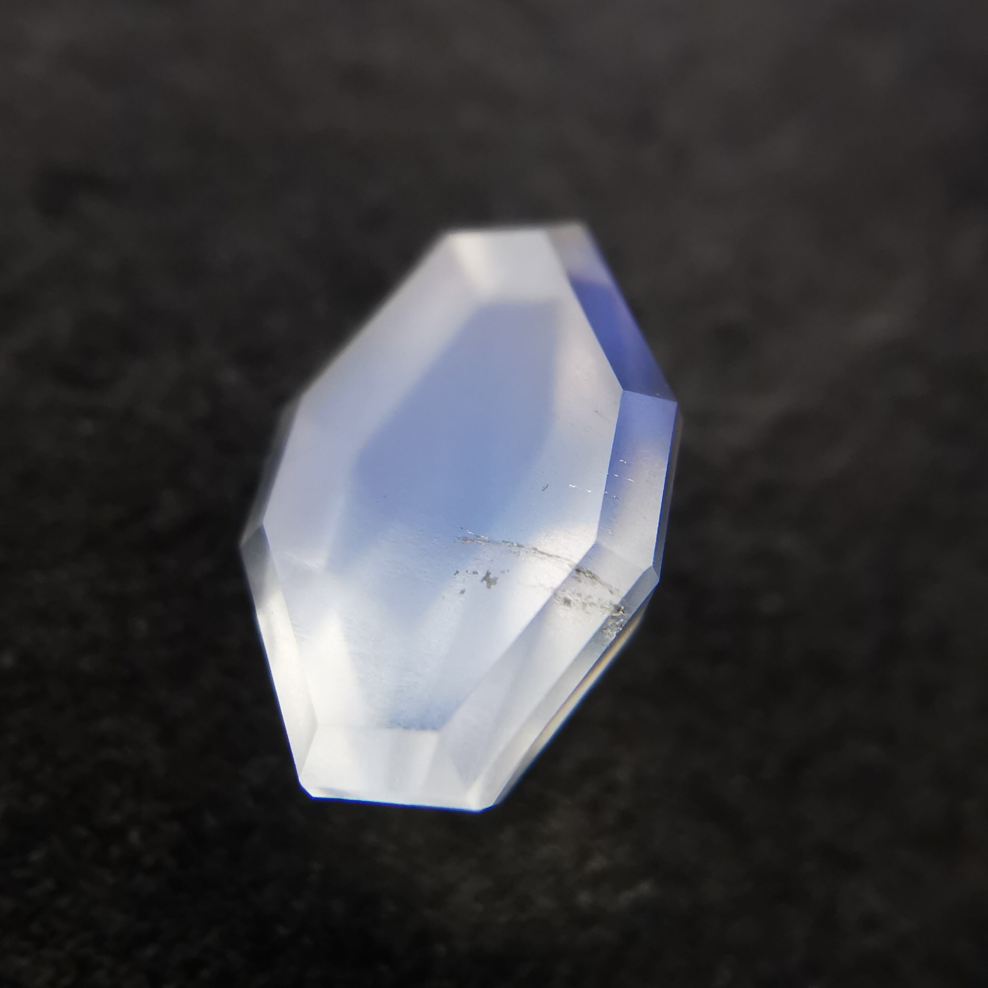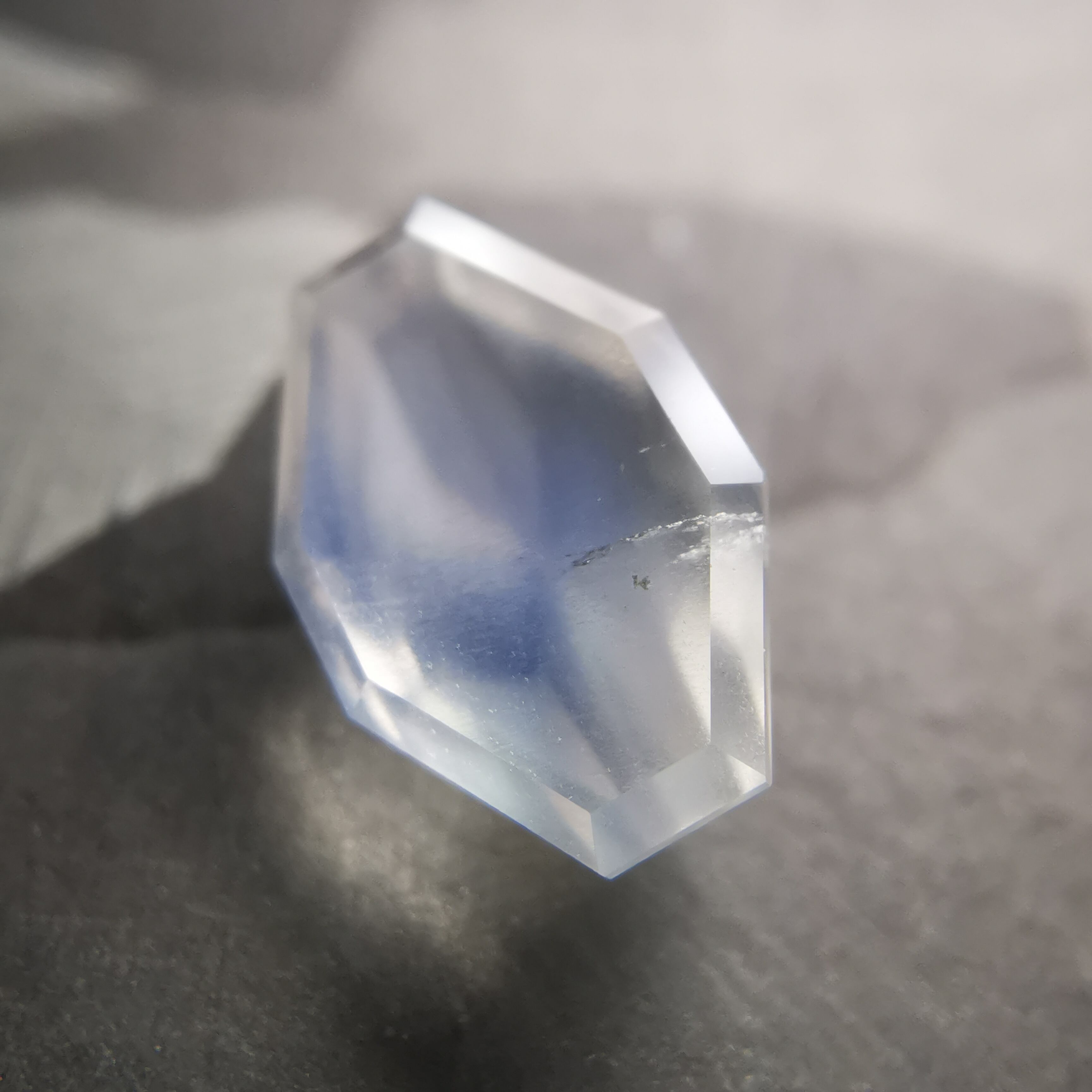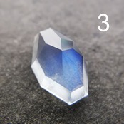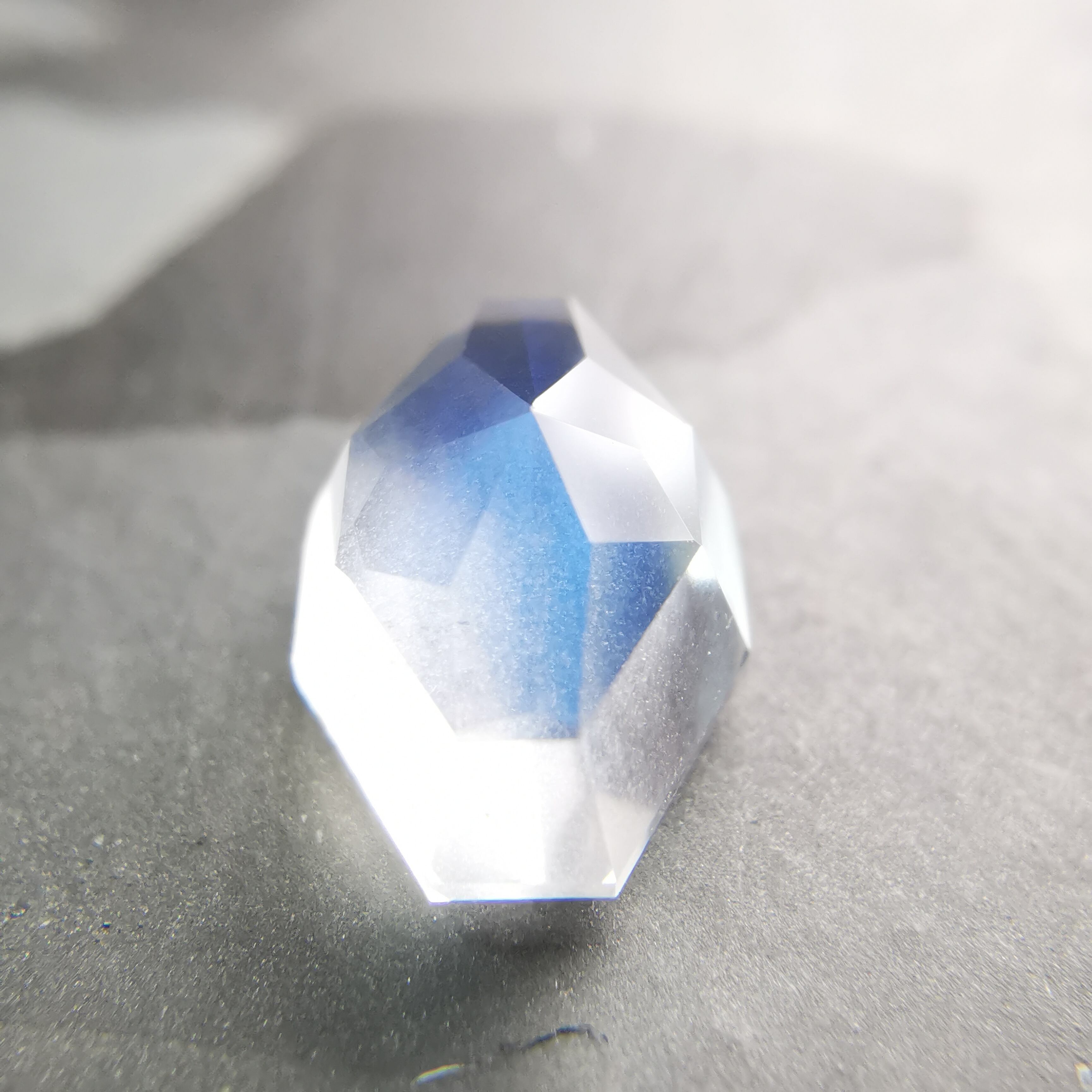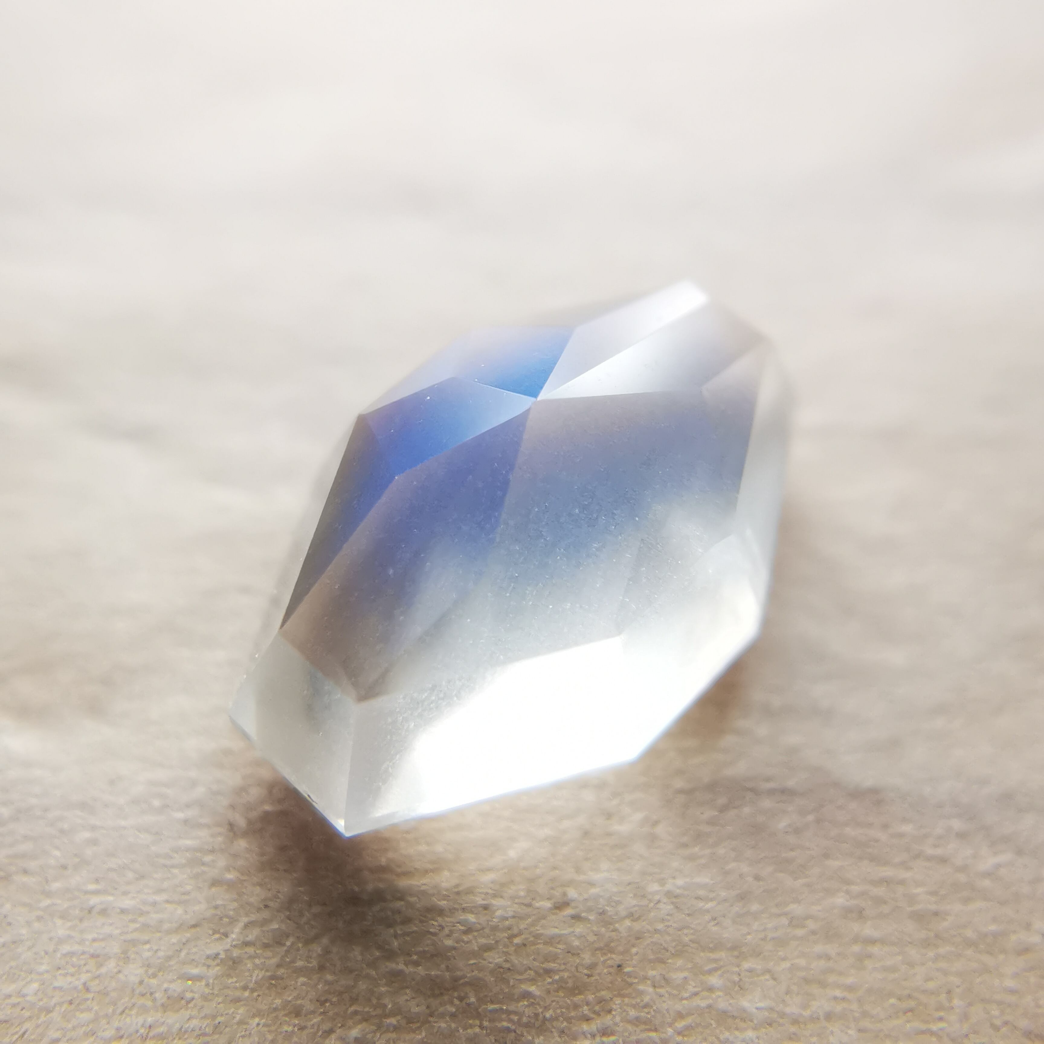 灰みの半透明の石の表面を、鮮やかなブルーが覆うムーンストーンです。