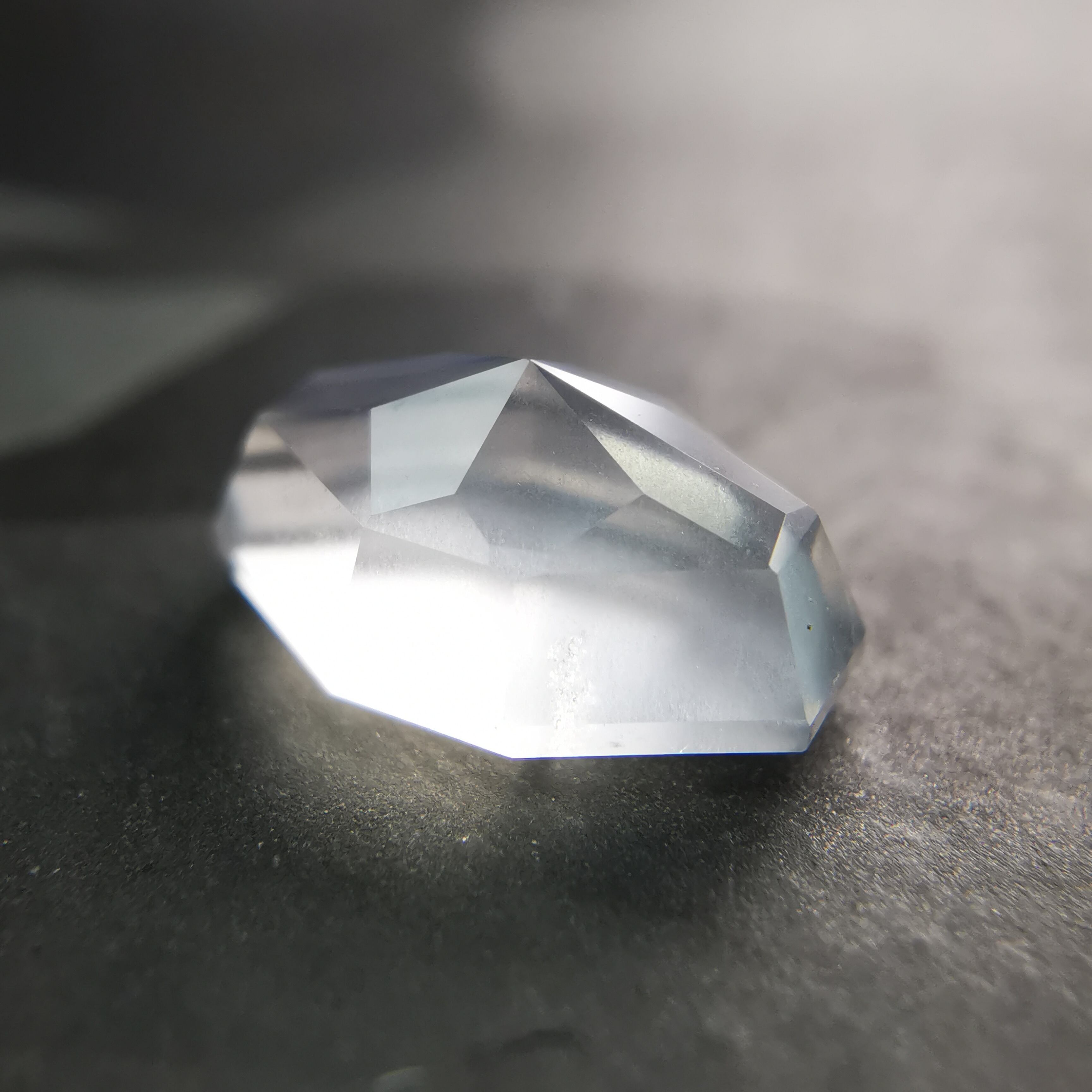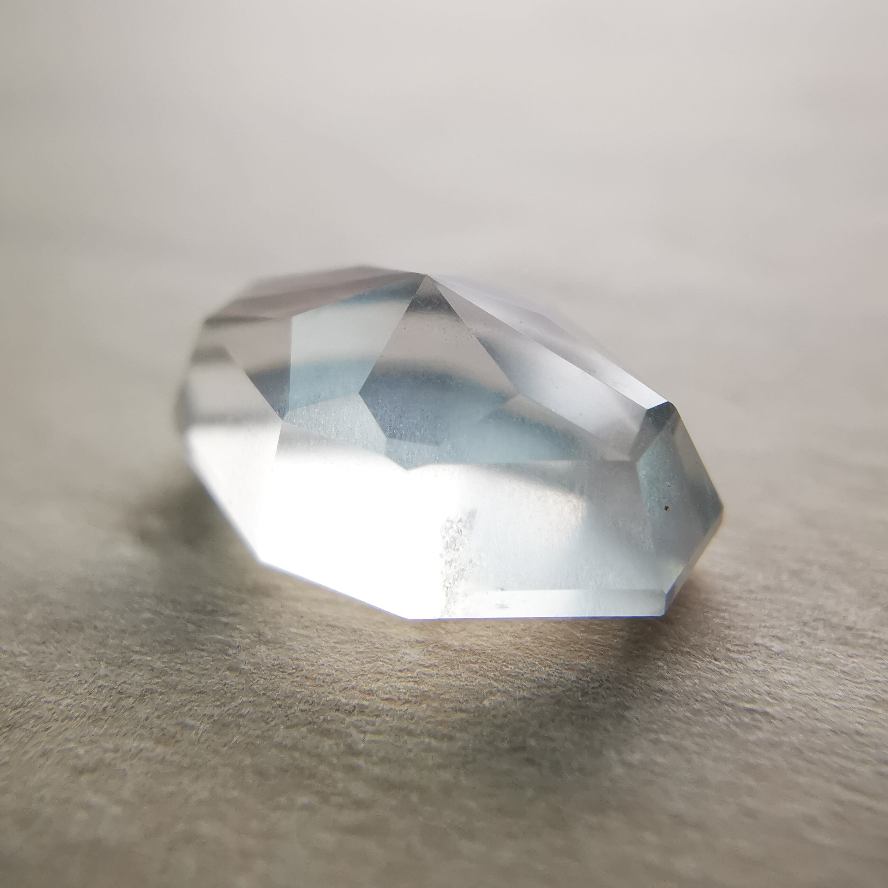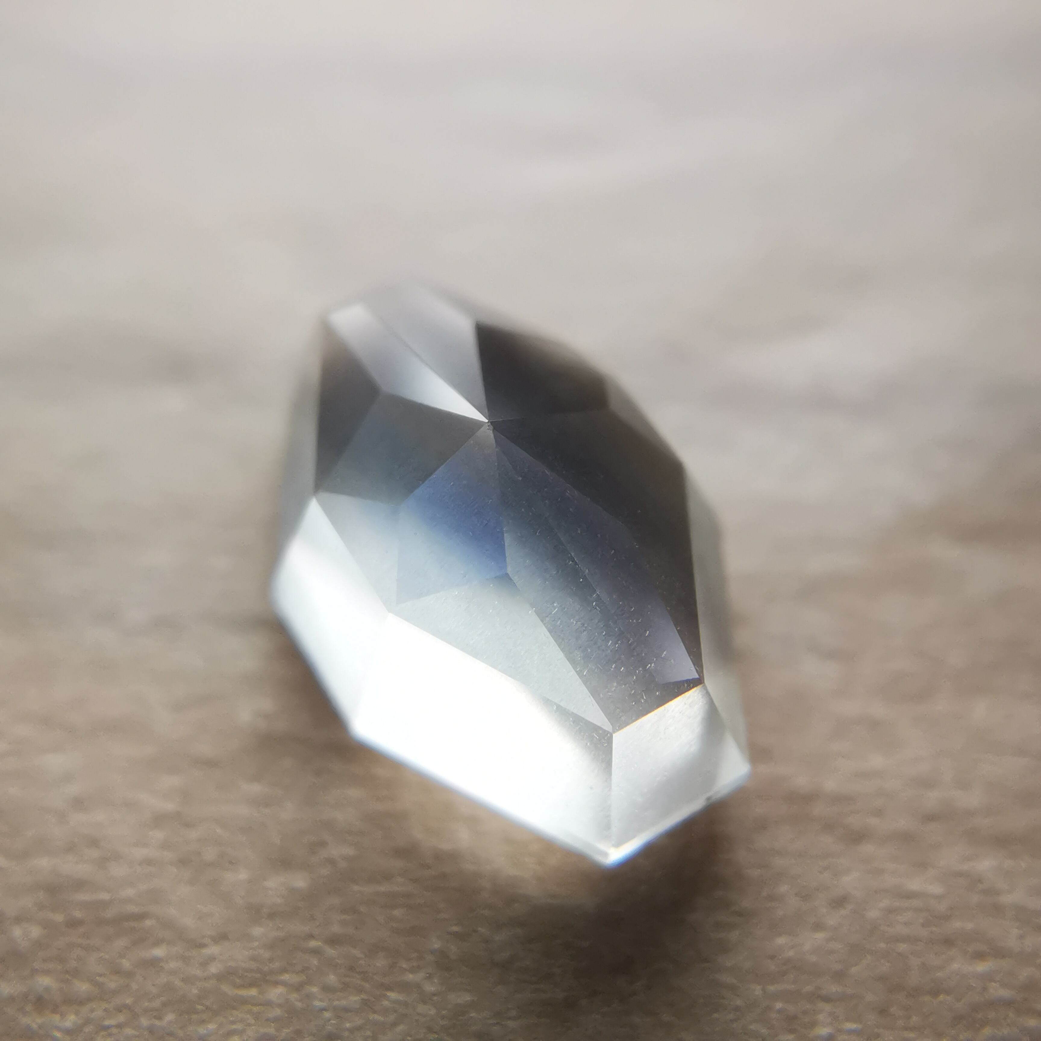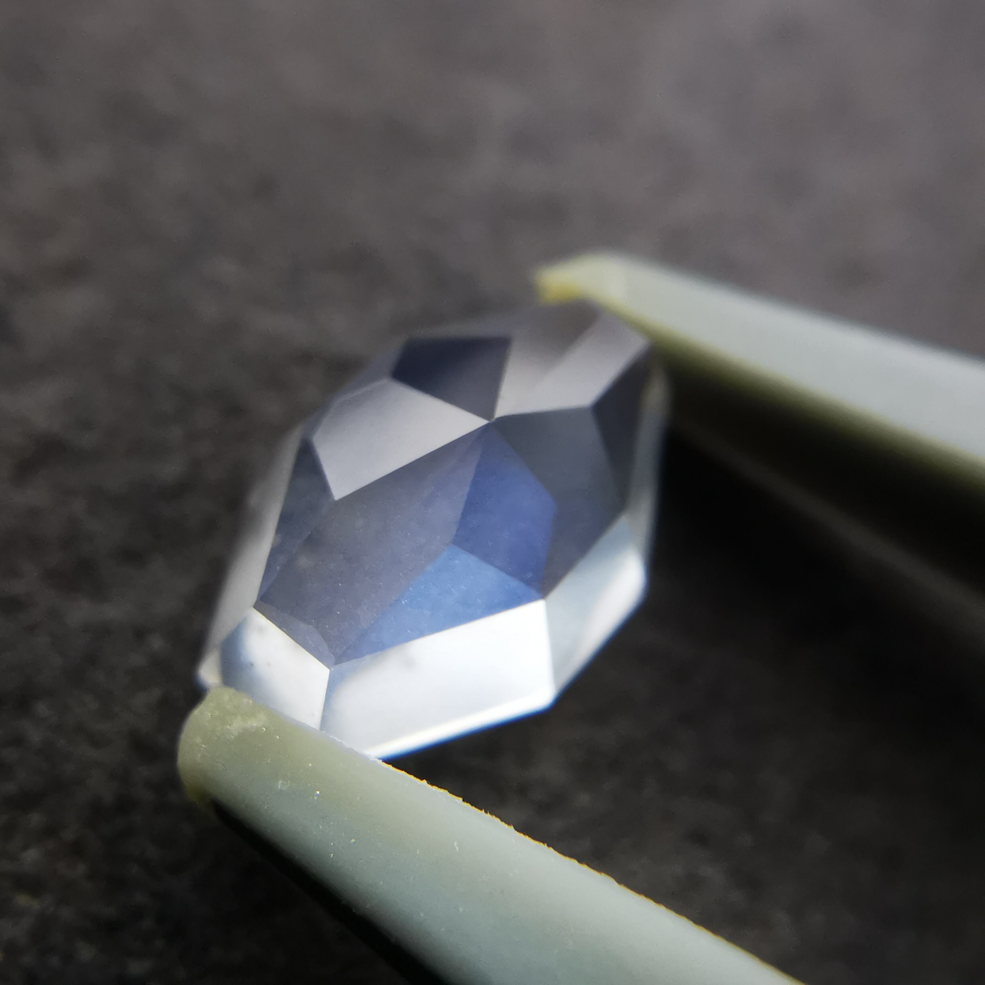 灰みの半透明の石の表面を、鮮やかなブルーが覆うムーンストーンです。
