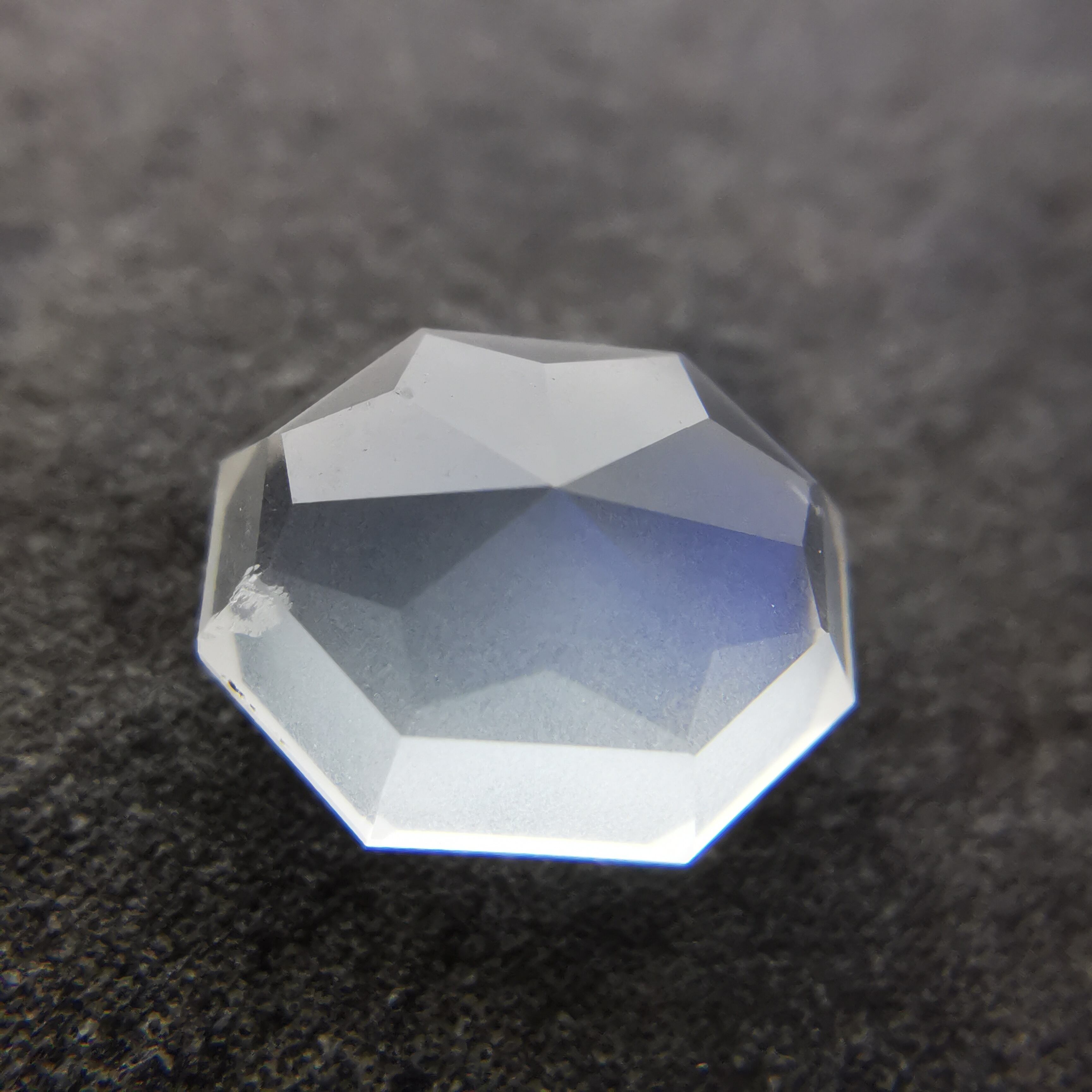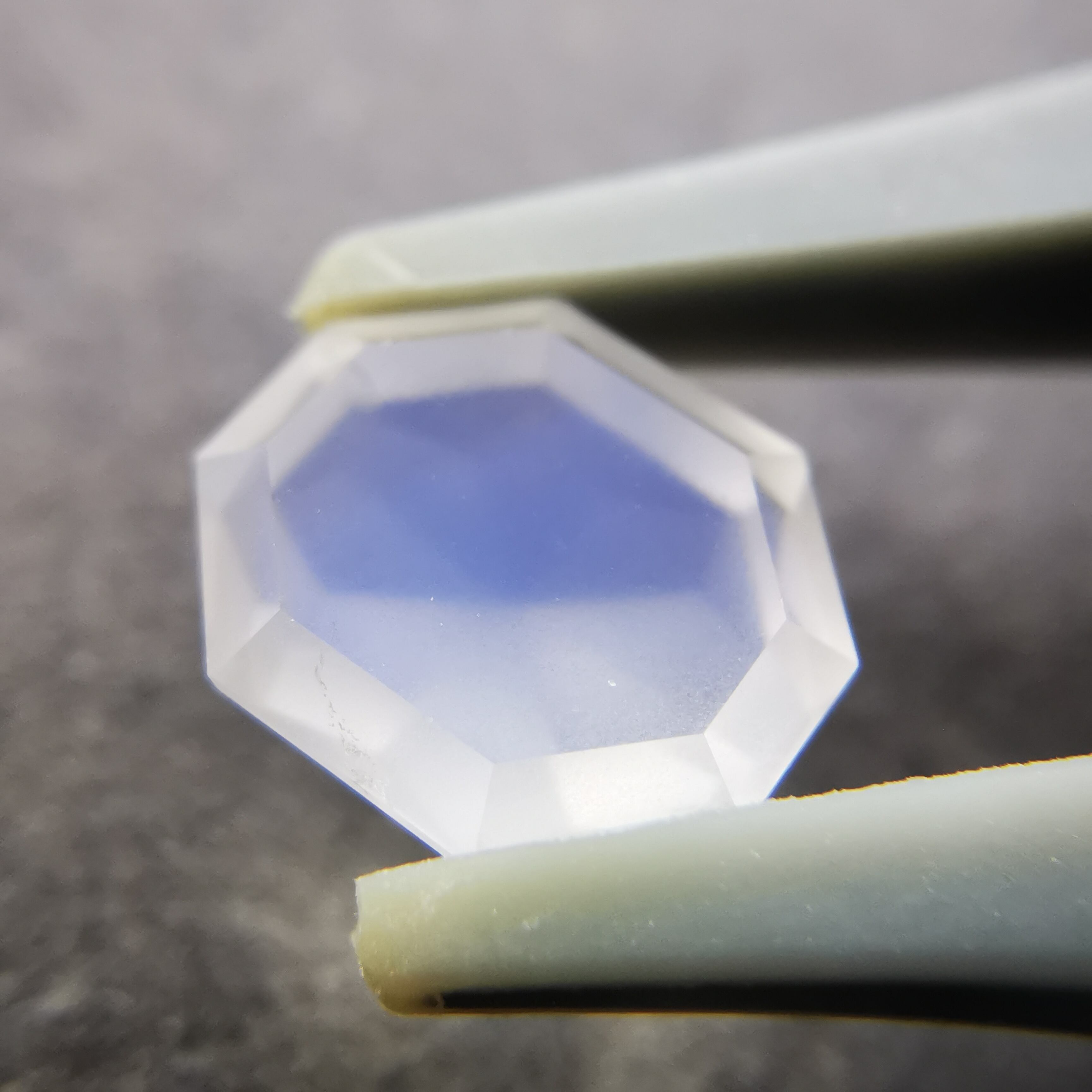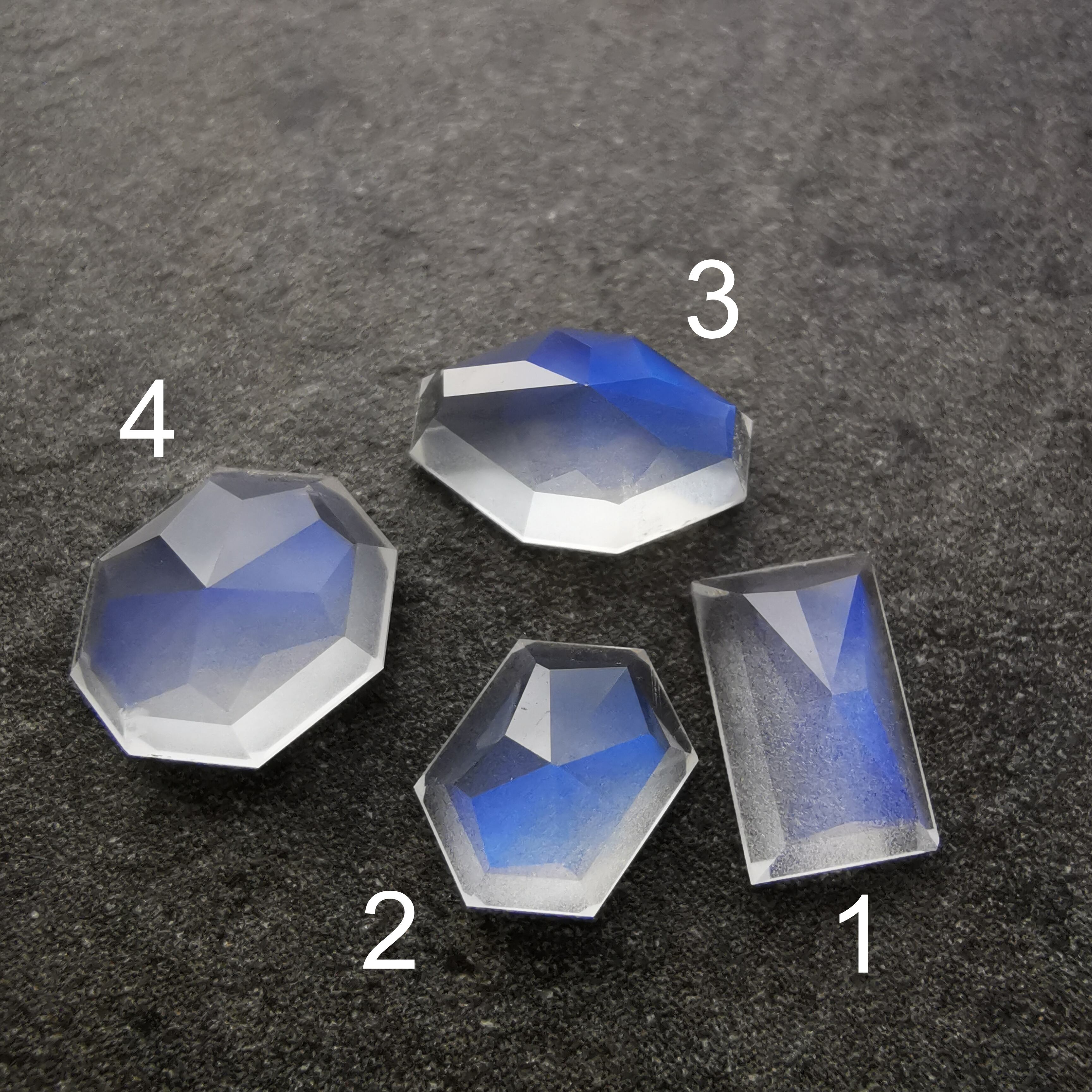 灰みの半透明の石の表面を、鮮やかなブルーが覆うムーンストーンです。