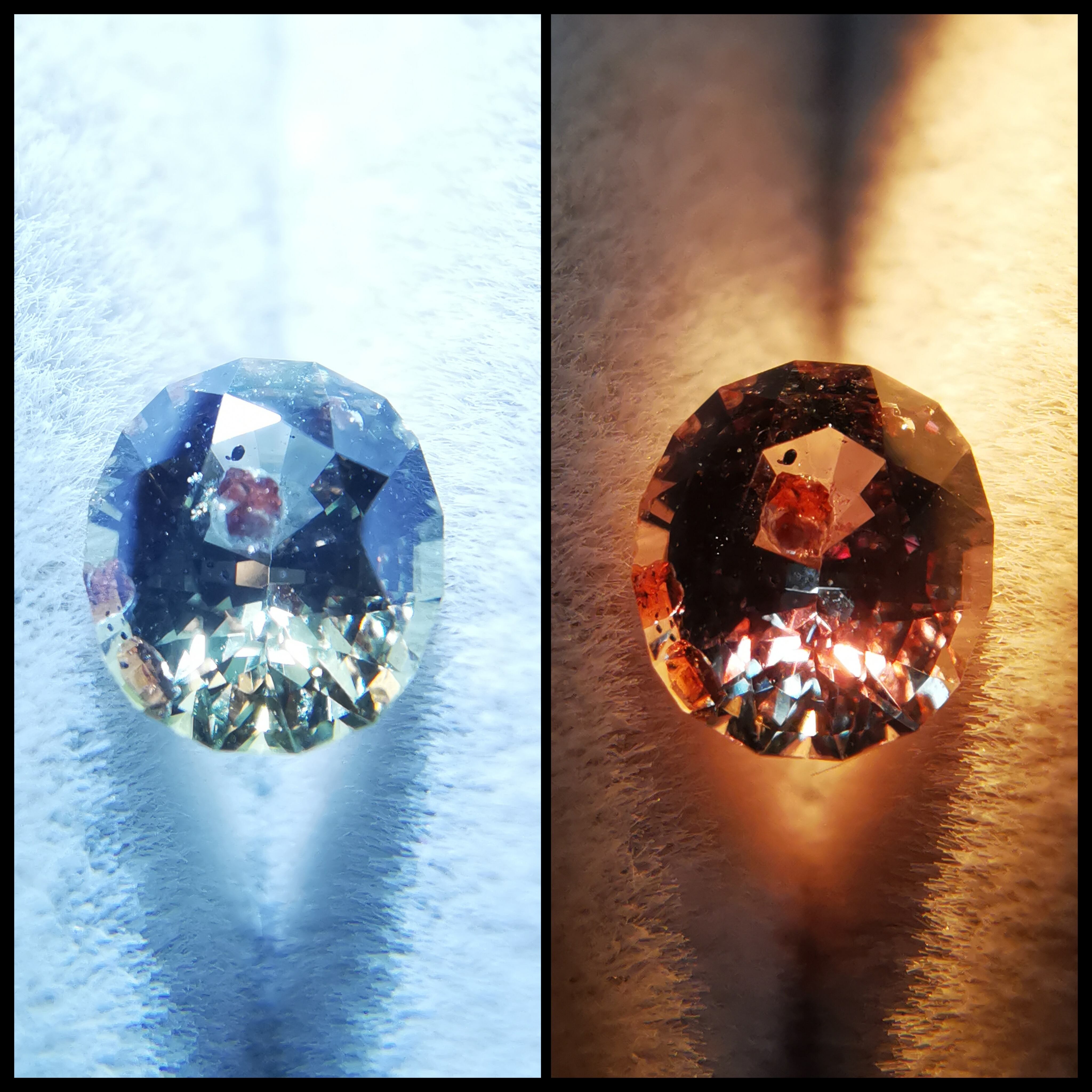 ソーティングでカラーチェンジの表記があり、淡いグリーン系グレーからピンク系グレーにカラーチェンジしているように見えますが、赤いガーネットの乱反射もあり、ややわかりにくいです。(写真16)