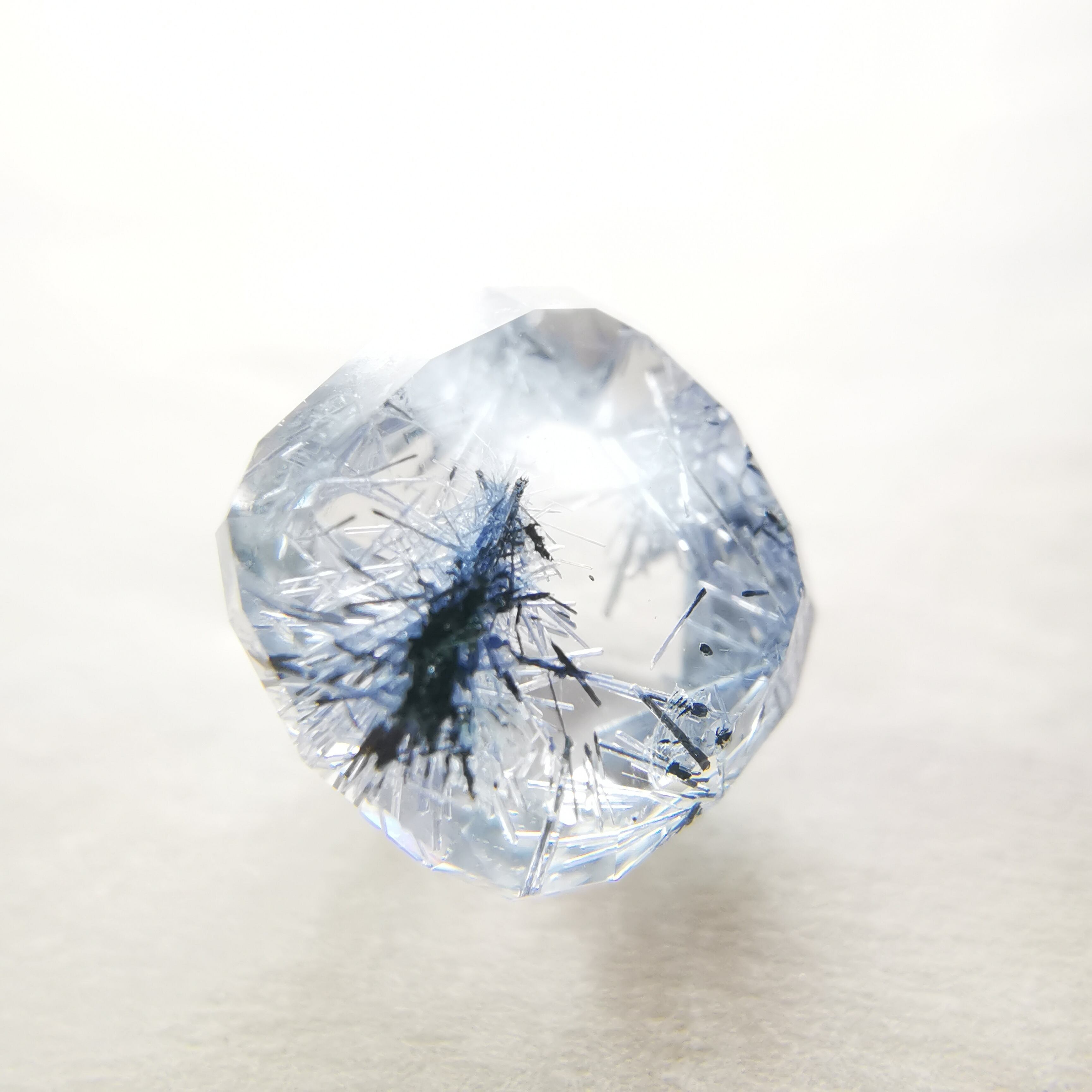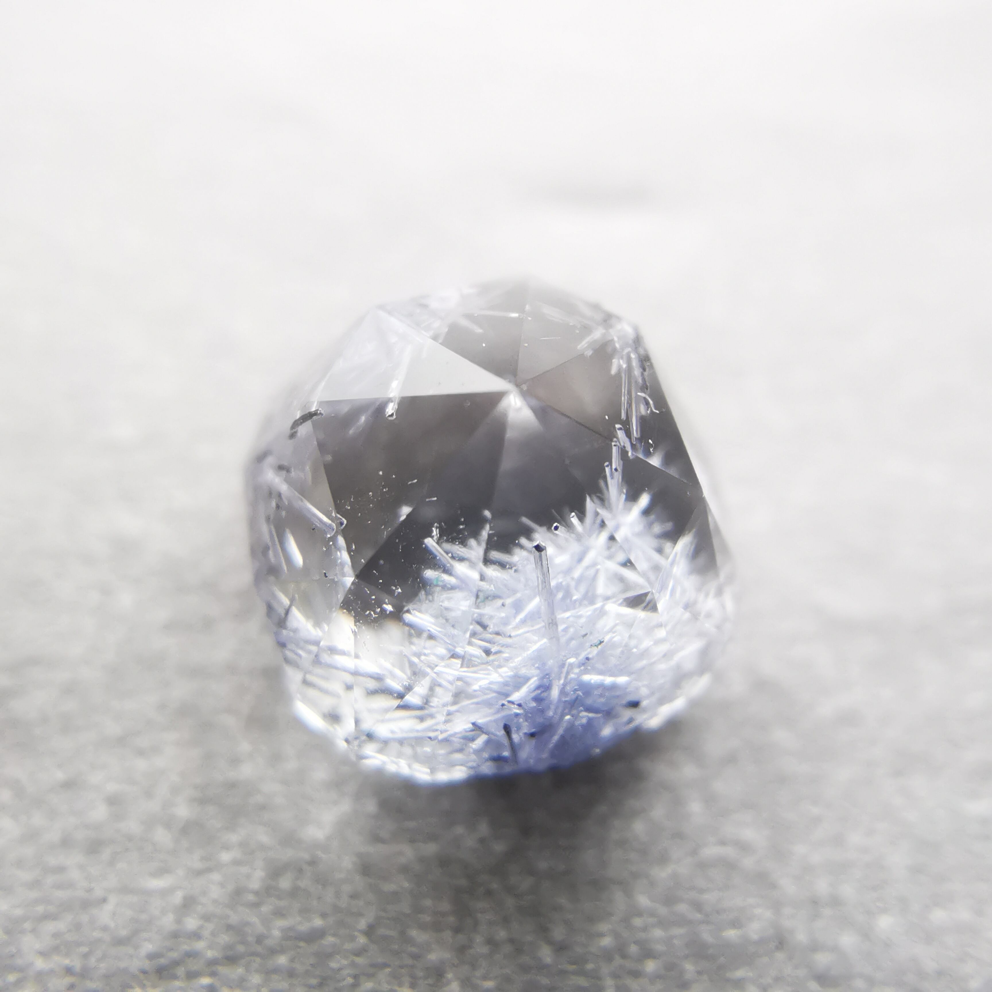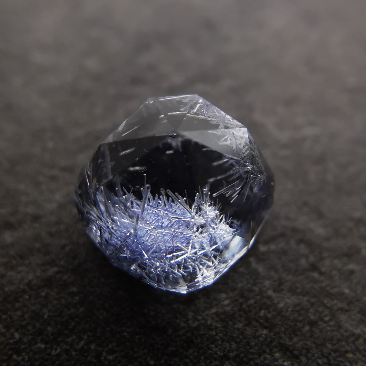 ルーペで、針状、柱状のしっかりと太めの結晶が見える、デュモルチェライトインクォーツです。