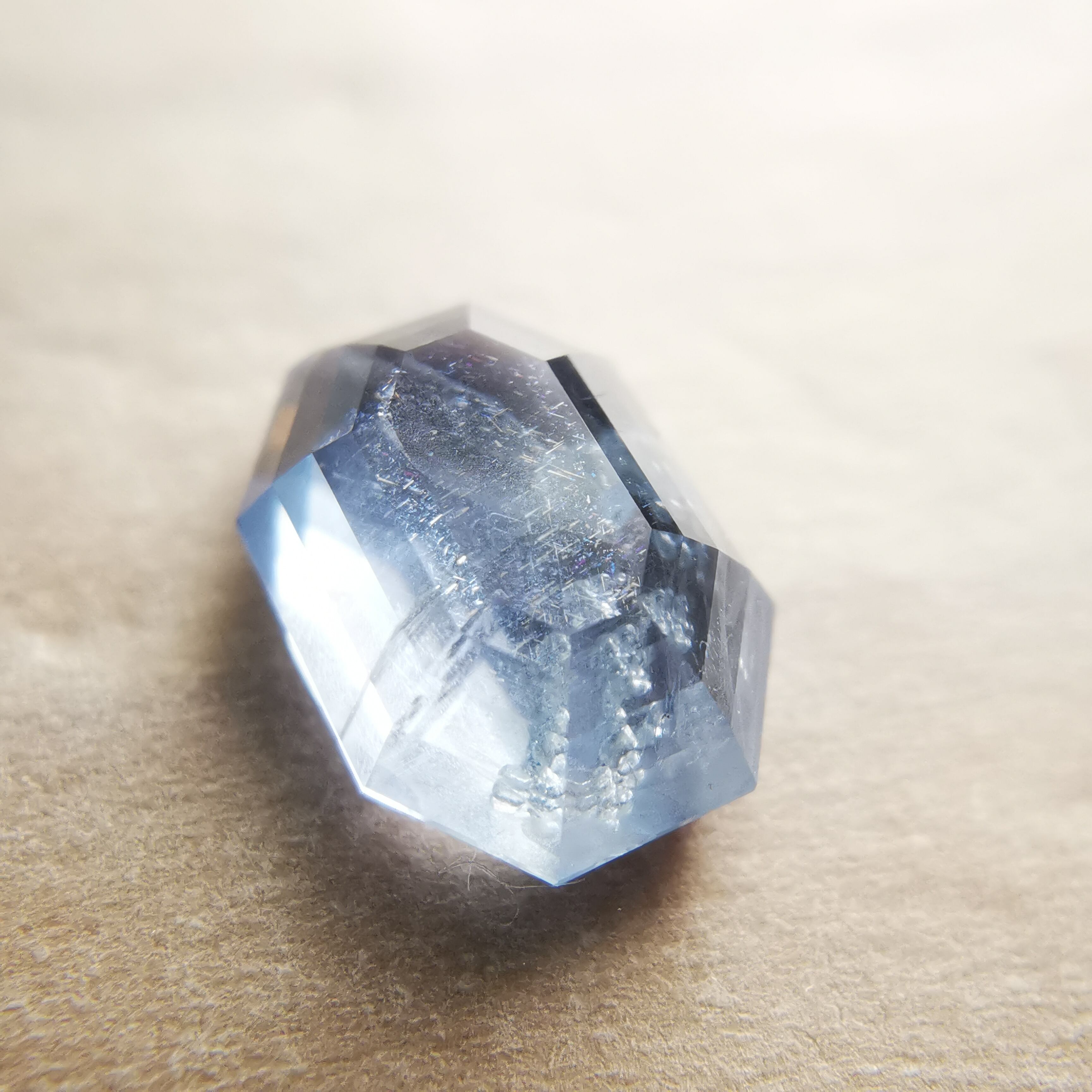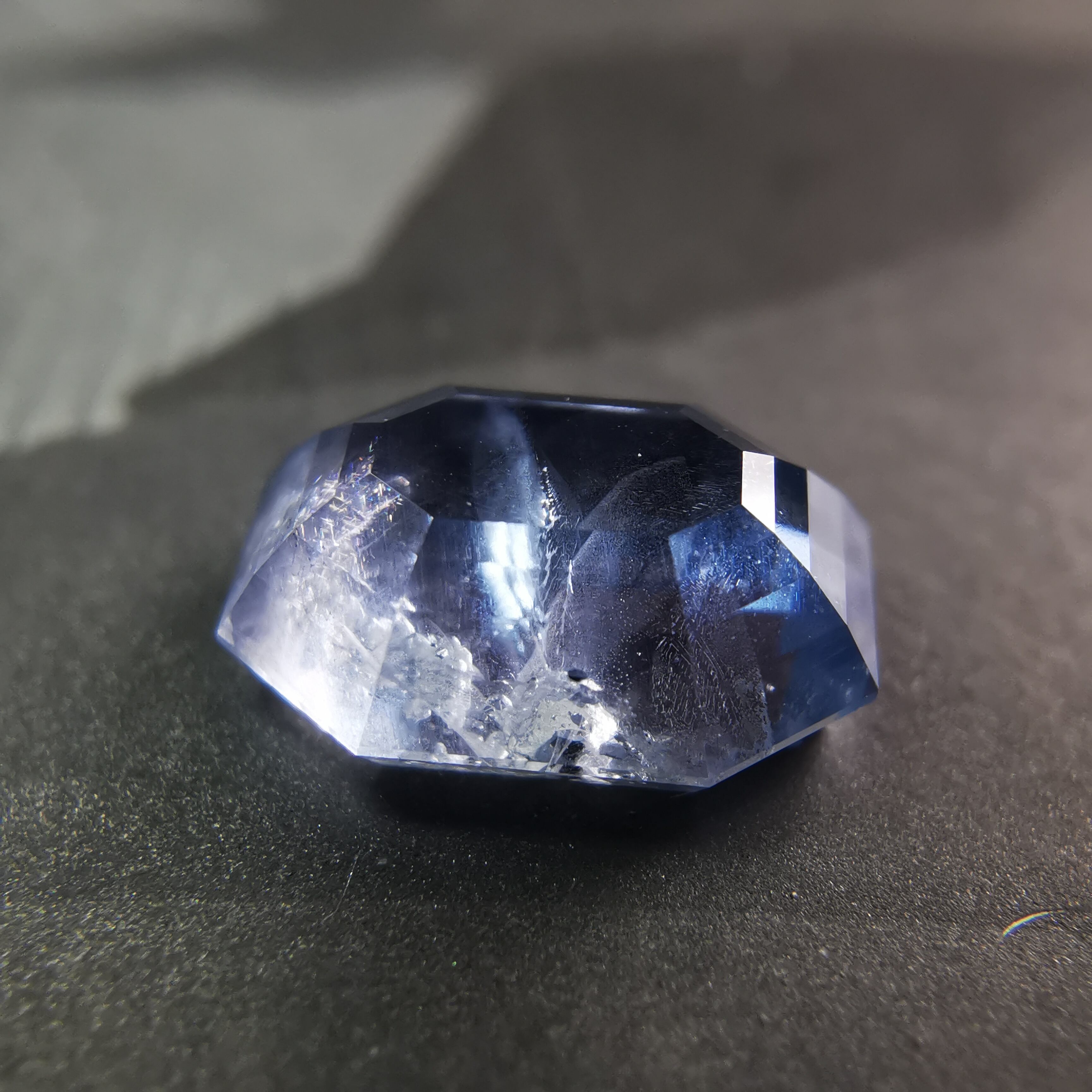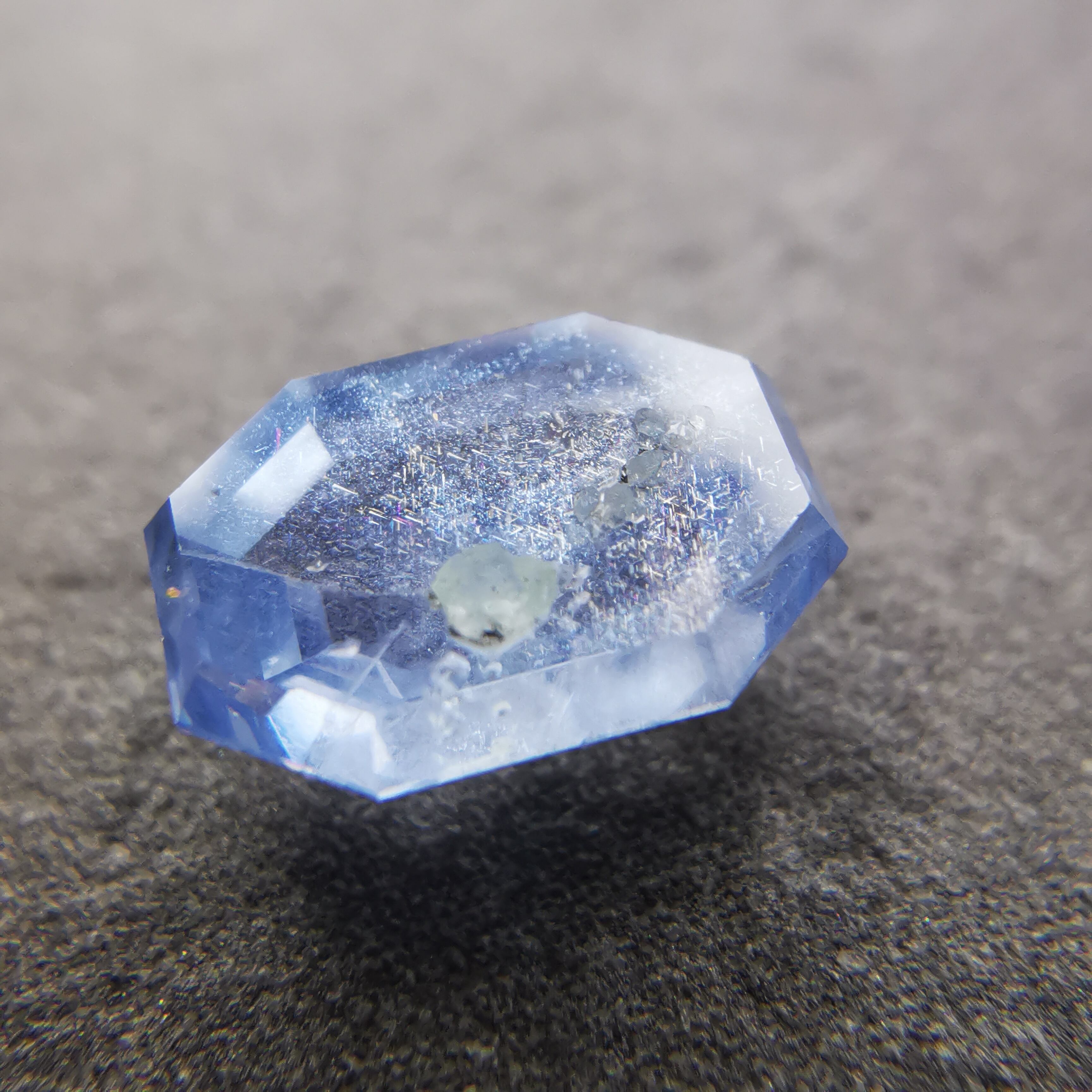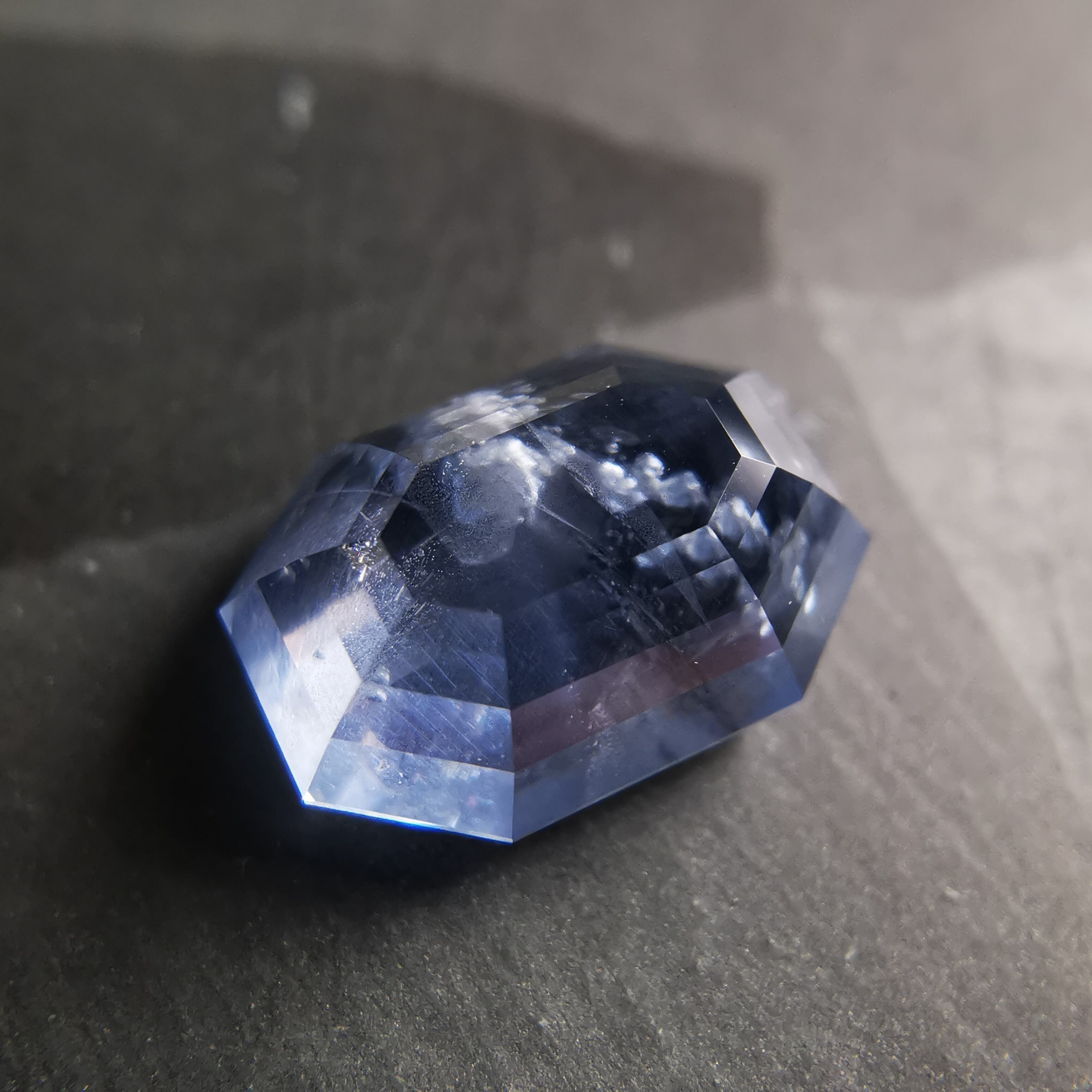 元々スターサファイアにしてはかなり透明度が高く、スターよりもシルクインクインクルージョンが目立つような石を、フラットバックカットにリカットしました。