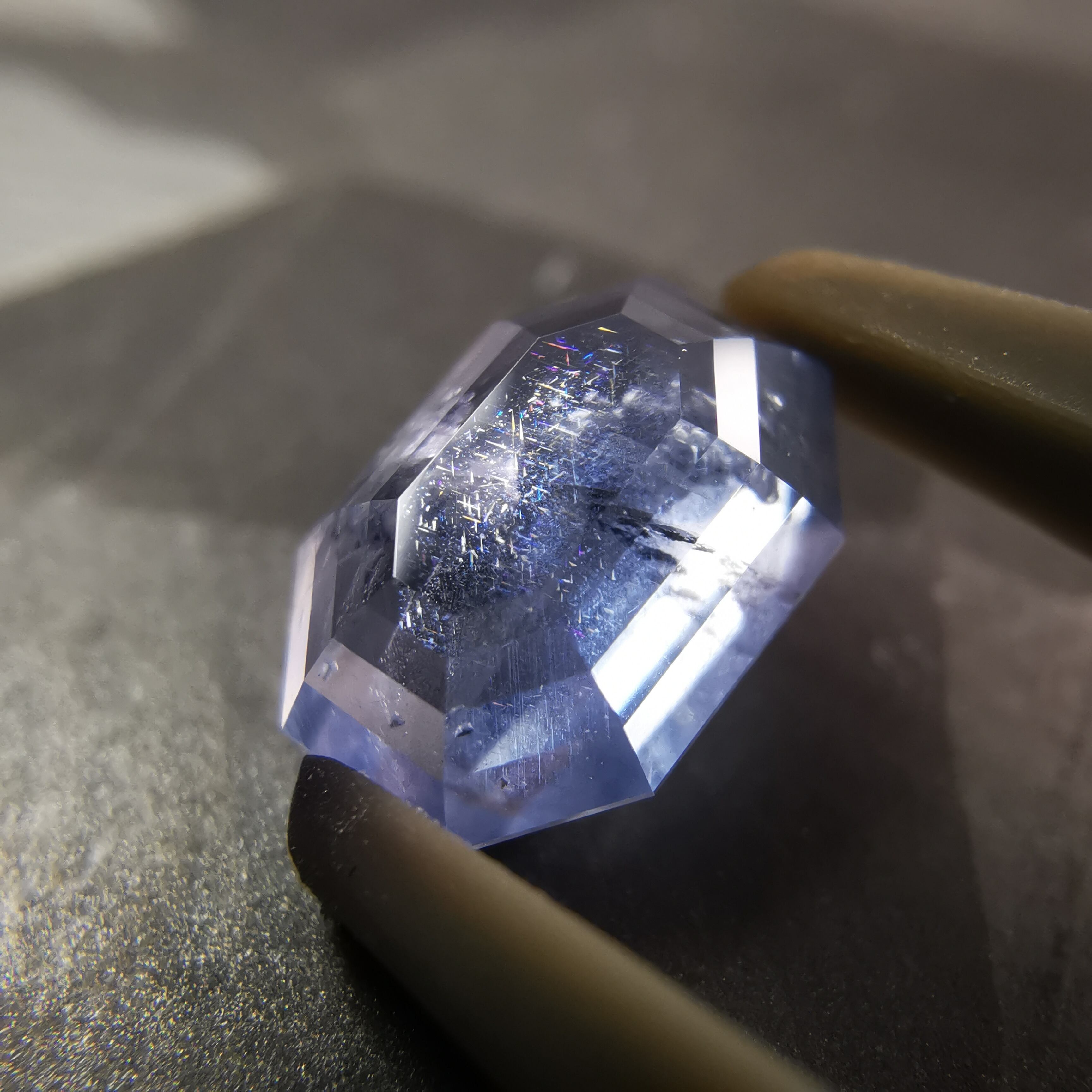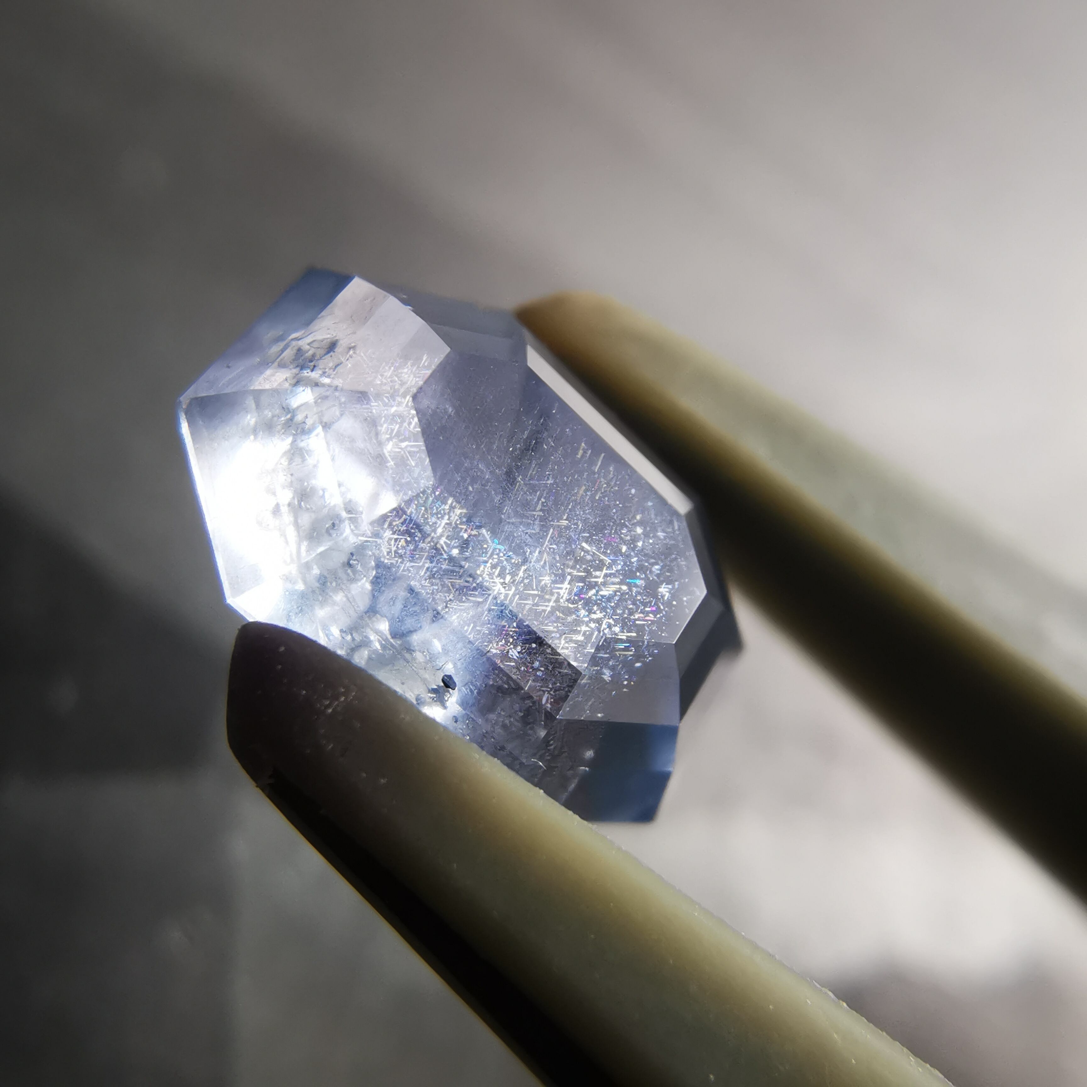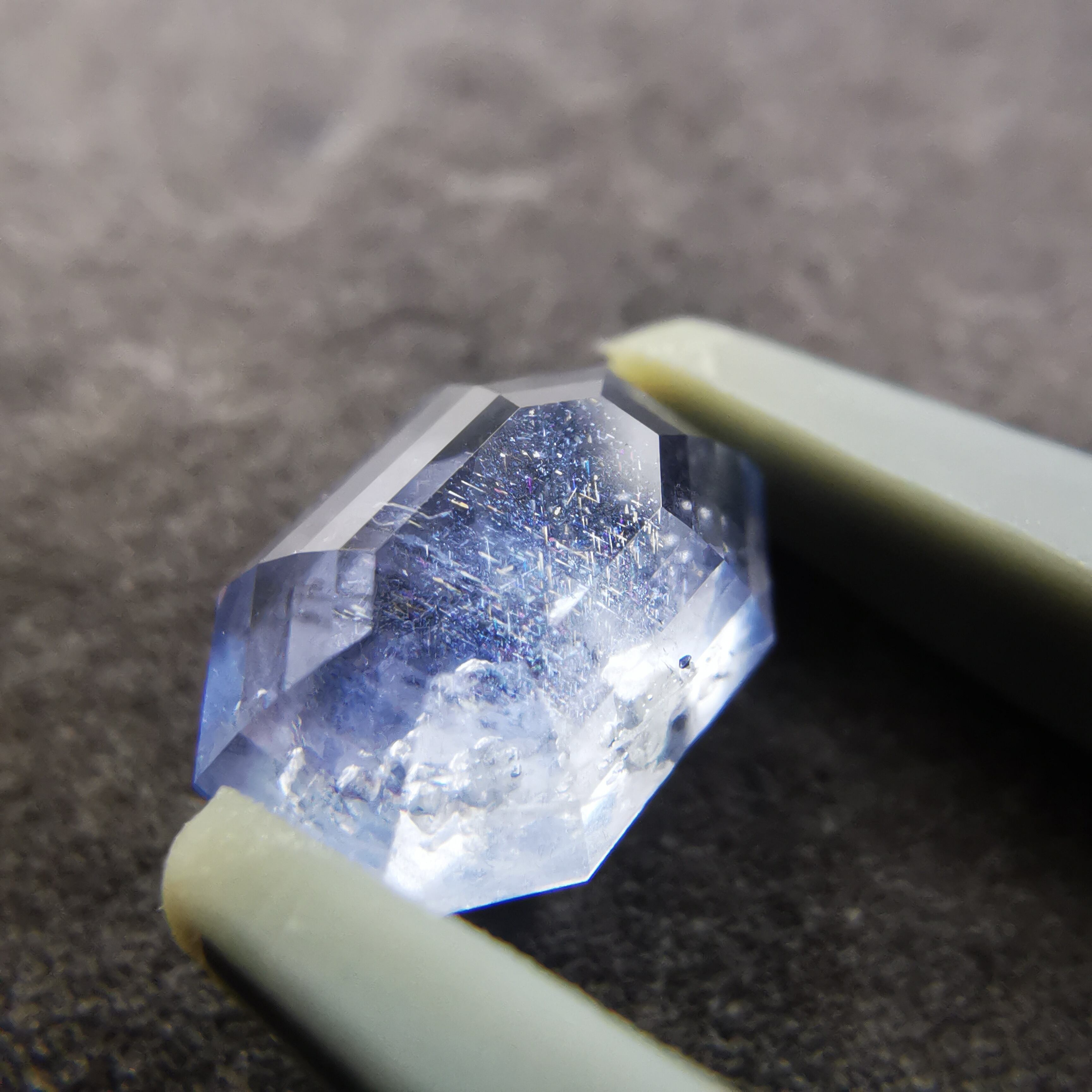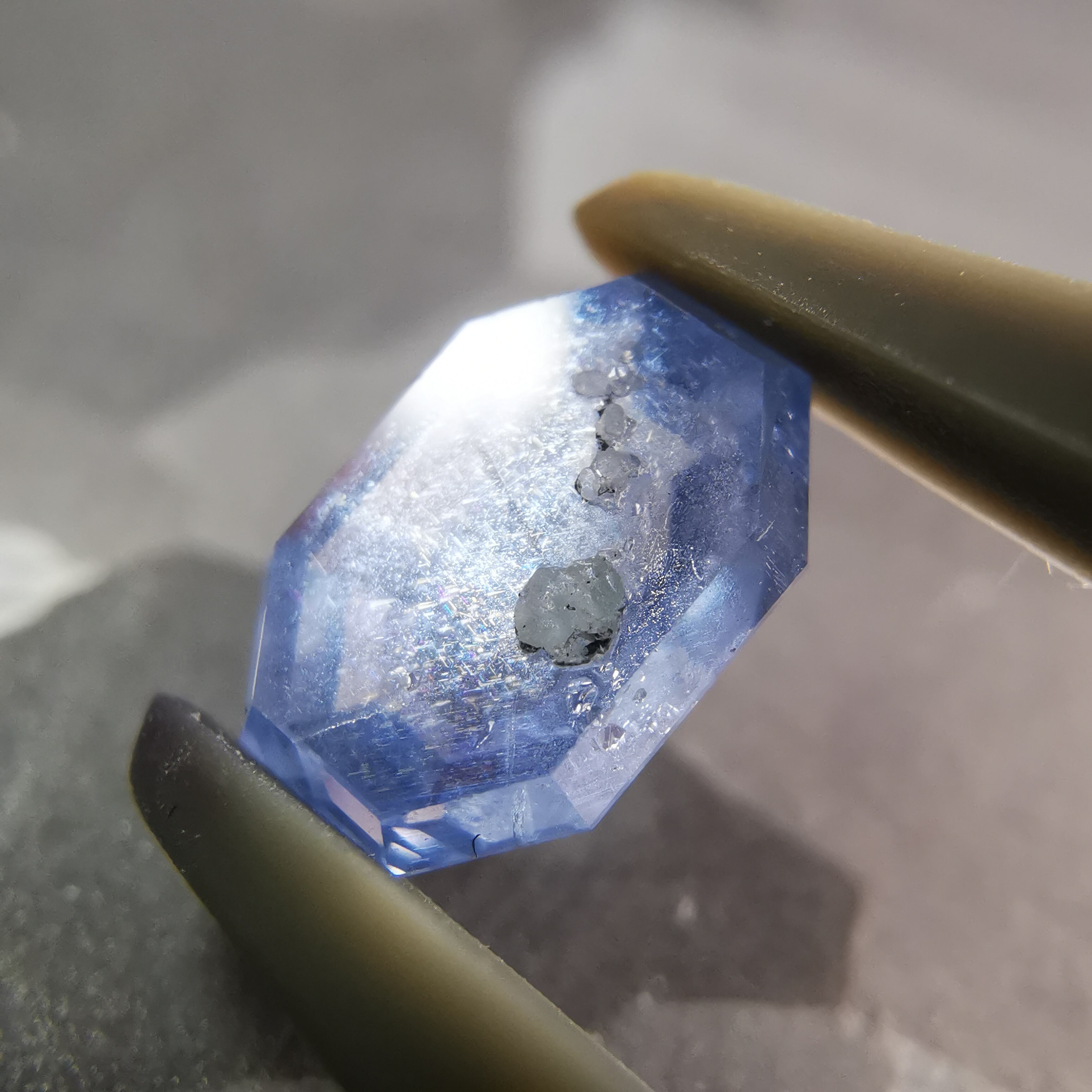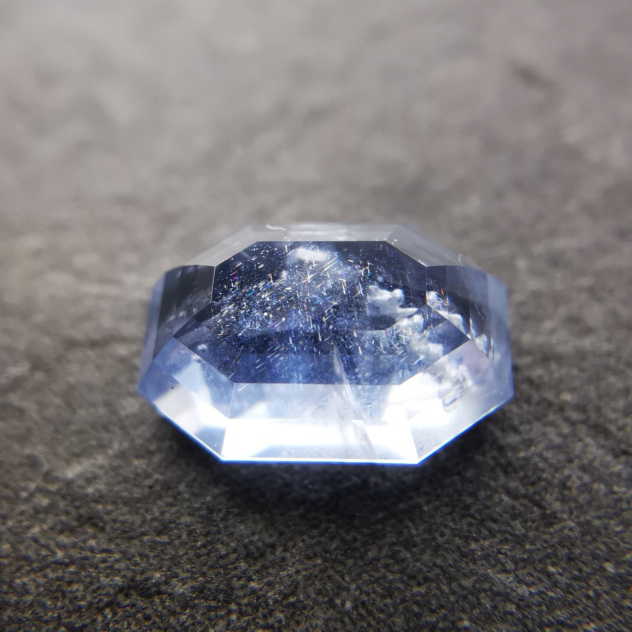 元々スターサファイアにしてはかなり透明度が高く、スターよりもシルクインクインクルージョンが目立つような石を、フラットバックカットにリカットしました。