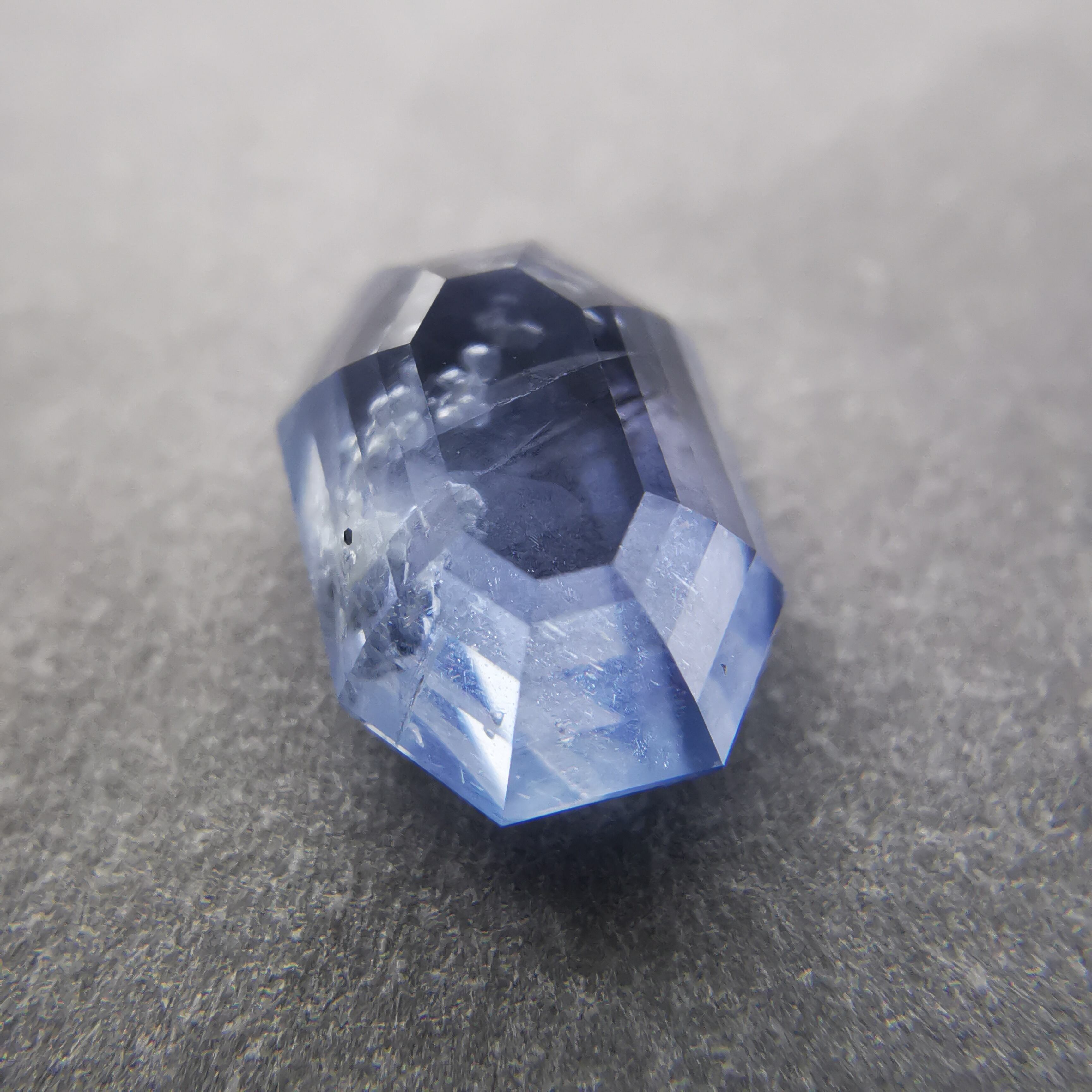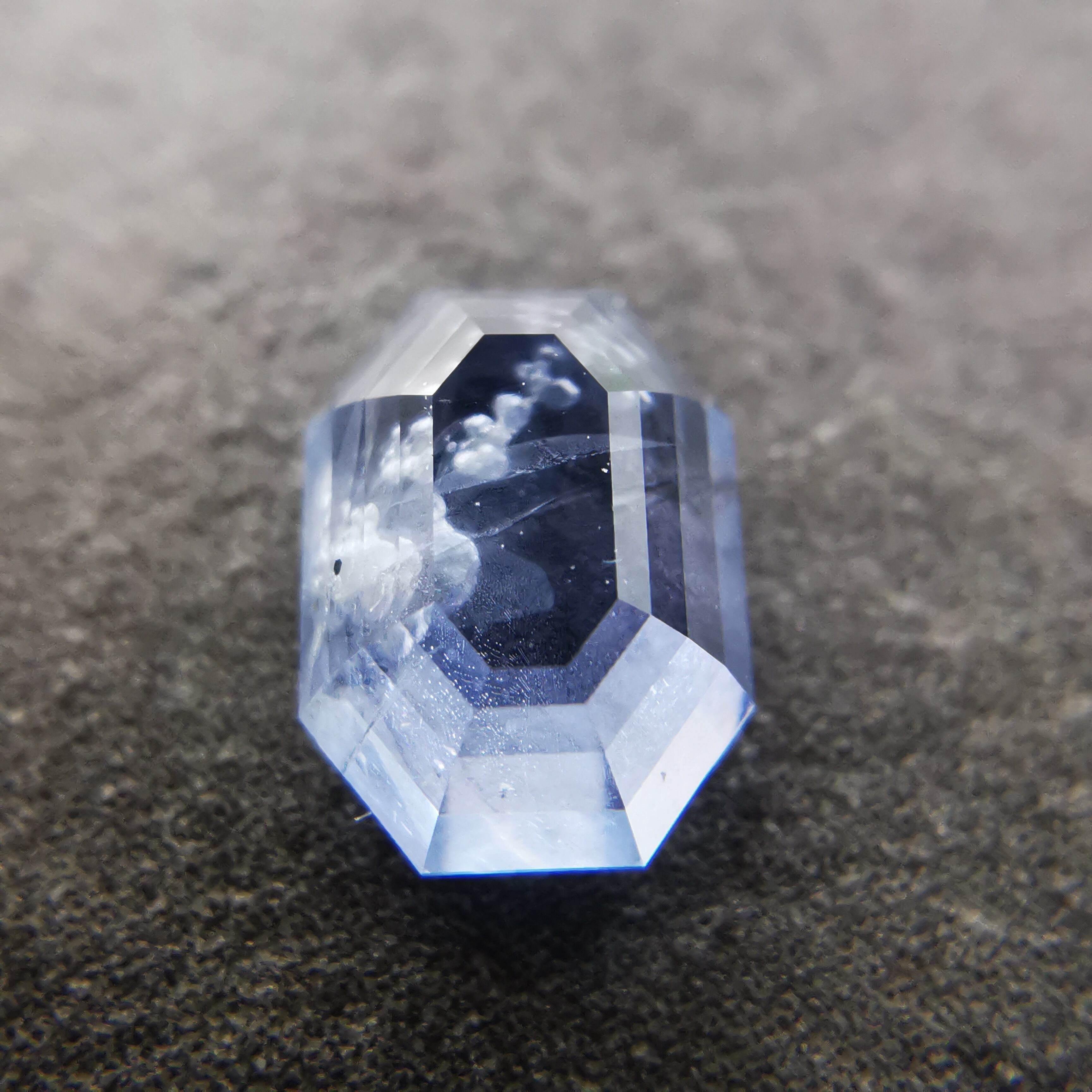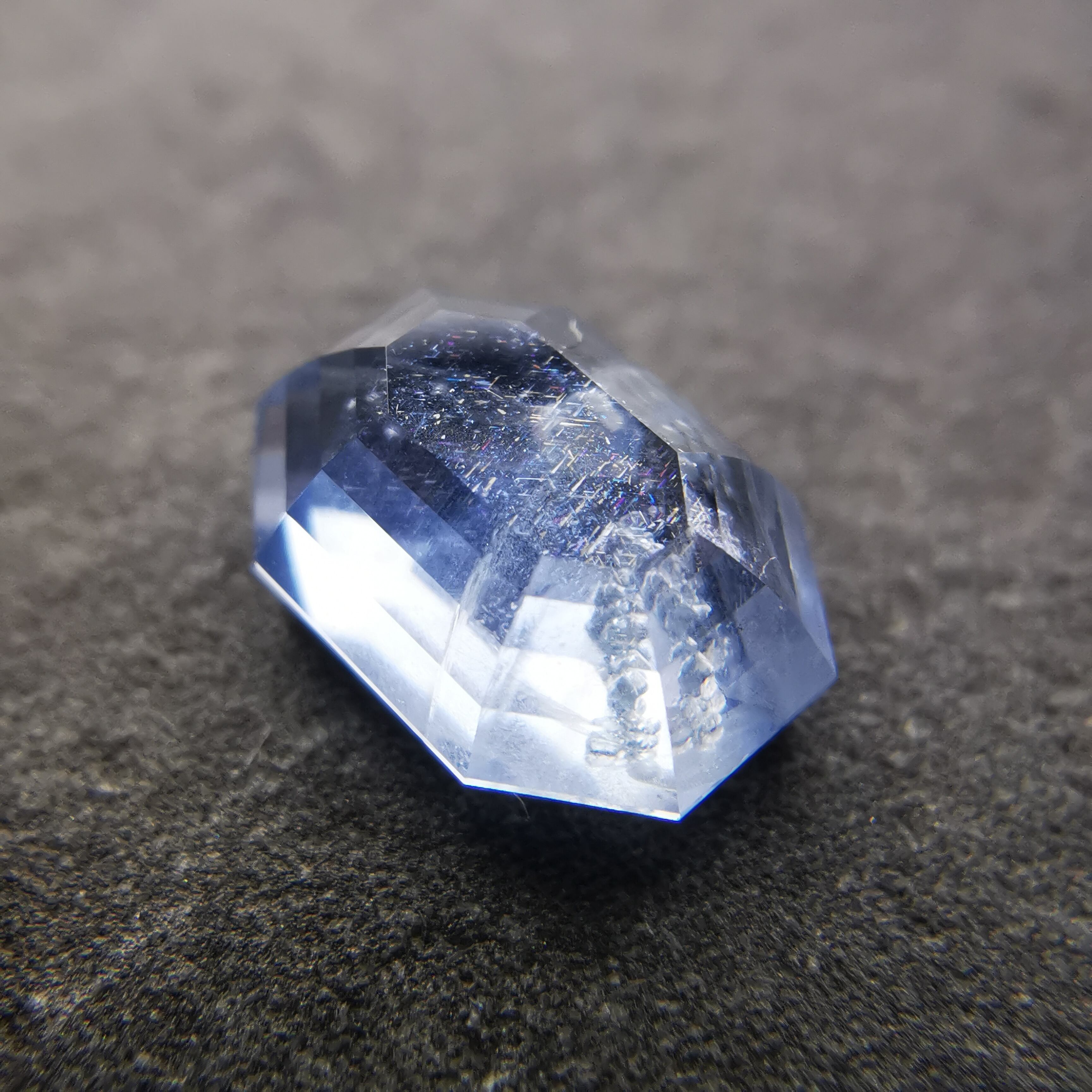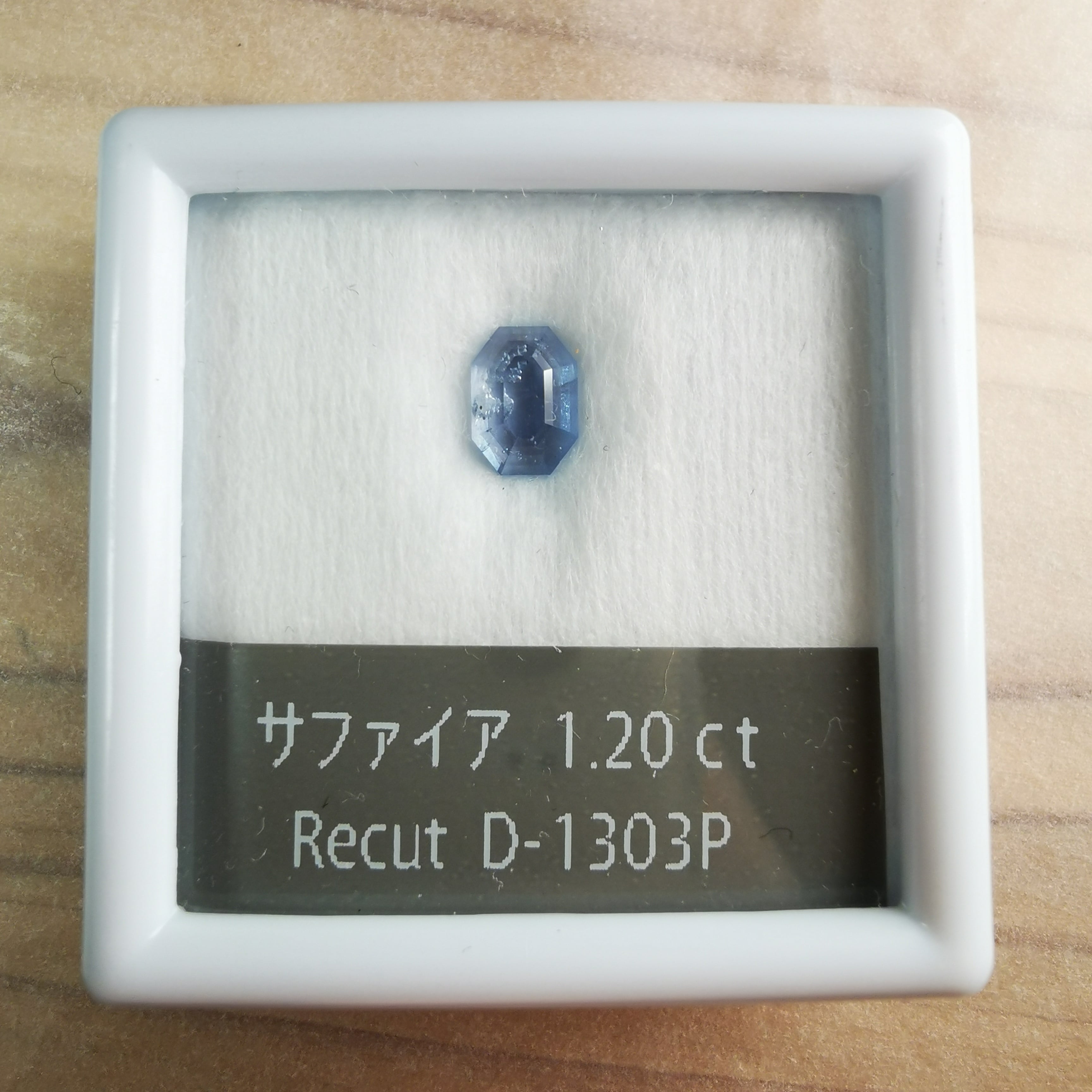 元々スターサファイアにしてはかなり透明度が高く、スターよりもシルクインクインクルージョンが目立つような石を、フラットバックカットにリカットしました。