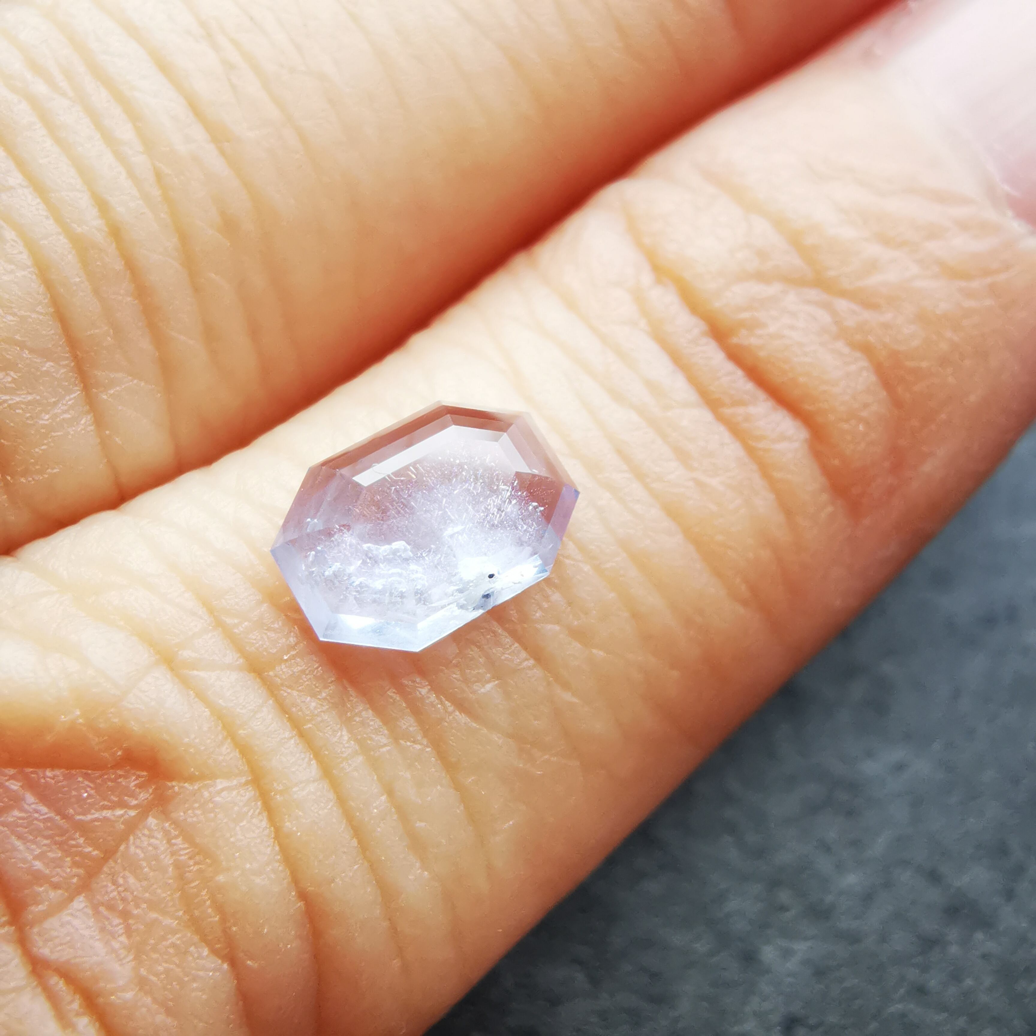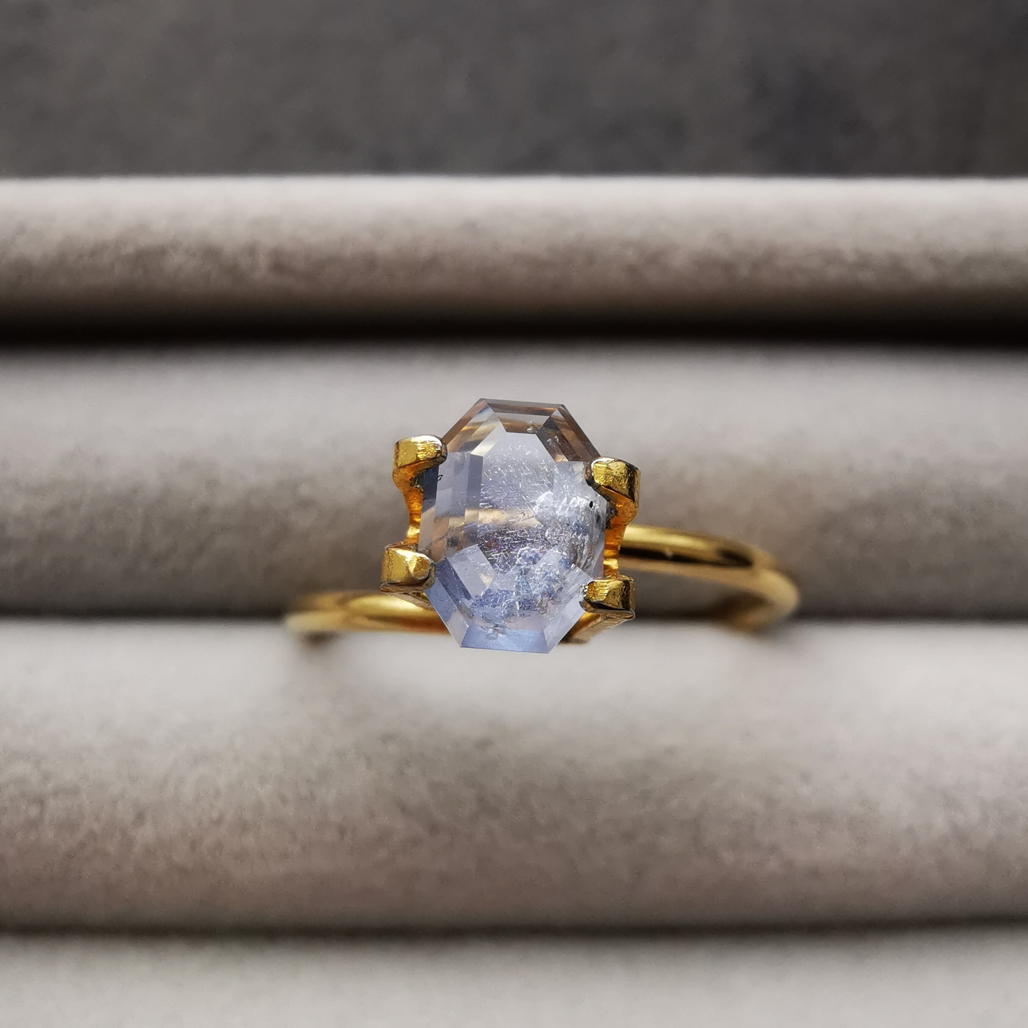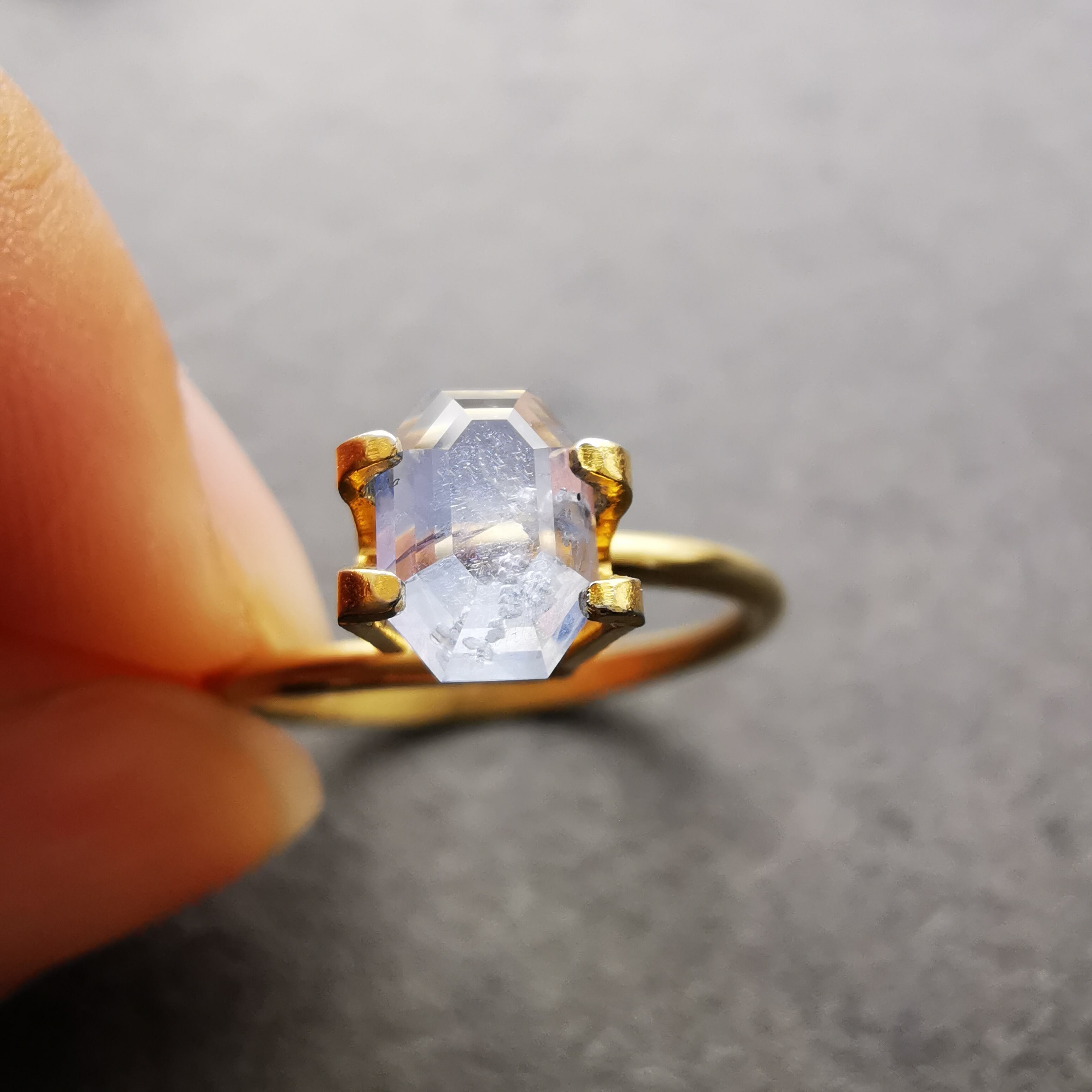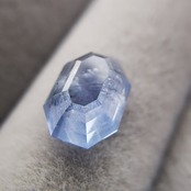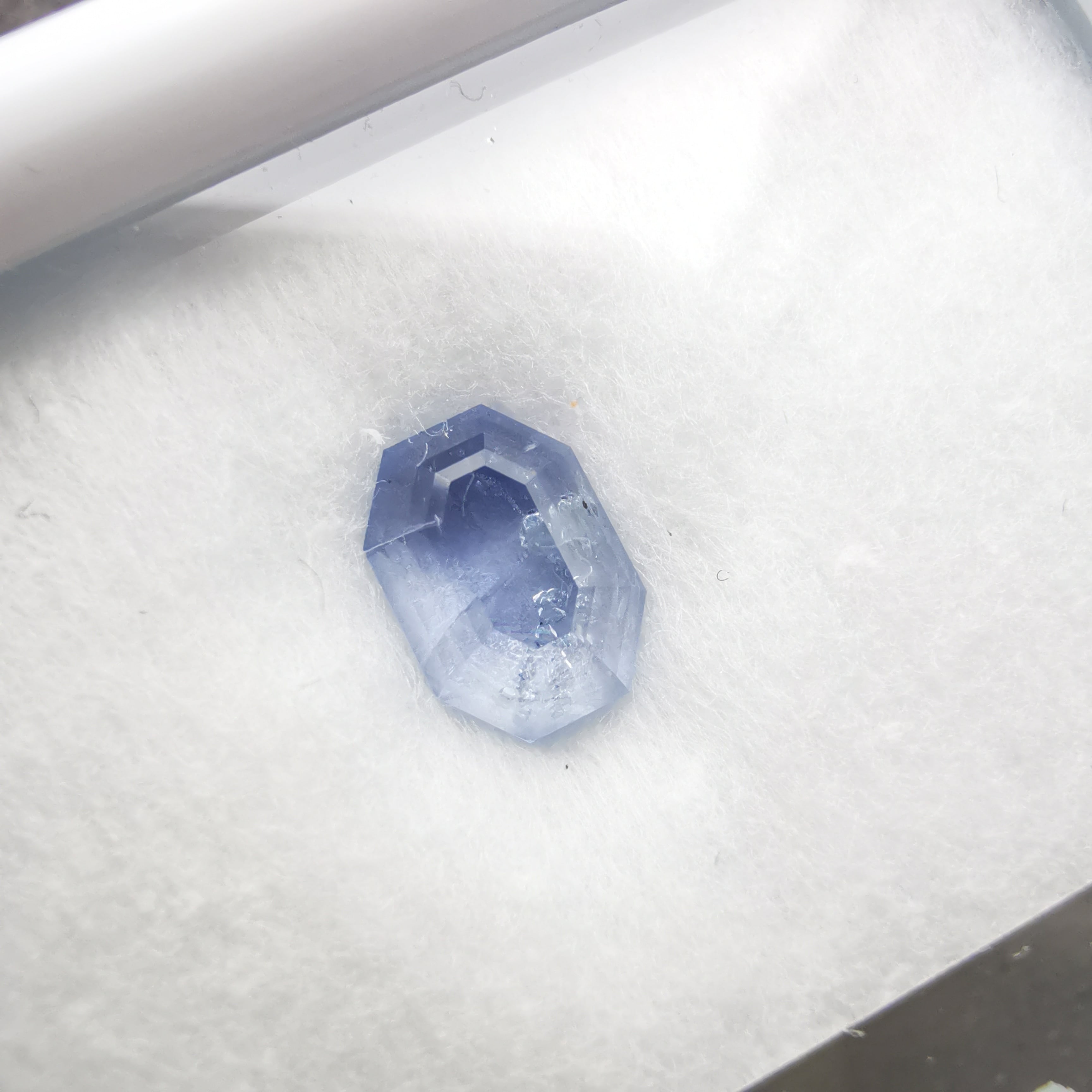 元々スターサファイアにしてはかなり透明度が高く、スターよりもシルクインクインクルージョンが目立つような石を、フラットバックカットにリカットしました。