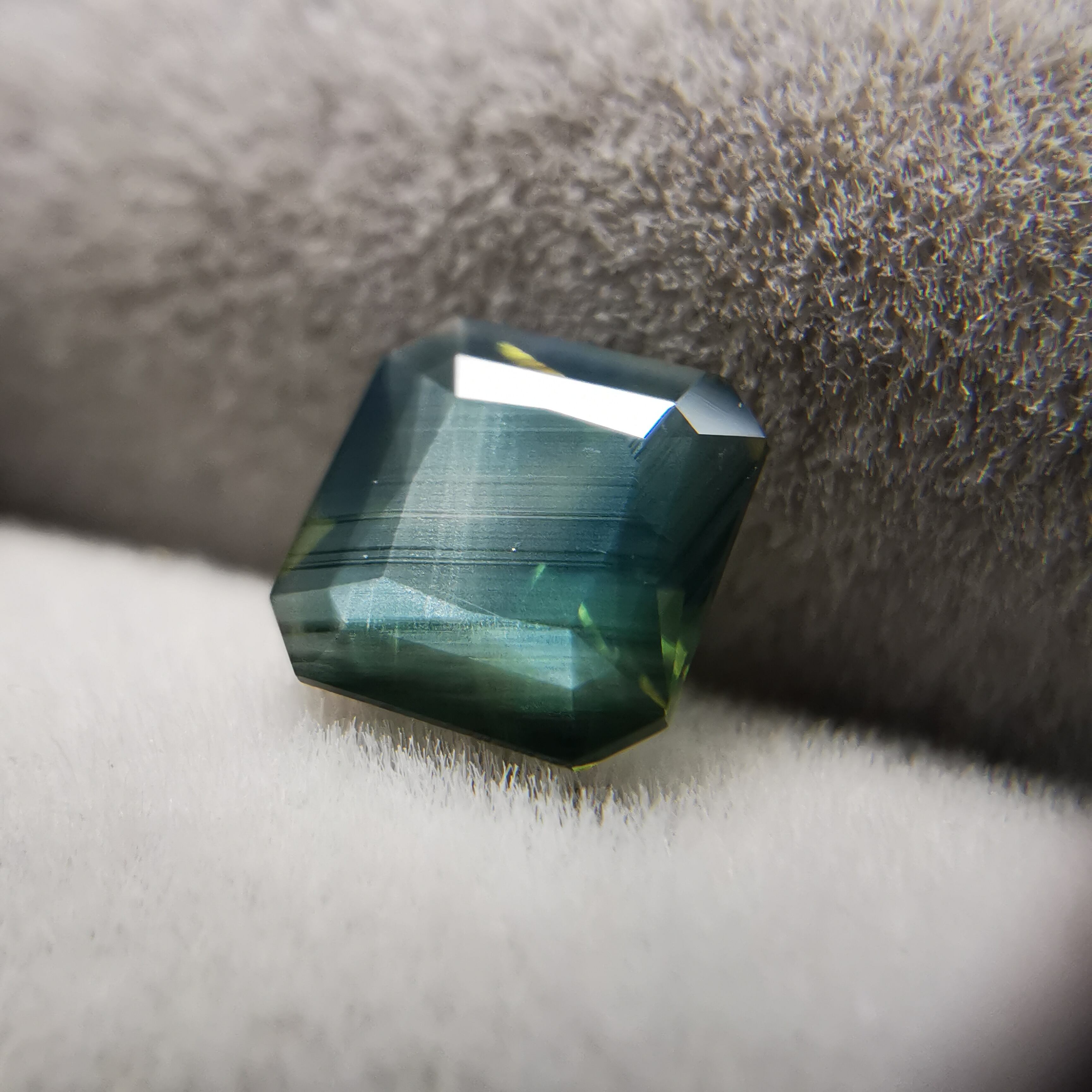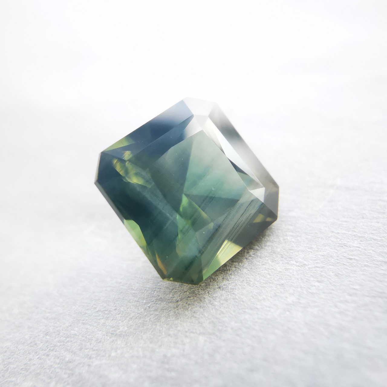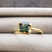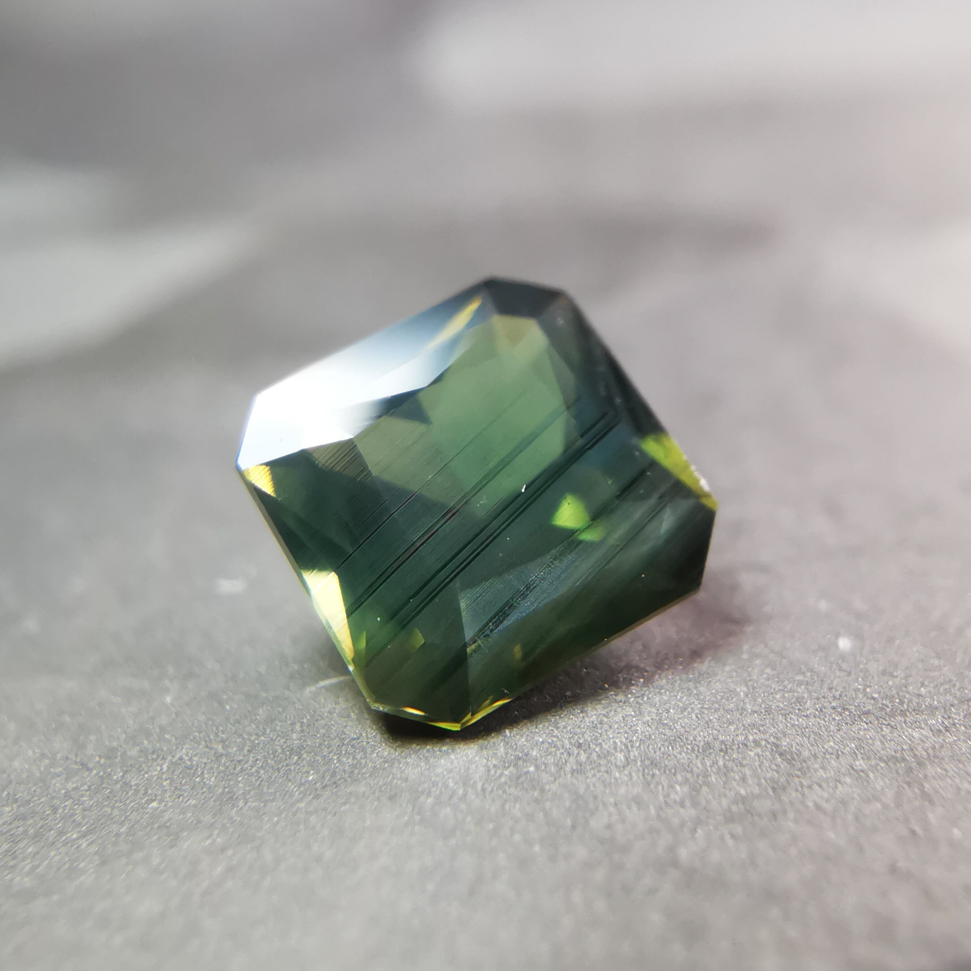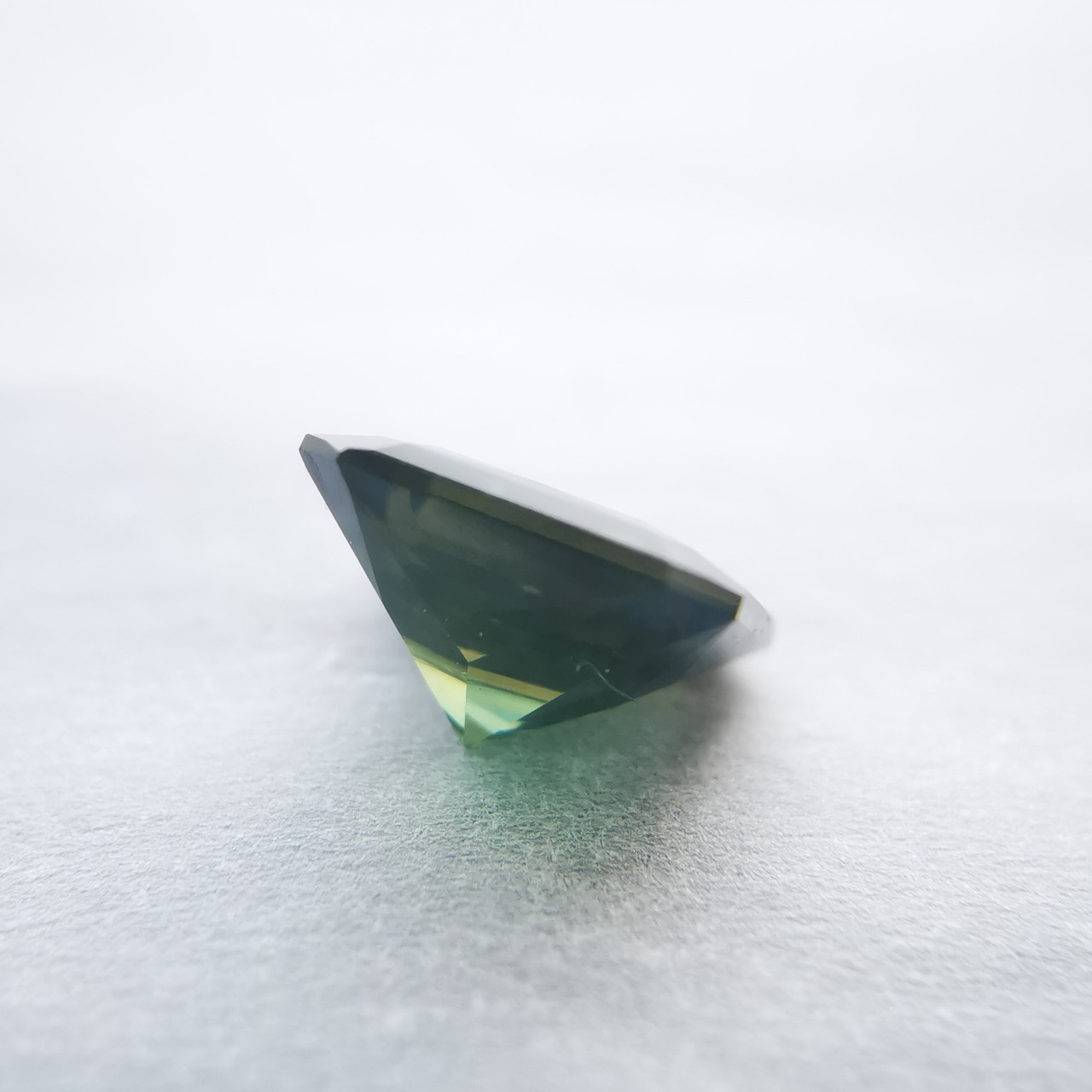 暗い灰みの緑/千歳色から、柔らかな黄緑/鶸色がこぼれる渋いカラーのサファイアです。