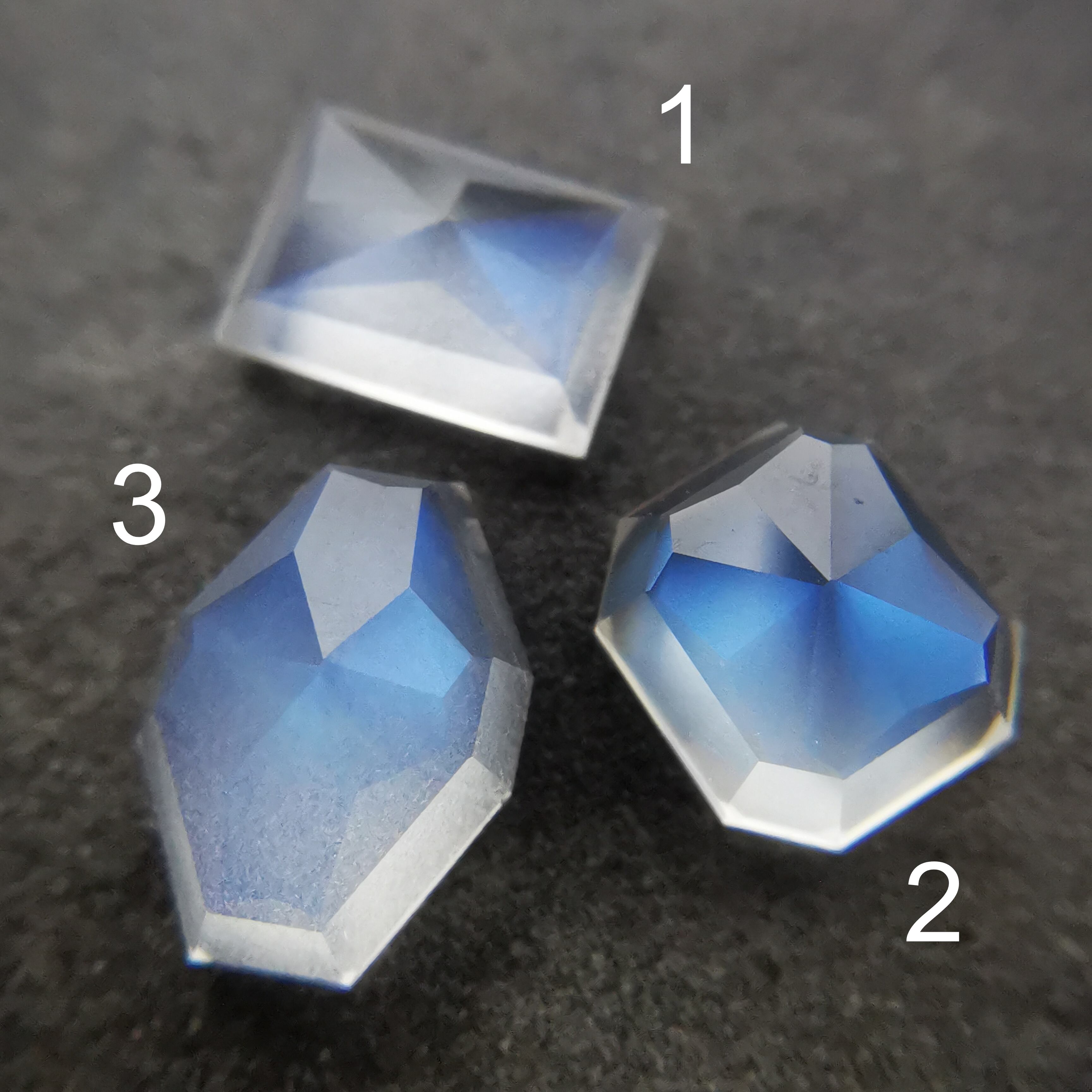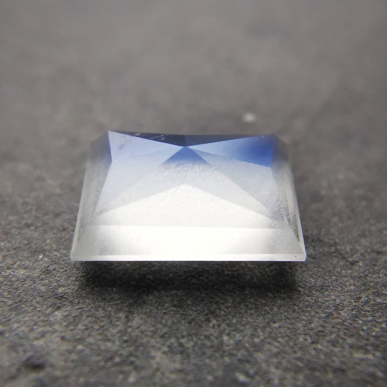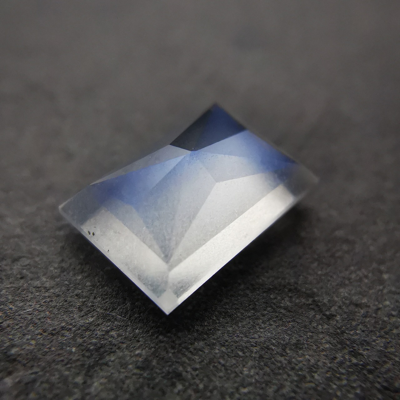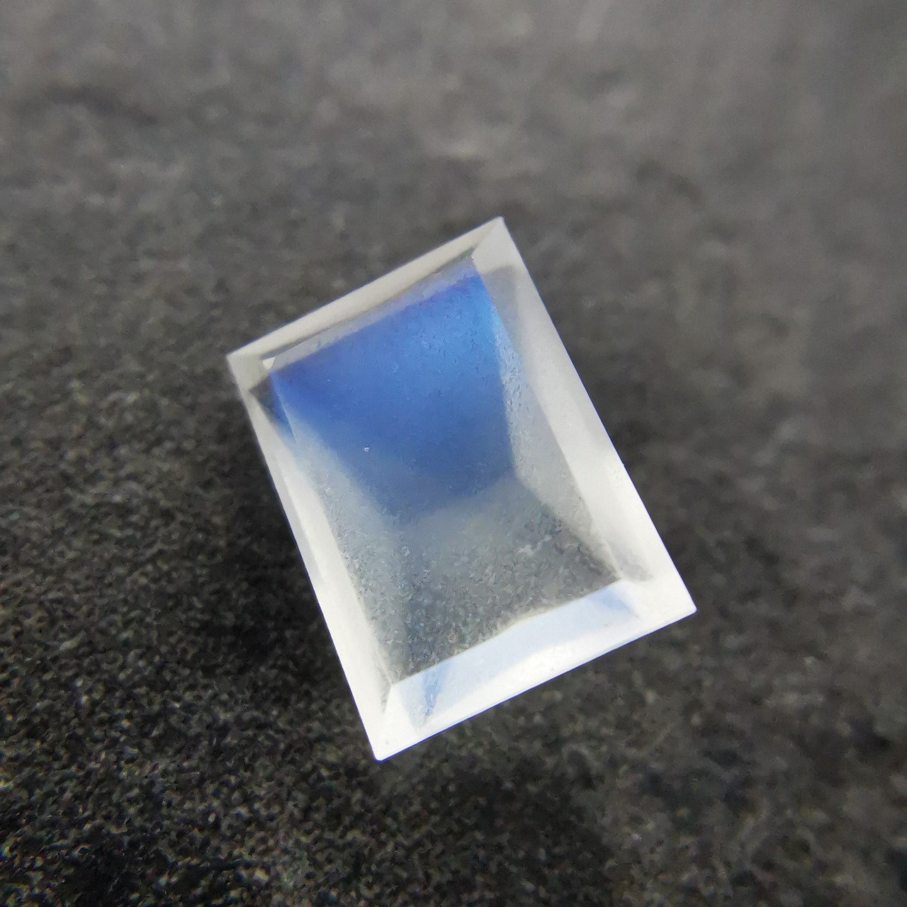 灰みの半透明の石の表面を、鮮やかなブルーが覆うムーンストーンです。