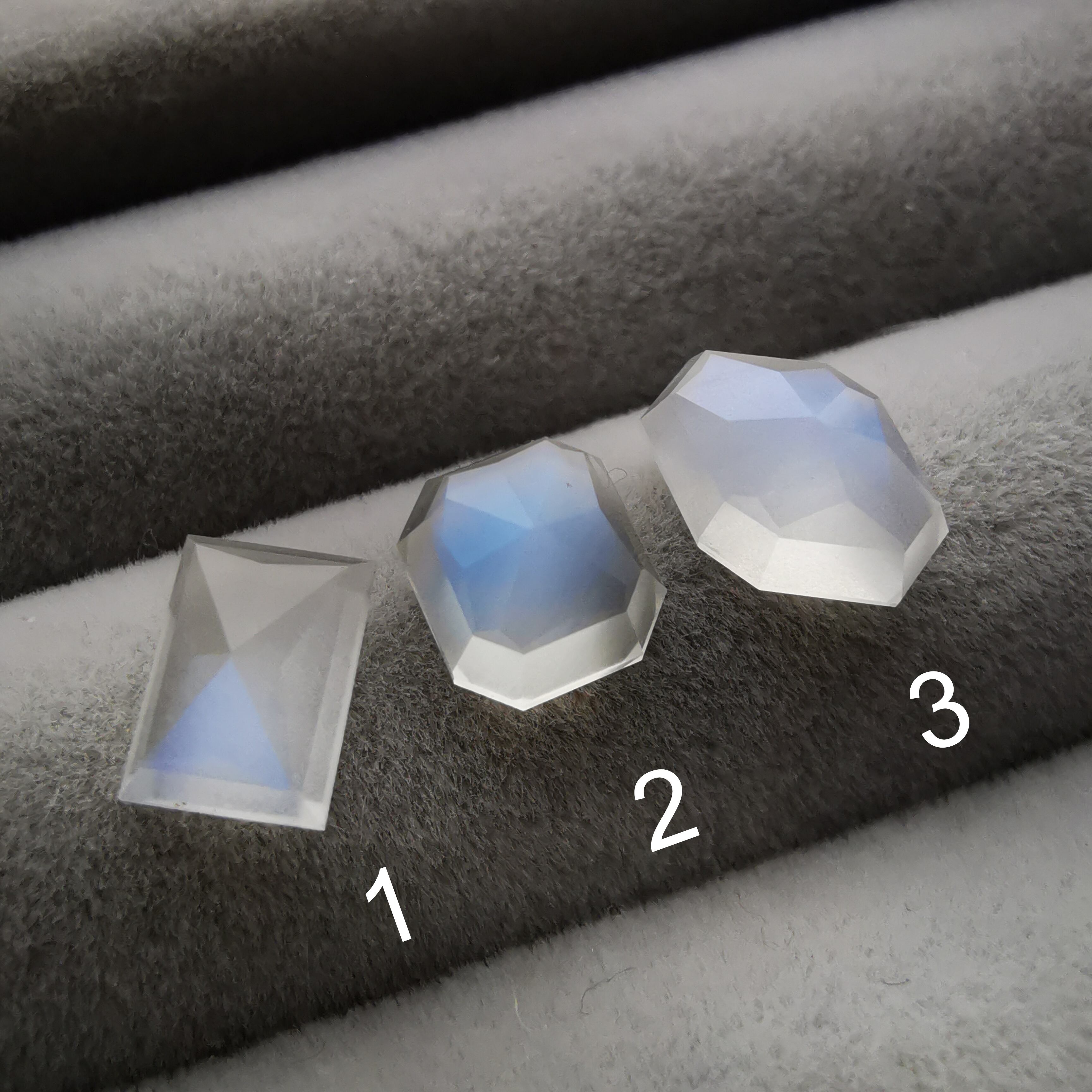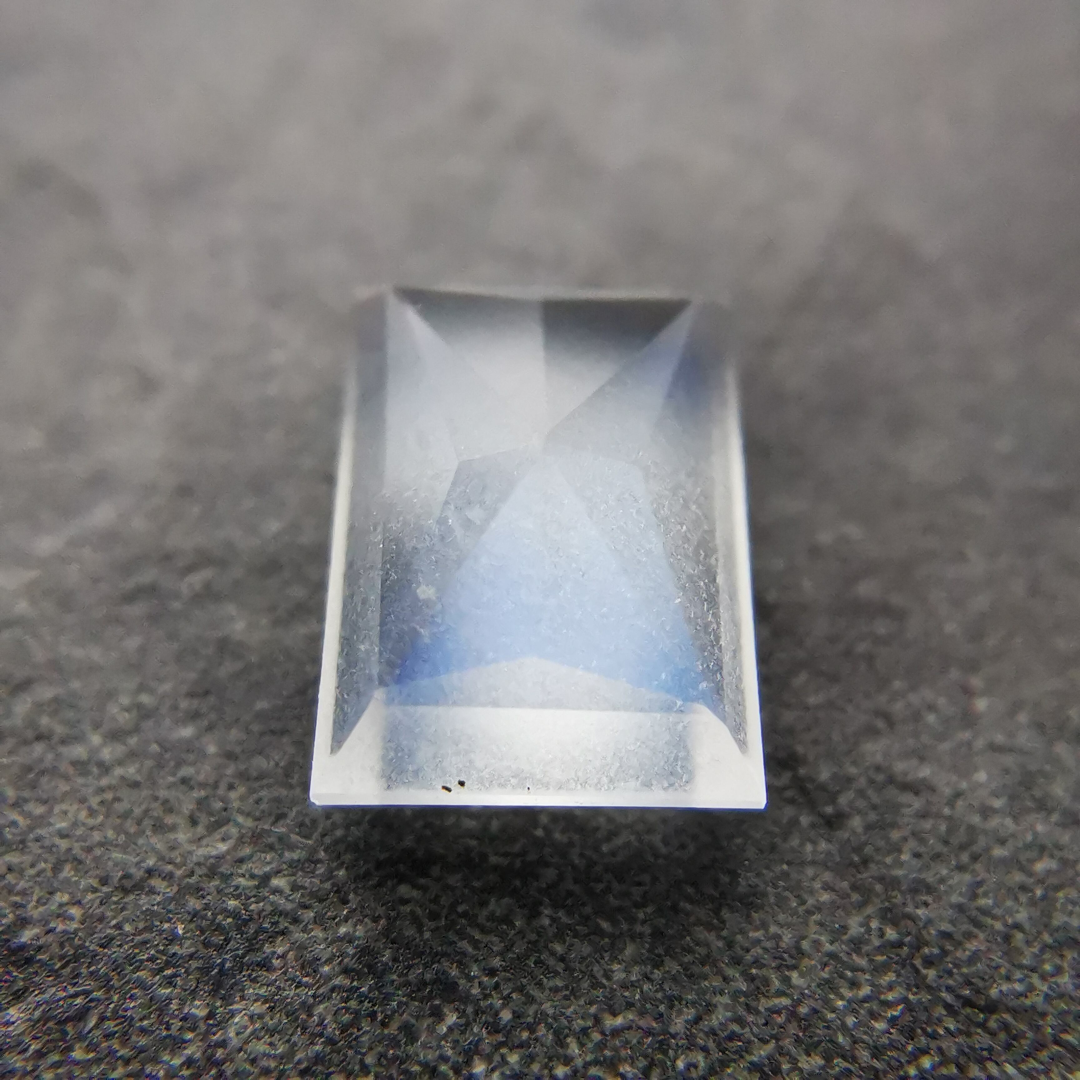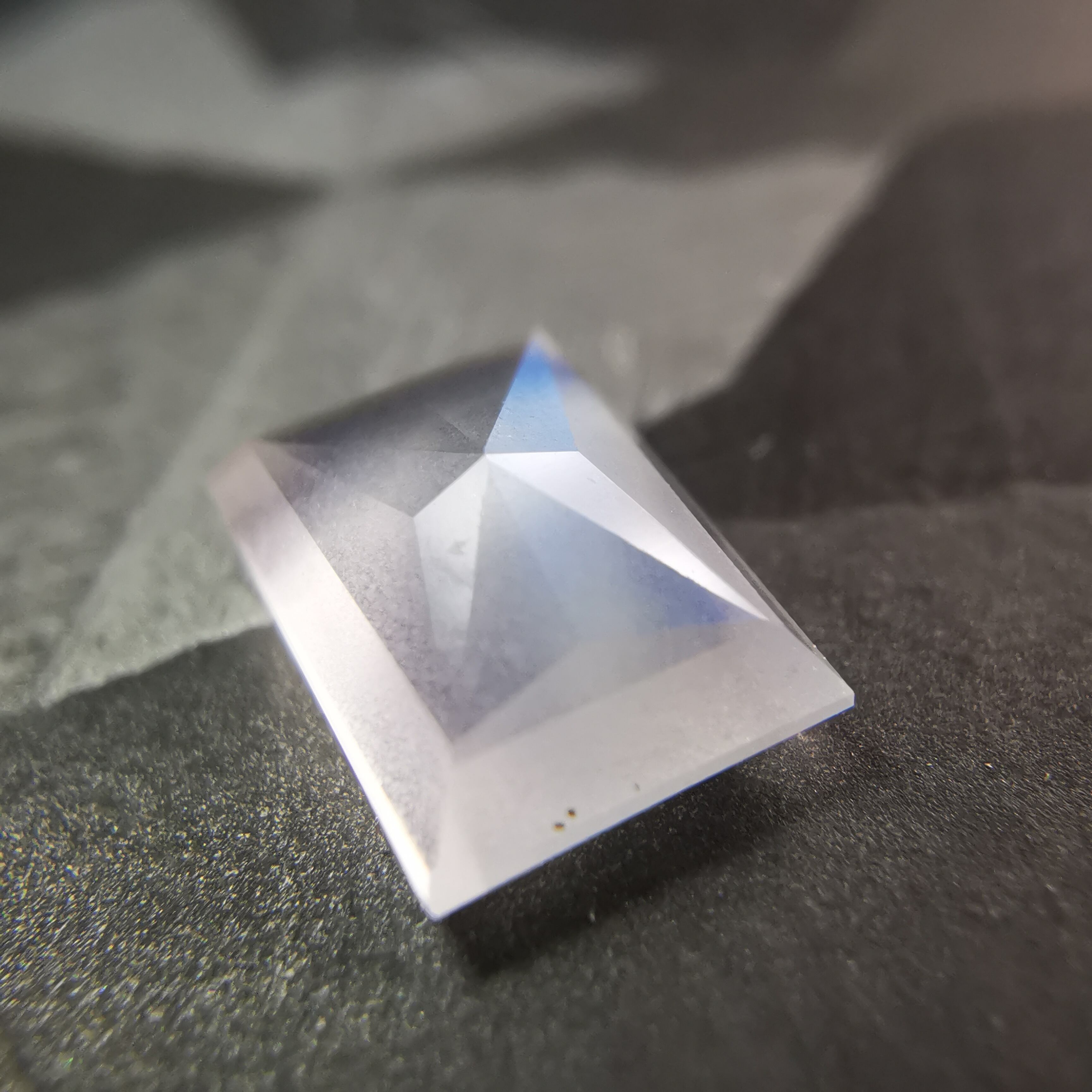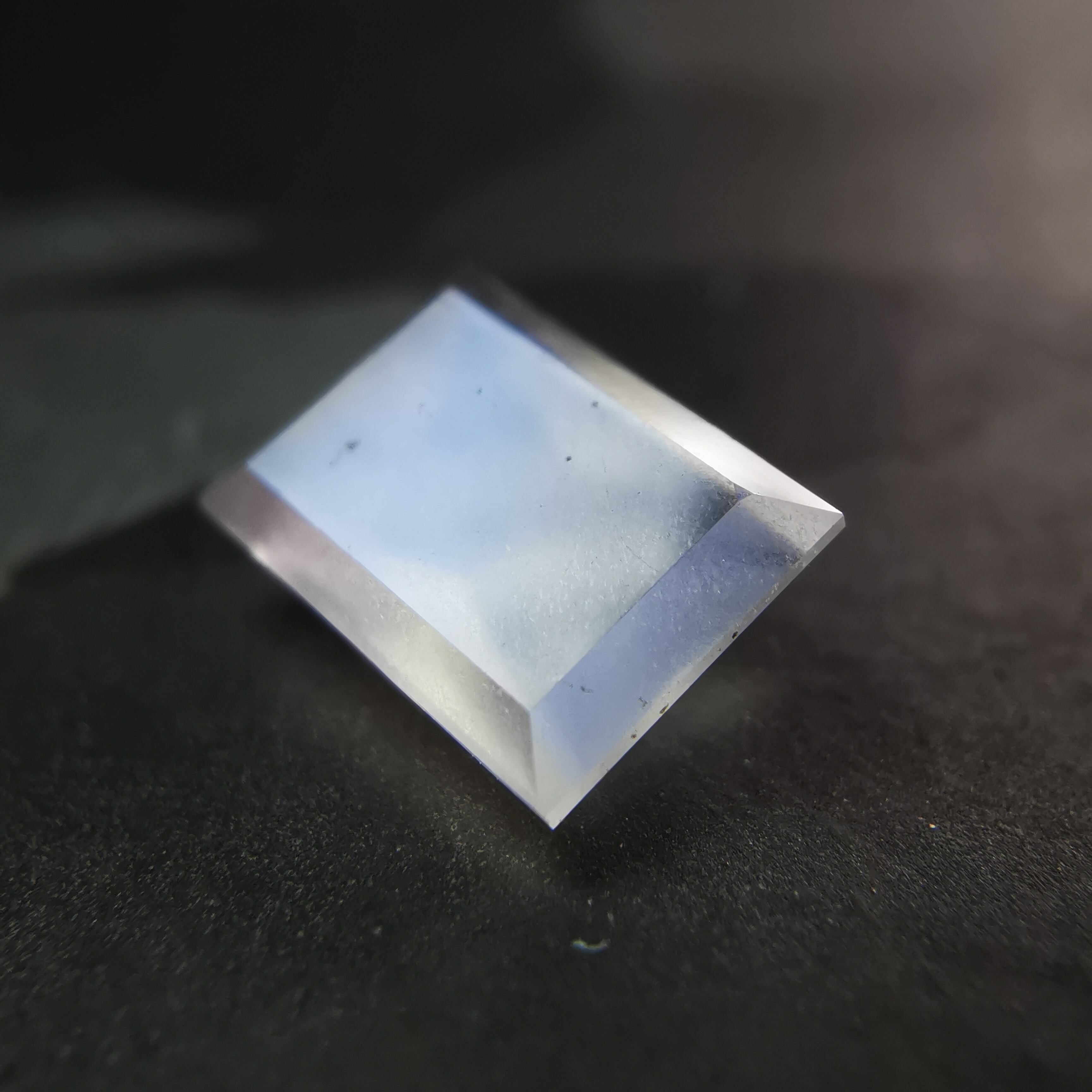 灰みの半透明の石の表面を、鮮やかなブルーが覆うムーンストーンです。