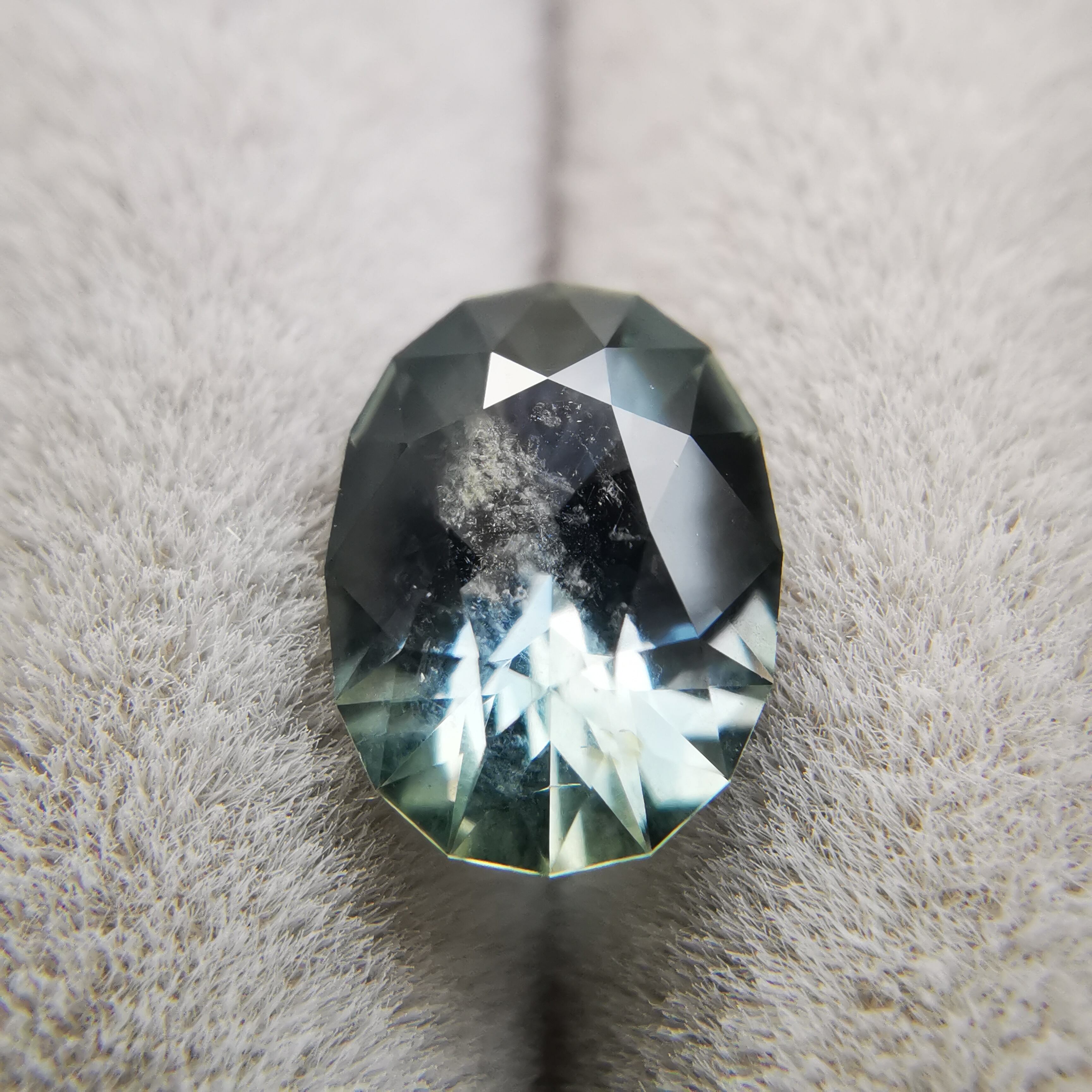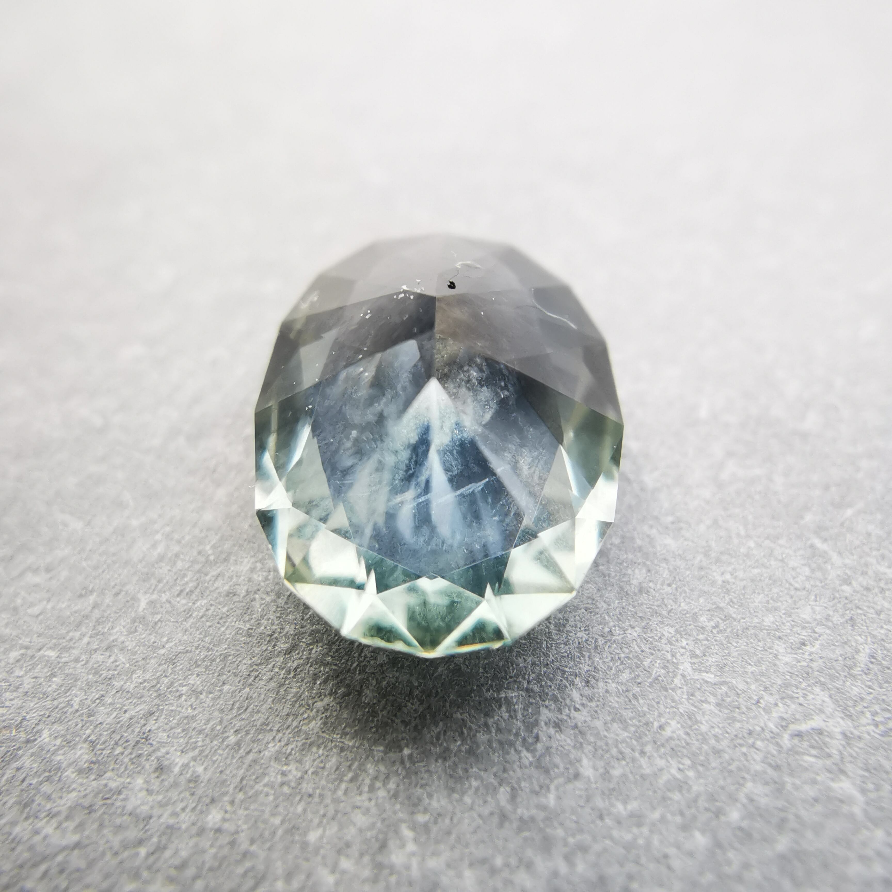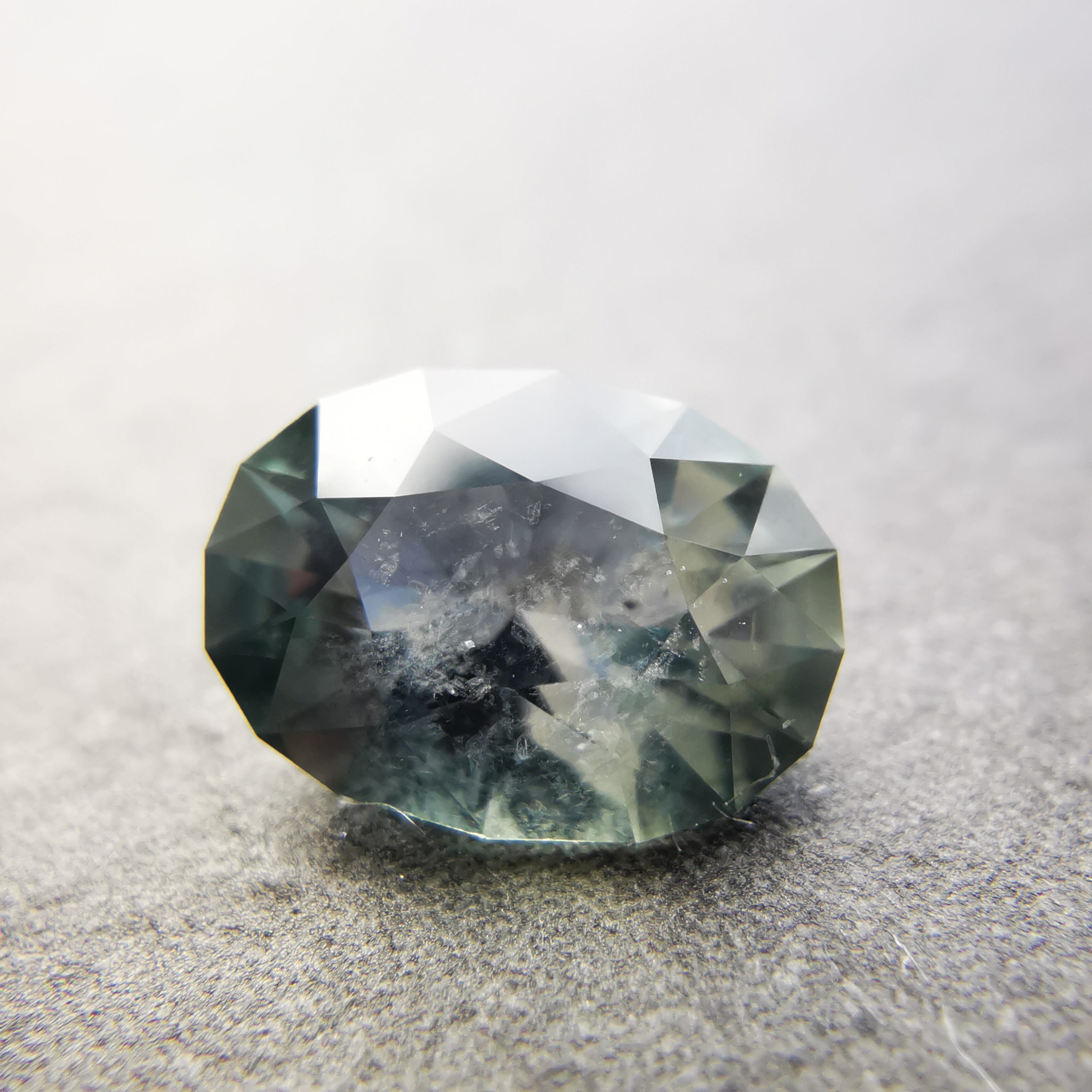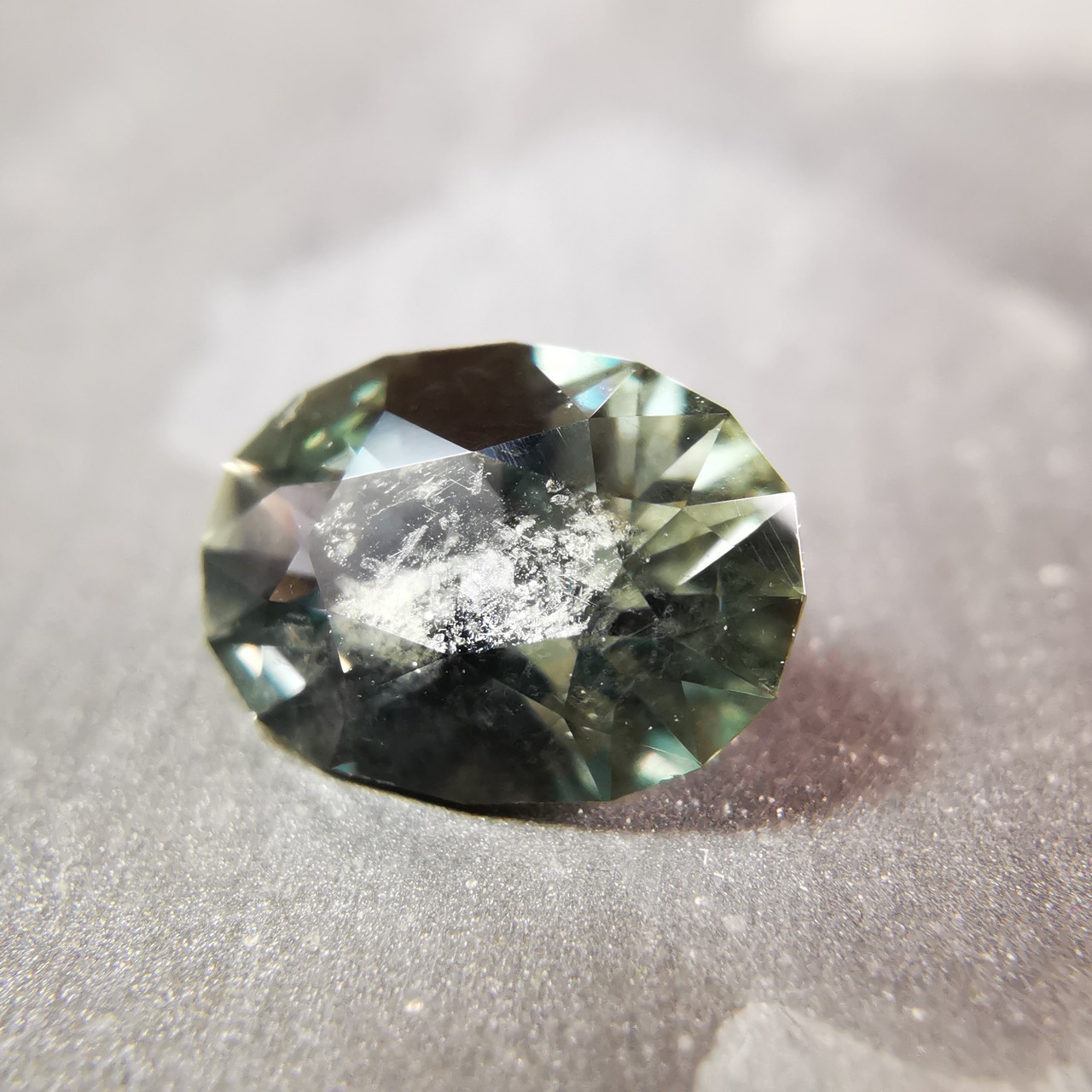 一見、地味な灰みのサファイアですが、よく見ると縁の方がグリーン、内側は淡いブルー、光の当たる方向によってモヤモヤとしたインクルージョンがテーブル面に現れます。