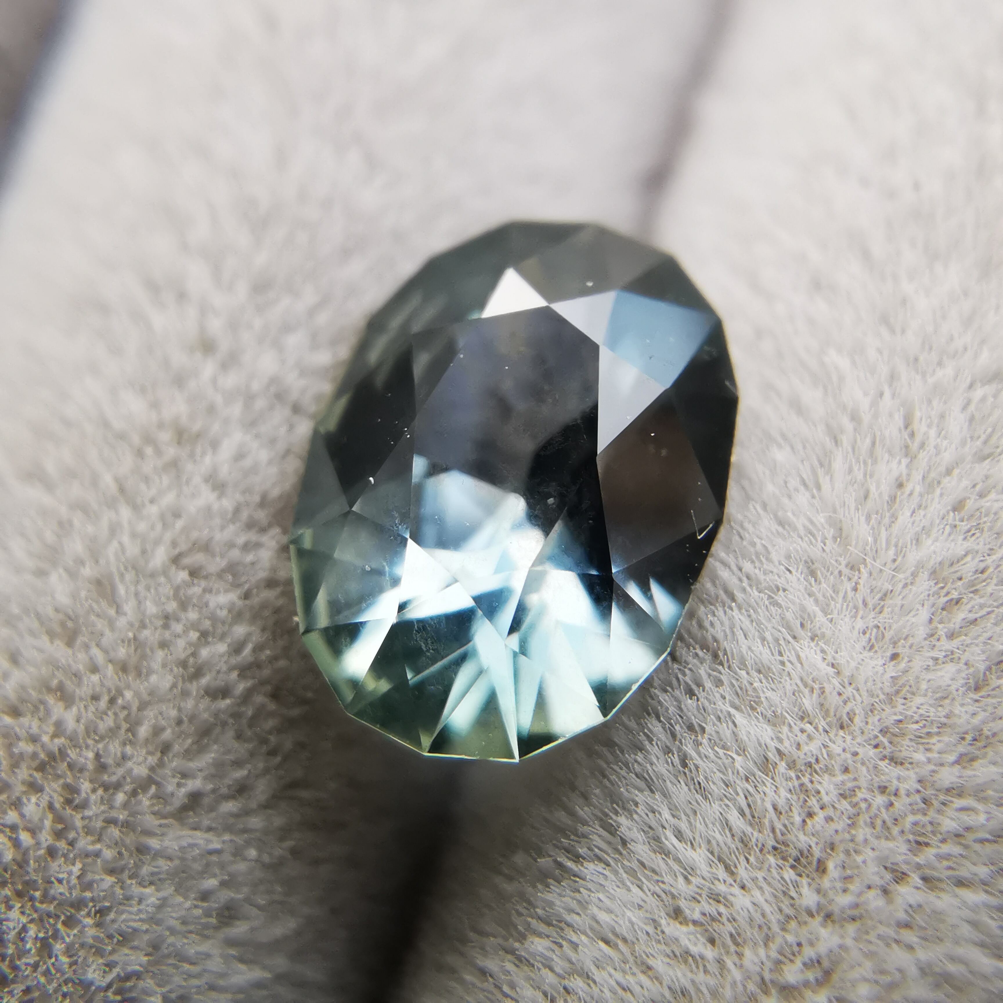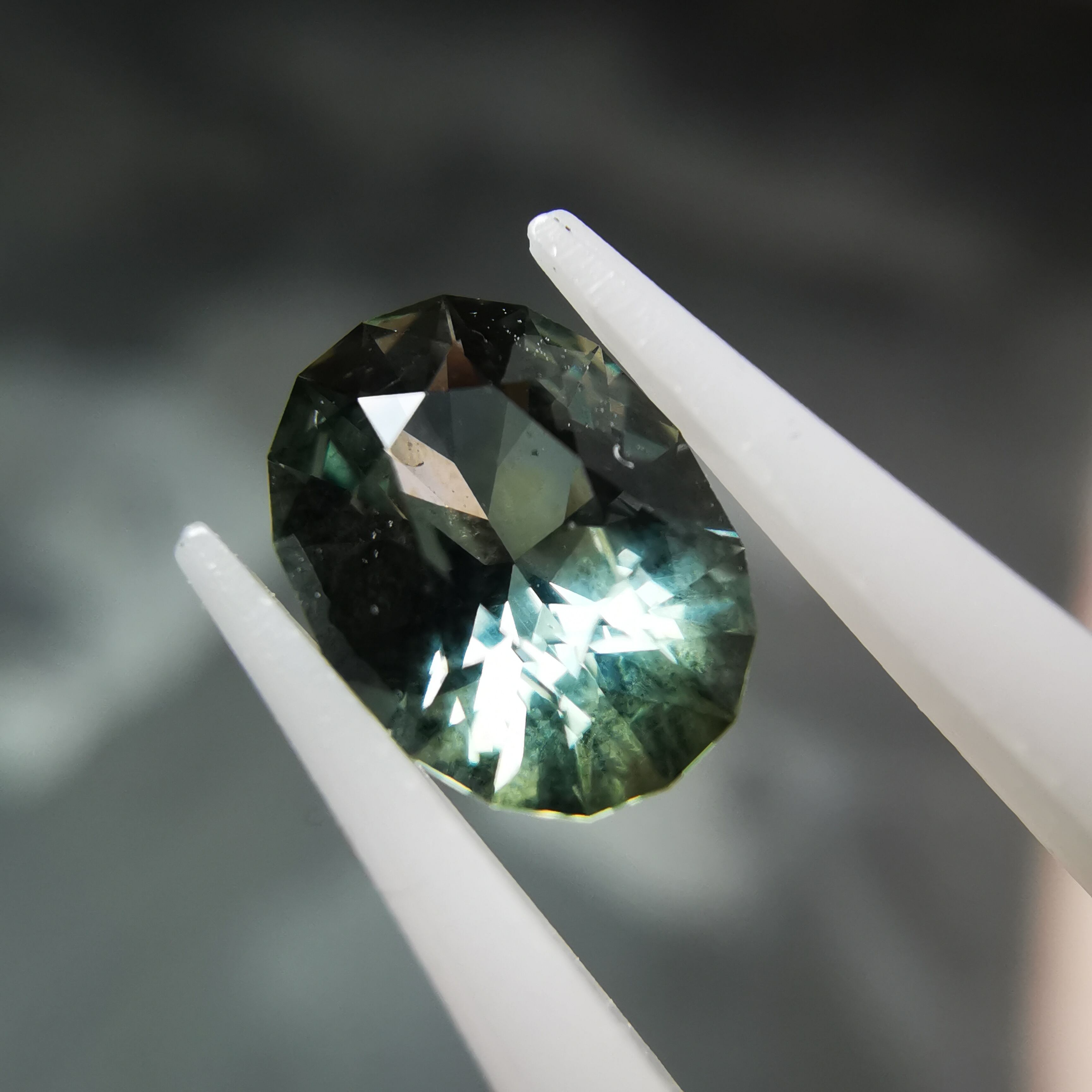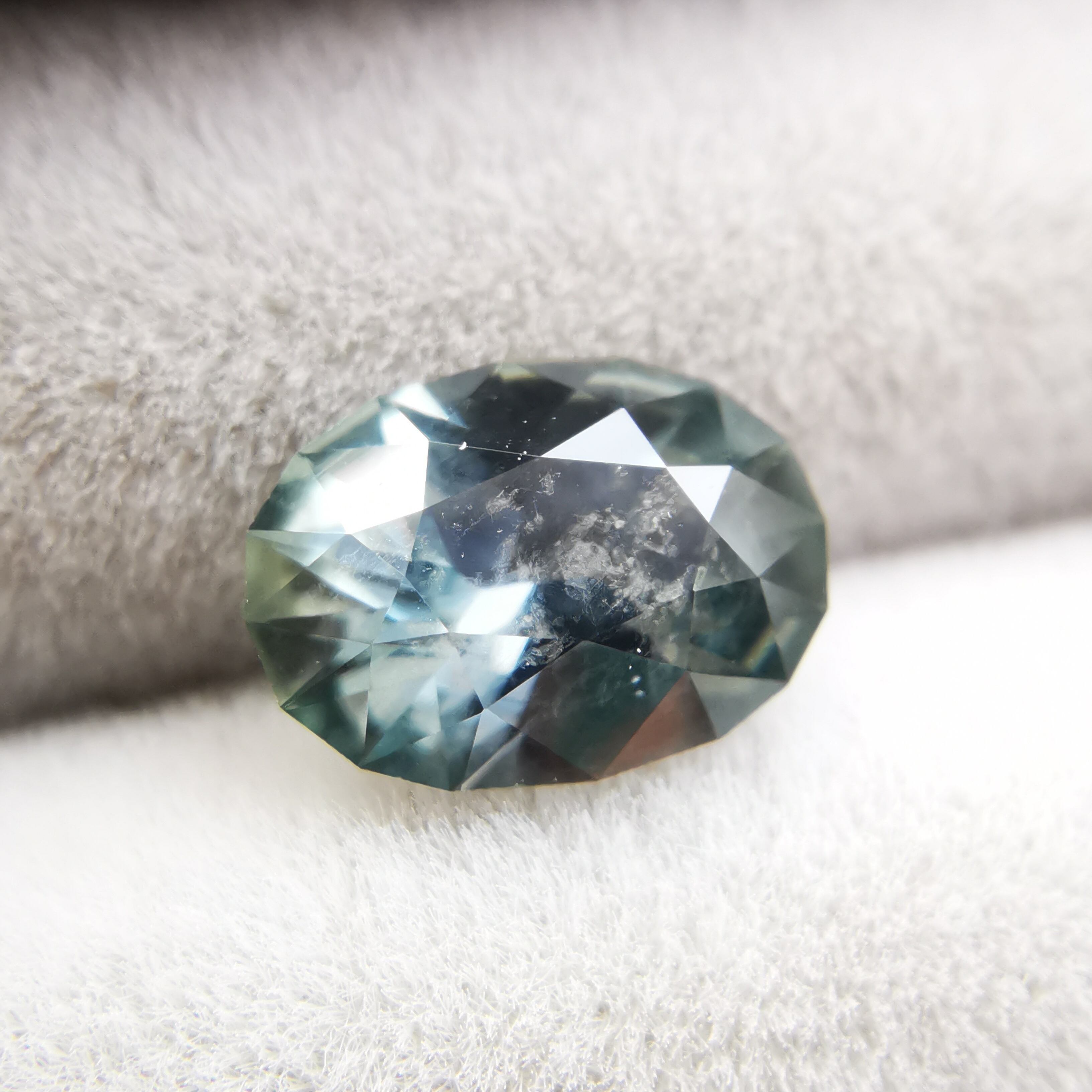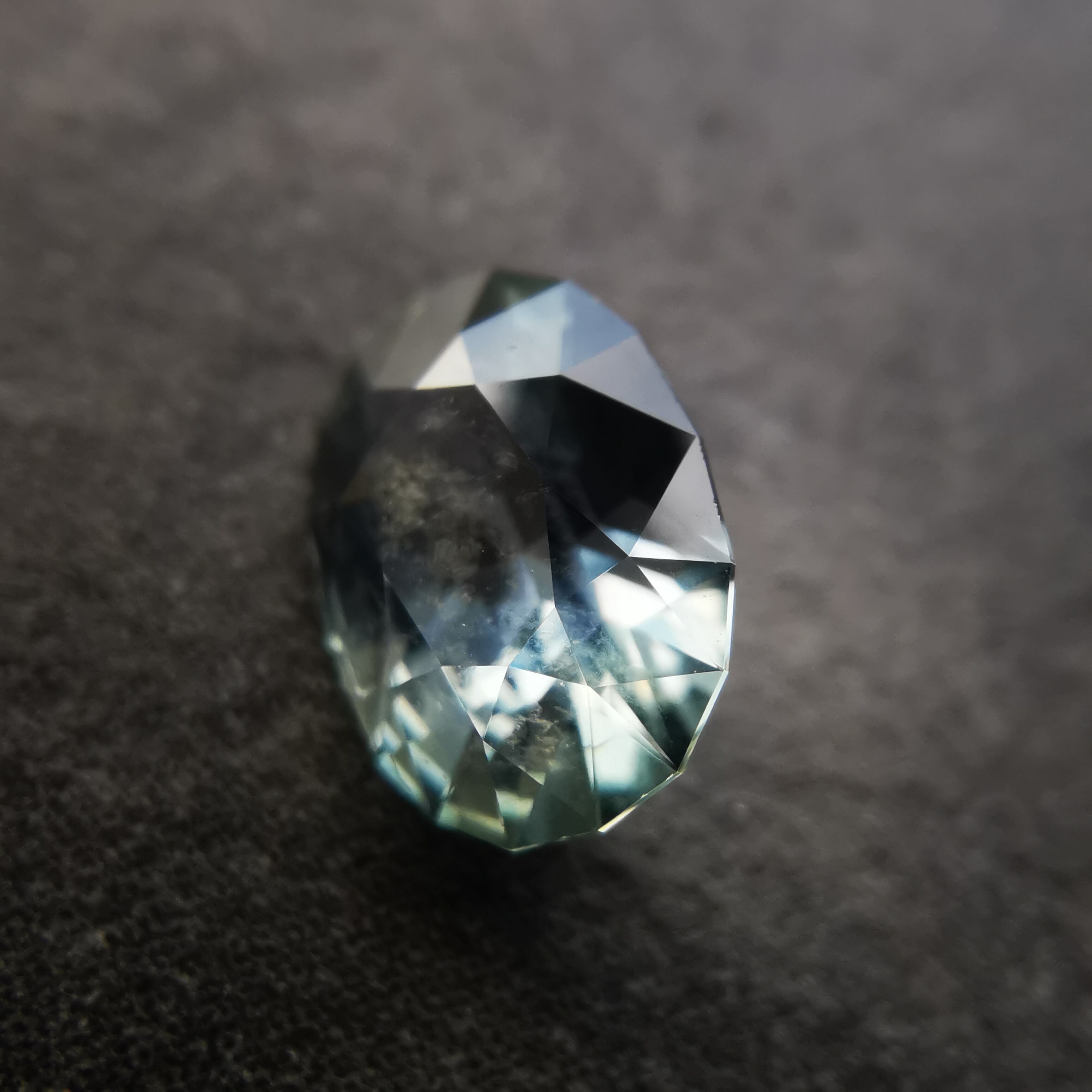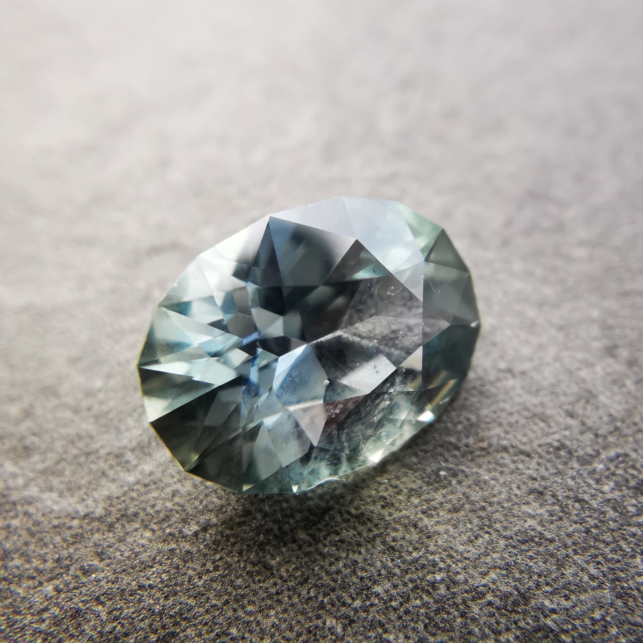 一見、地味な灰みのサファイアですが、よく見ると縁の方がグリーン、内側は淡いブルー、光の当たる方向によってモヤモヤとしたインクルージョンがテーブル面に現れます。