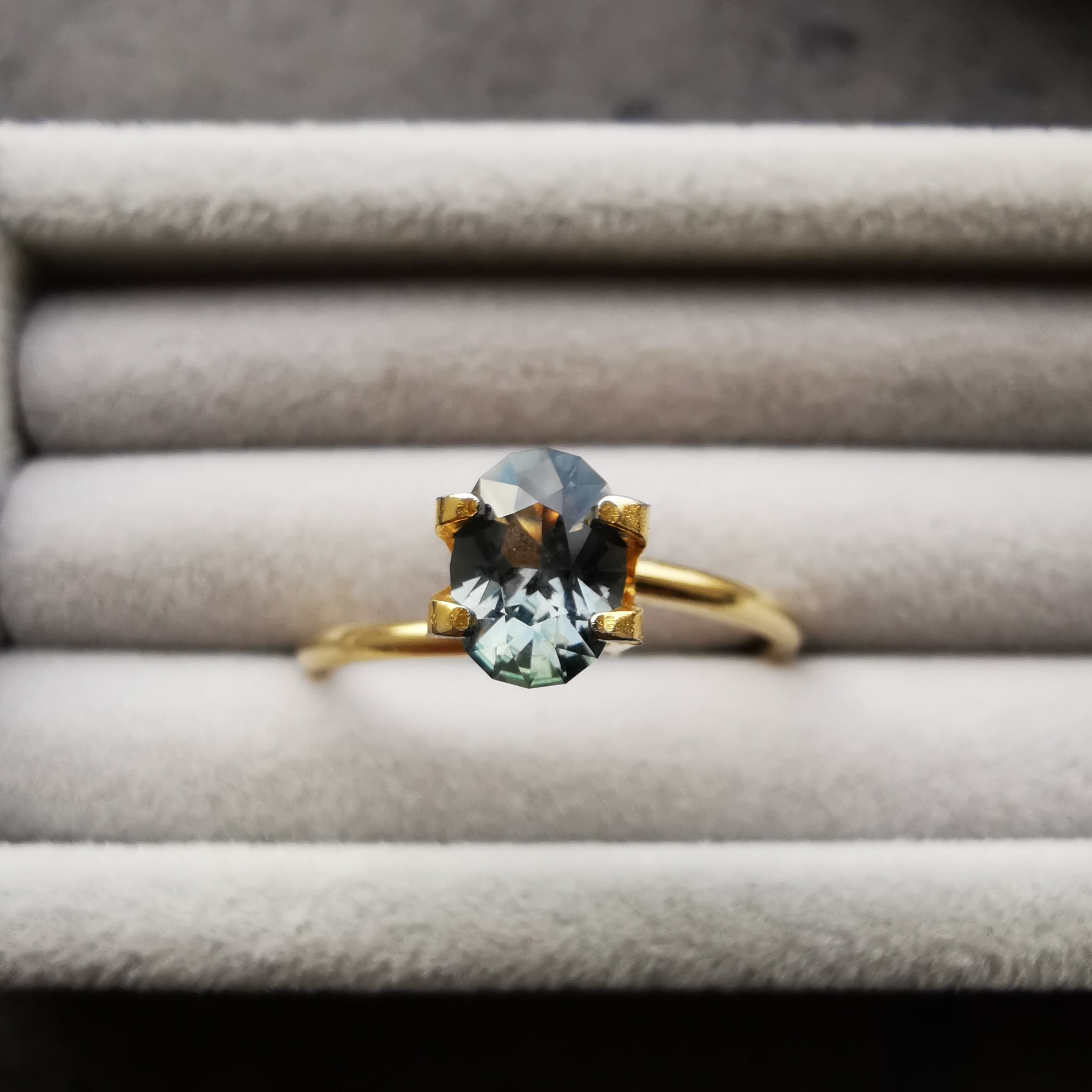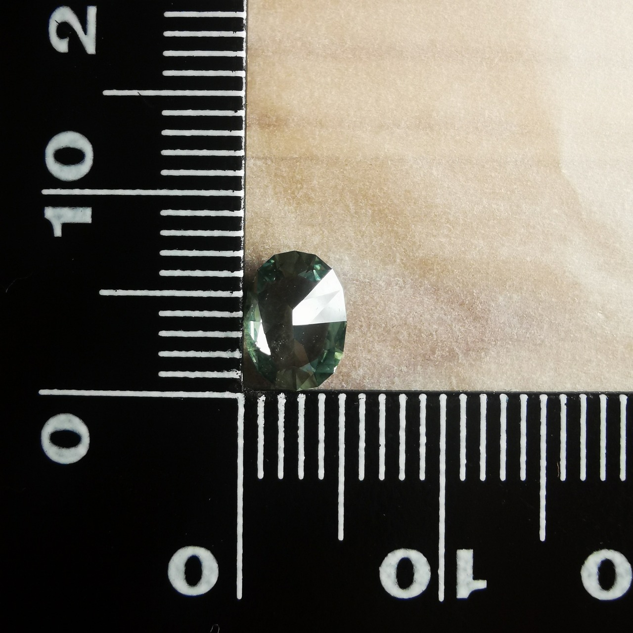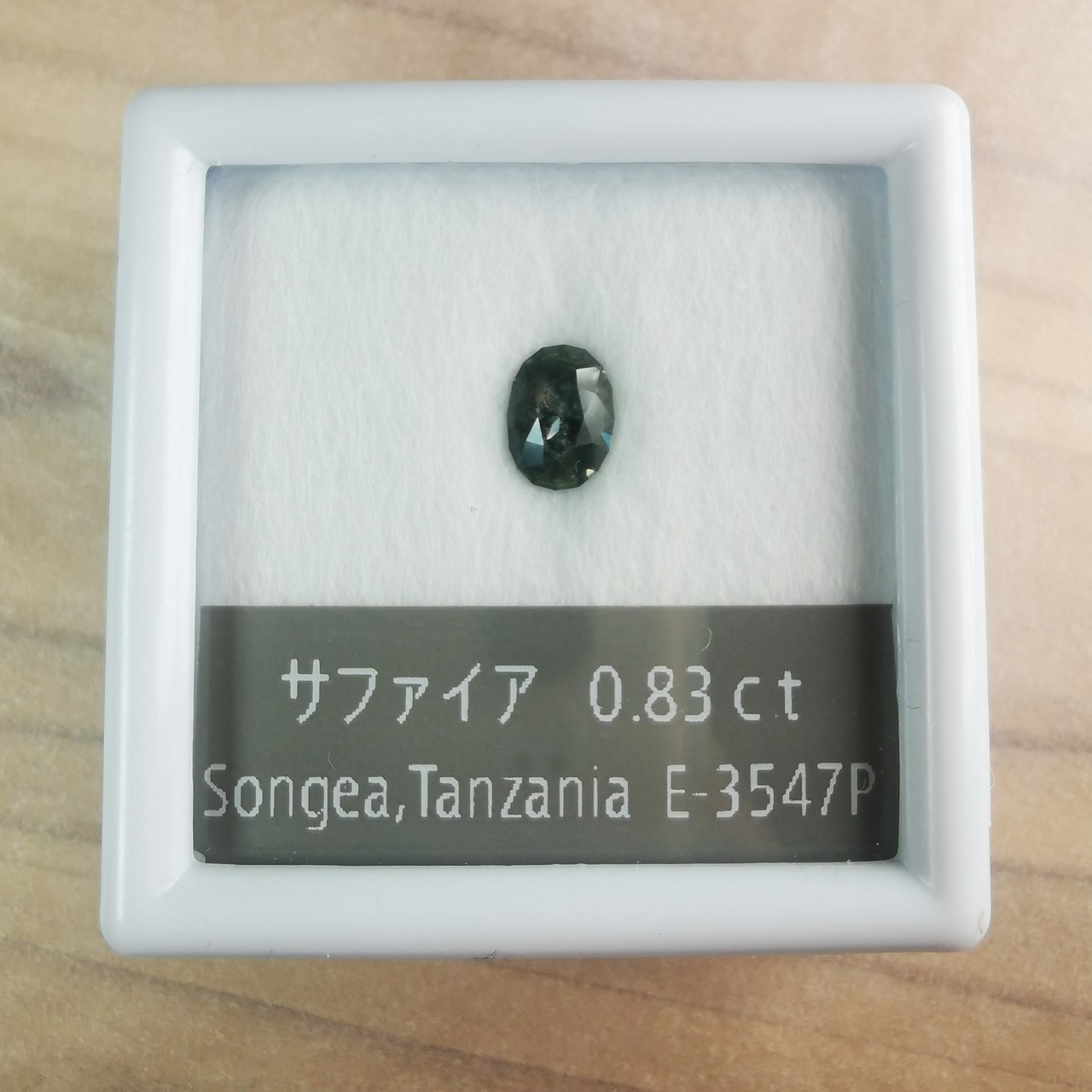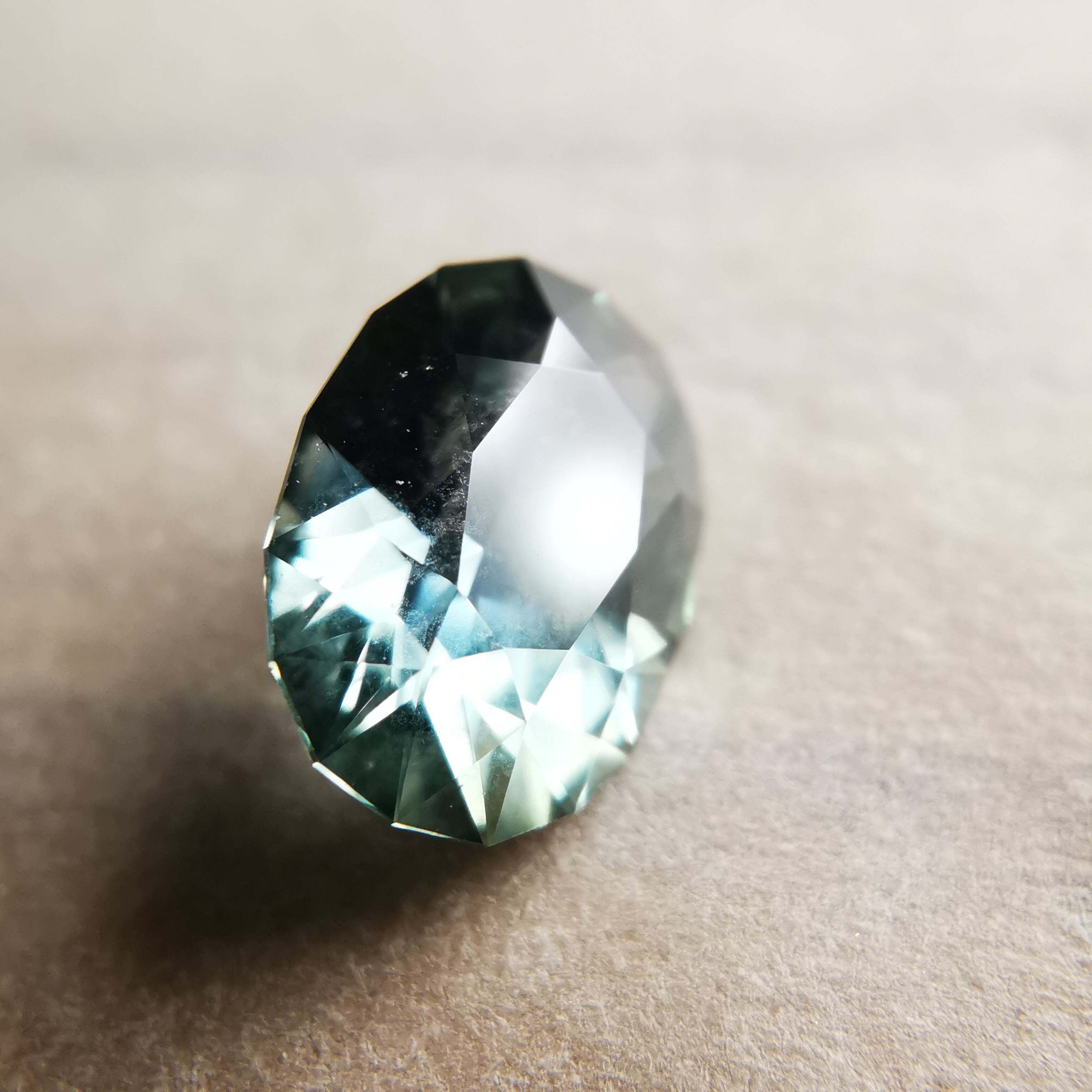 一見、地味な灰みのサファイアですが、よく見ると縁の方がグリーン、内側は淡いブルー、光の当たる方向によってモヤモヤとしたインクルージョンがテーブル面に現れます。