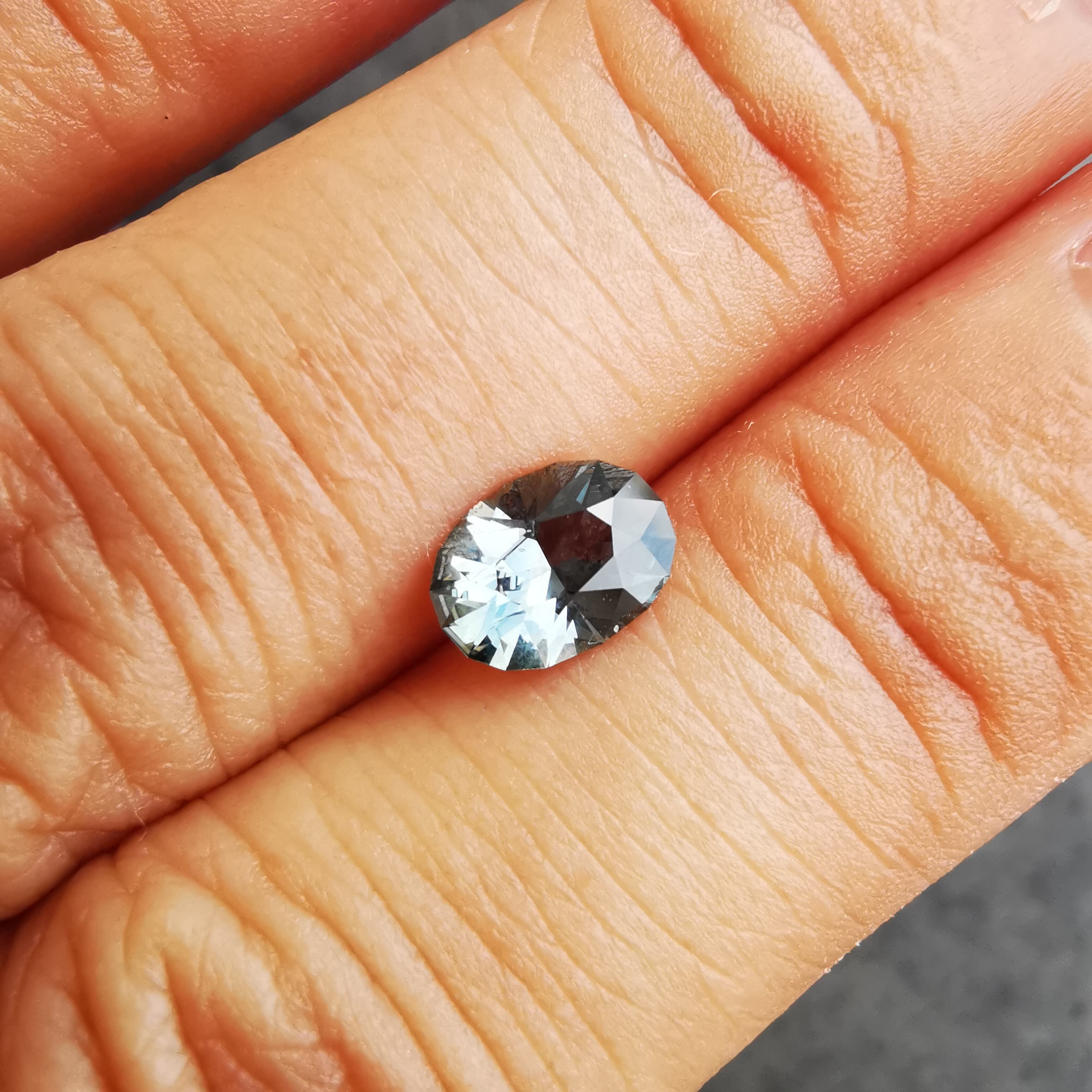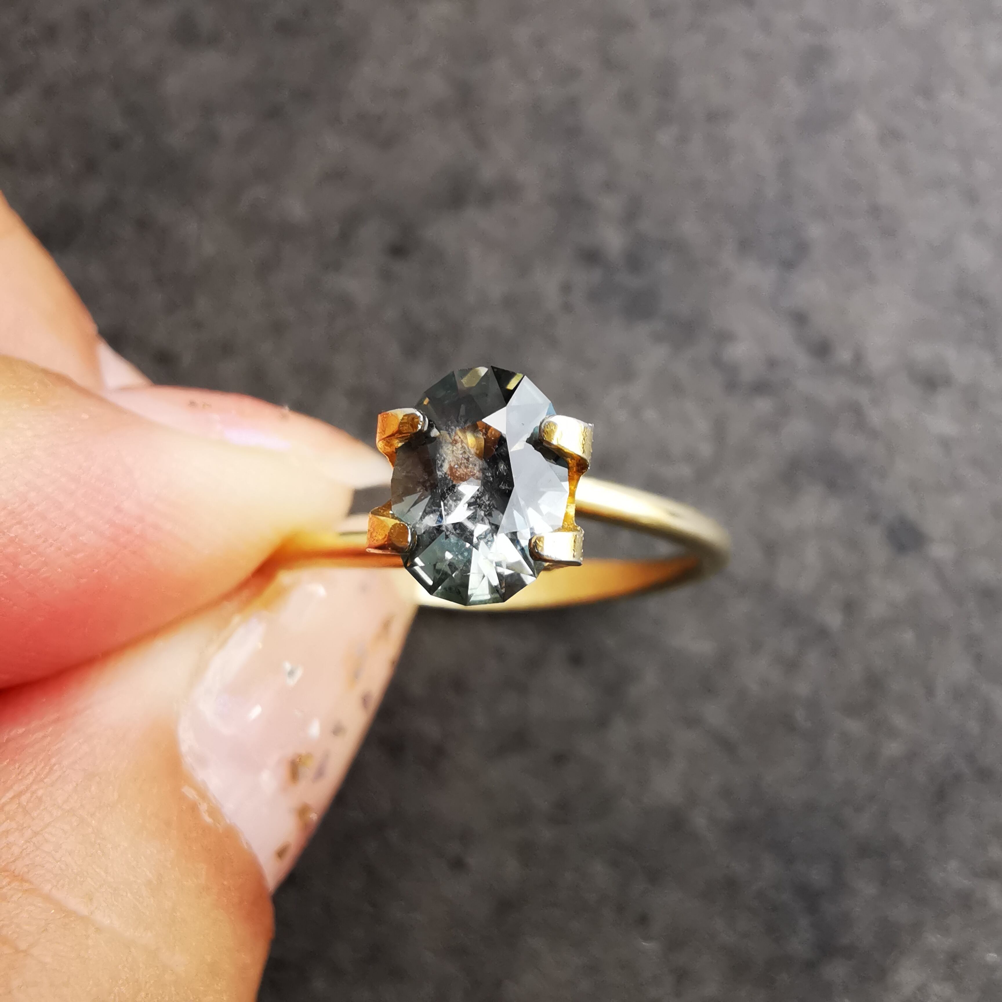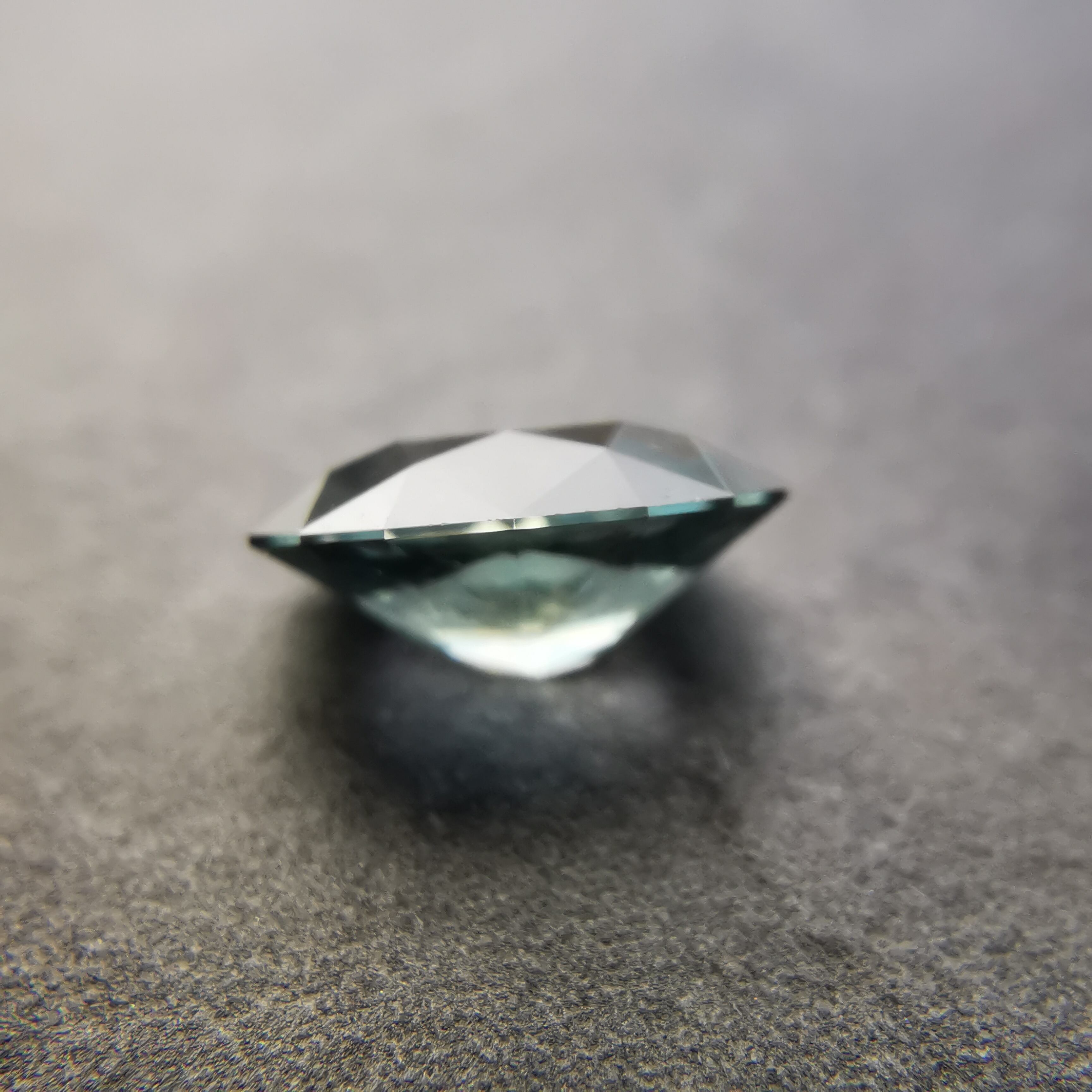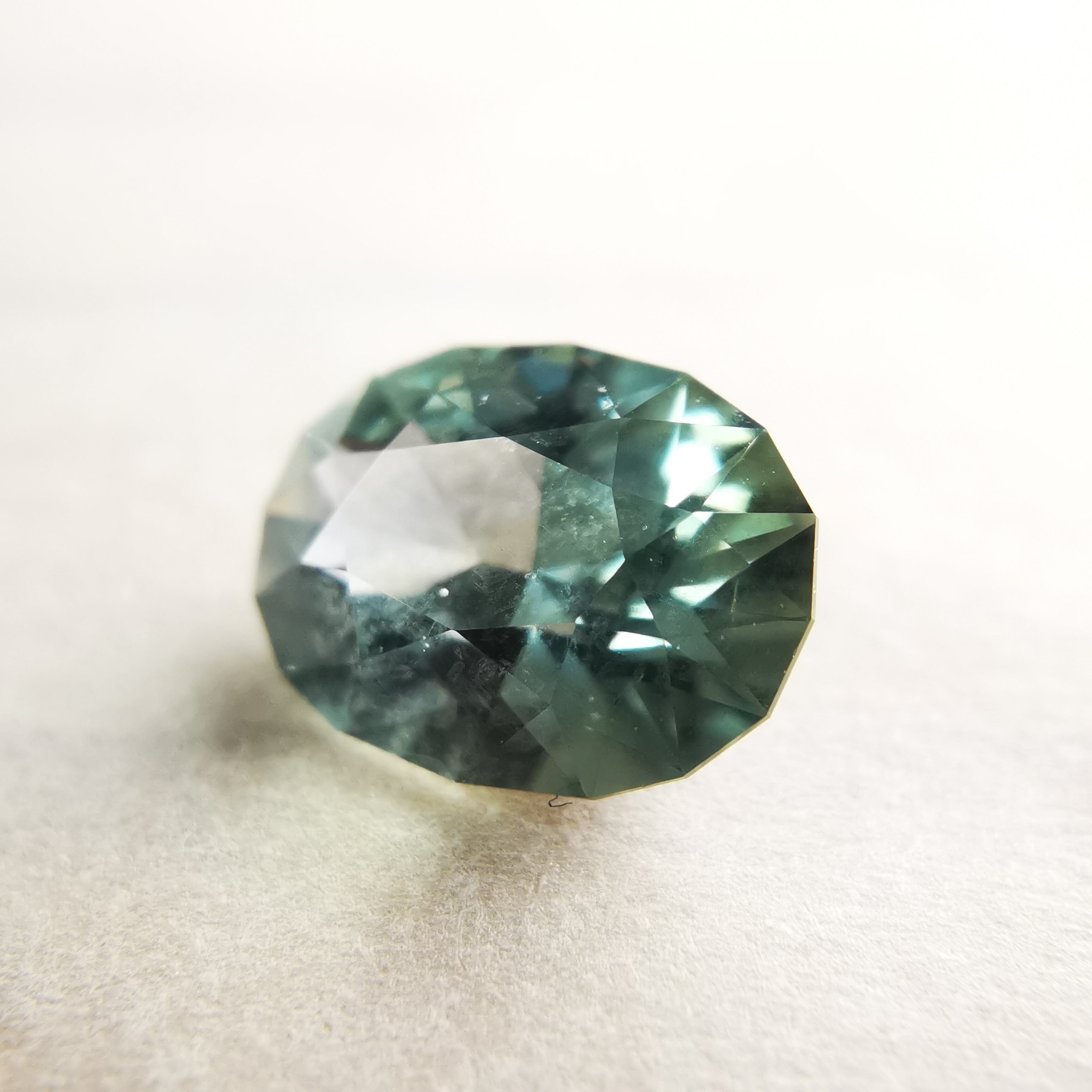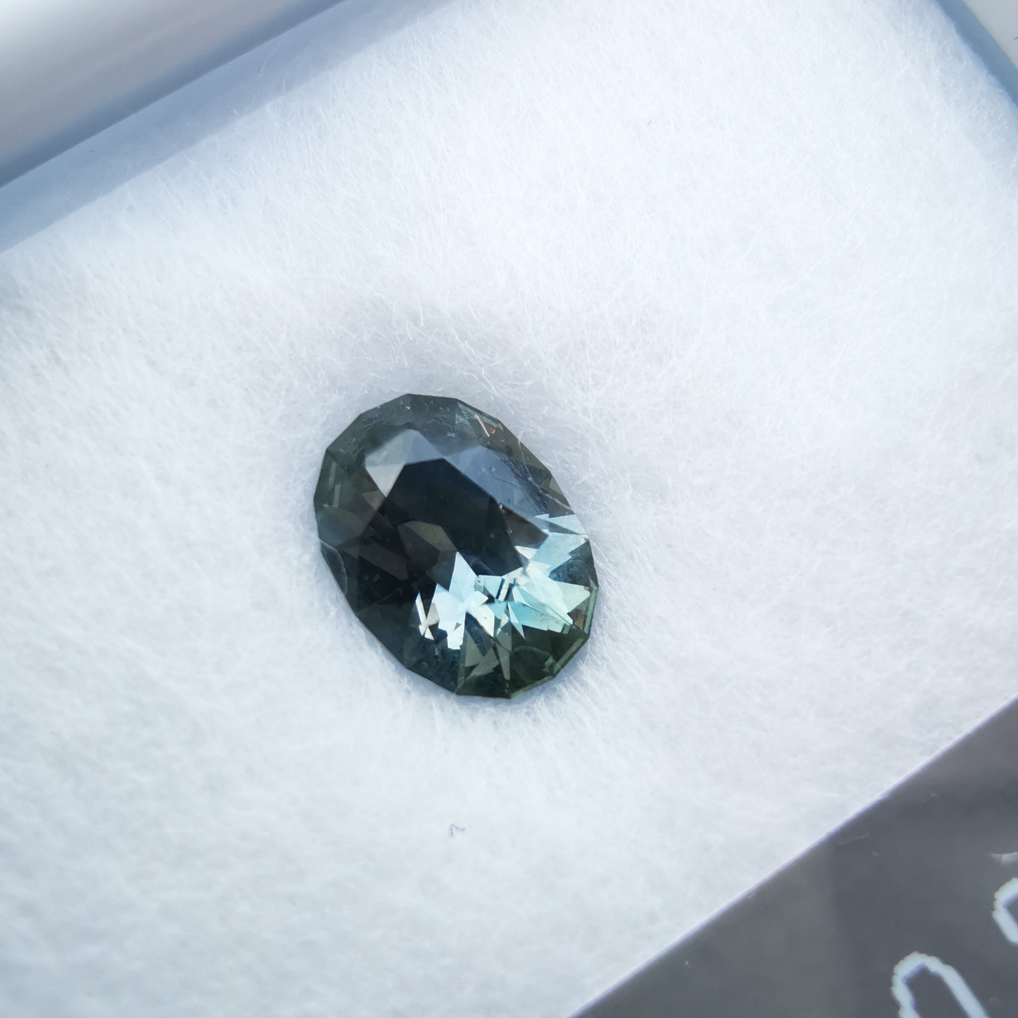 一見、地味な灰みのサファイアですが、よく見ると縁の方がグリーン、内側は淡いブルー、光の当たる方向によってモヤモヤとしたインクルージョンがテーブル面に現れます。