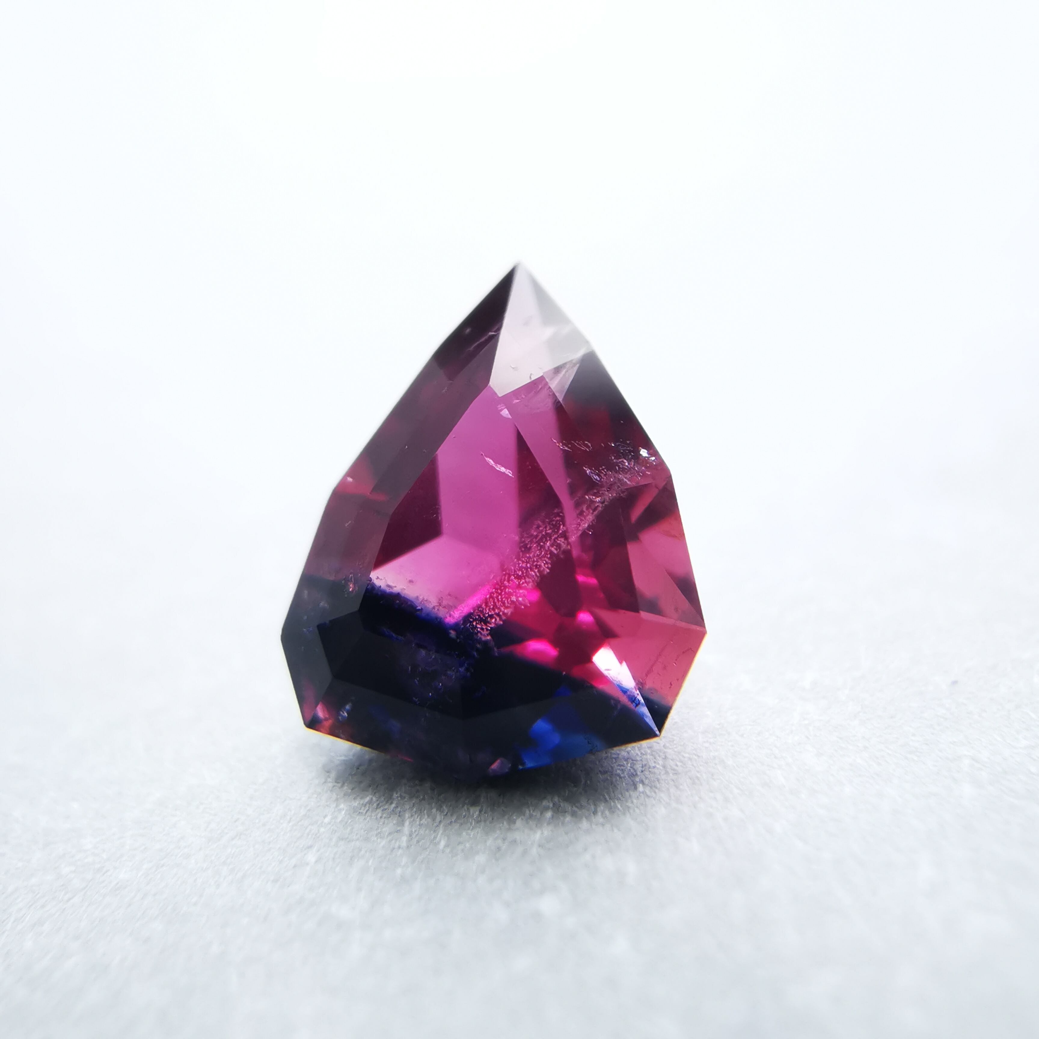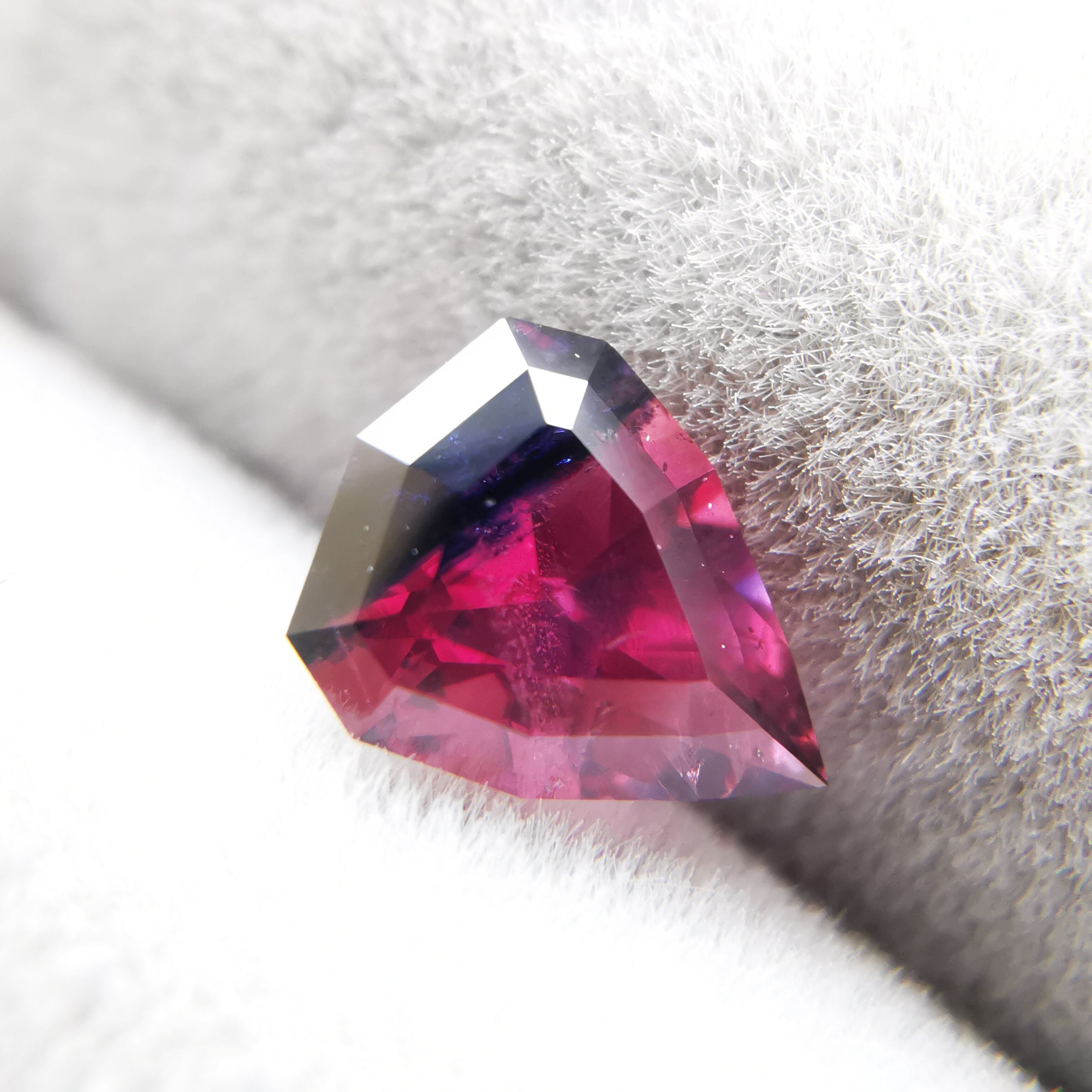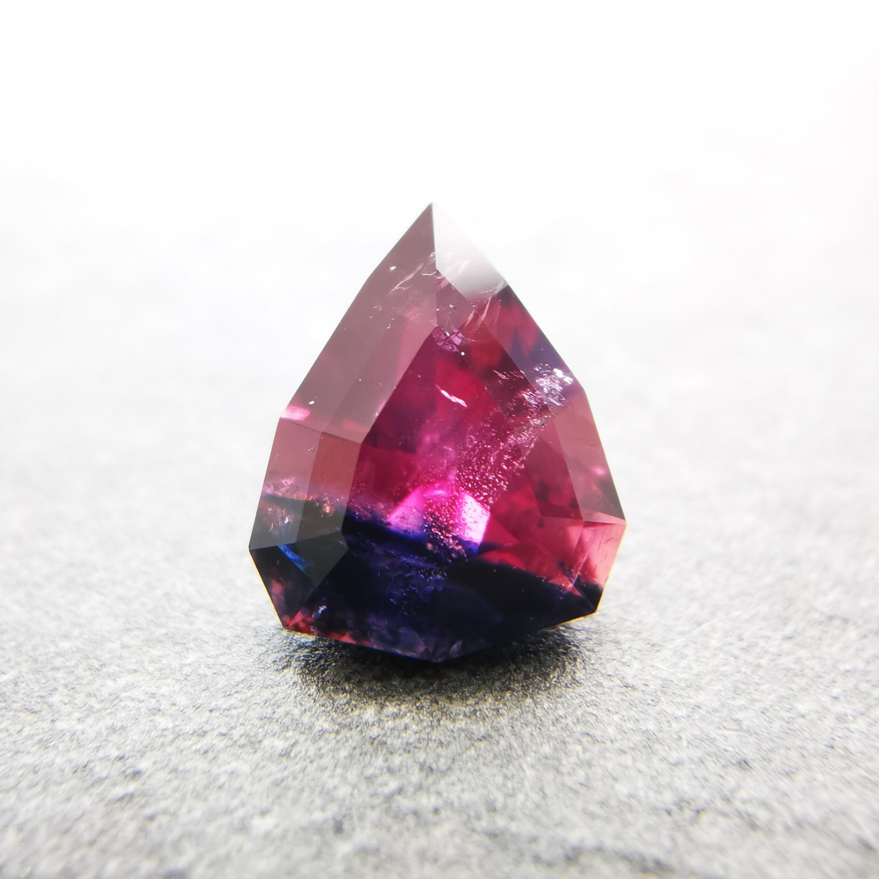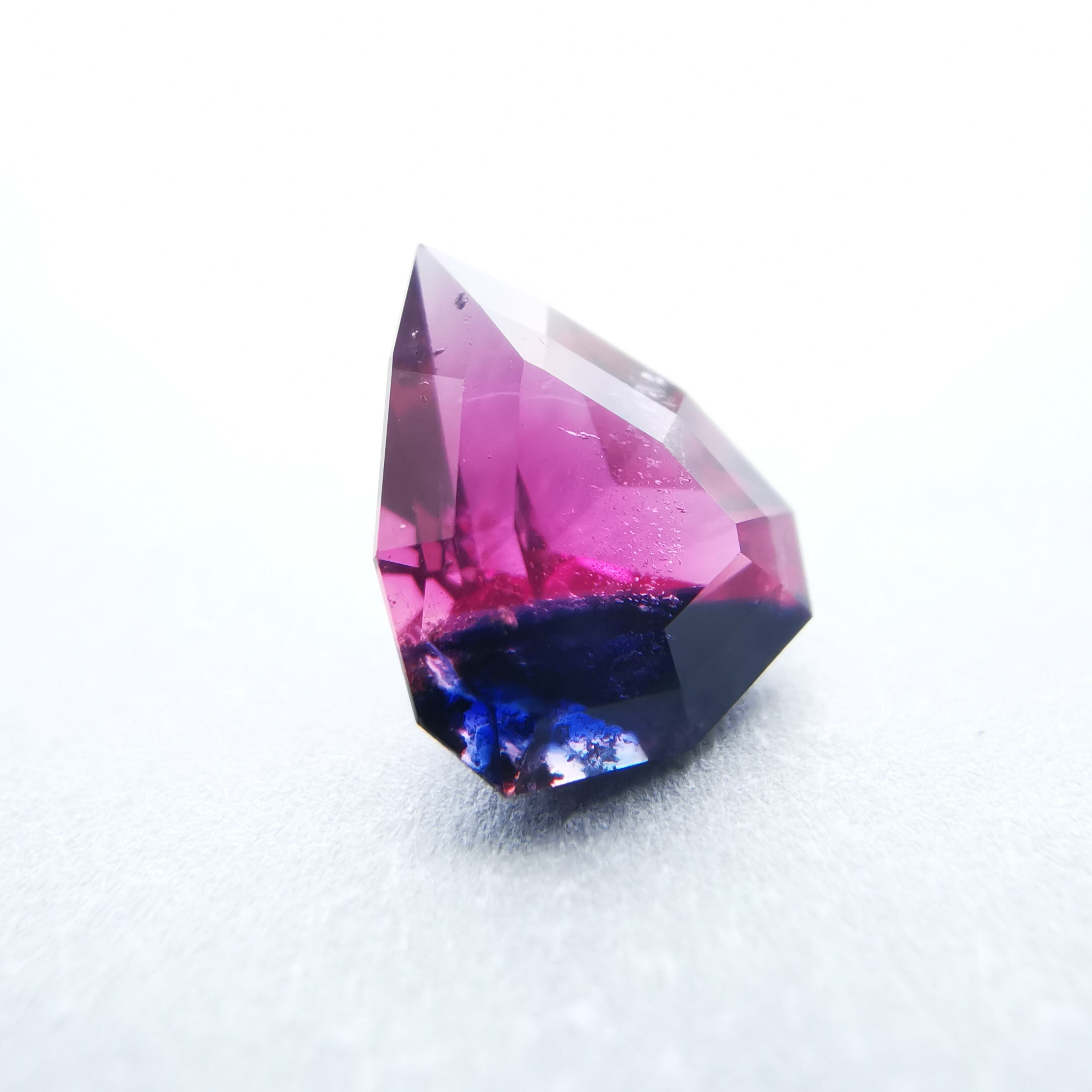 鮮やかなローズピンクのペアシェイプのてっぺんを摘んで、おしりをちょんとブルーインクに浸けたような、下から斜めに濃いブルーが入ったサファイアです。