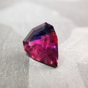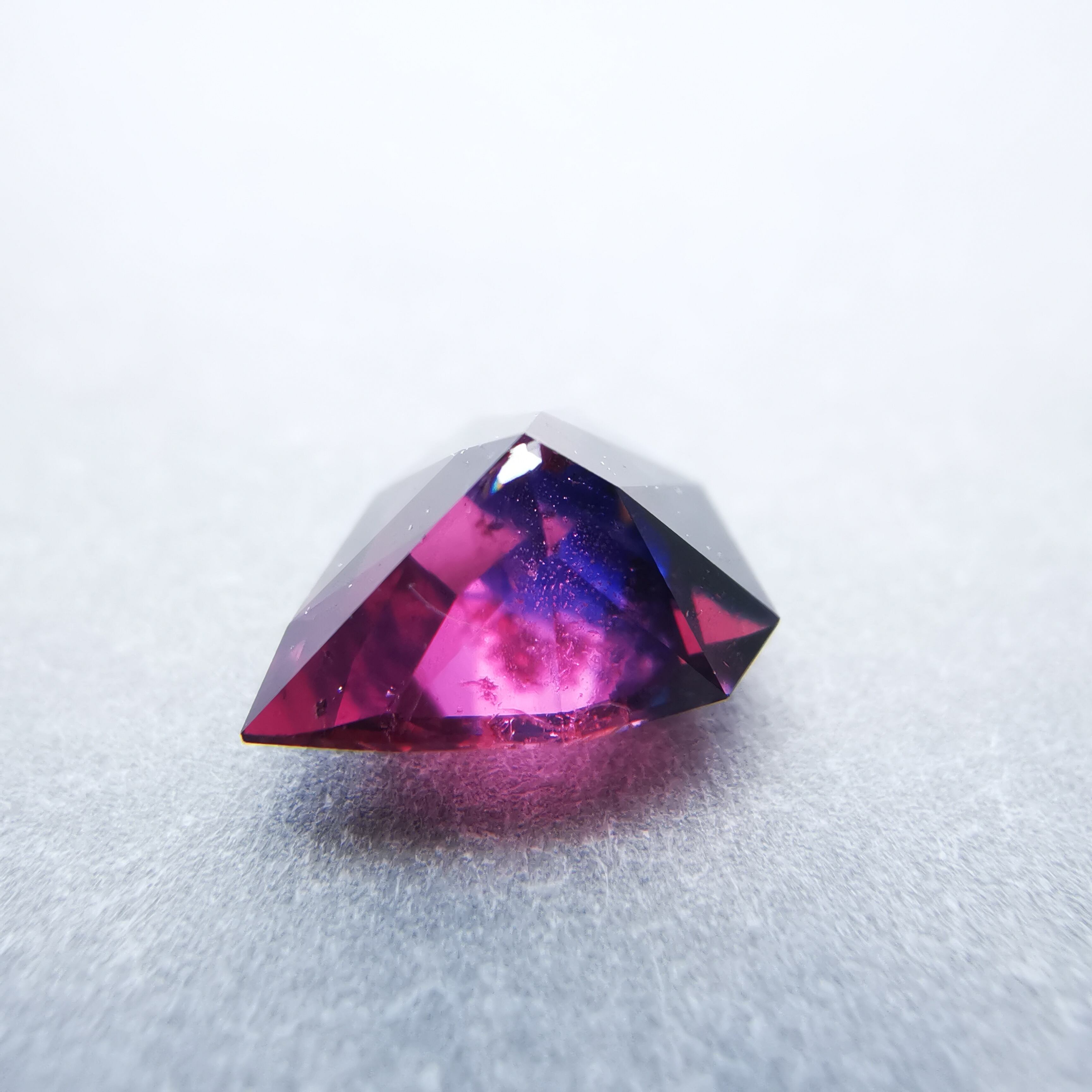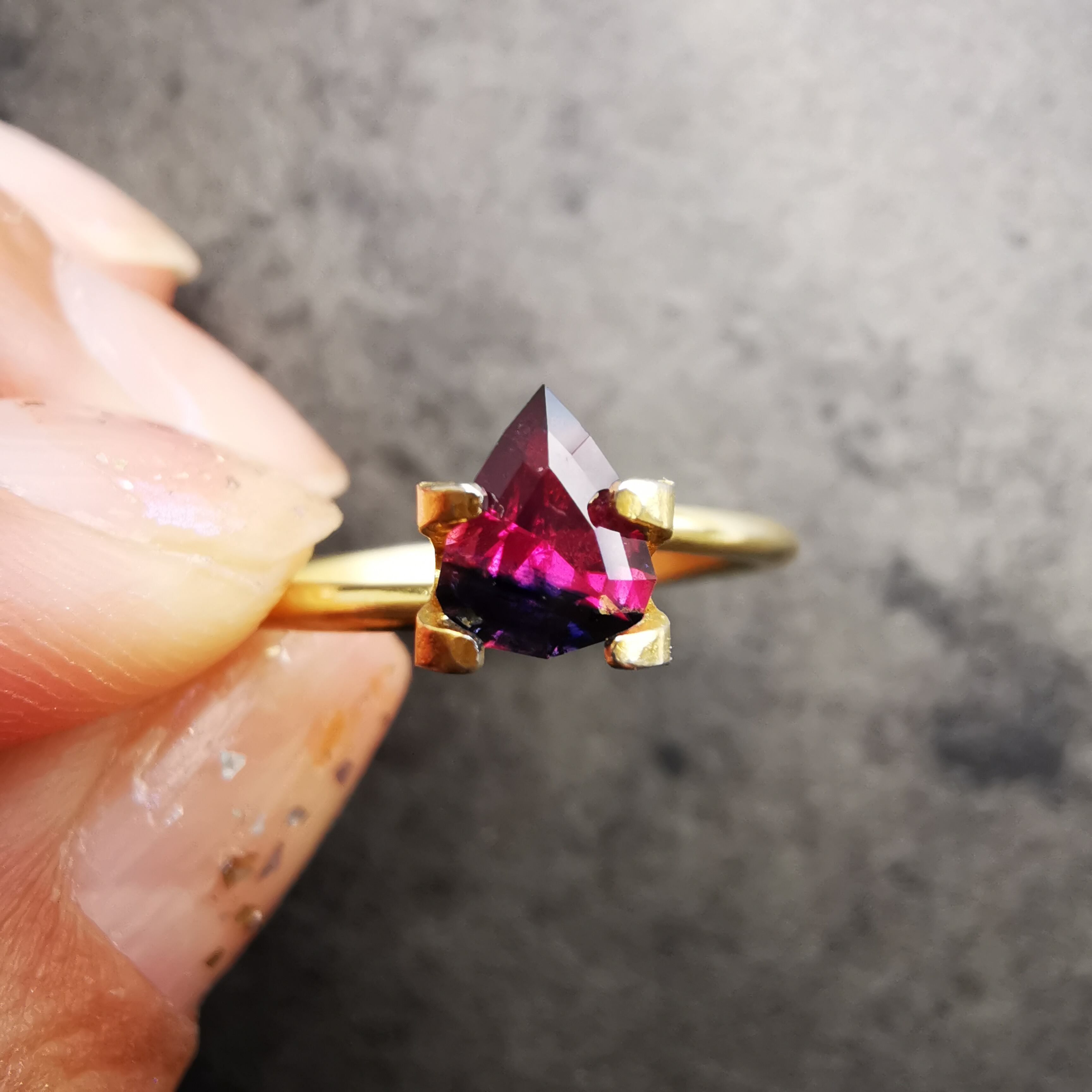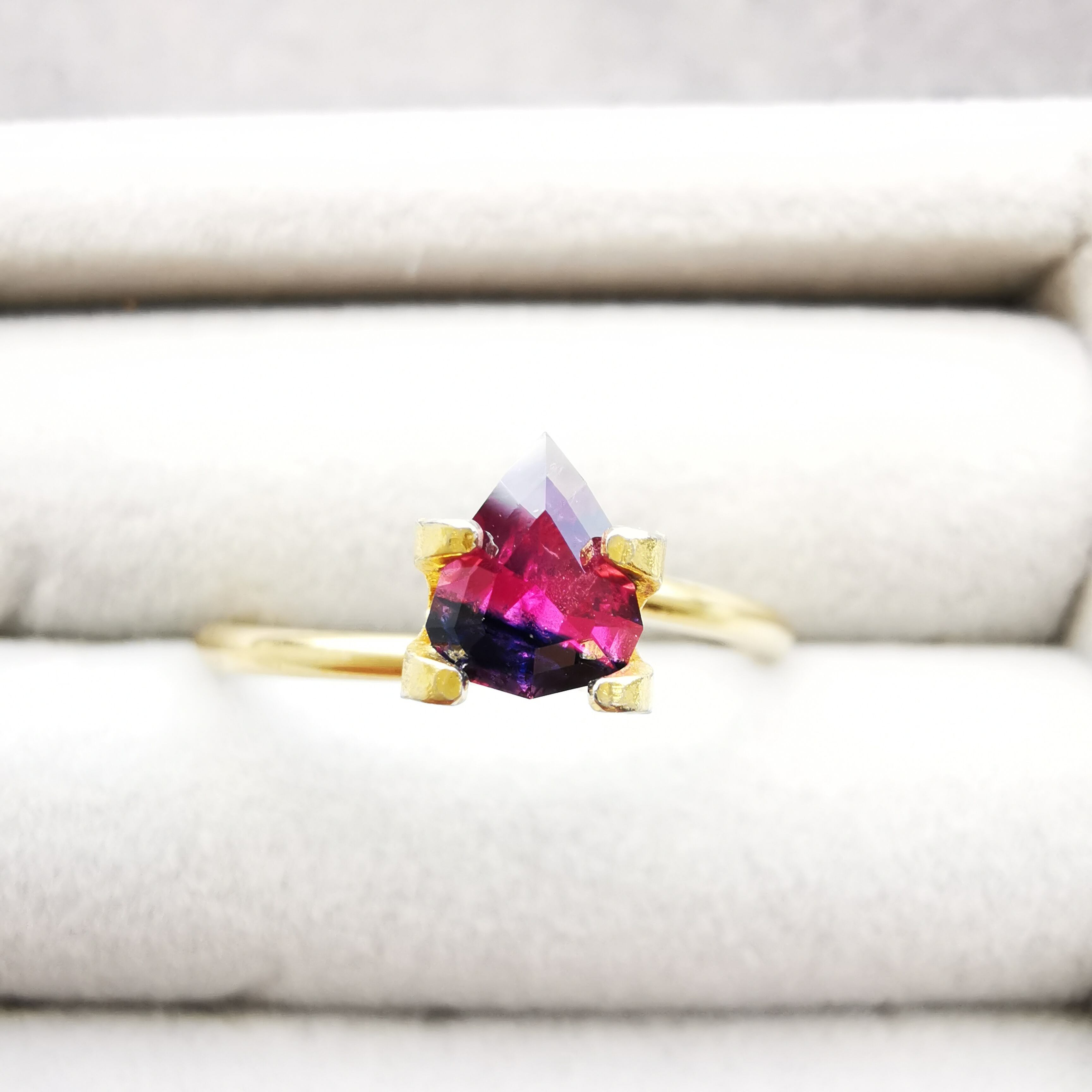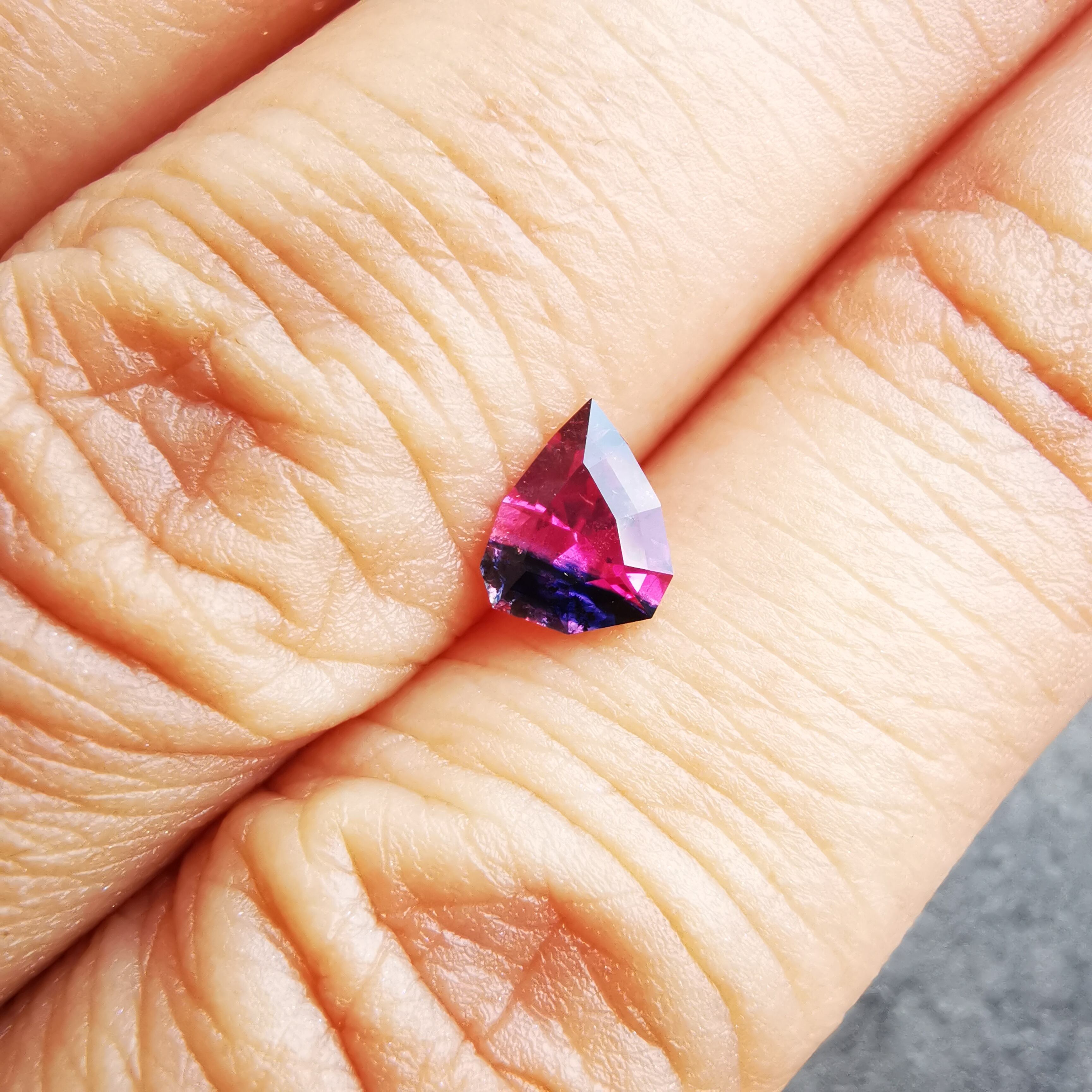 鮮やかなローズピンクのペアシェイプのてっぺんを摘んで、おしりをちょんとブルーインクに浸けたような、下から斜めに濃いブルーが入ったサファイアです。