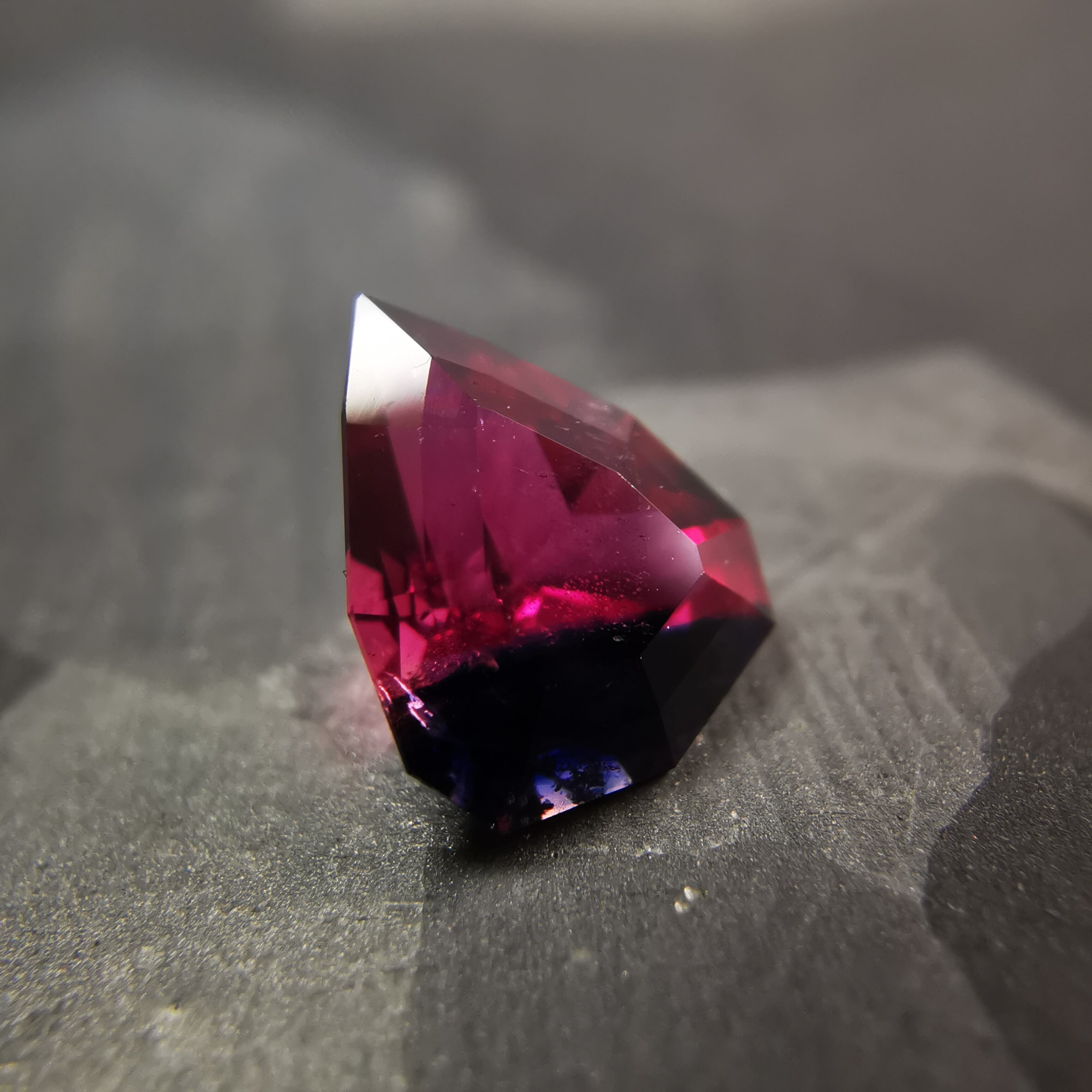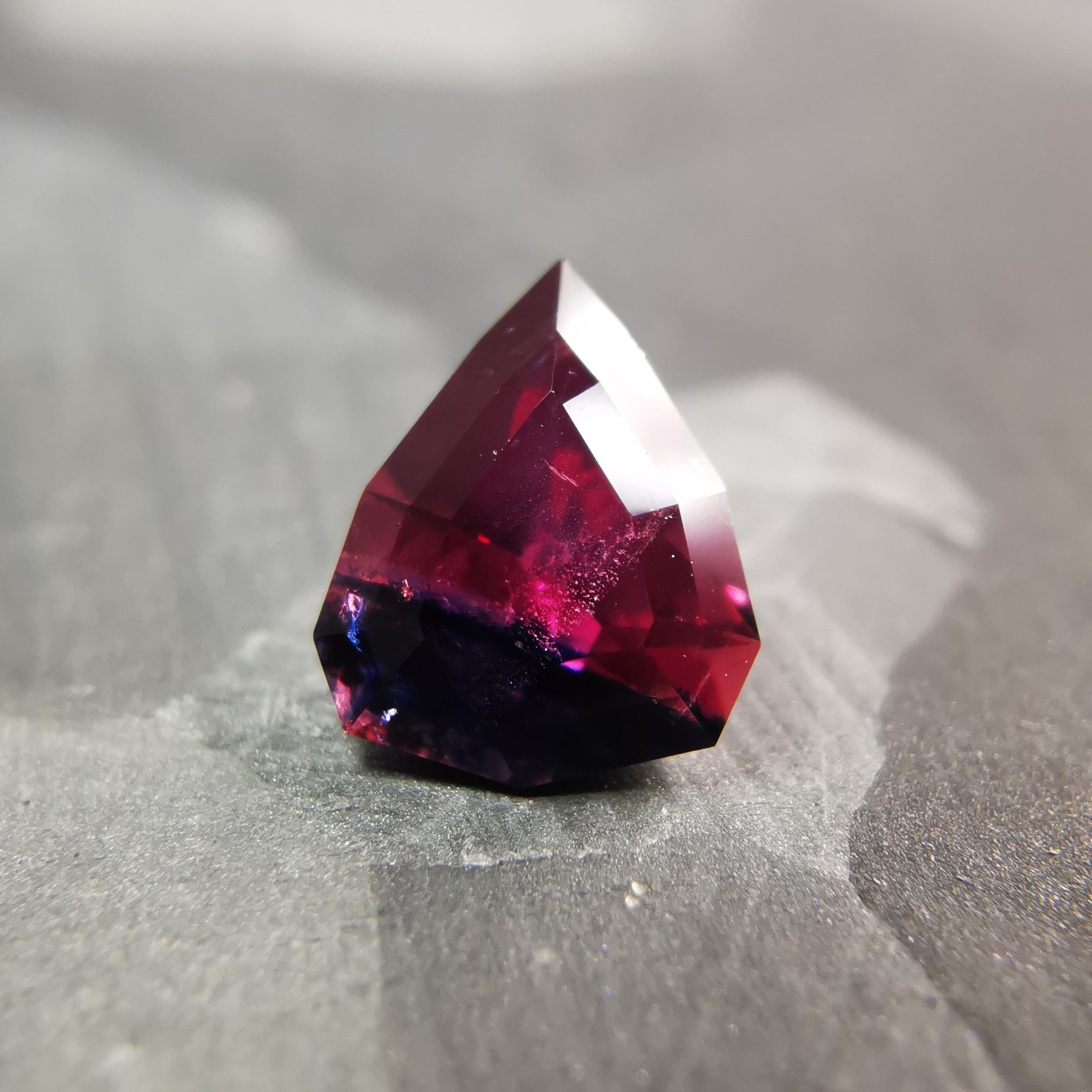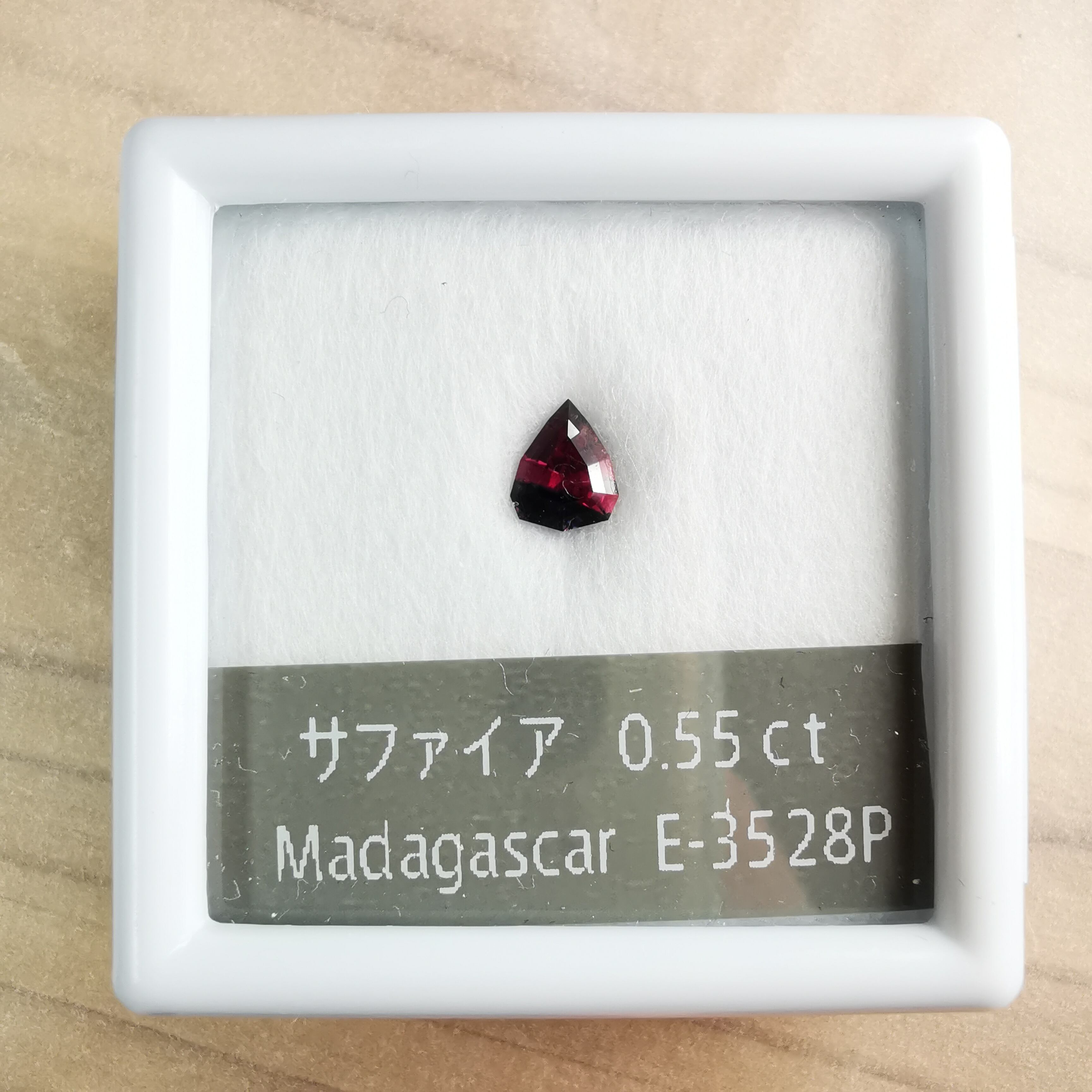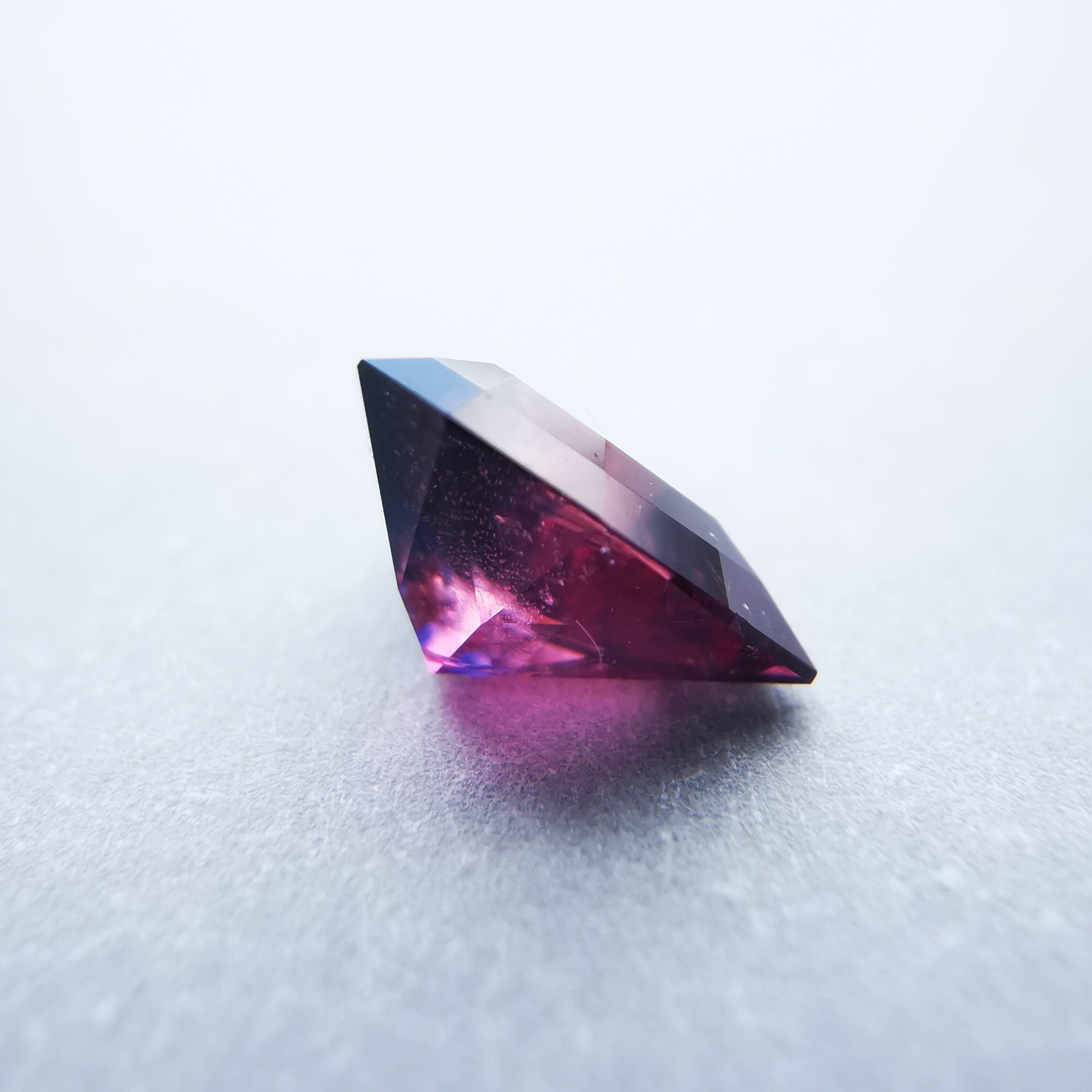 鮮やかなローズピンクのペアシェイプのてっぺんを摘んで、おしりをちょんとブルーインクに浸けたような、下から斜めに濃いブルーが入ったサファイアです。