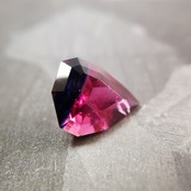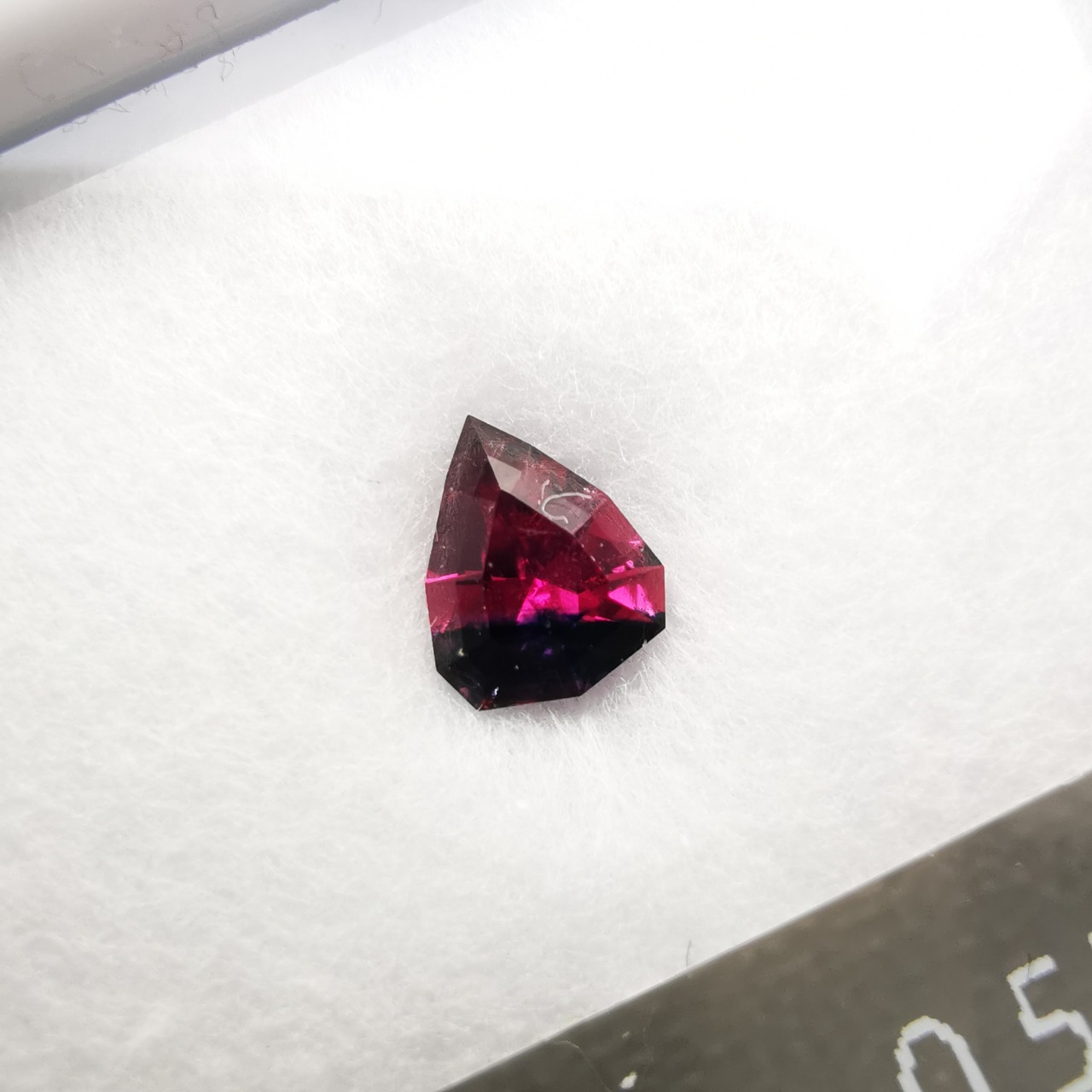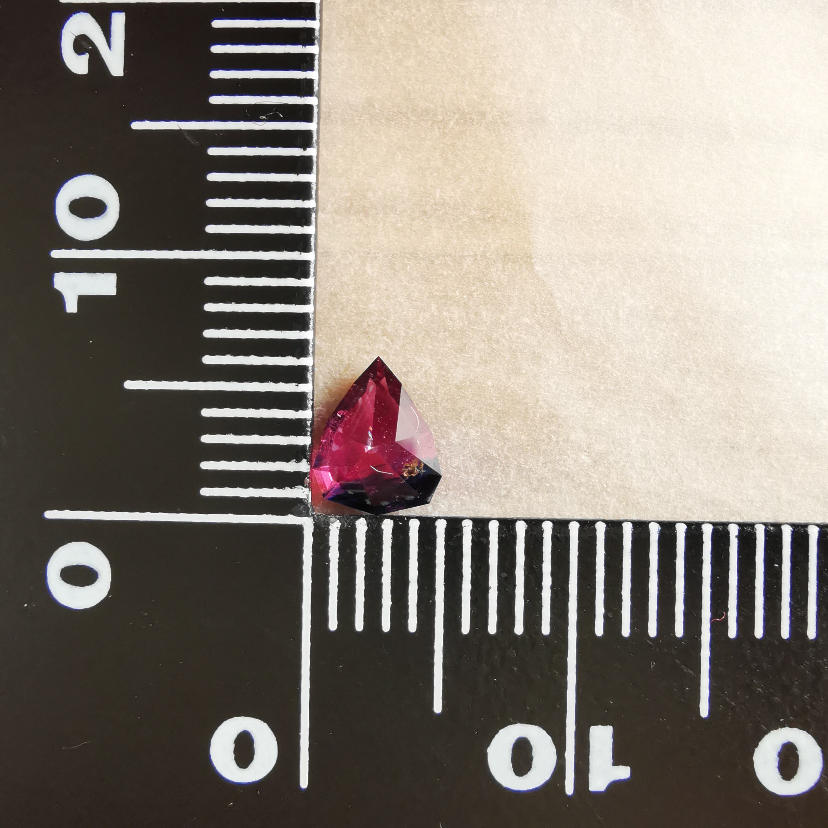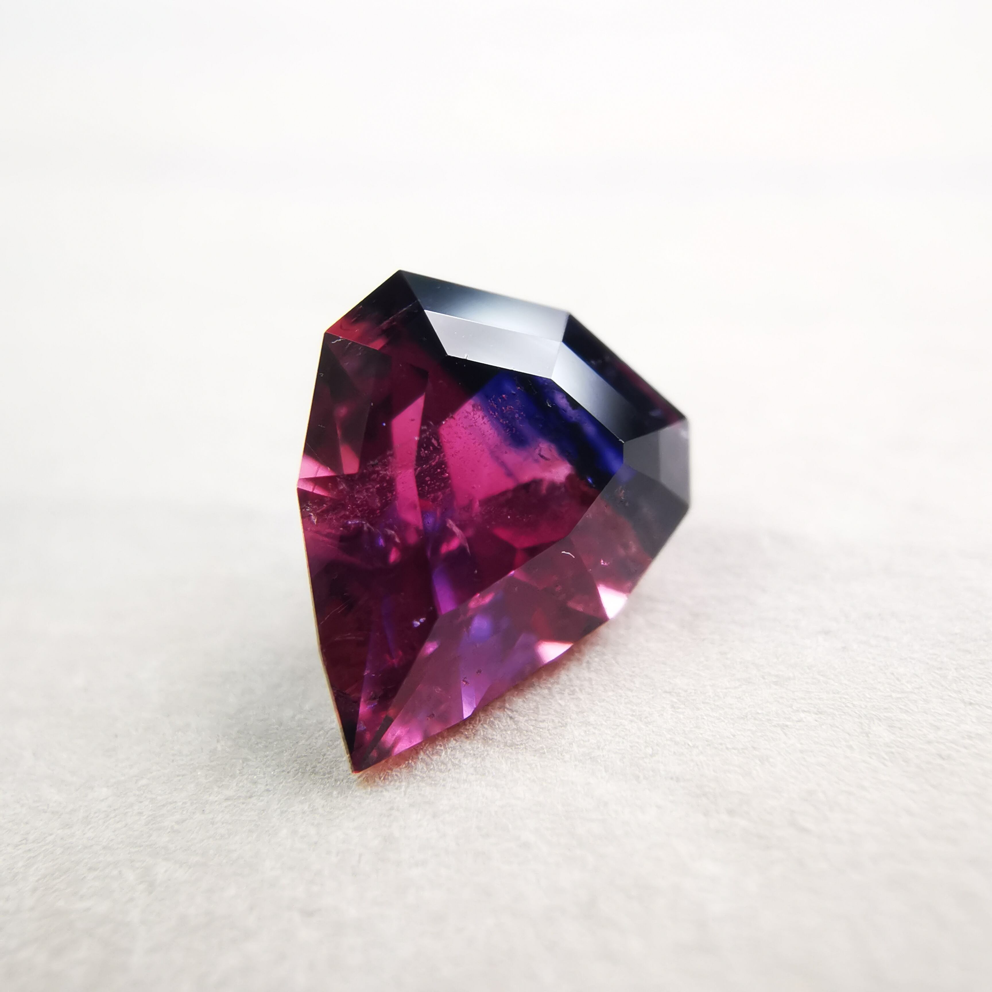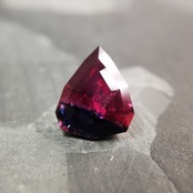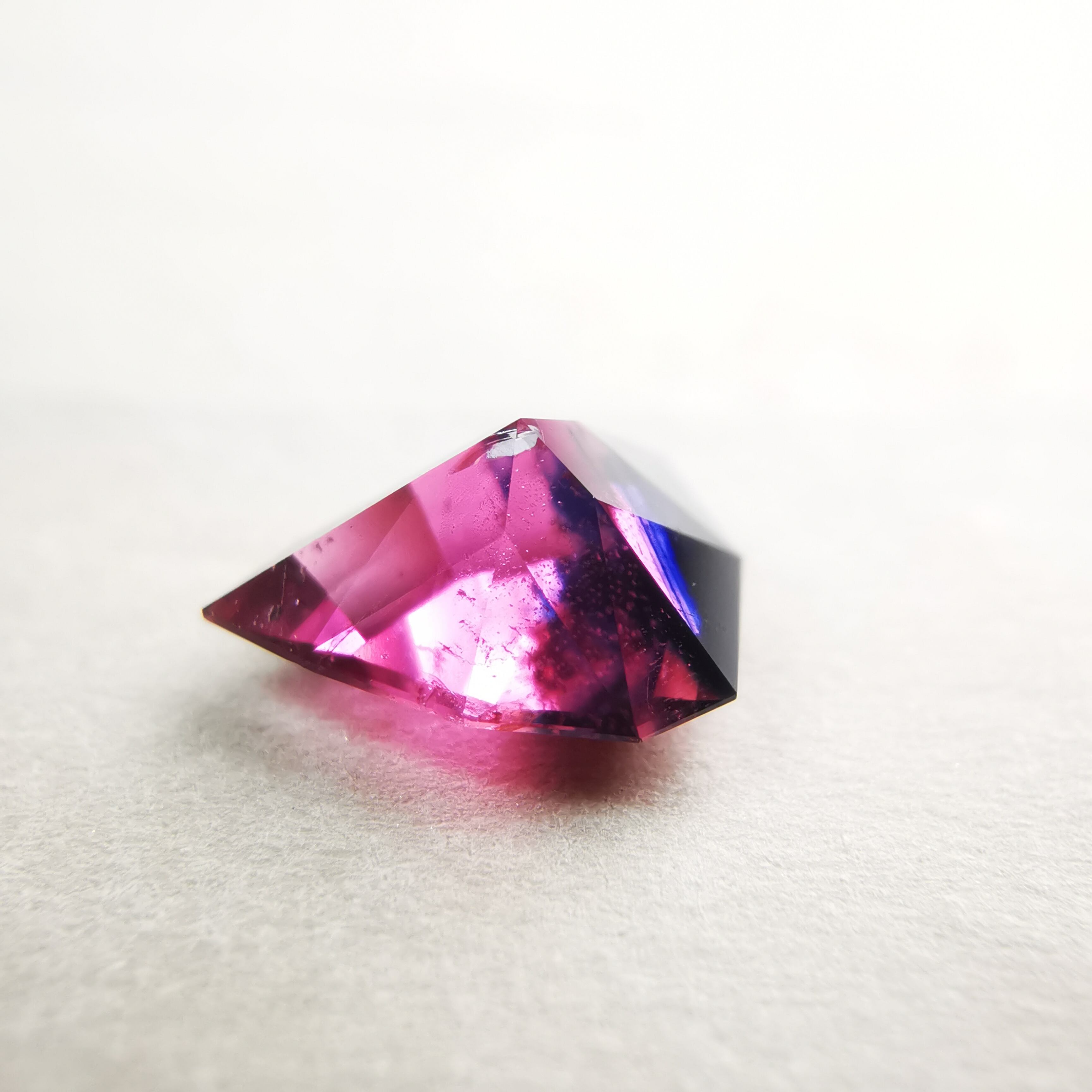 鮮やかなローズピンクのペアシェイプのてっぺんを摘んで、おしりをちょんとブルーインクに浸けたような、下から斜めに濃いブルーが入ったサファイアです。