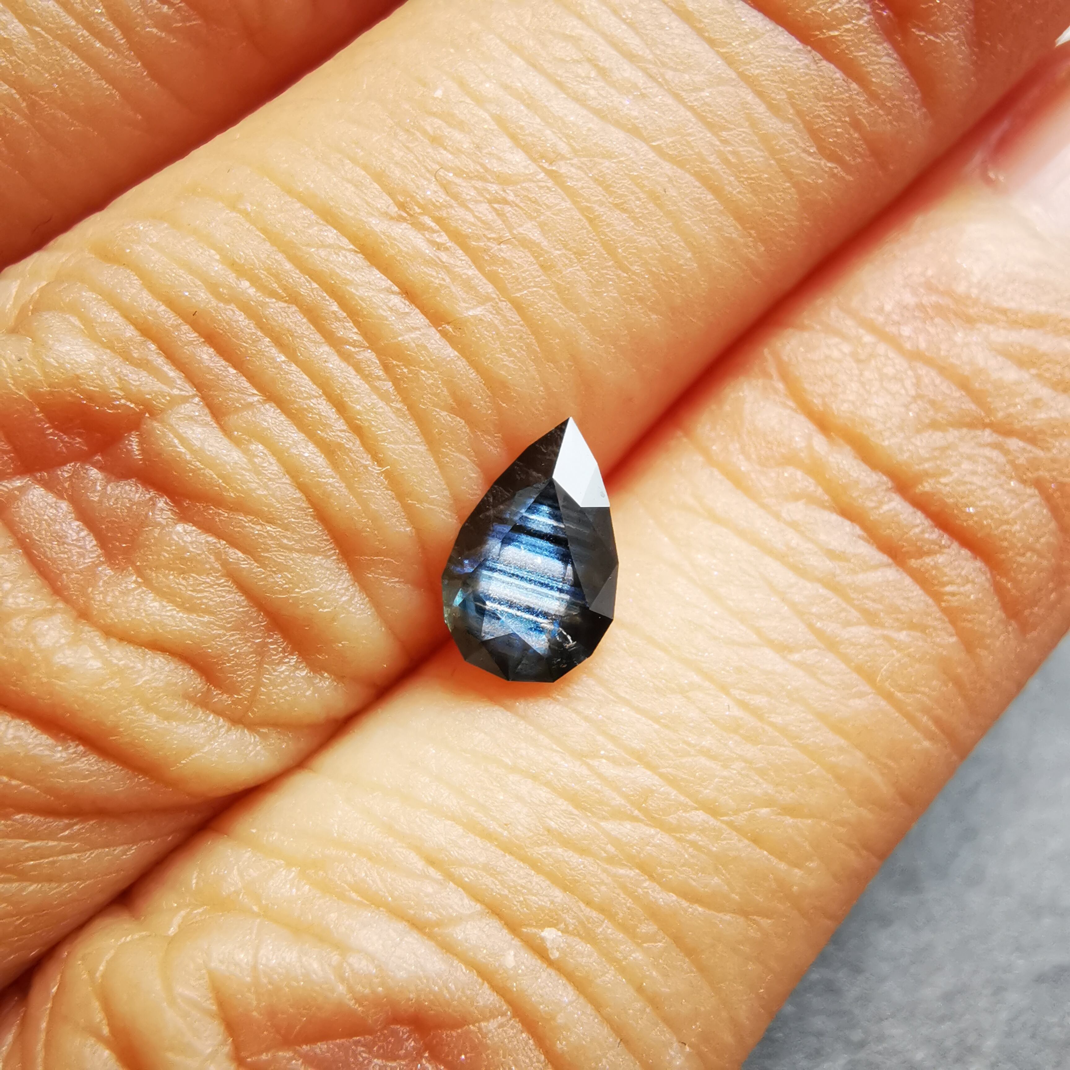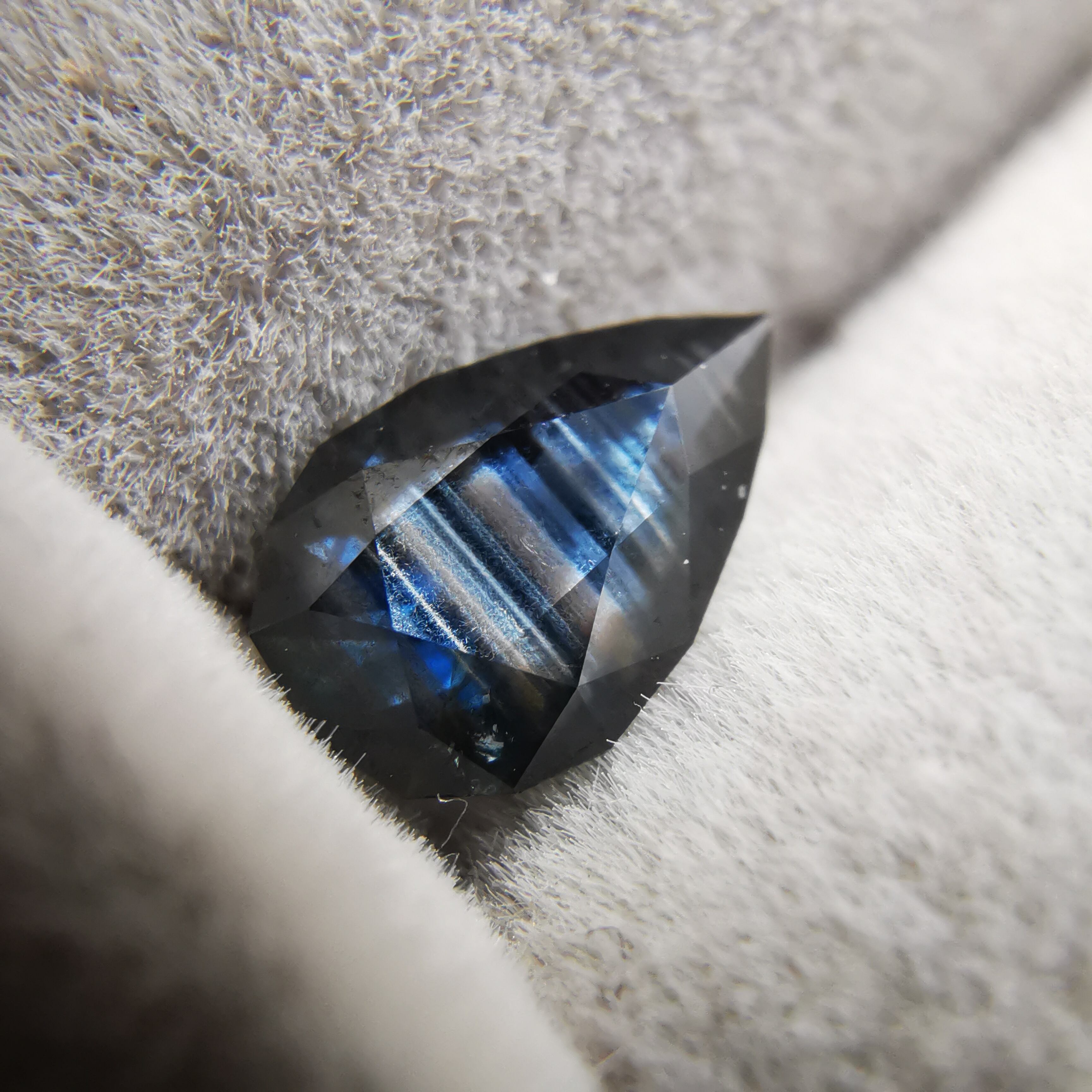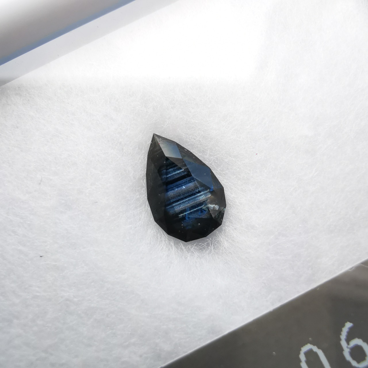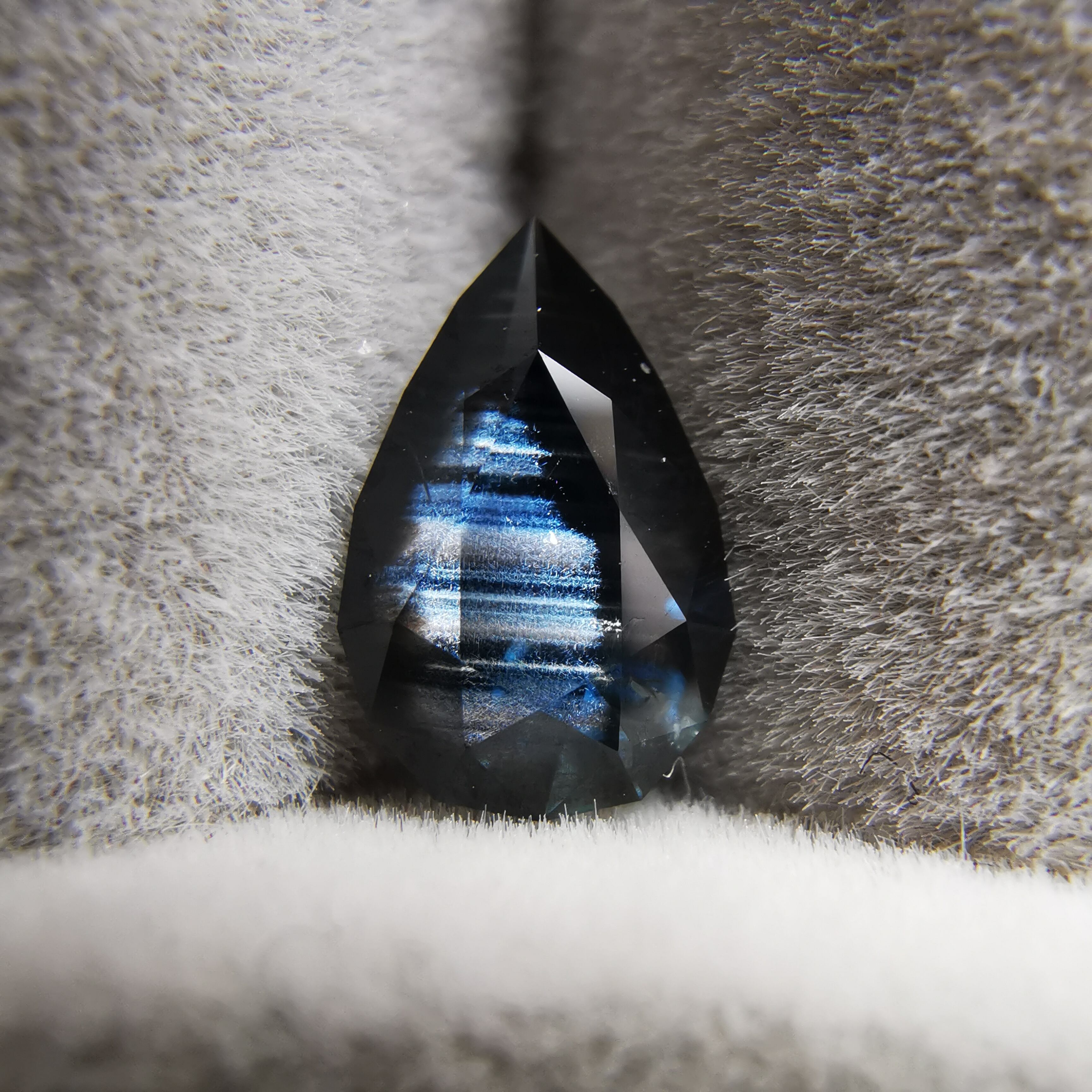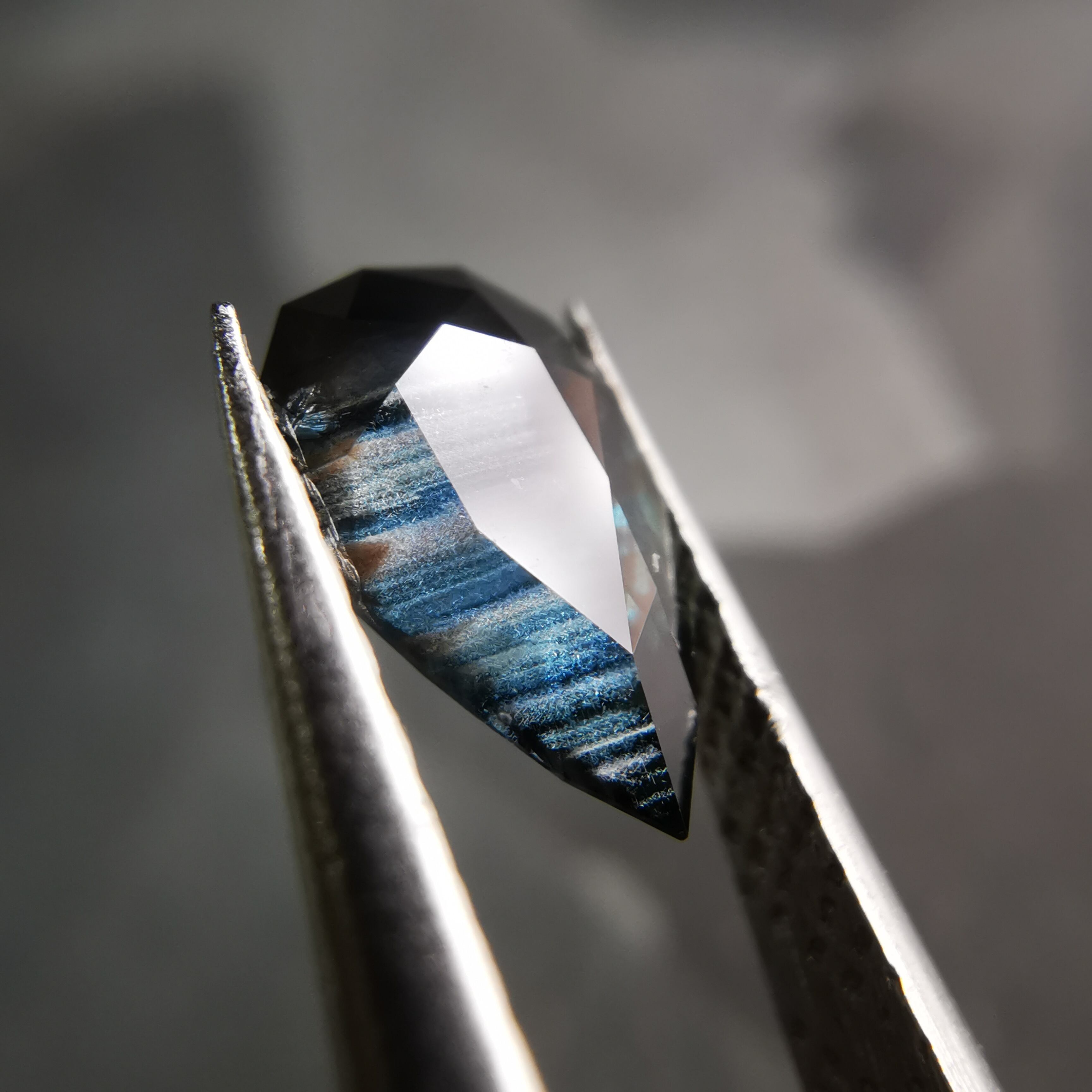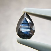 濃藍色/ごく暗い青のサファイアに、シルバーとゴールドのシラーがフェイスを横切るように入っています。