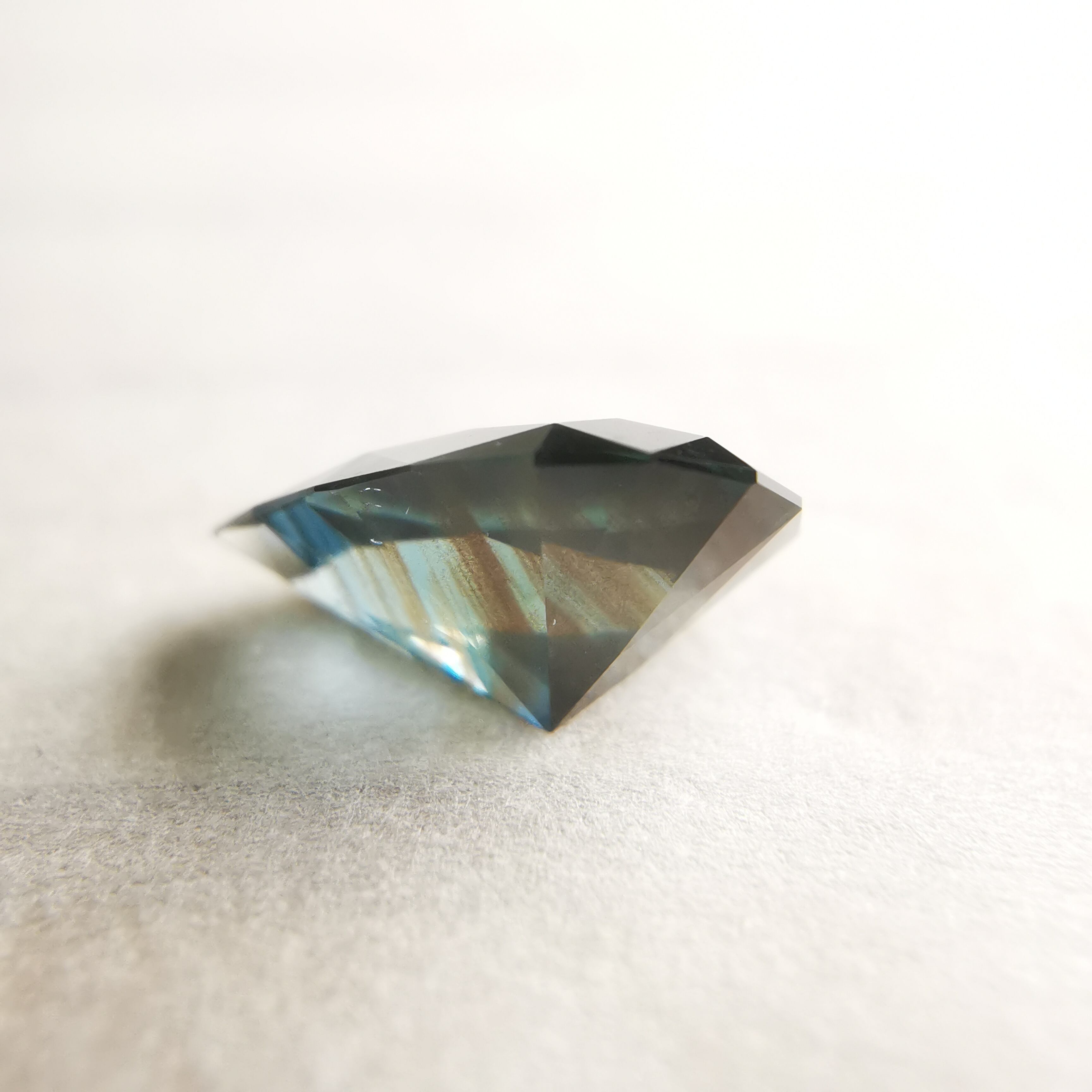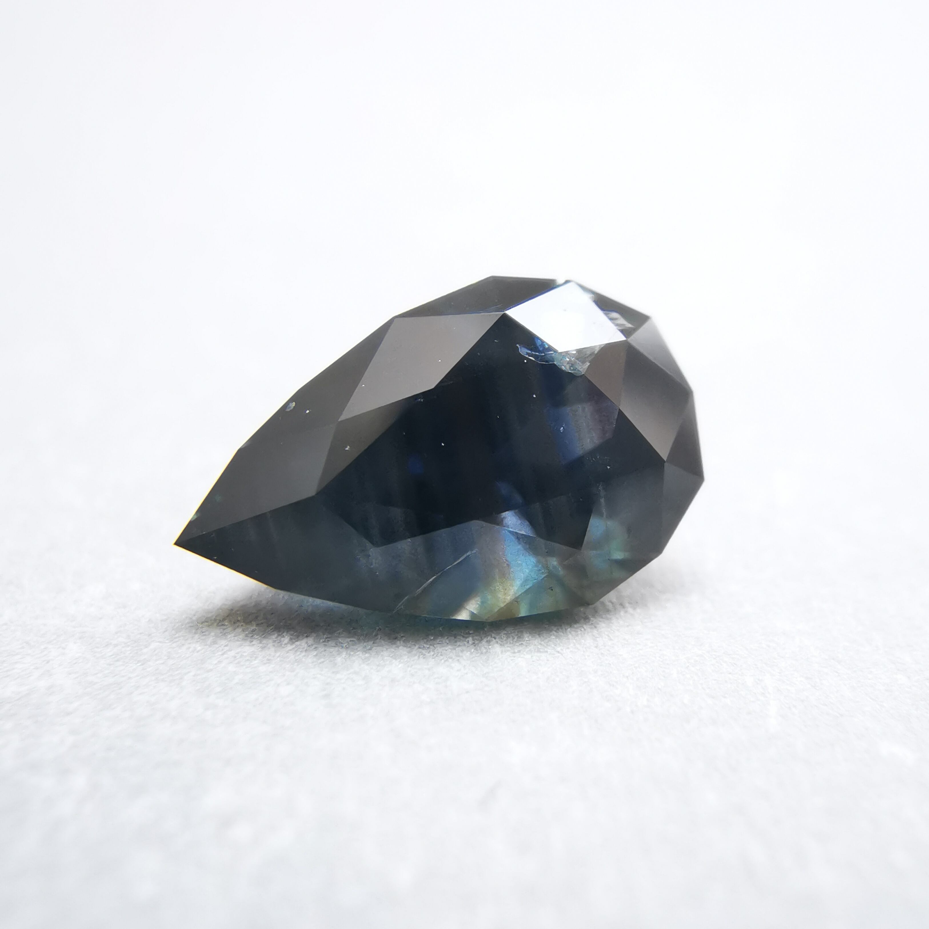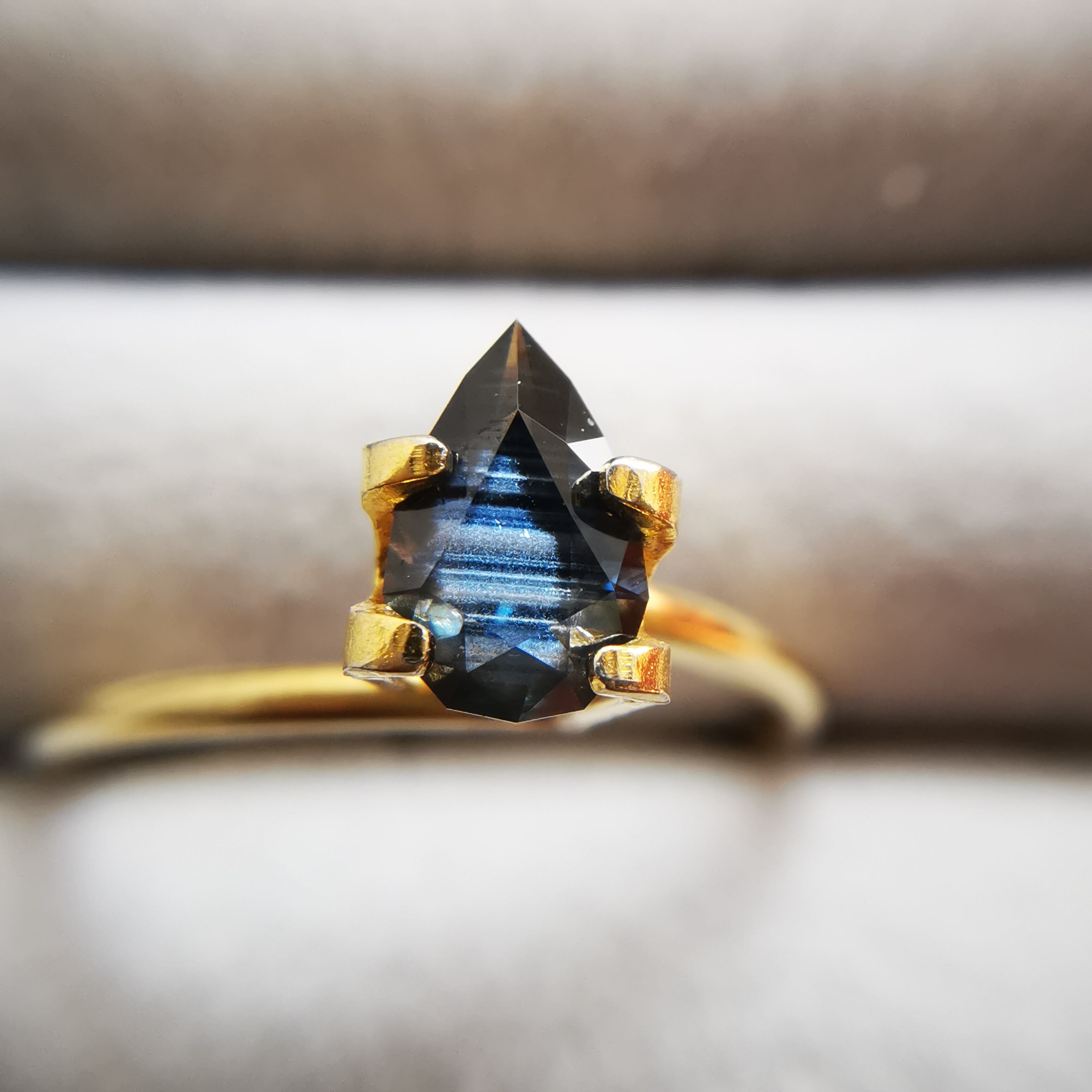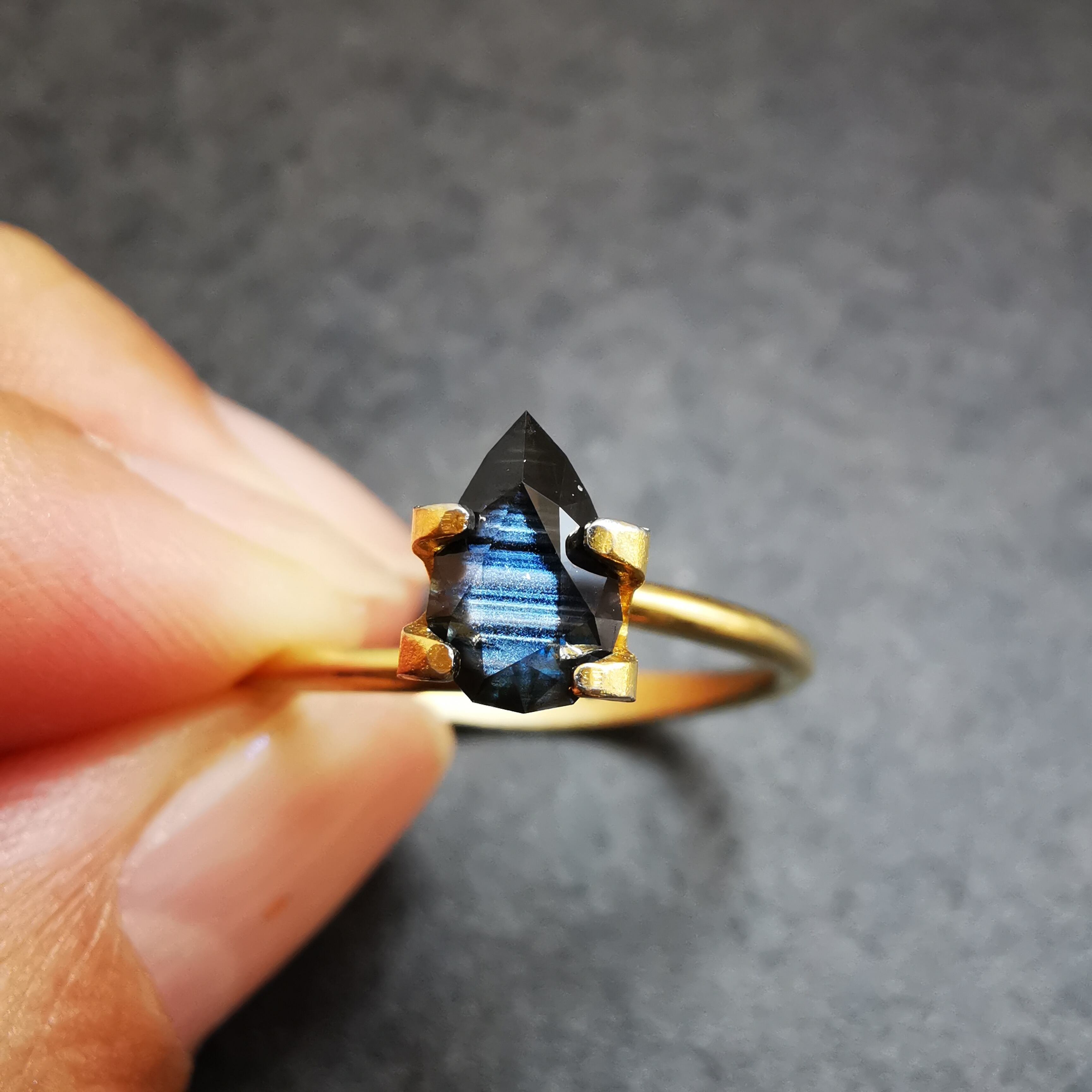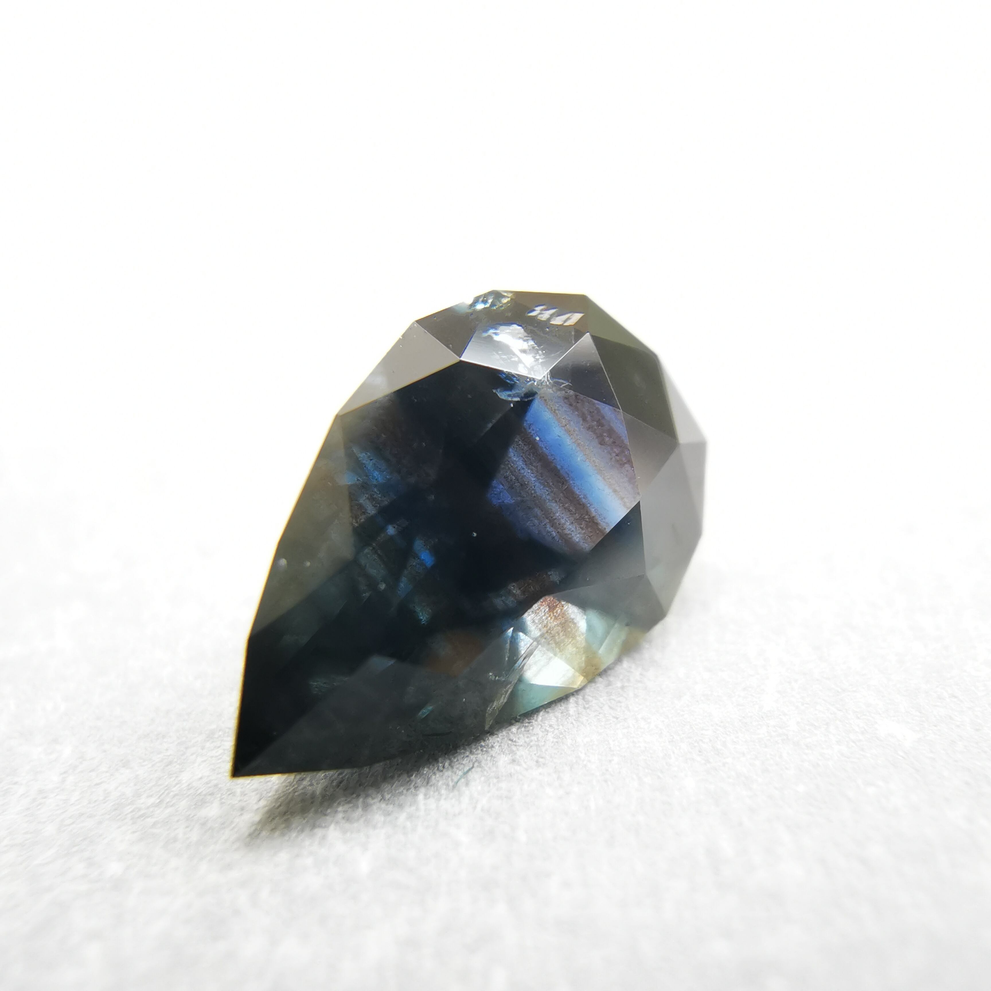 濃藍色/ごく暗い青のサファイアに、シルバーとゴールドのシラーがフェイスを横切るように入っています。
