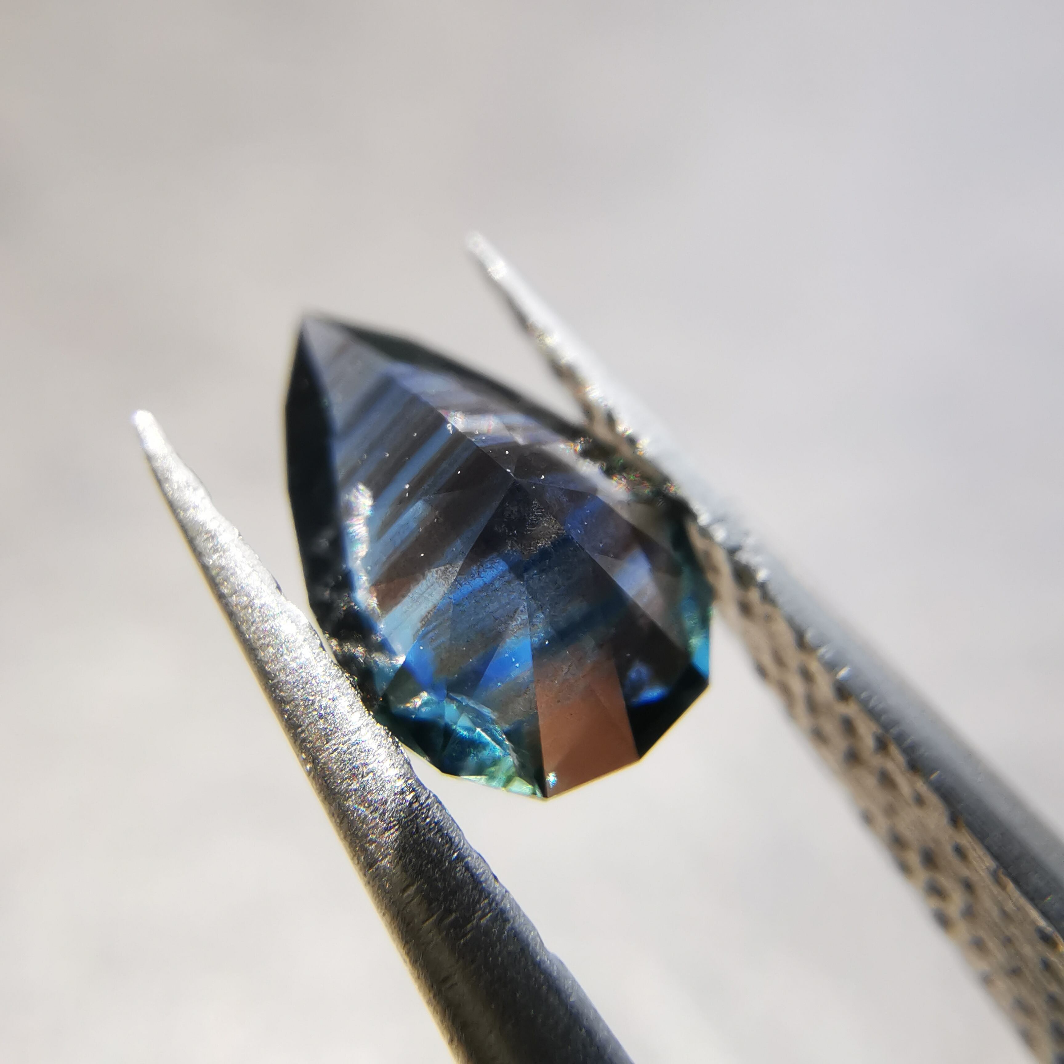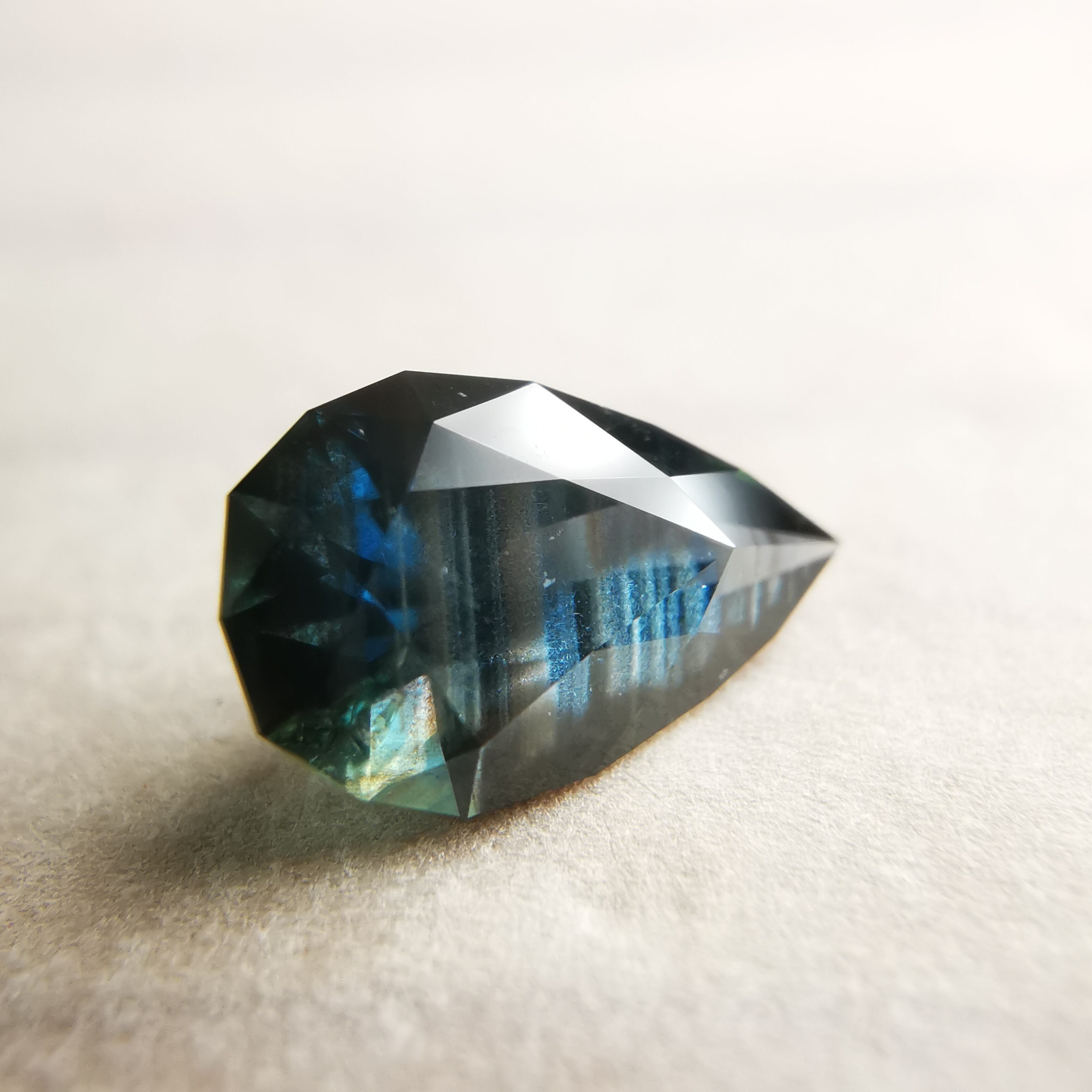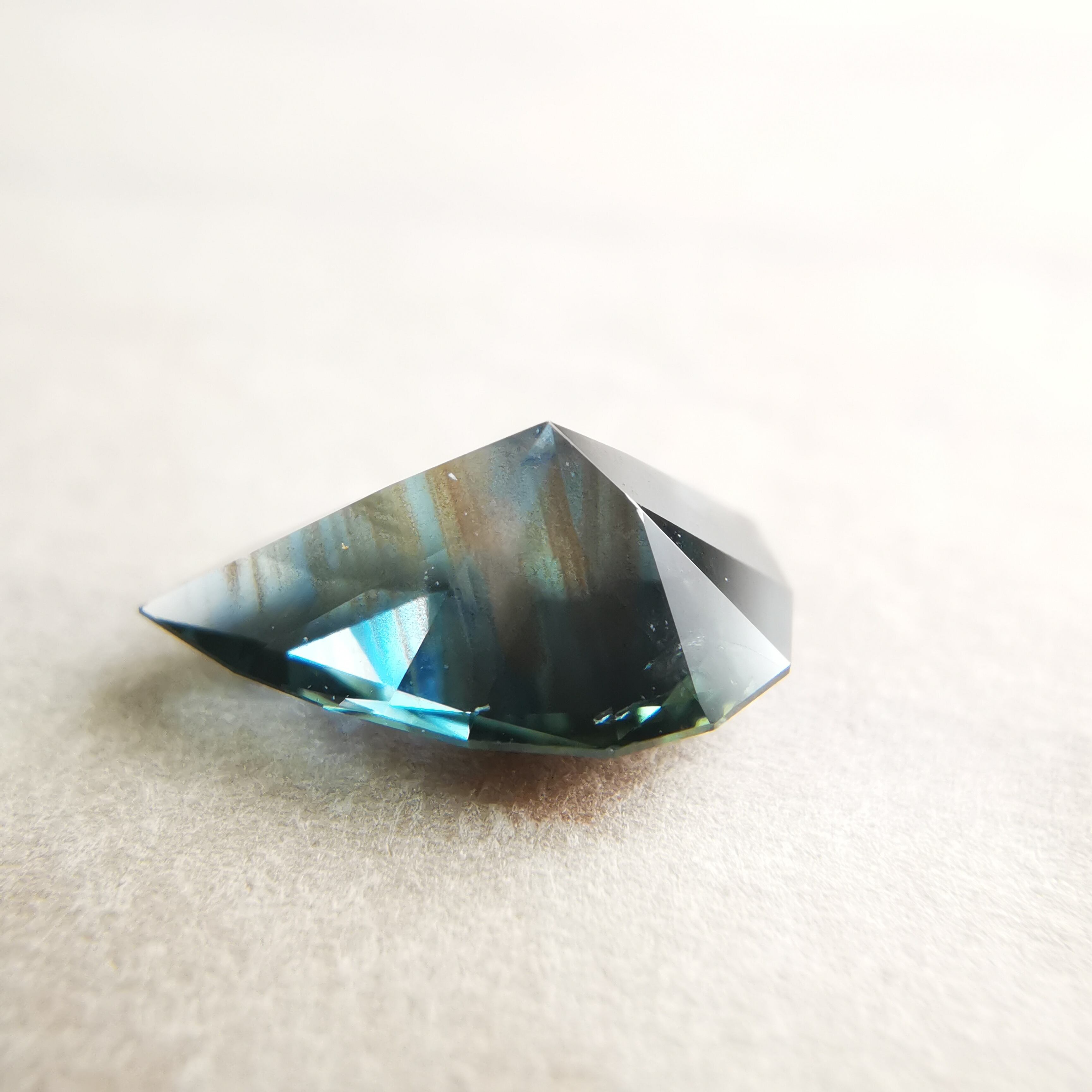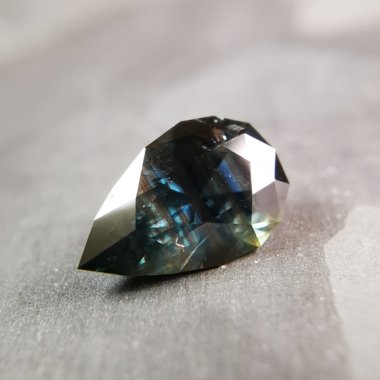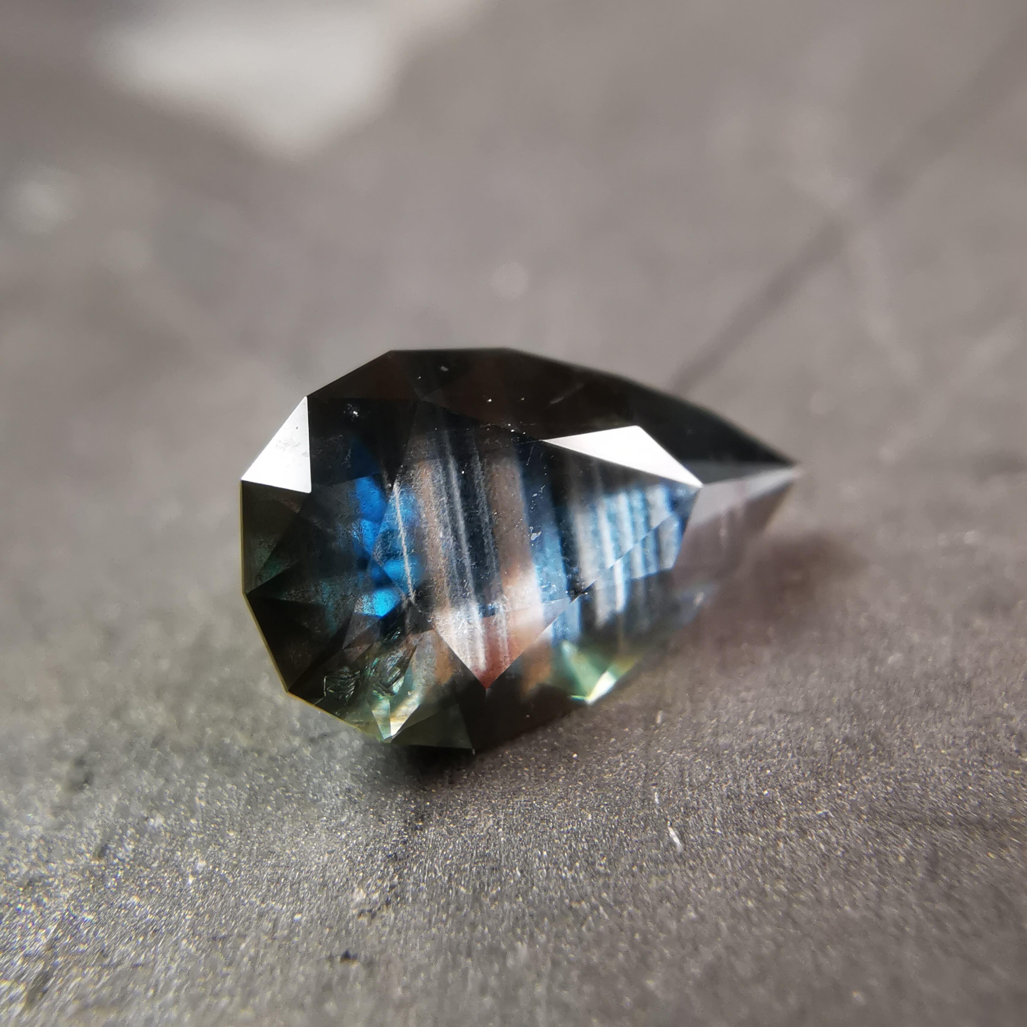 濃藍色/ごく暗い青のサファイアに、シルバーとゴールドのシラーがフェイスを横切るように入っています。