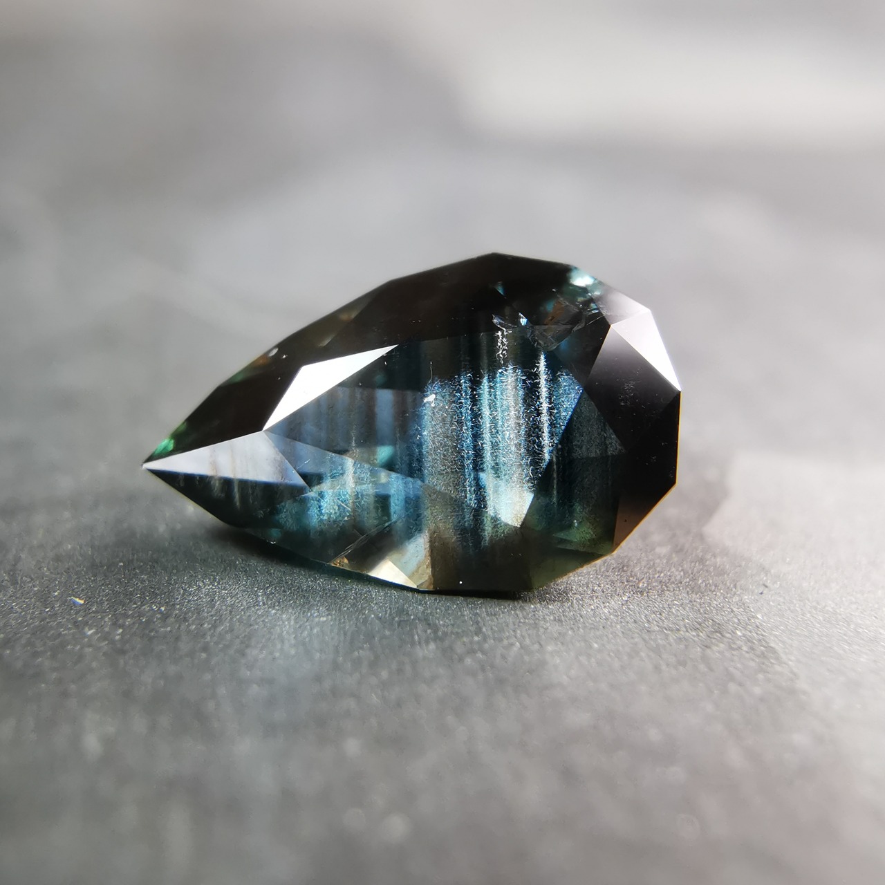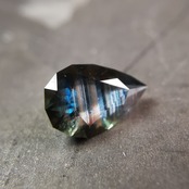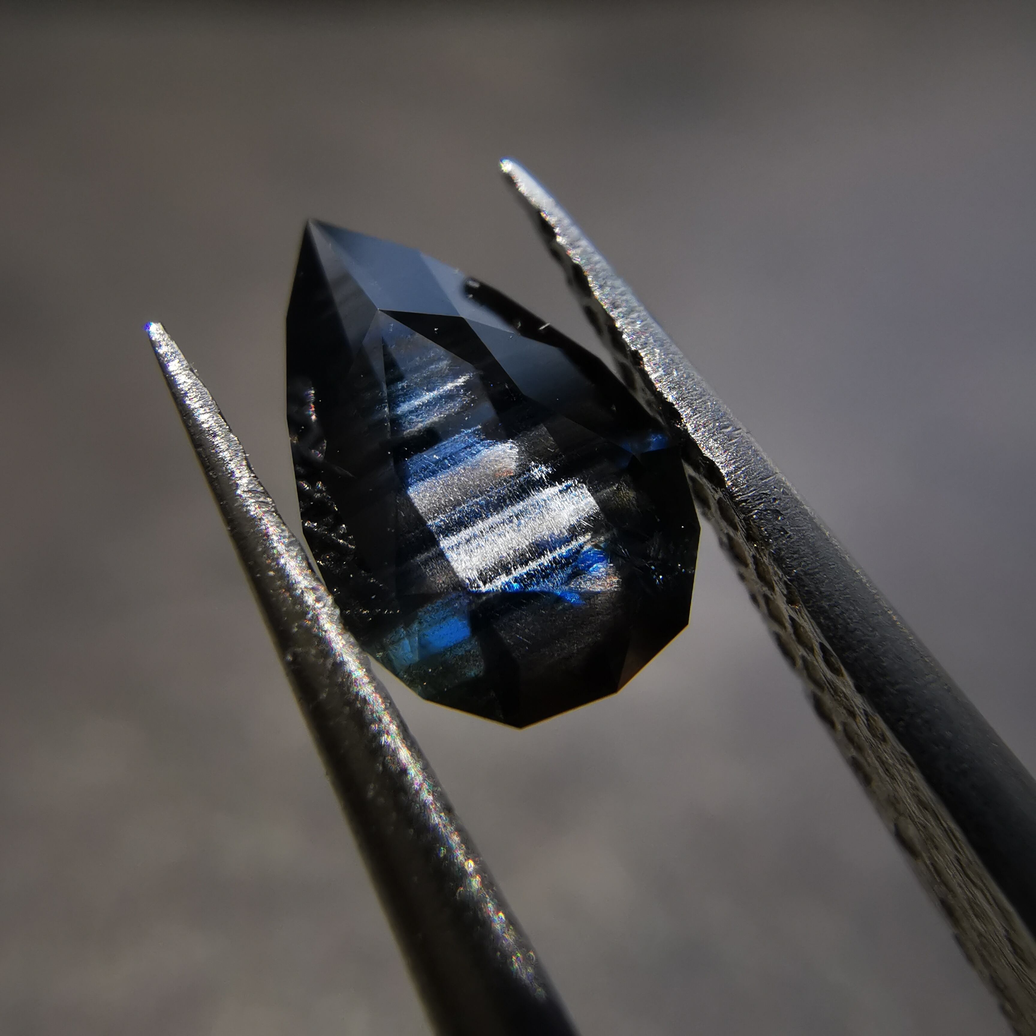 一見、かなり黒っぽい石ですが、光にかざすとわずかに青みと緑みがこぼれ、テーブル面に光が当たるとくっきりと光の帯が浮かび上がり、縞模様がきらめきます。