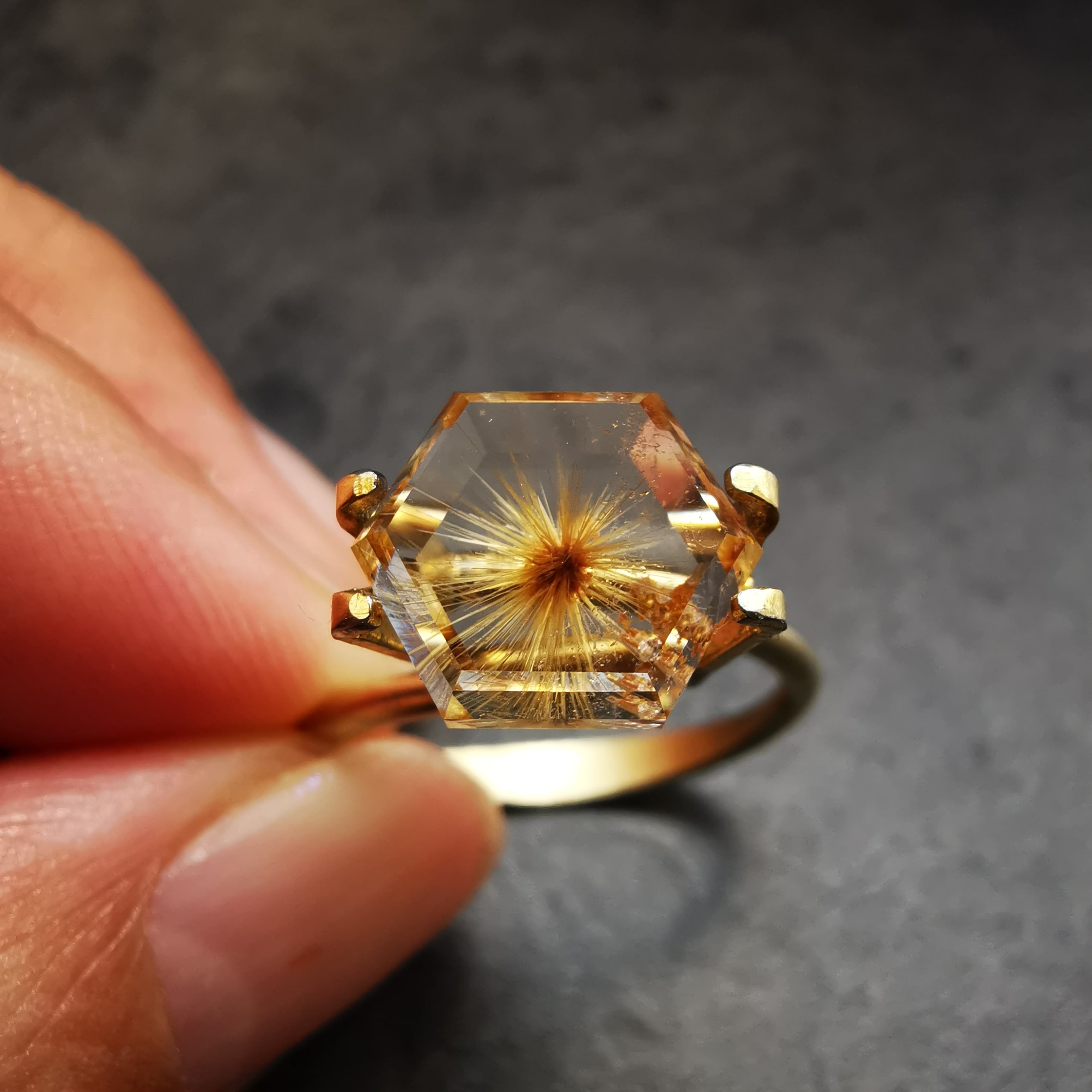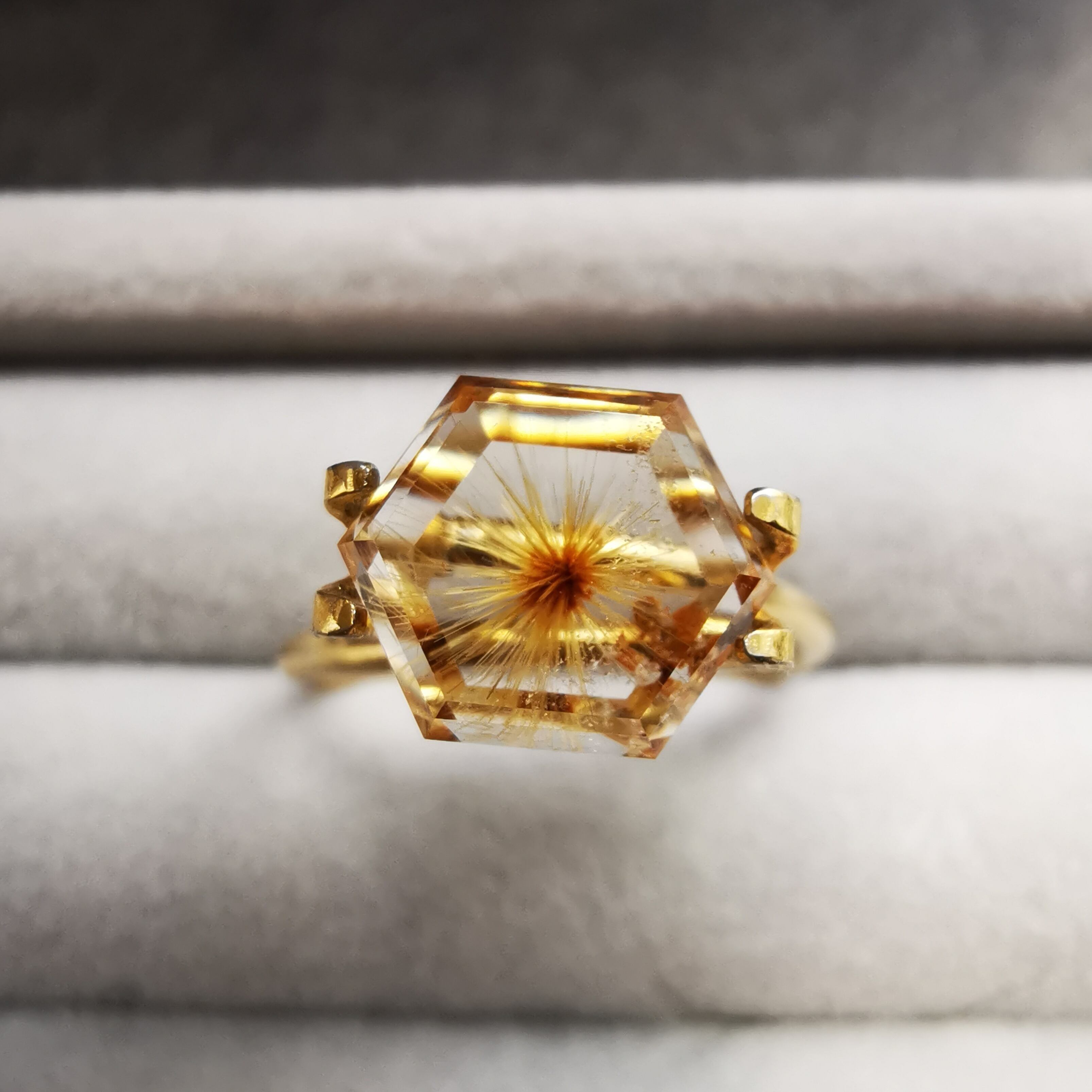 石の中心で爆発するように黄金に輝くルチルが迫力満点です。