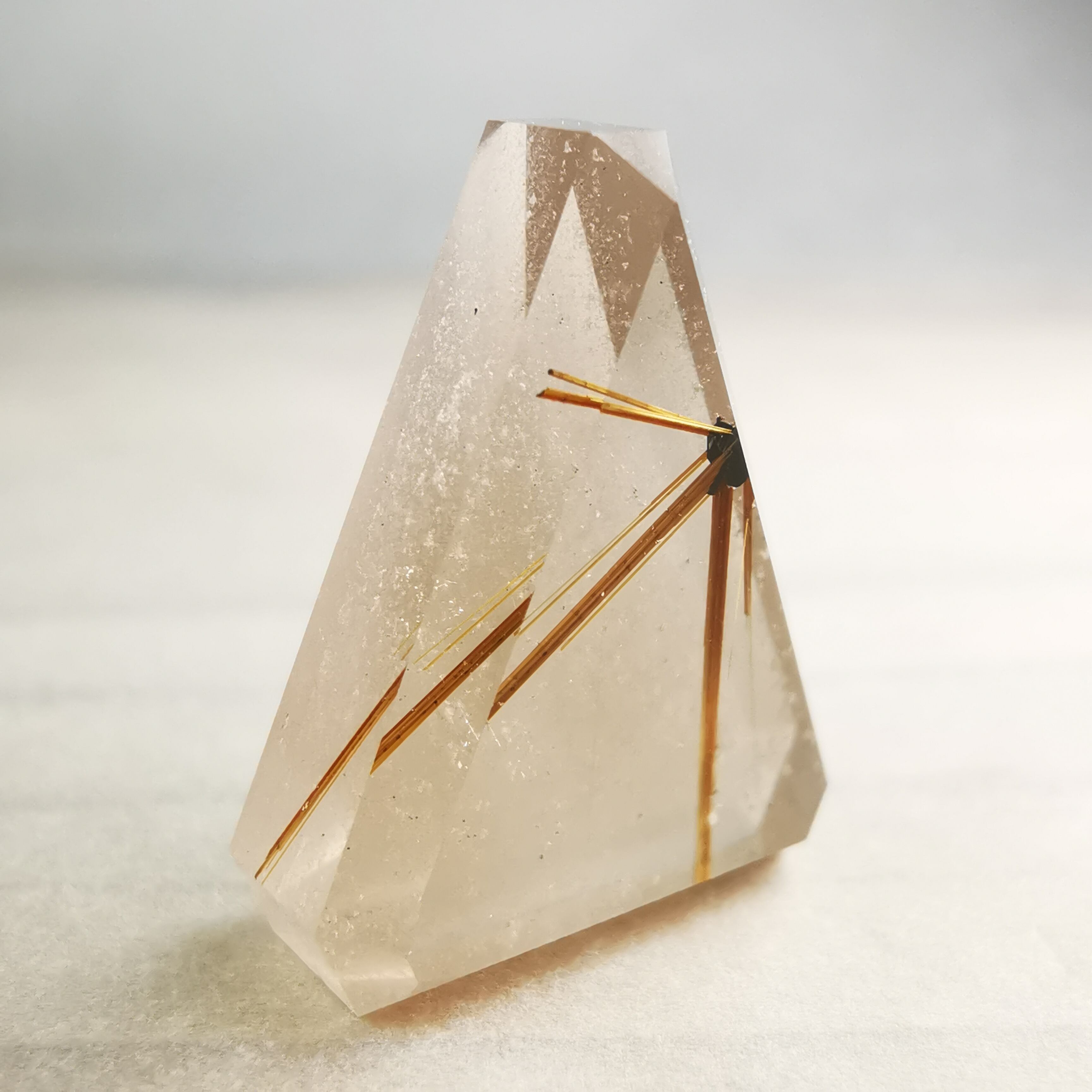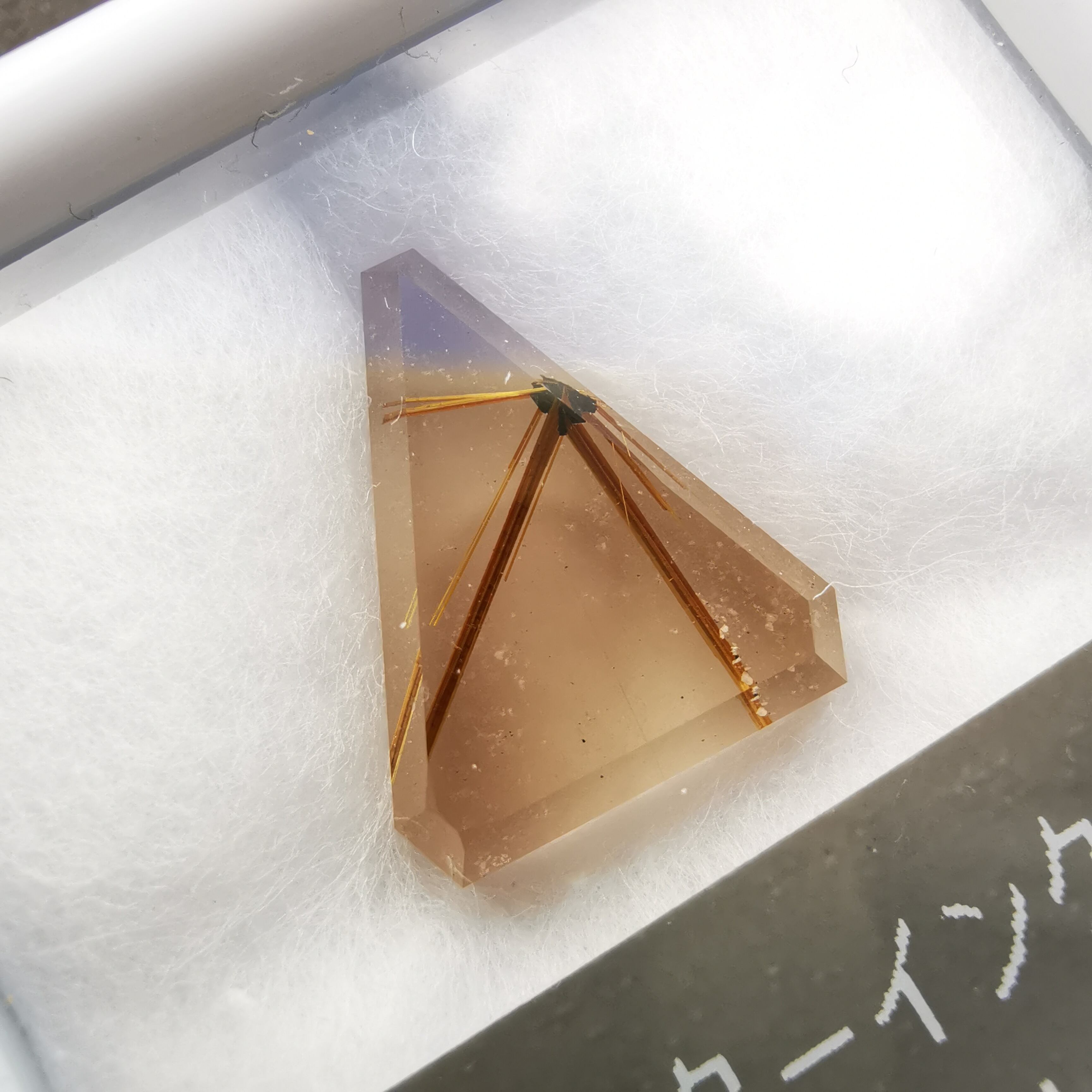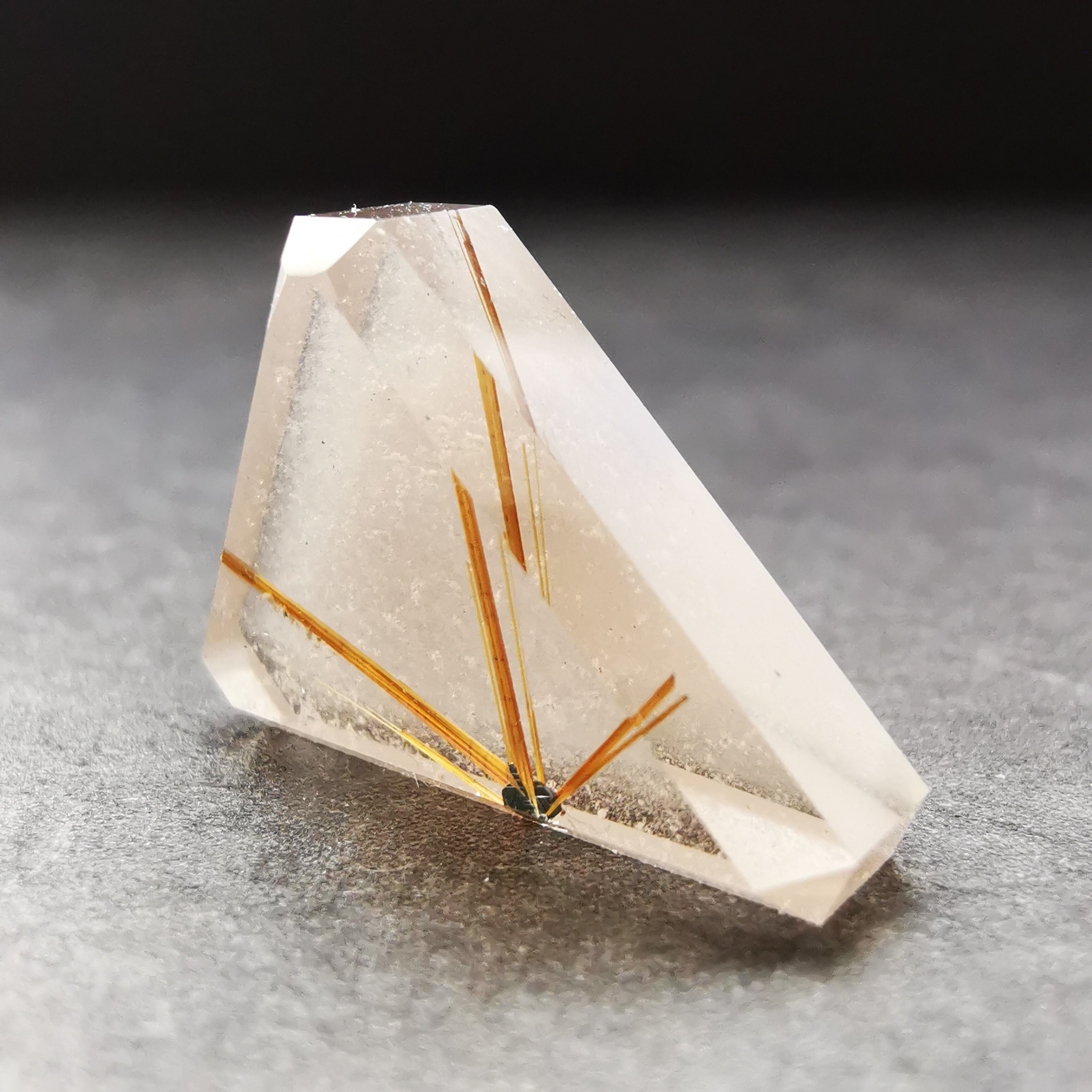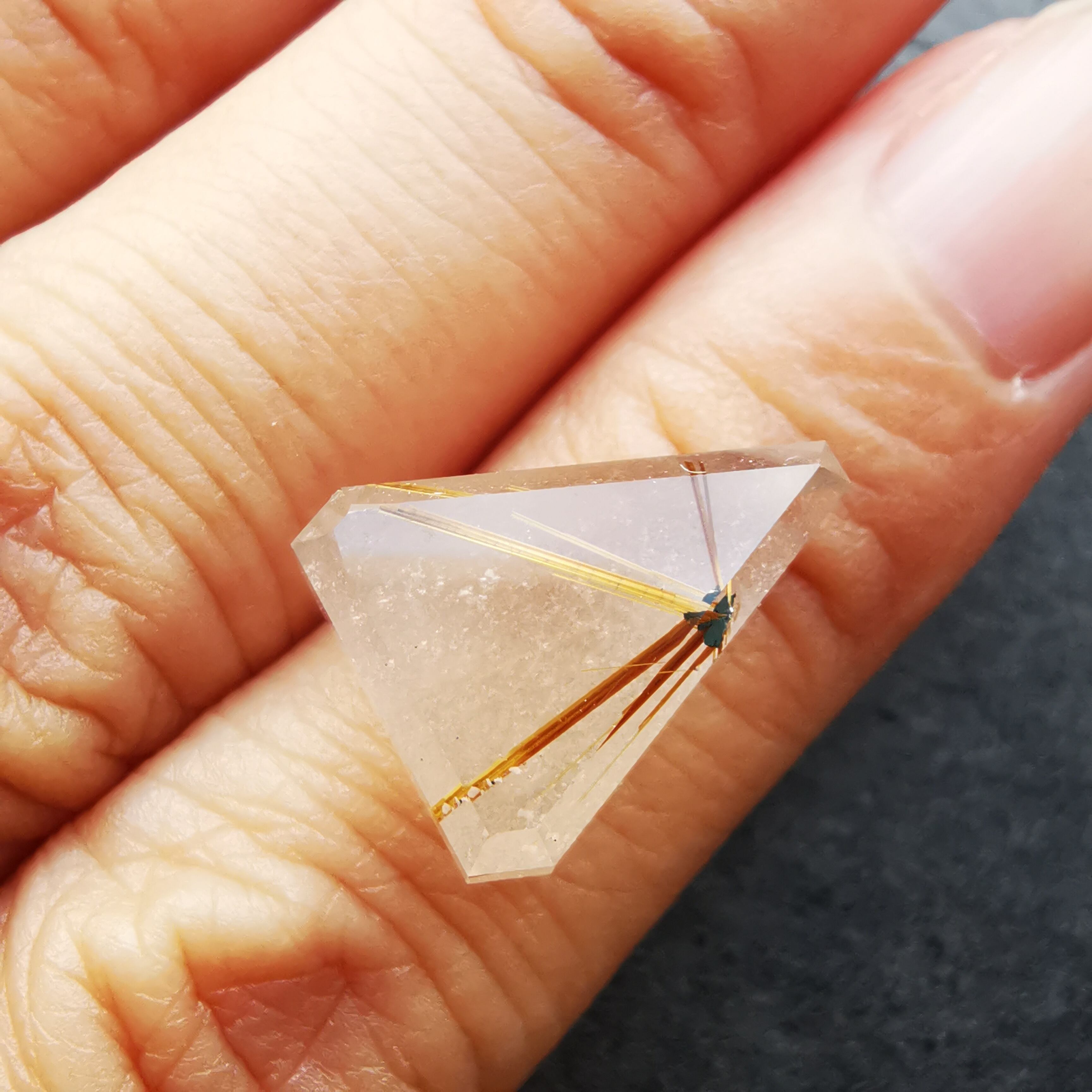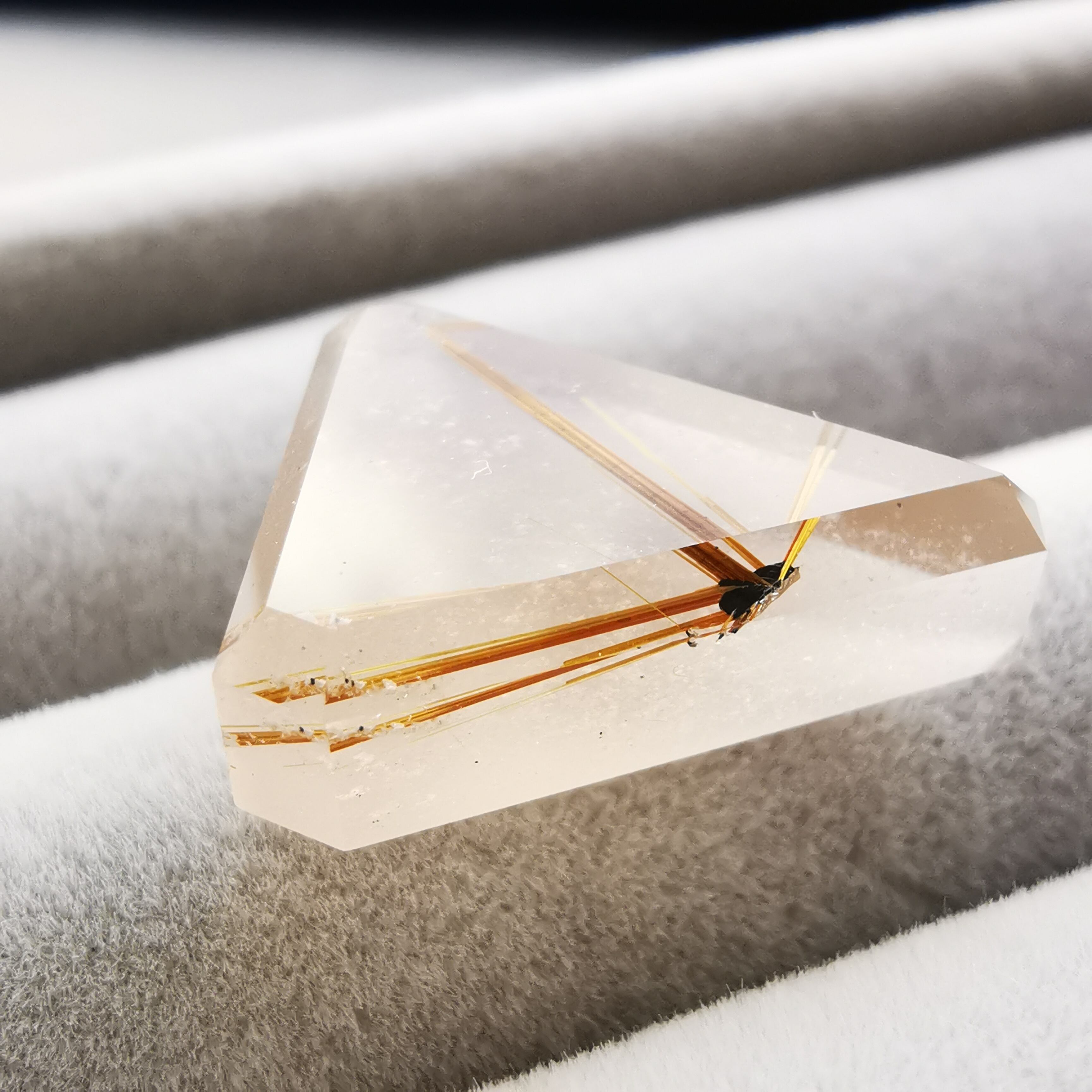 クリアな方に入った黄金のルチルが目立つように、まるで意図したかのようで、自然が産んだ奇跡の偶然に驚かされます。