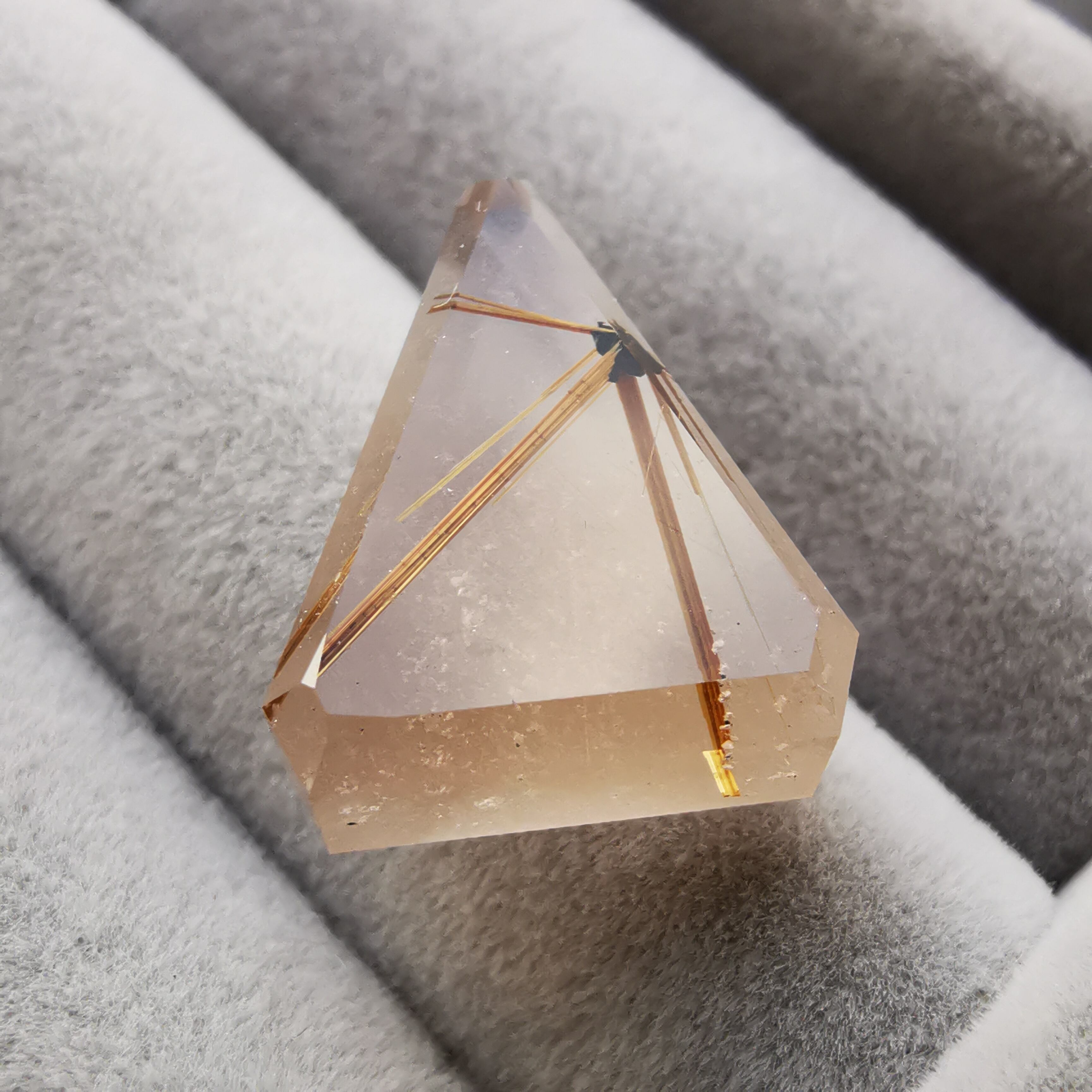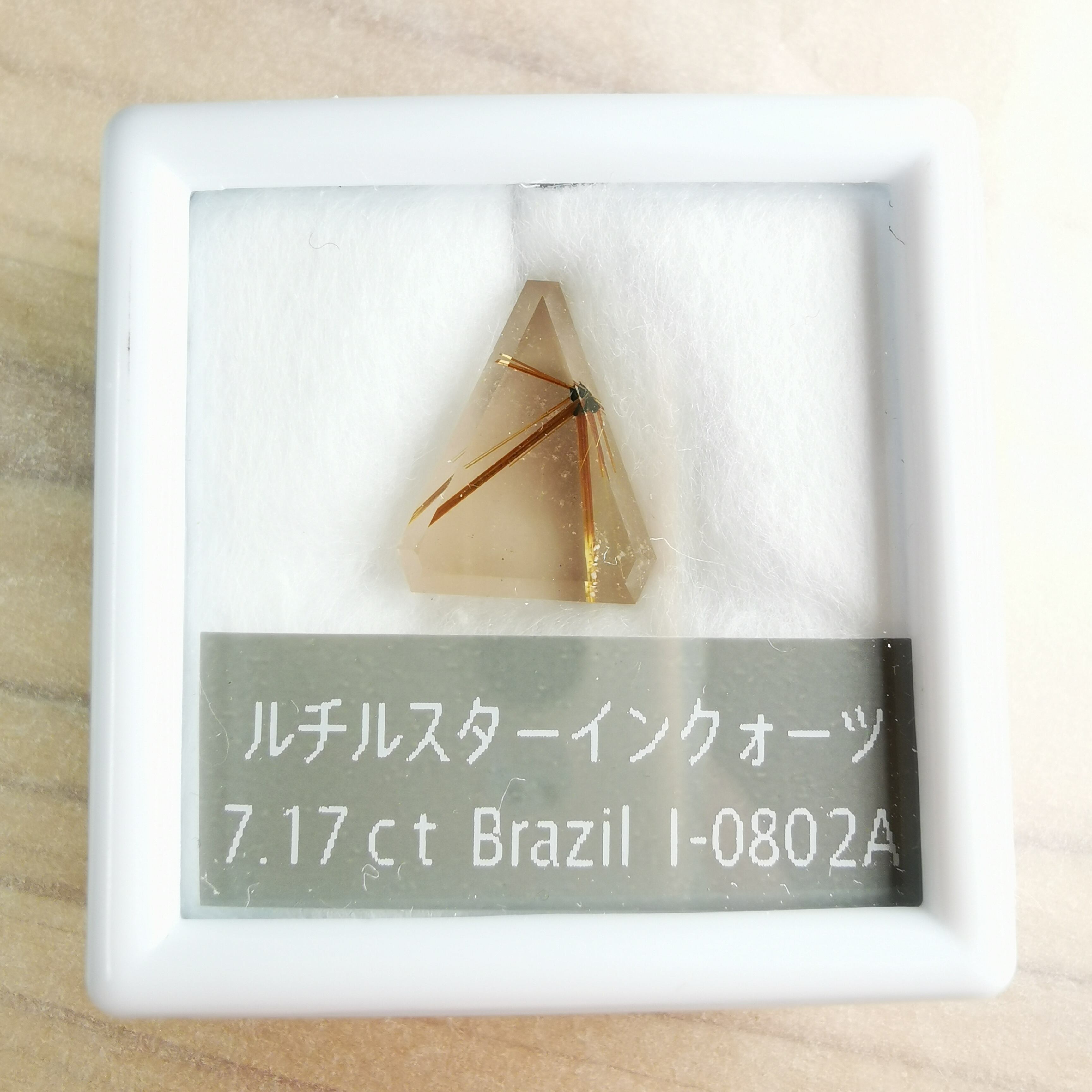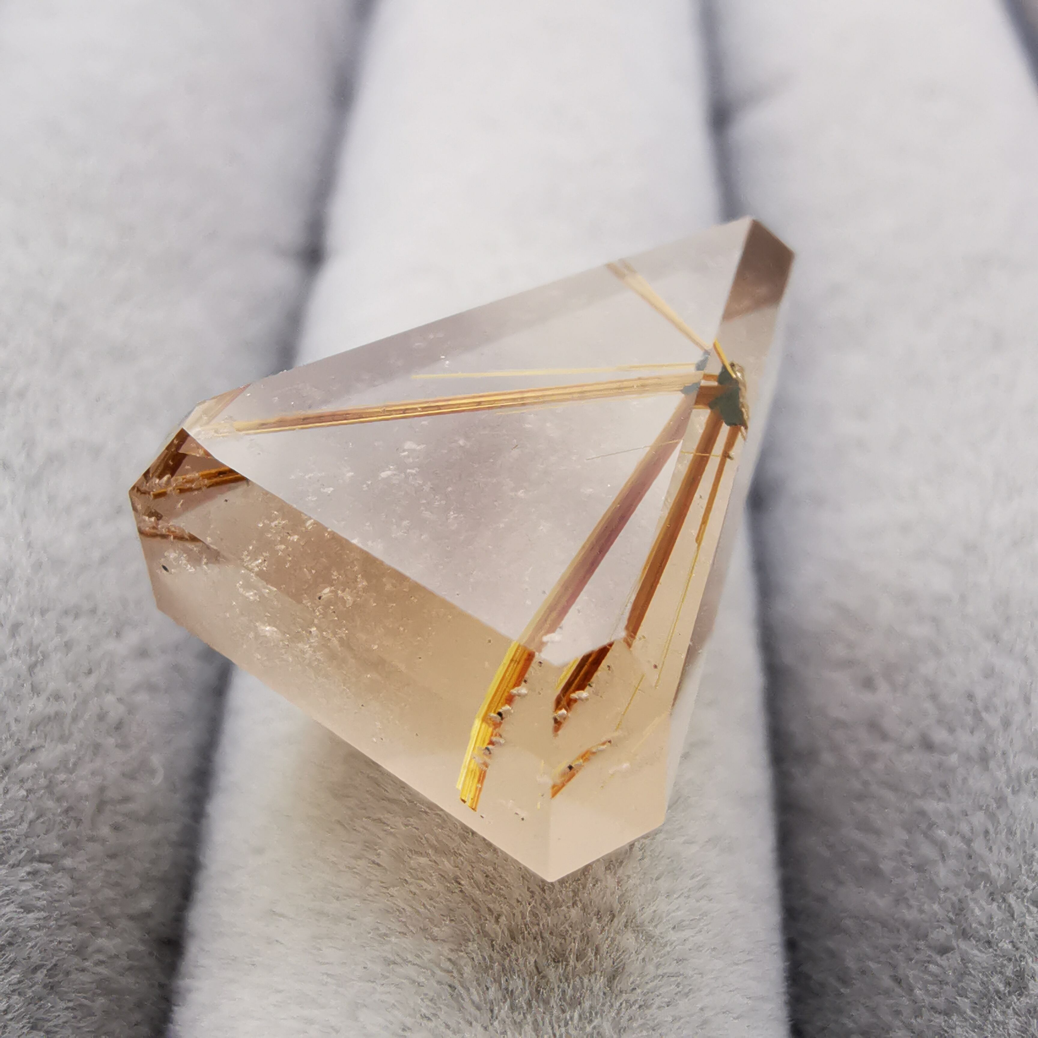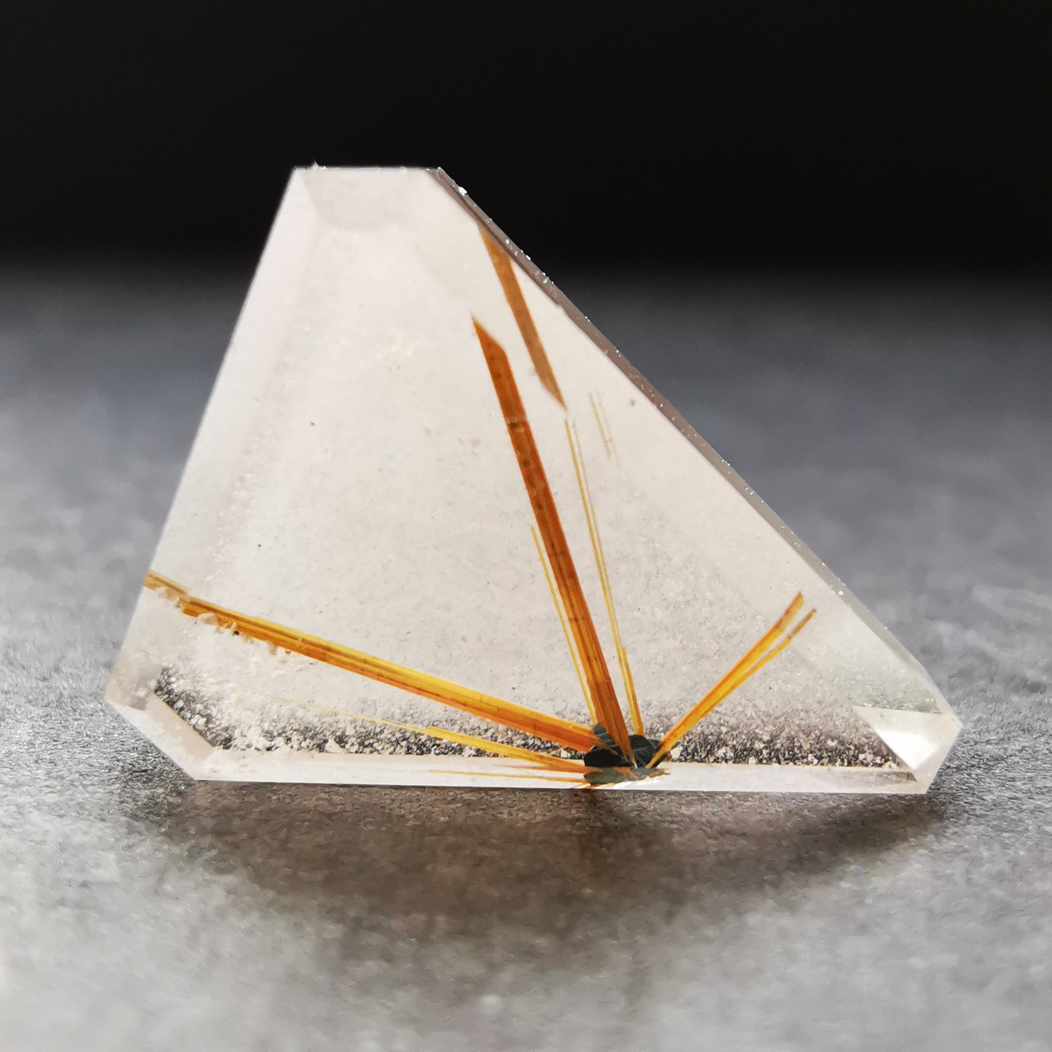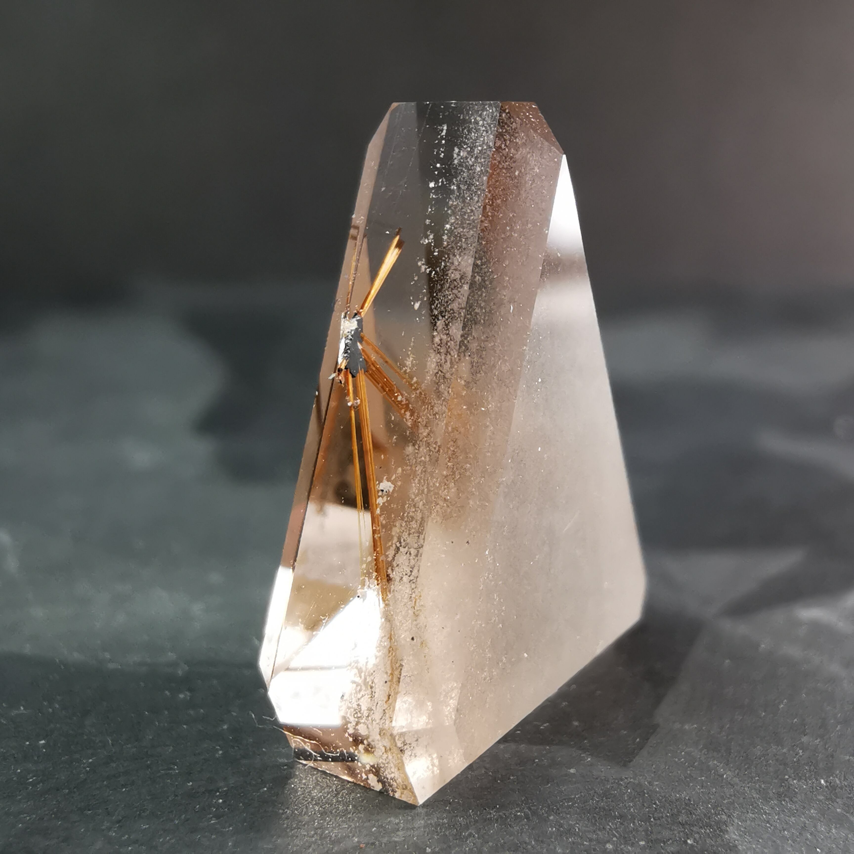 クリアな方に入った黄金のルチルが目立つように、まるで意図したかのようで、自然が産んだ奇跡の偶然に驚かされます。