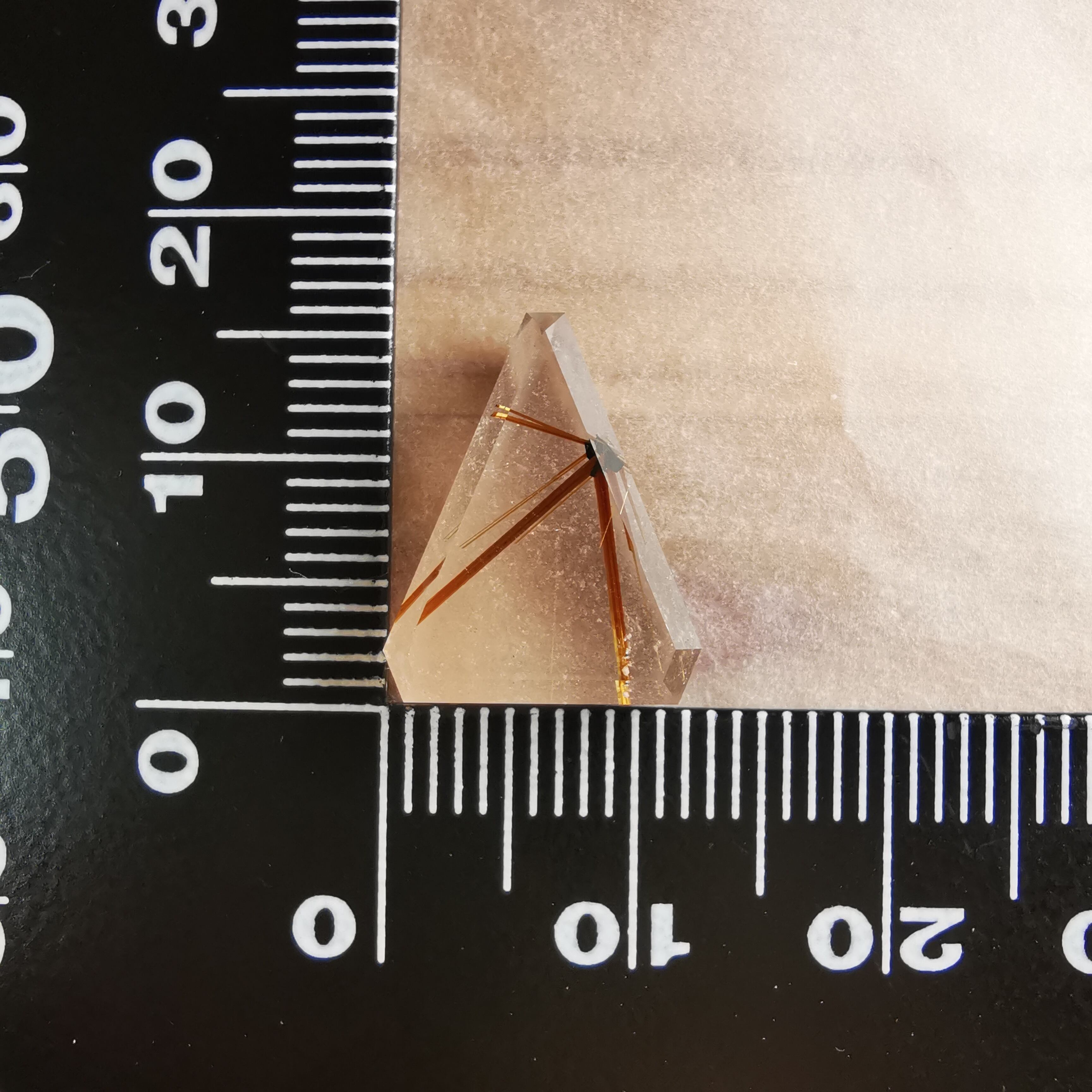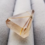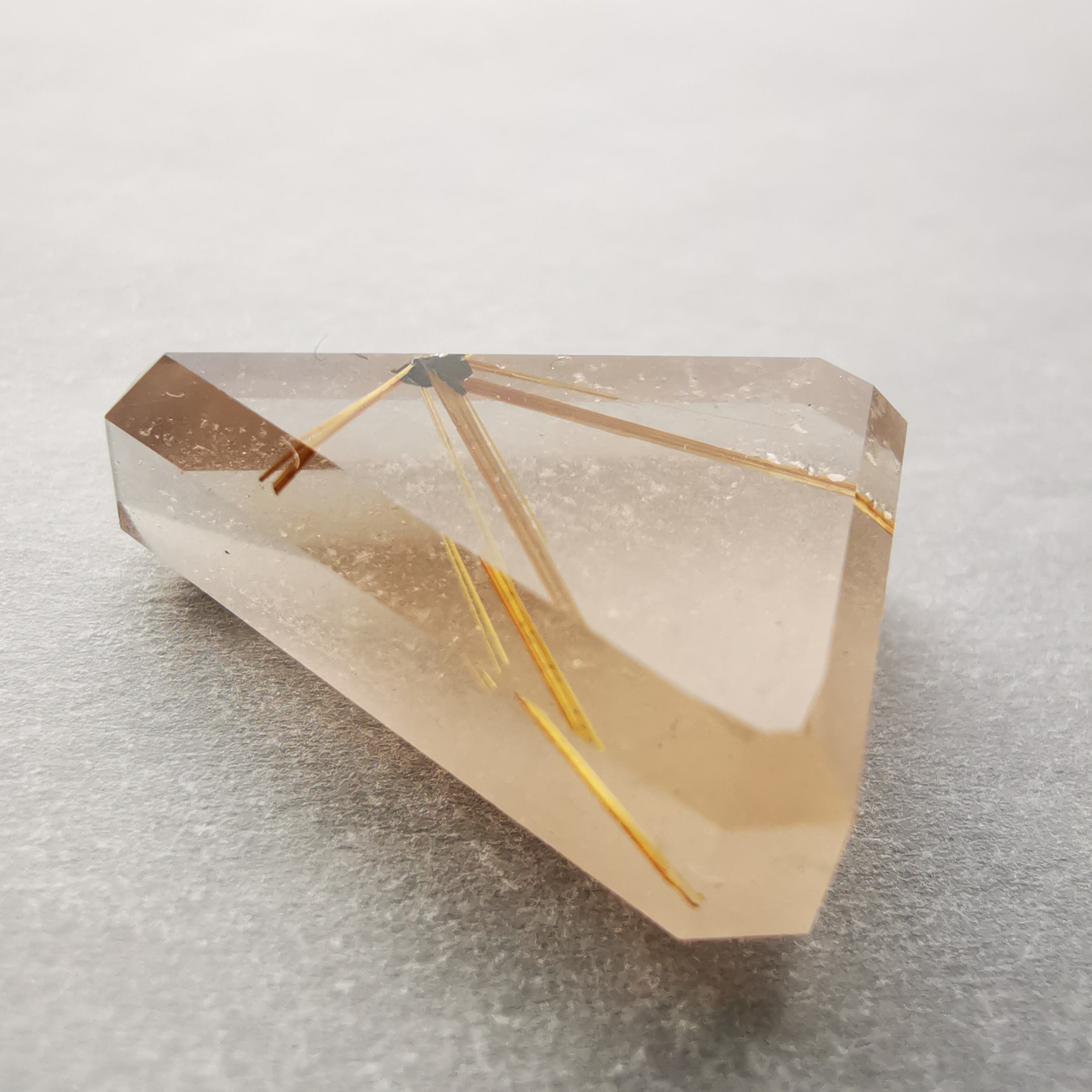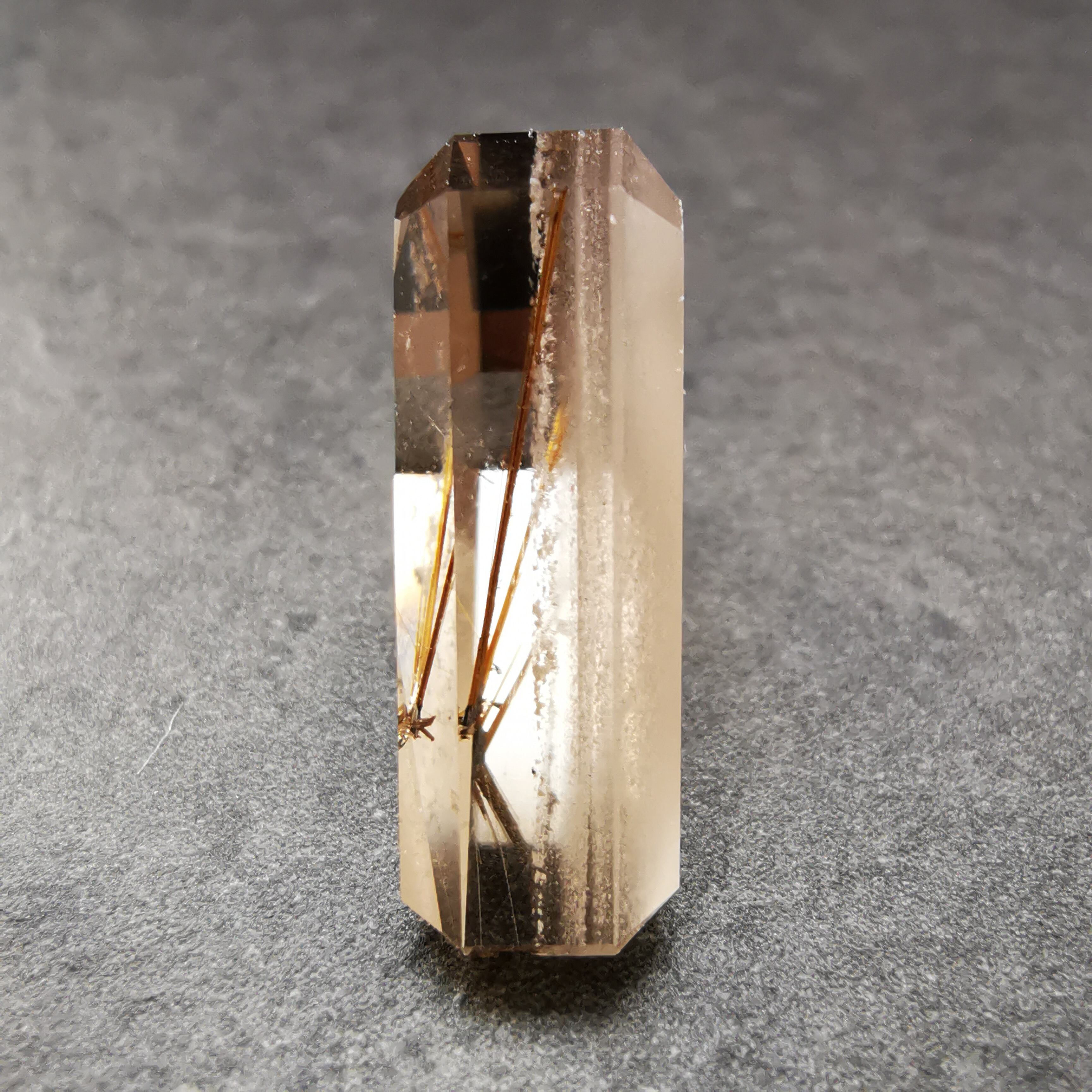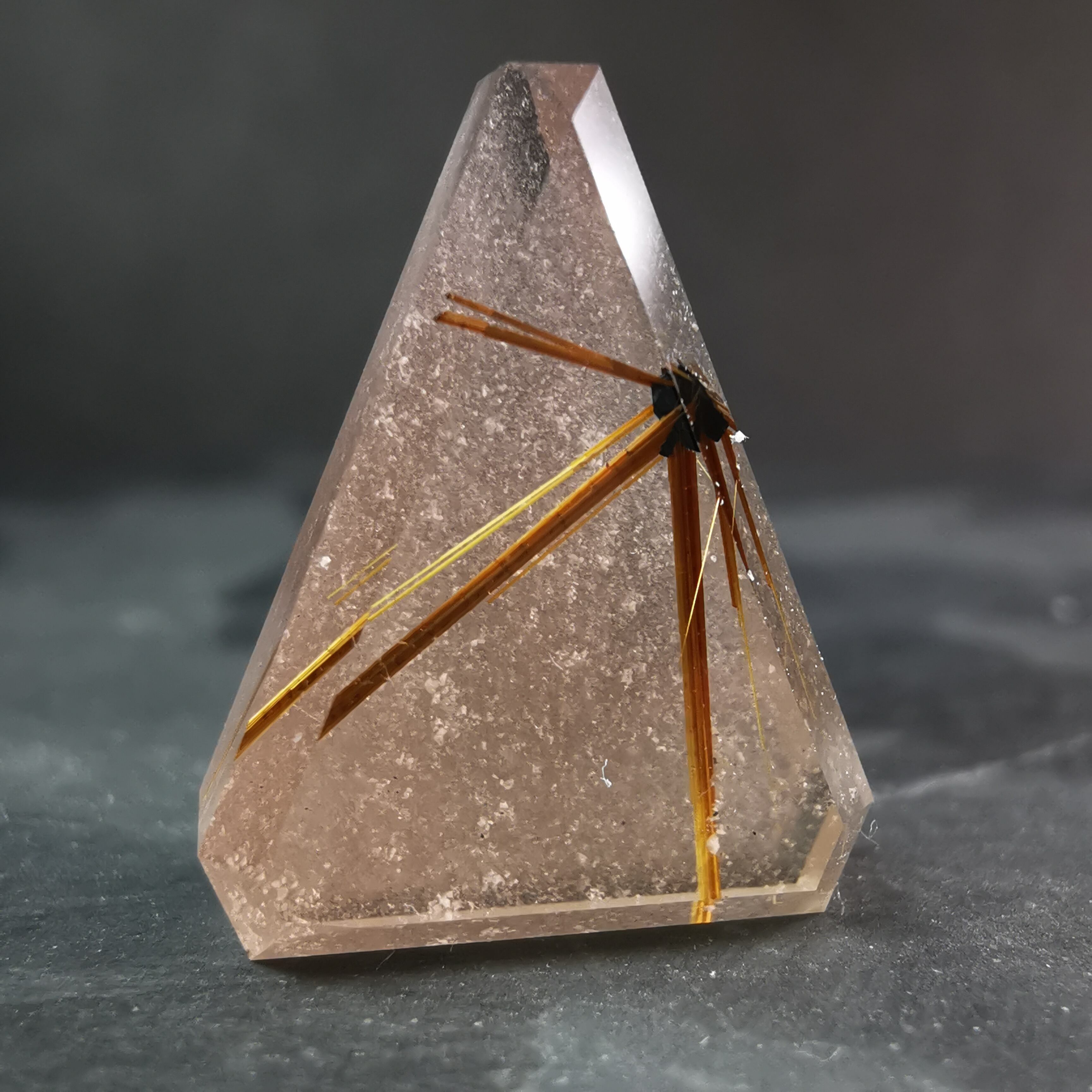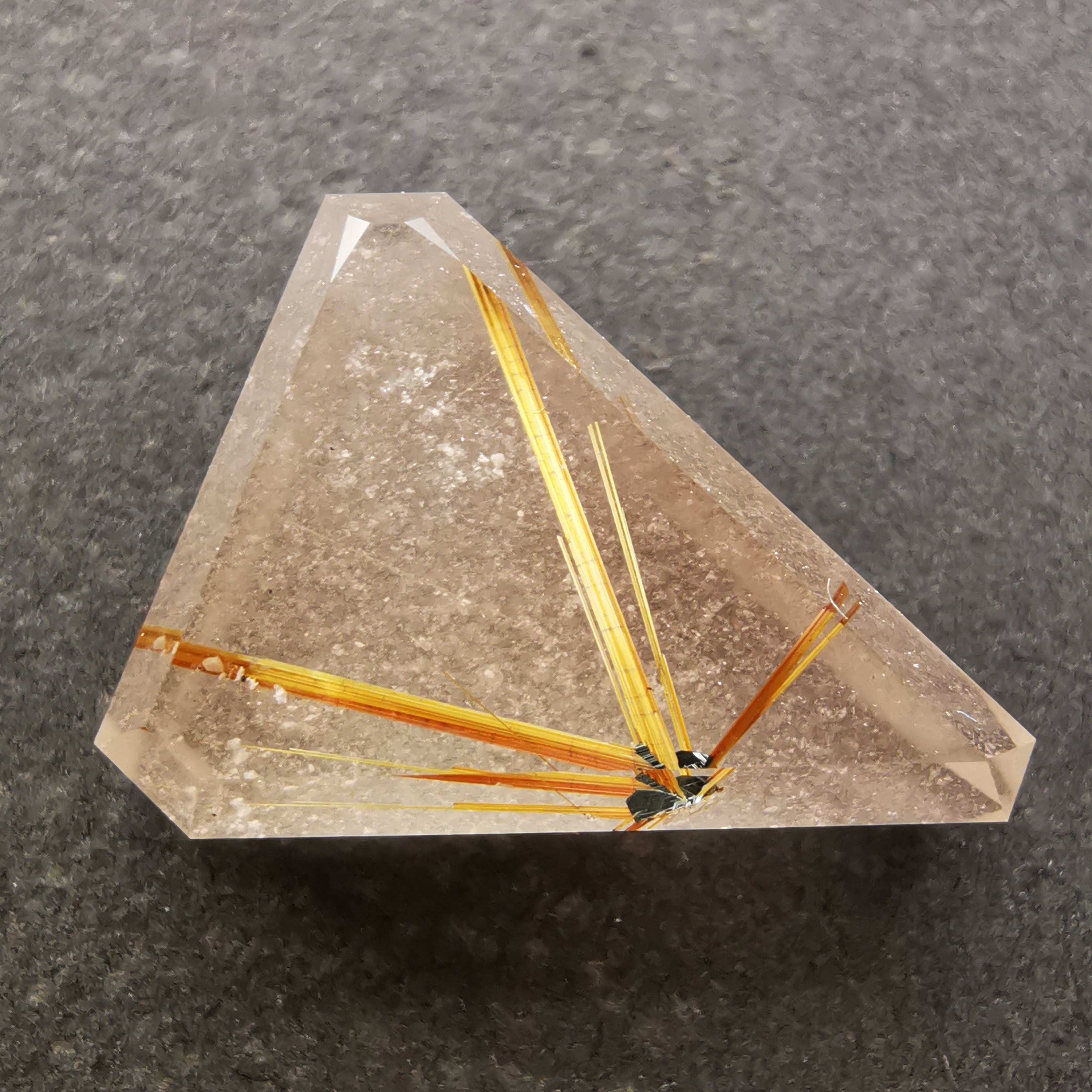 クリアな方に入った黄金のルチルが目立つように、まるで意図したかのようで、自然が産んだ奇跡の偶然に驚かされます。