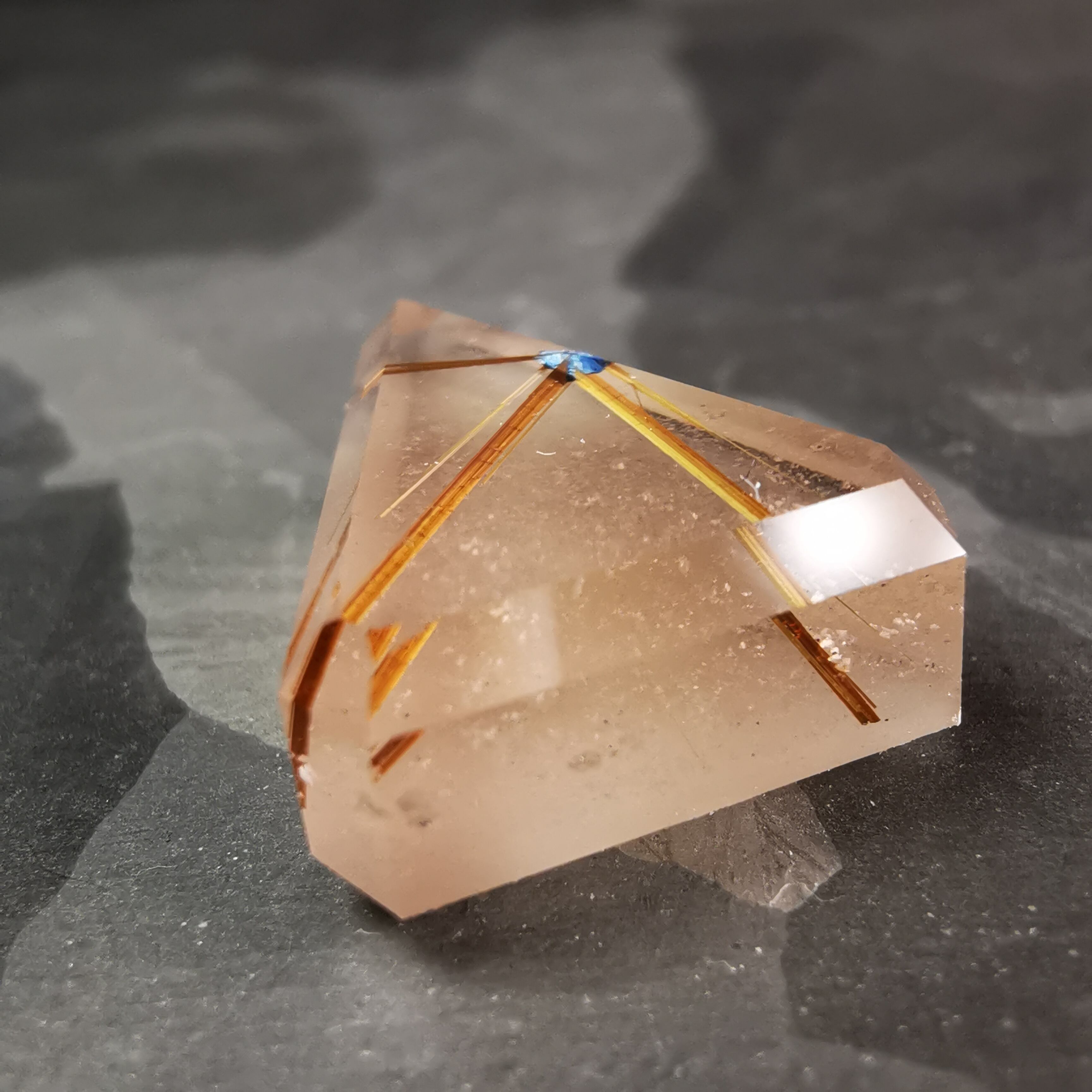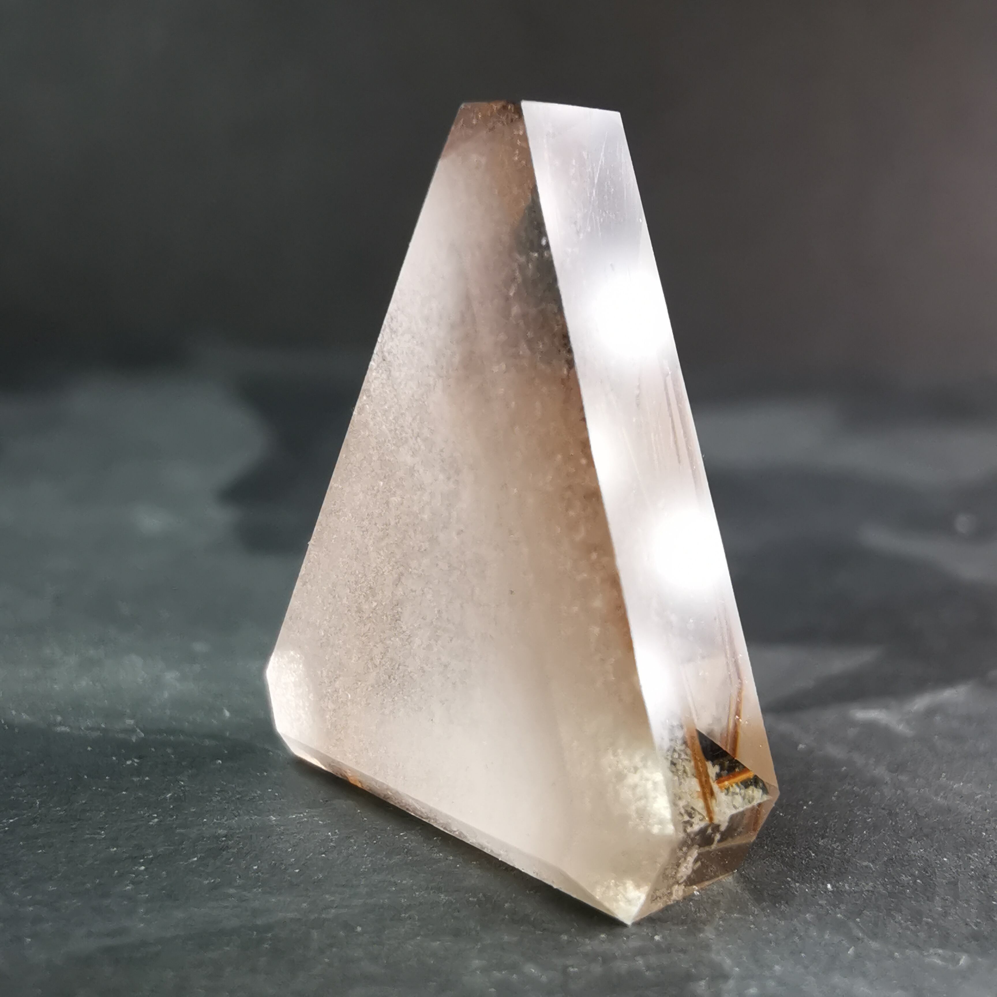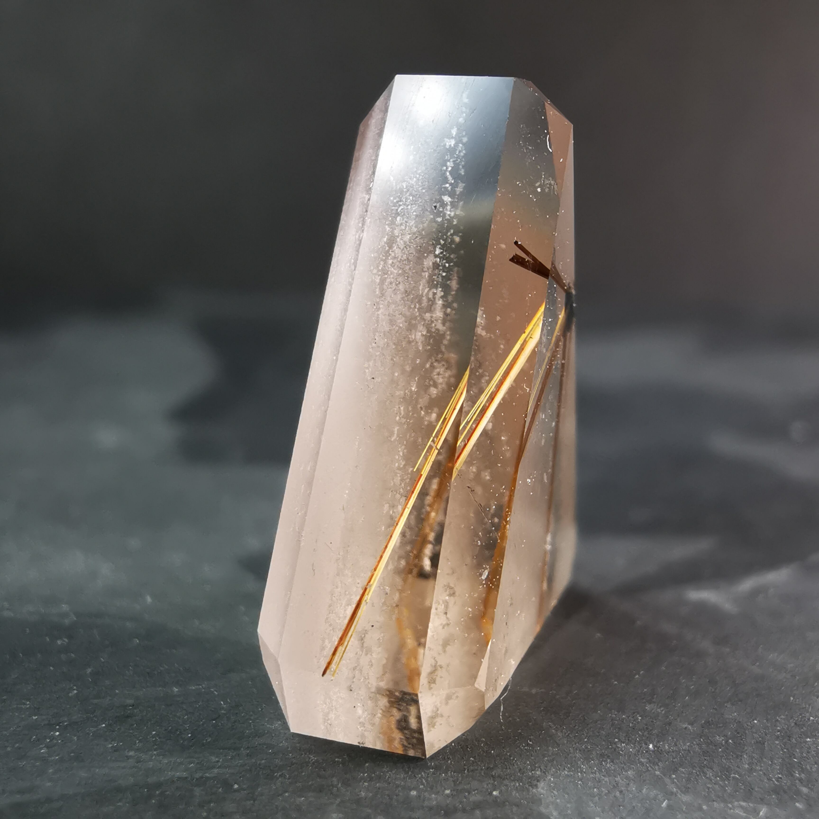 生成色と透明が層になったクォーツに、黒光りするヘマタイトと、金色のルチルの束が入りました。