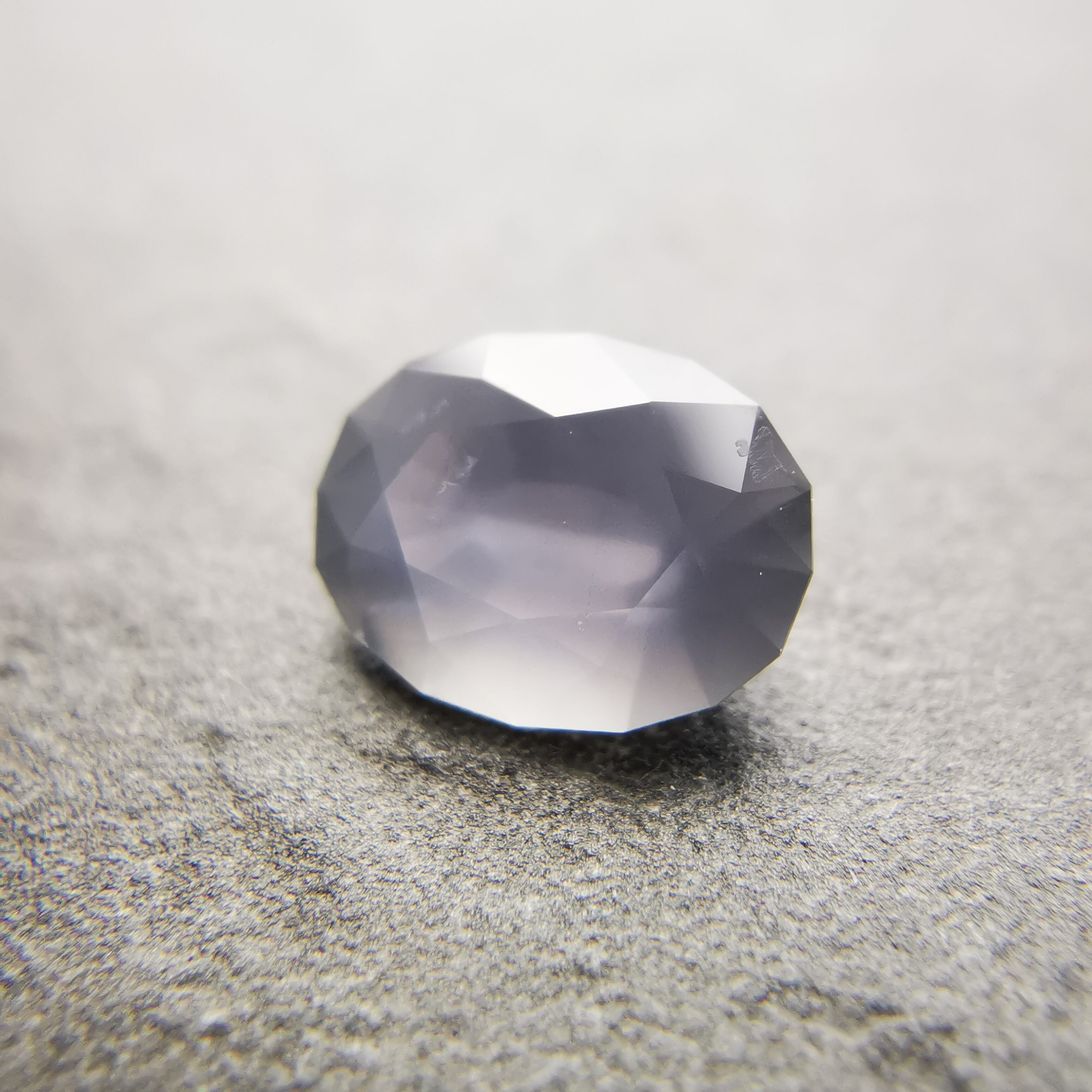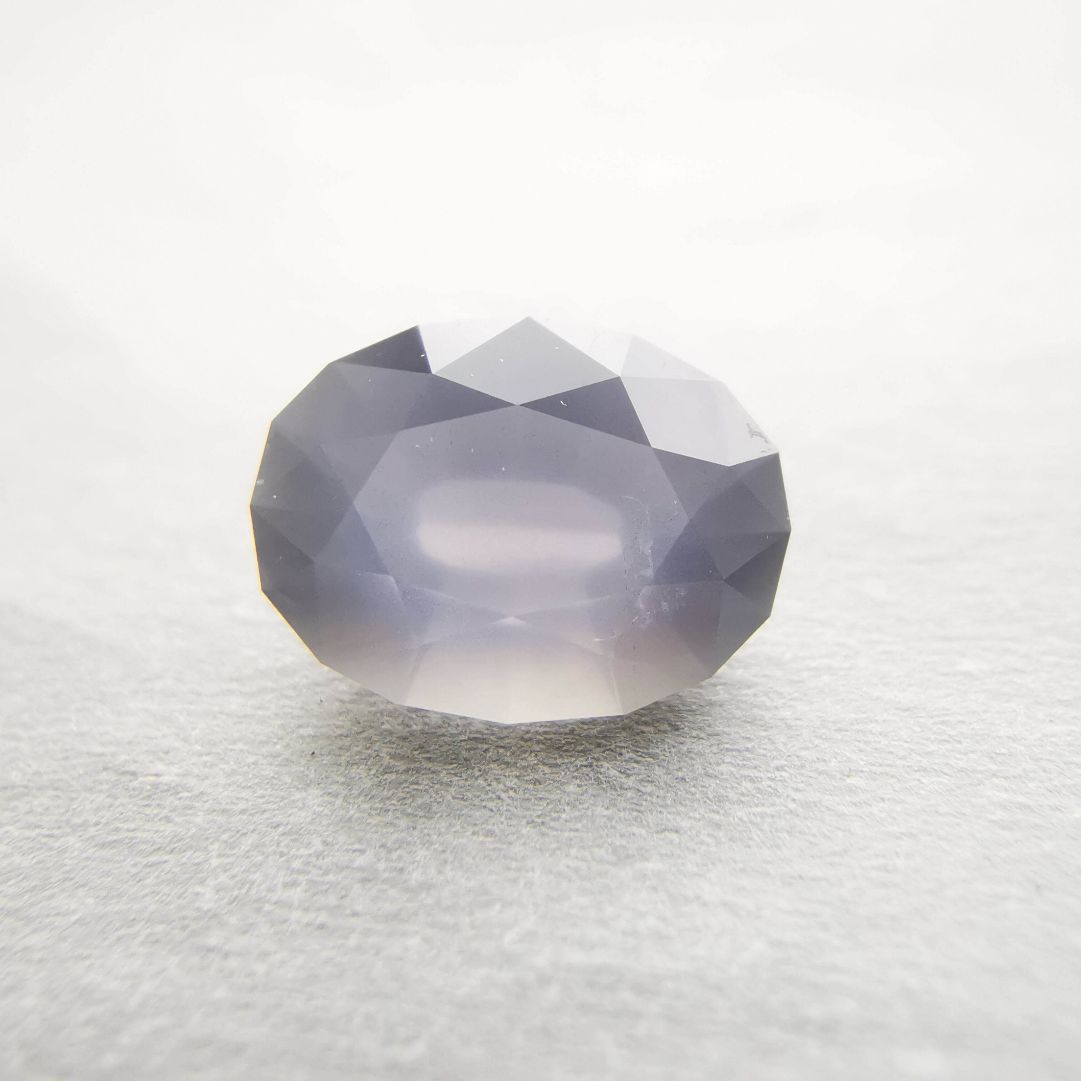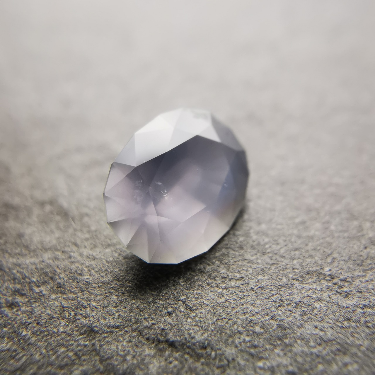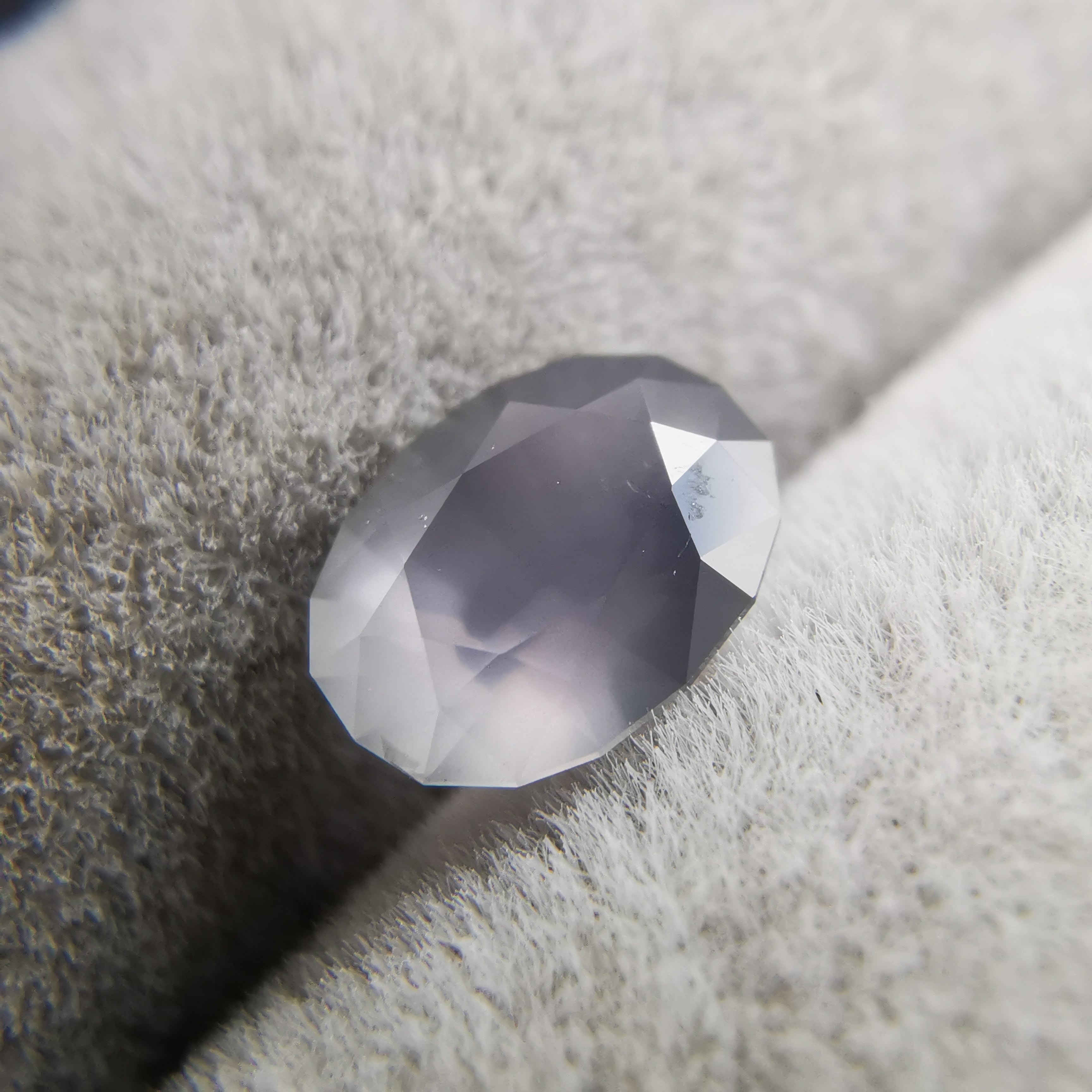 宝石のグレーには大きく2種類、黒を薄めたグレーと、黒と白を混ぜたグレーがありますが、こちらは後者のグレー、ややパープルピンクみのある銀鼠色のサファイアです。