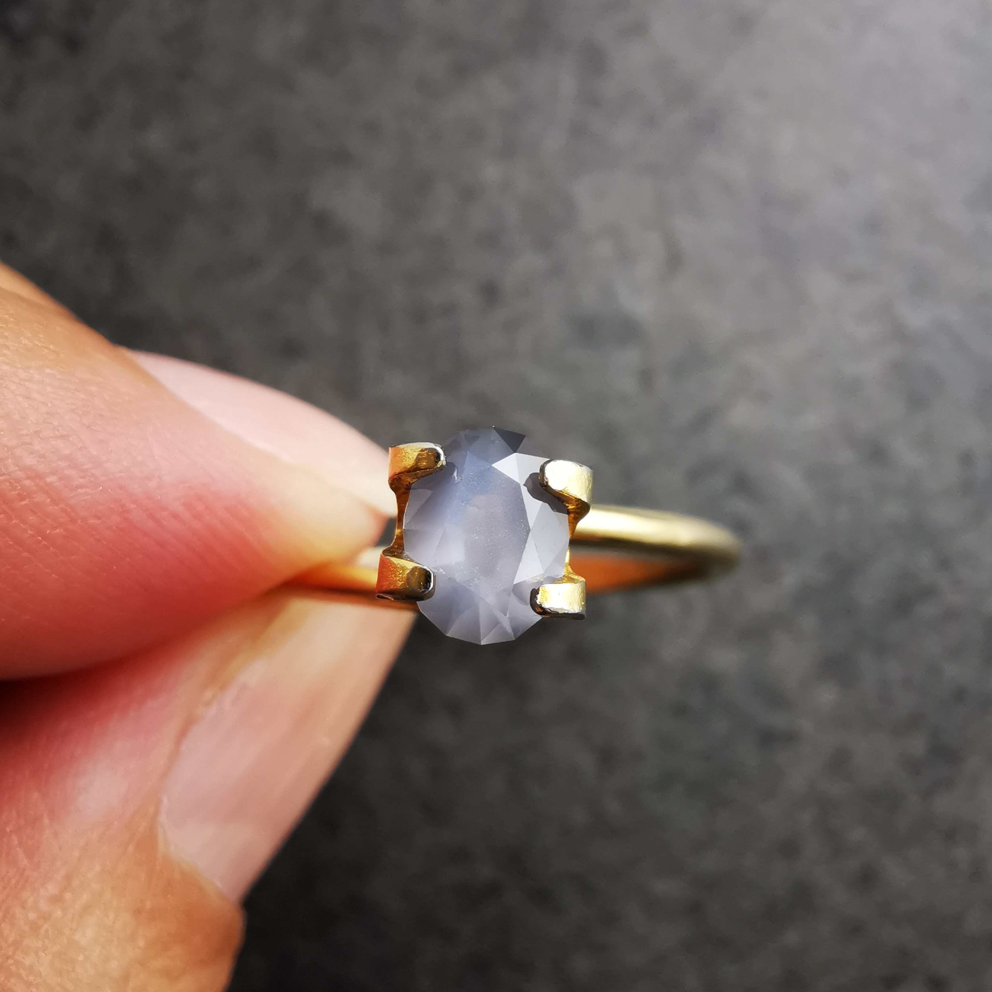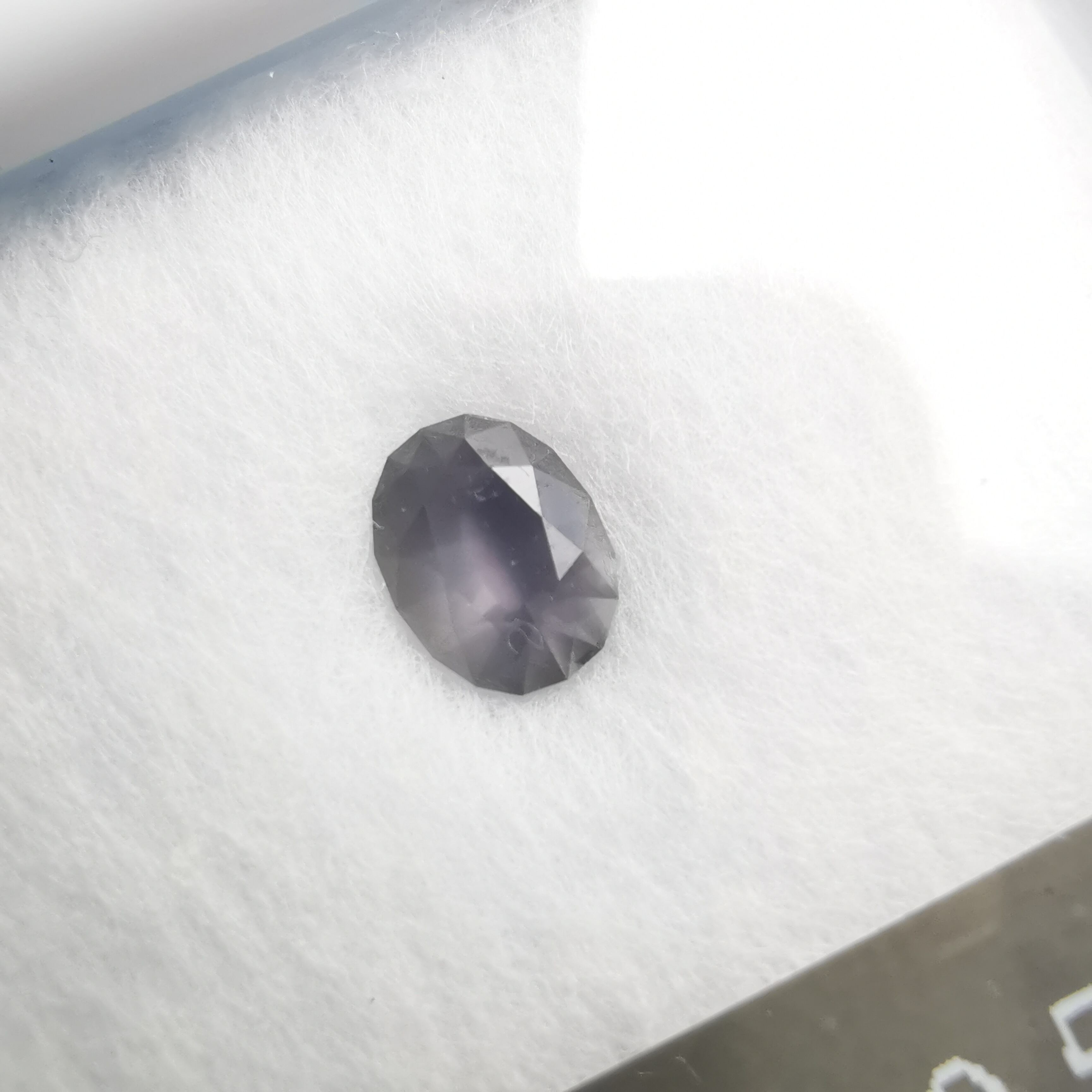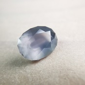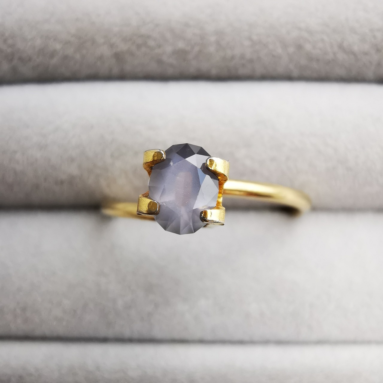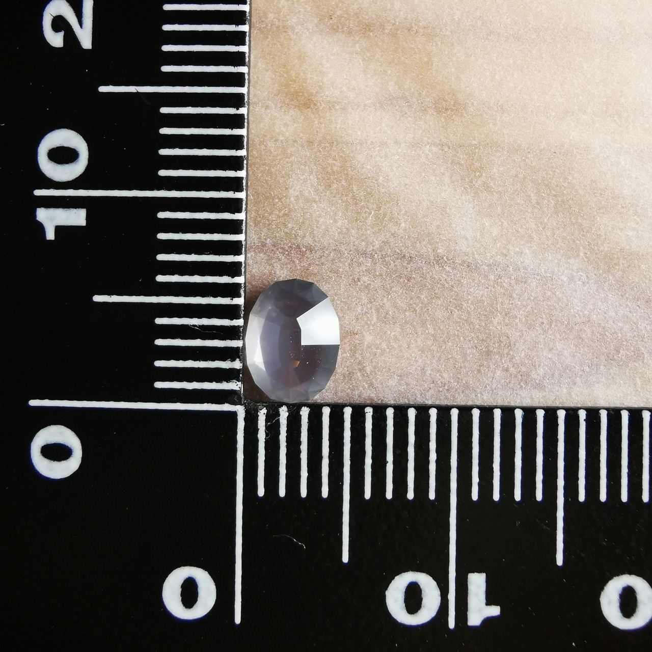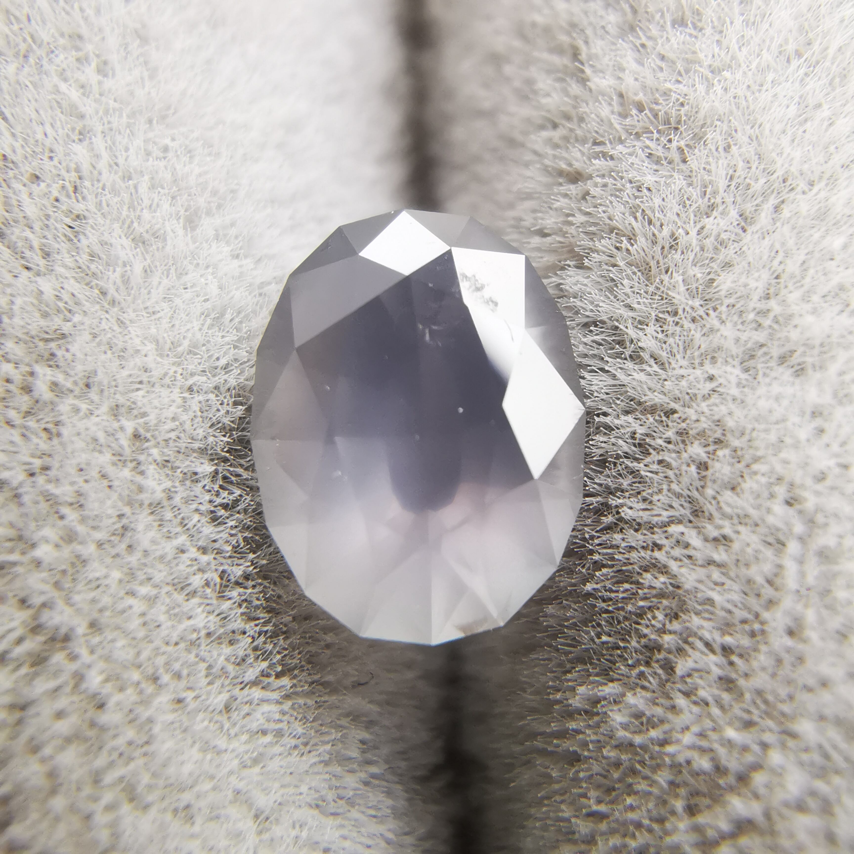 宝石のグレーには大きく2種類、黒を薄めたグレーと、黒と白を混ぜたグレーがありますが、こちらは後者のグレー、ややパープルピンクみのある銀鼠色のサファイアです。