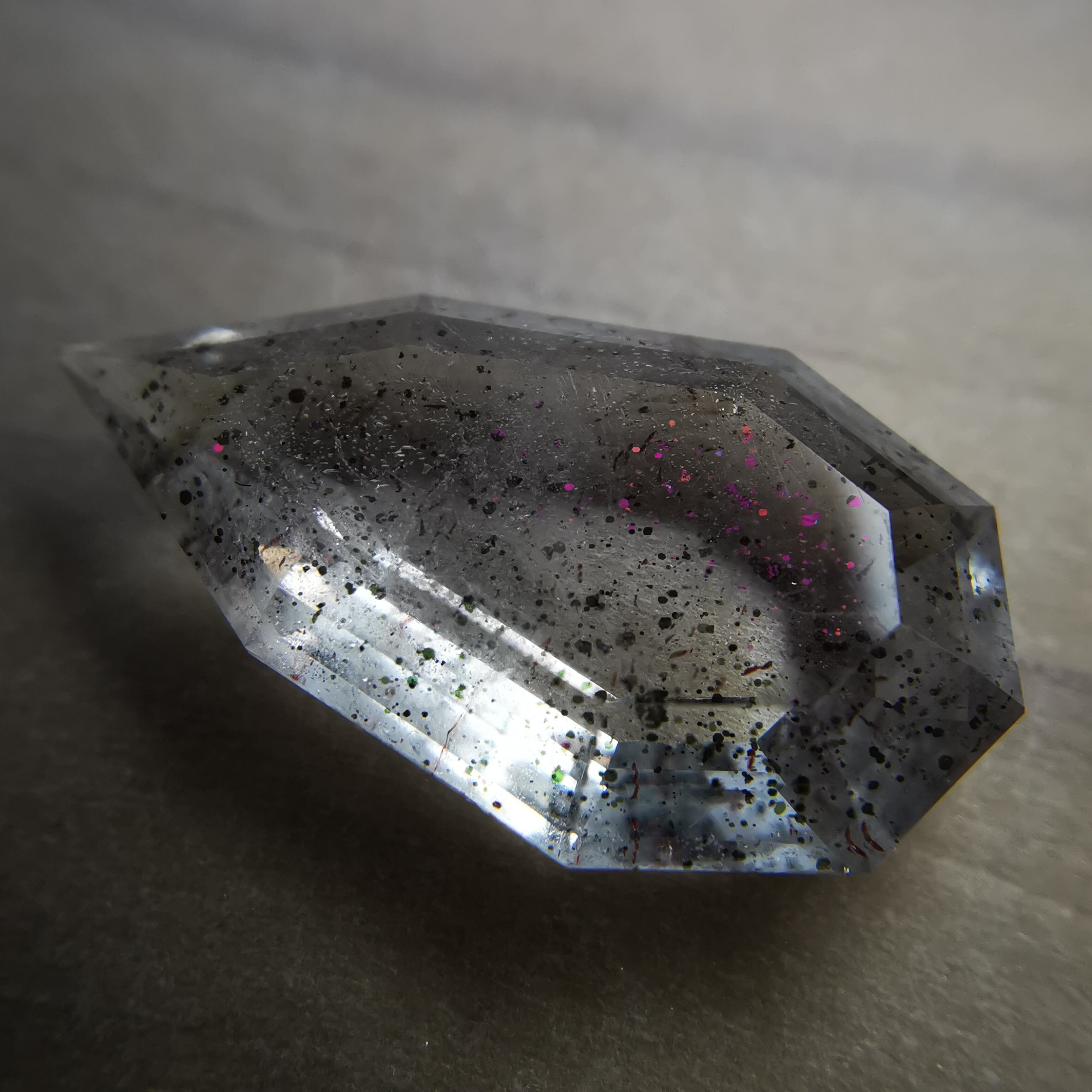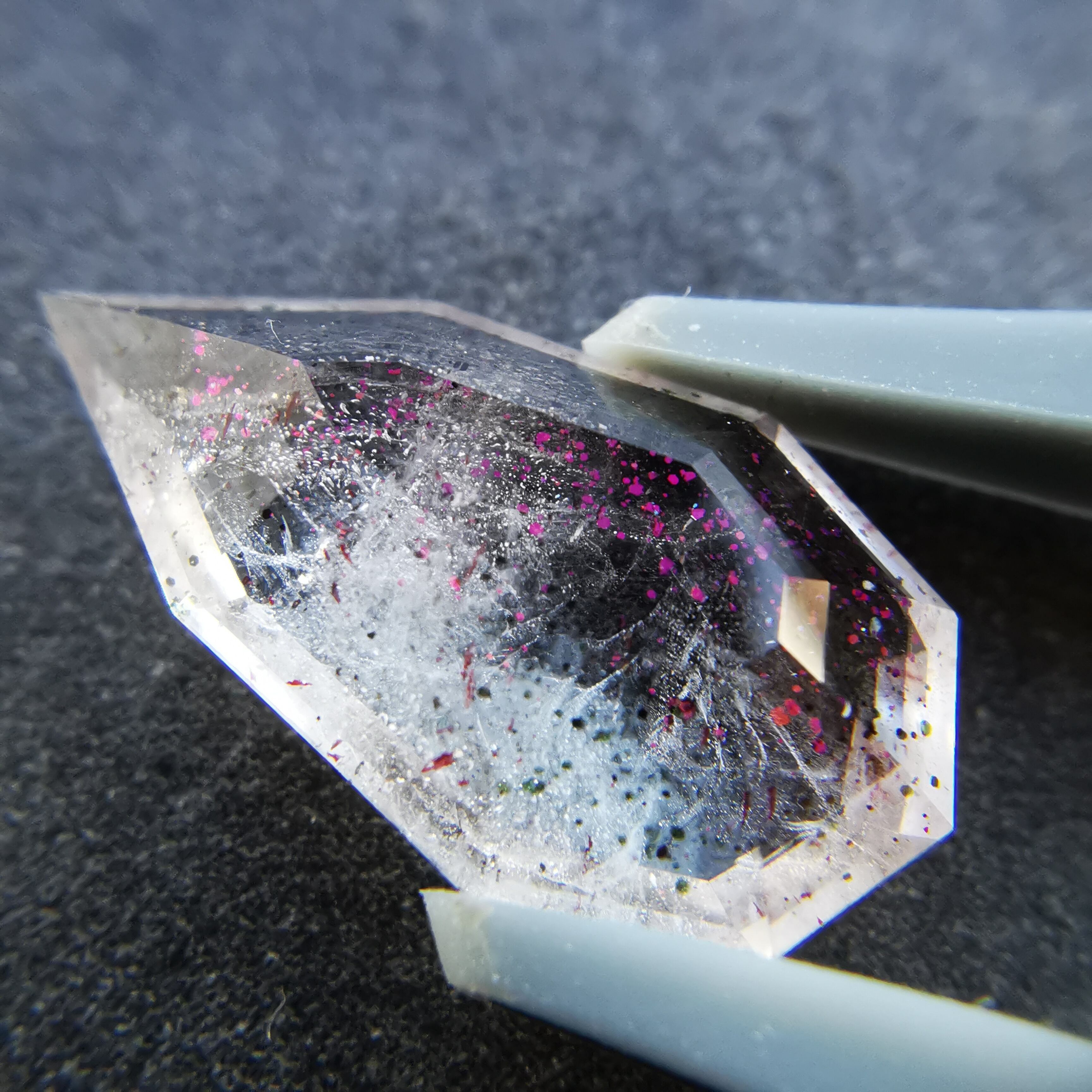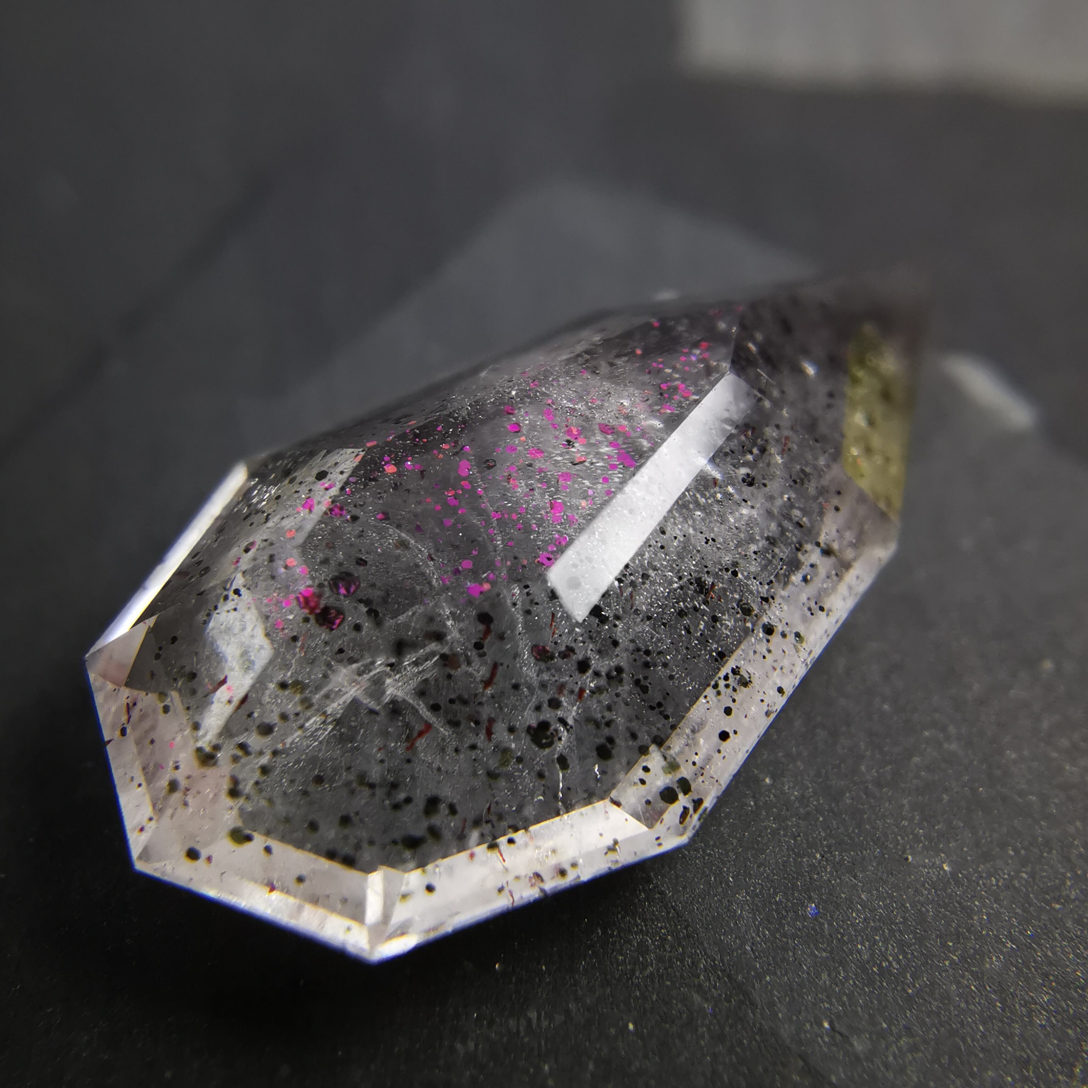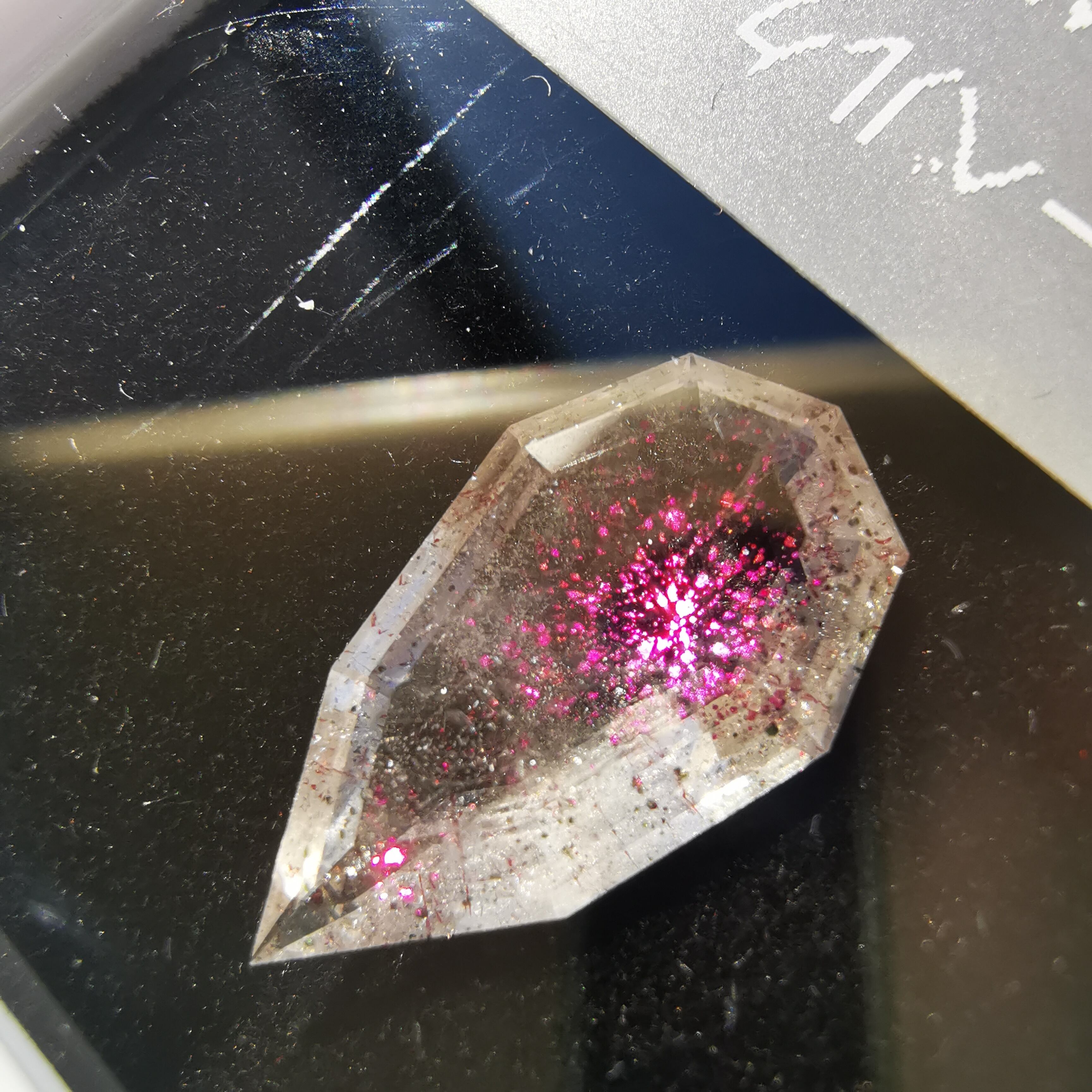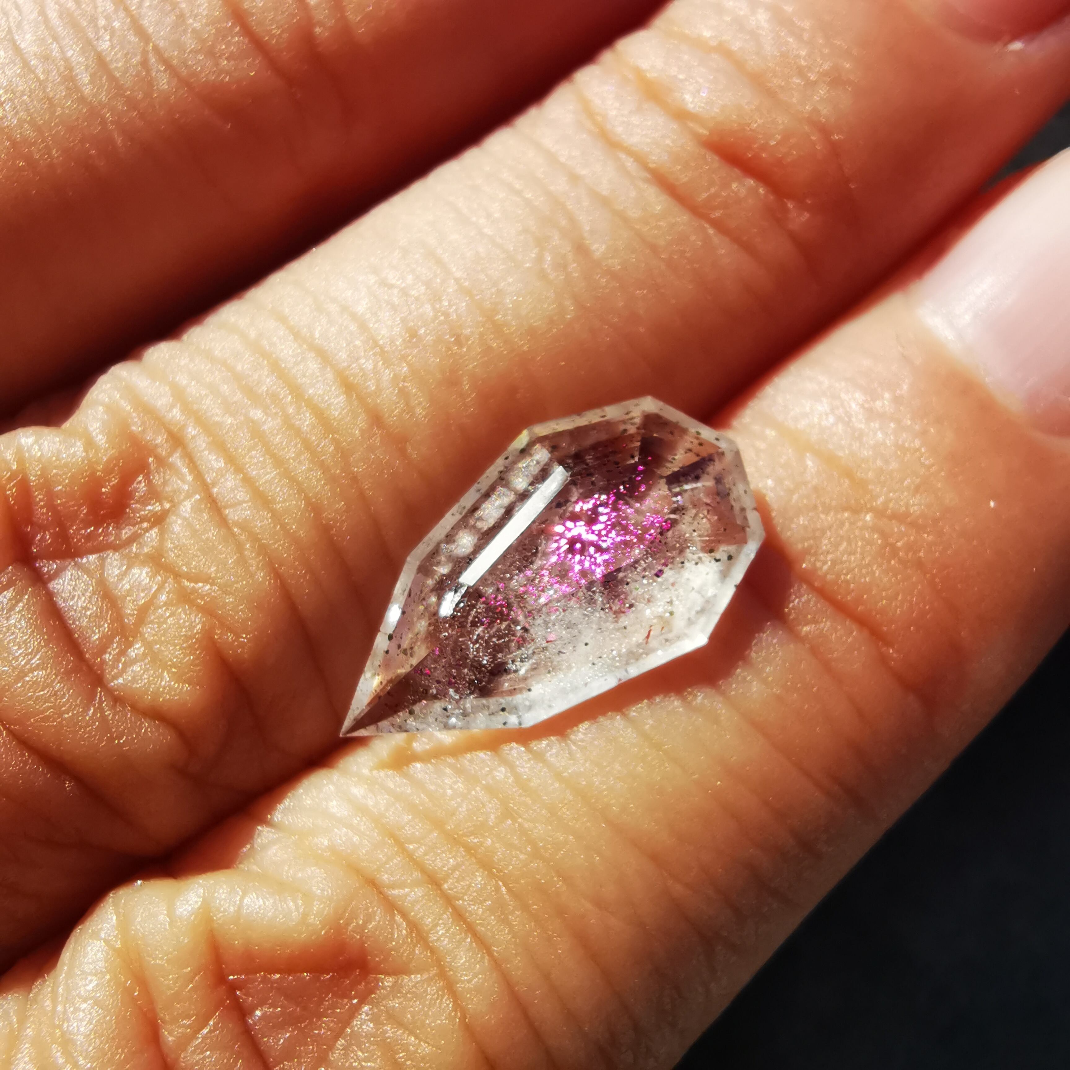 ショッキングピンクのラメ/コべライトが、まるでティンカーベルが振りまく魔法の粉のようなので、ティンカーベルクォーツと呼ばれています。