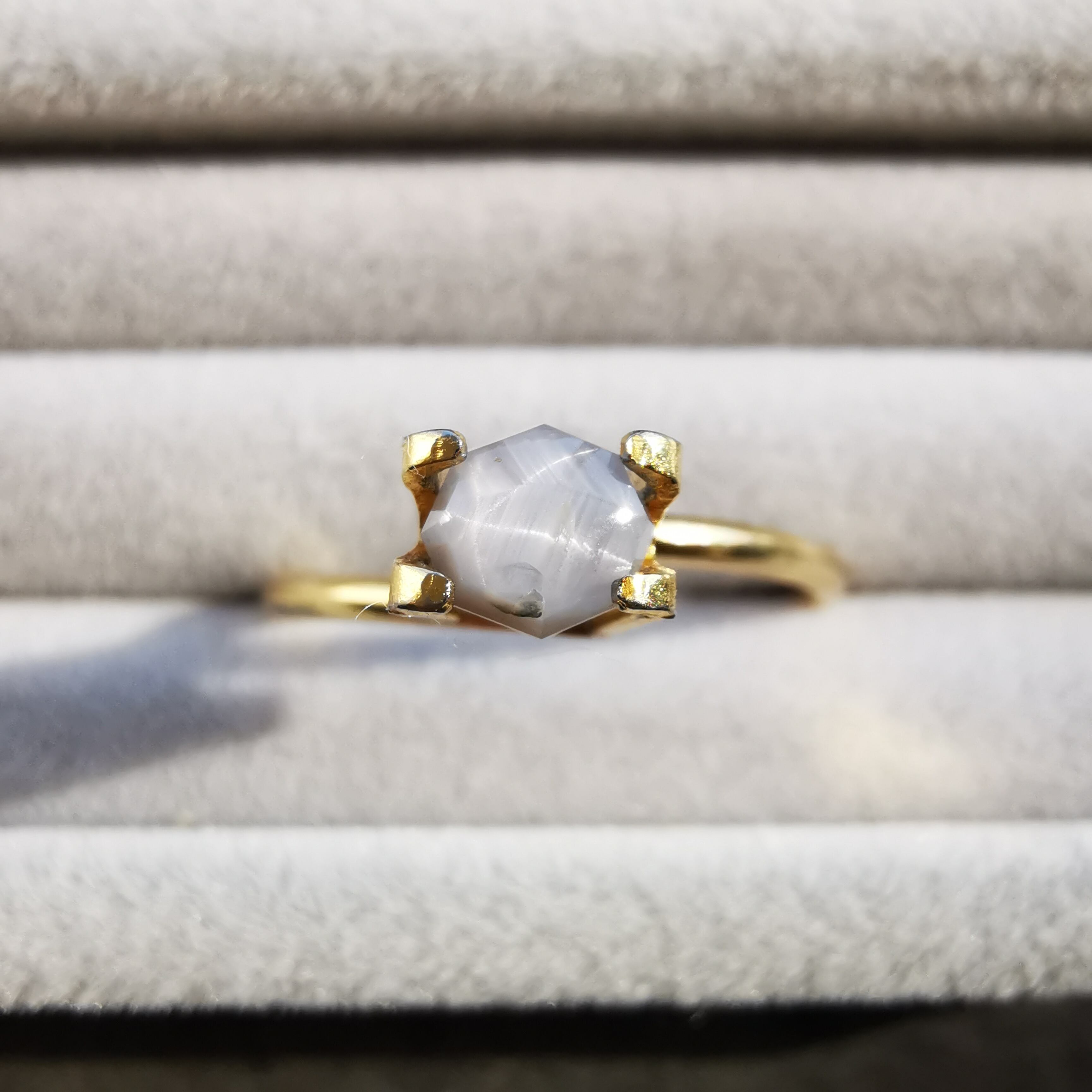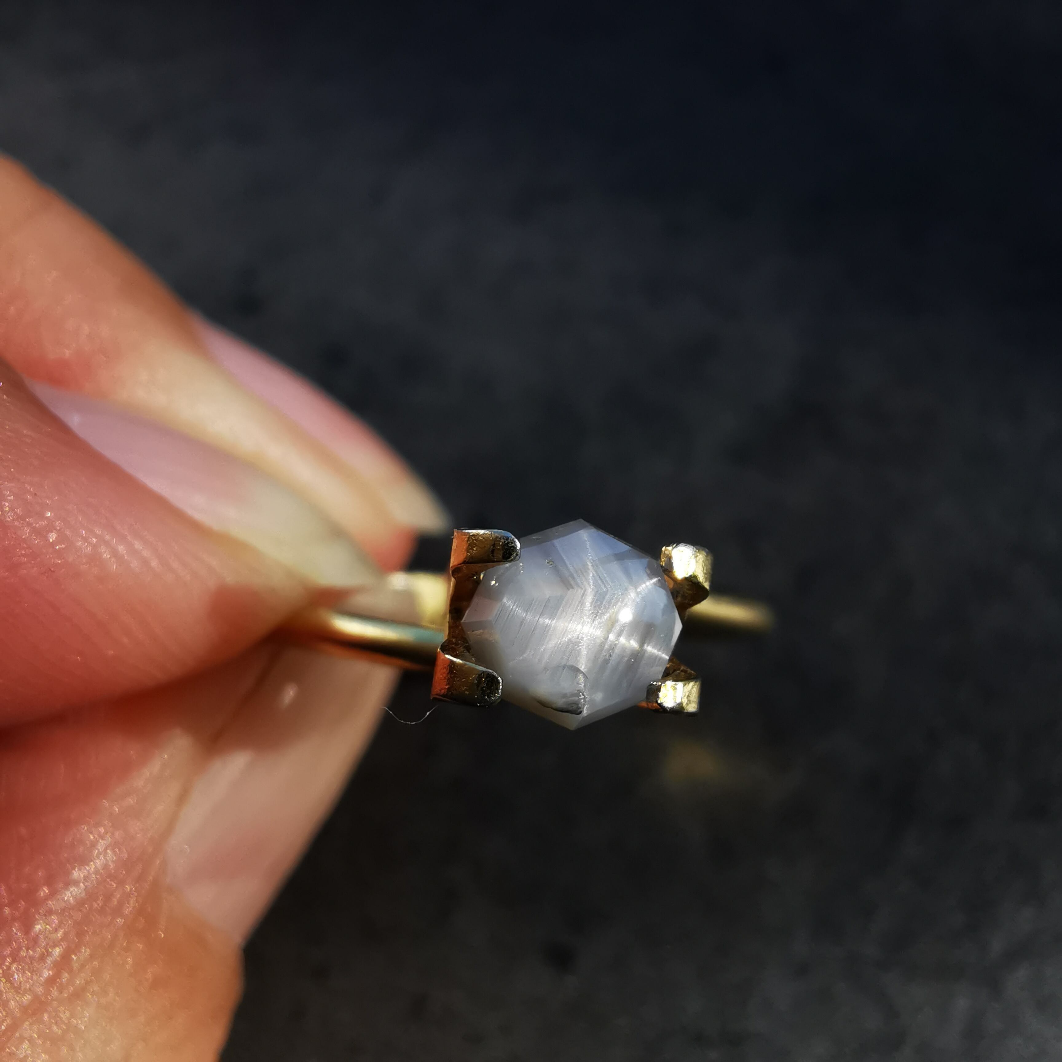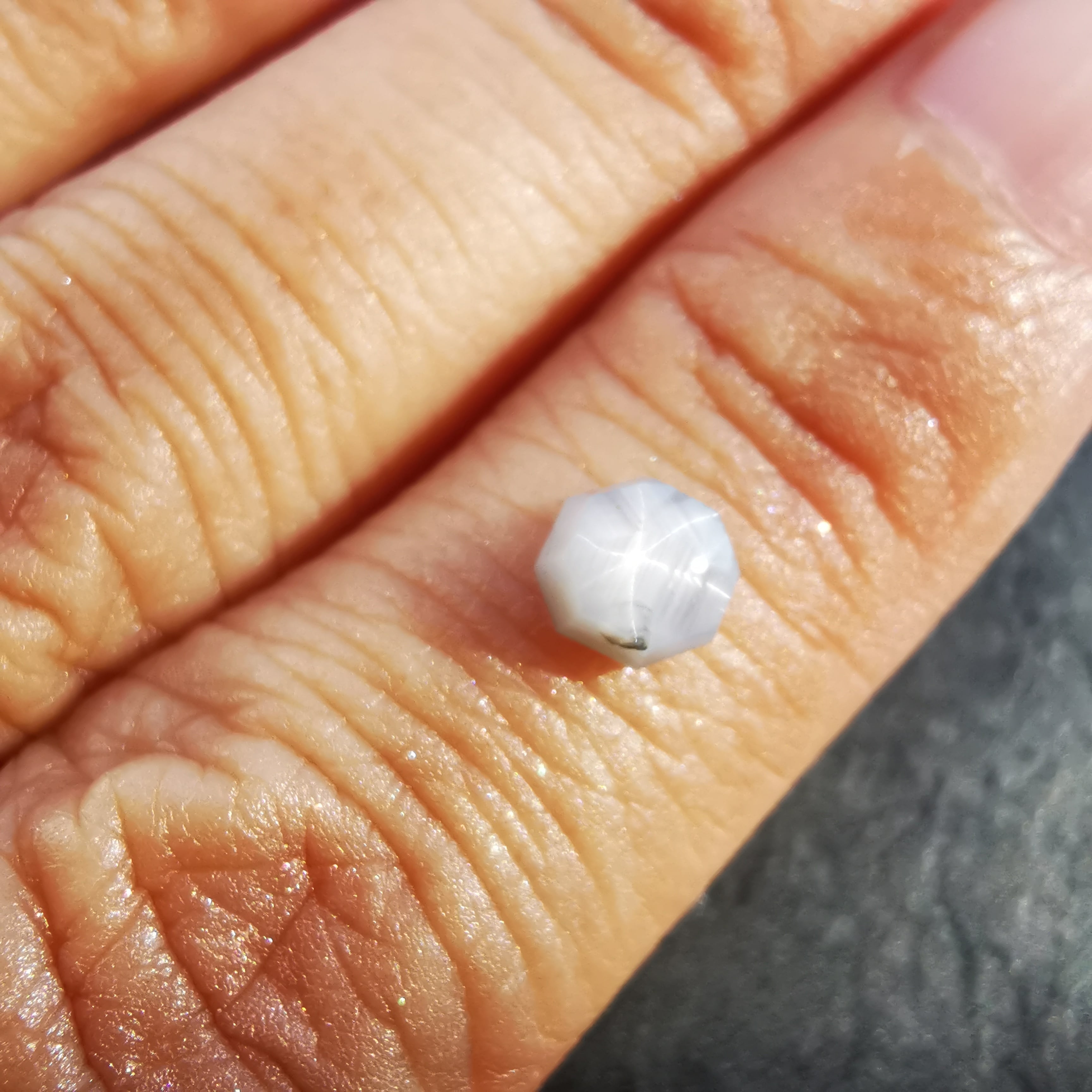 スターサファイアと言えば、カボションカットばかりですが、スターを残したままカットにも個性を出したいと、小粒のスターサファイアを八角形にリカットしました。