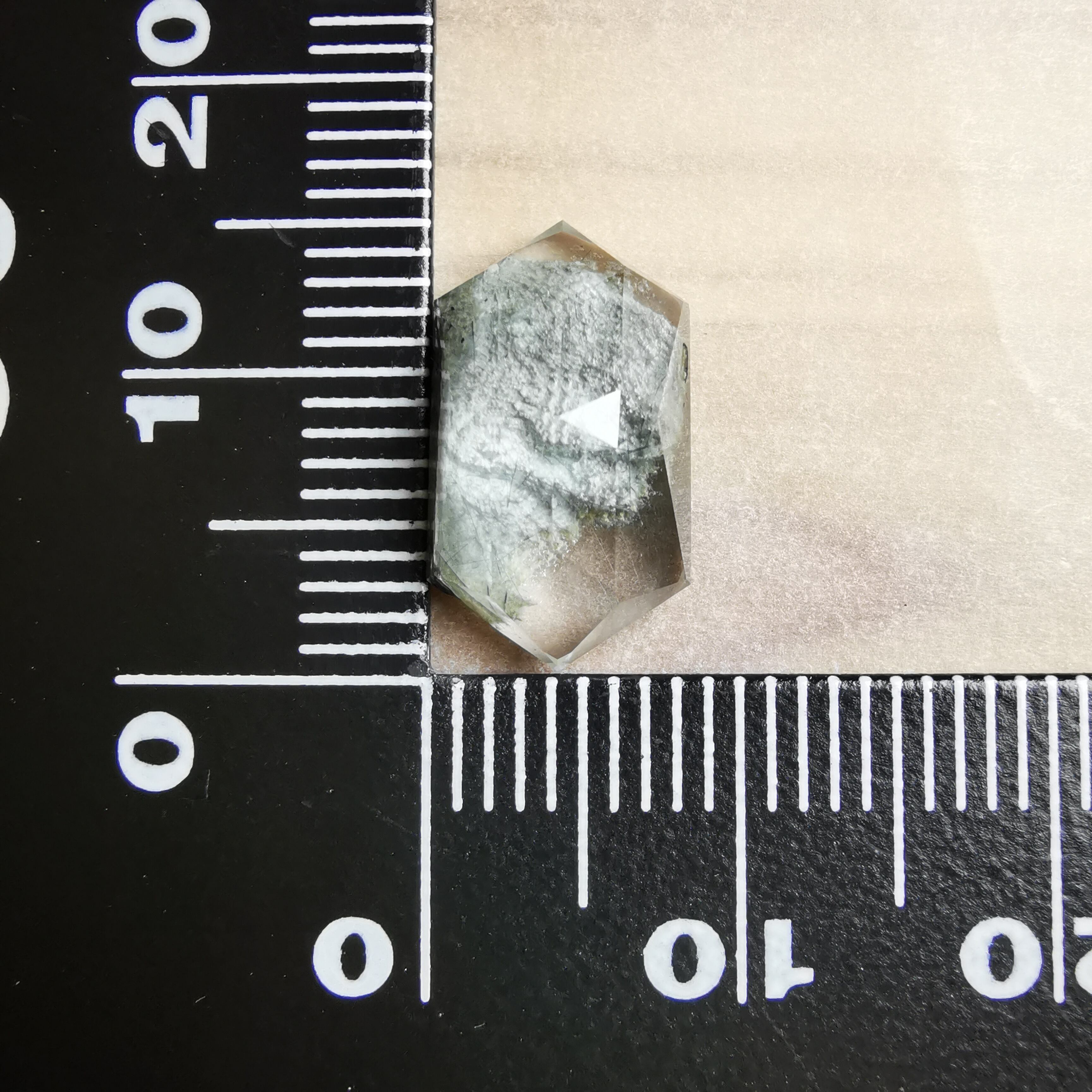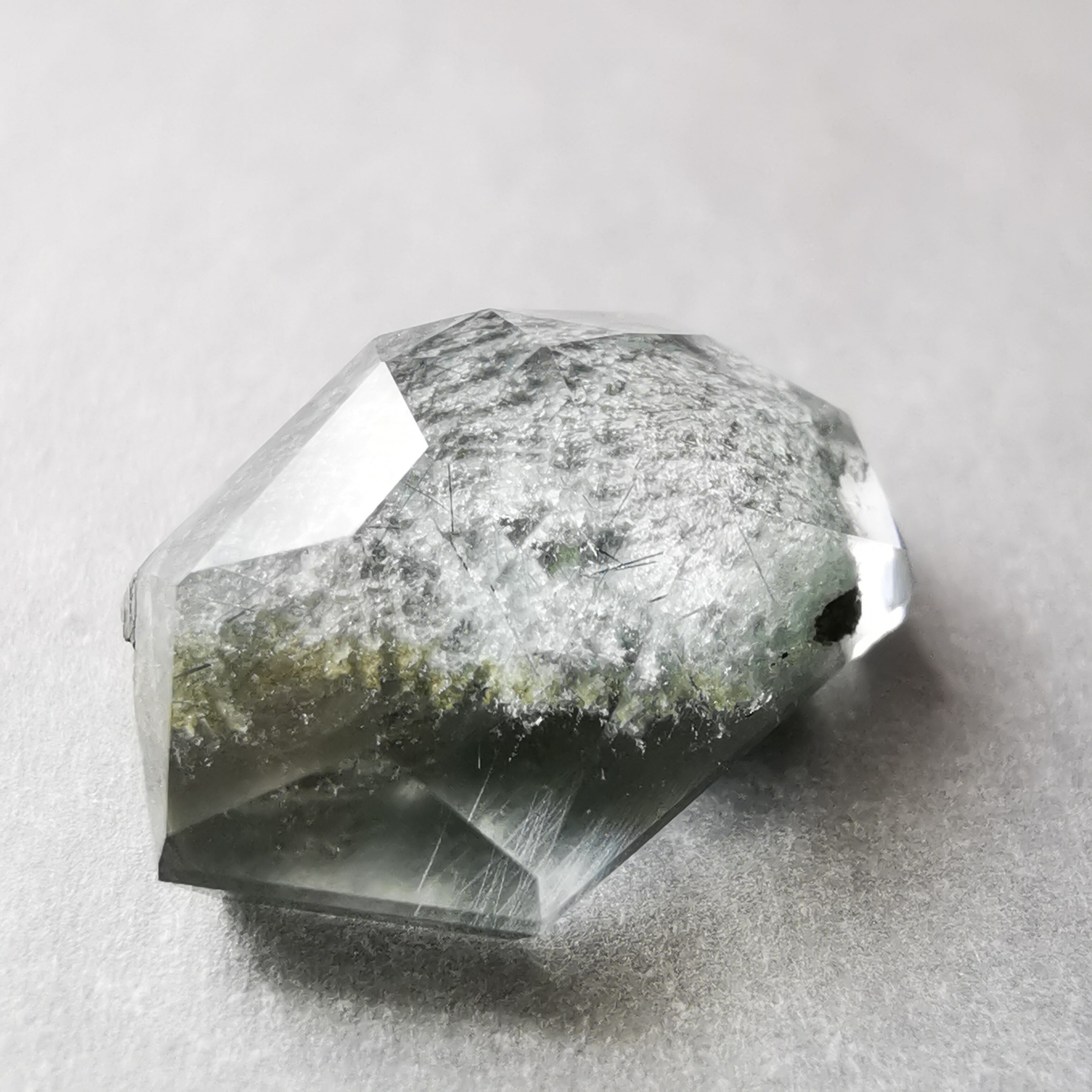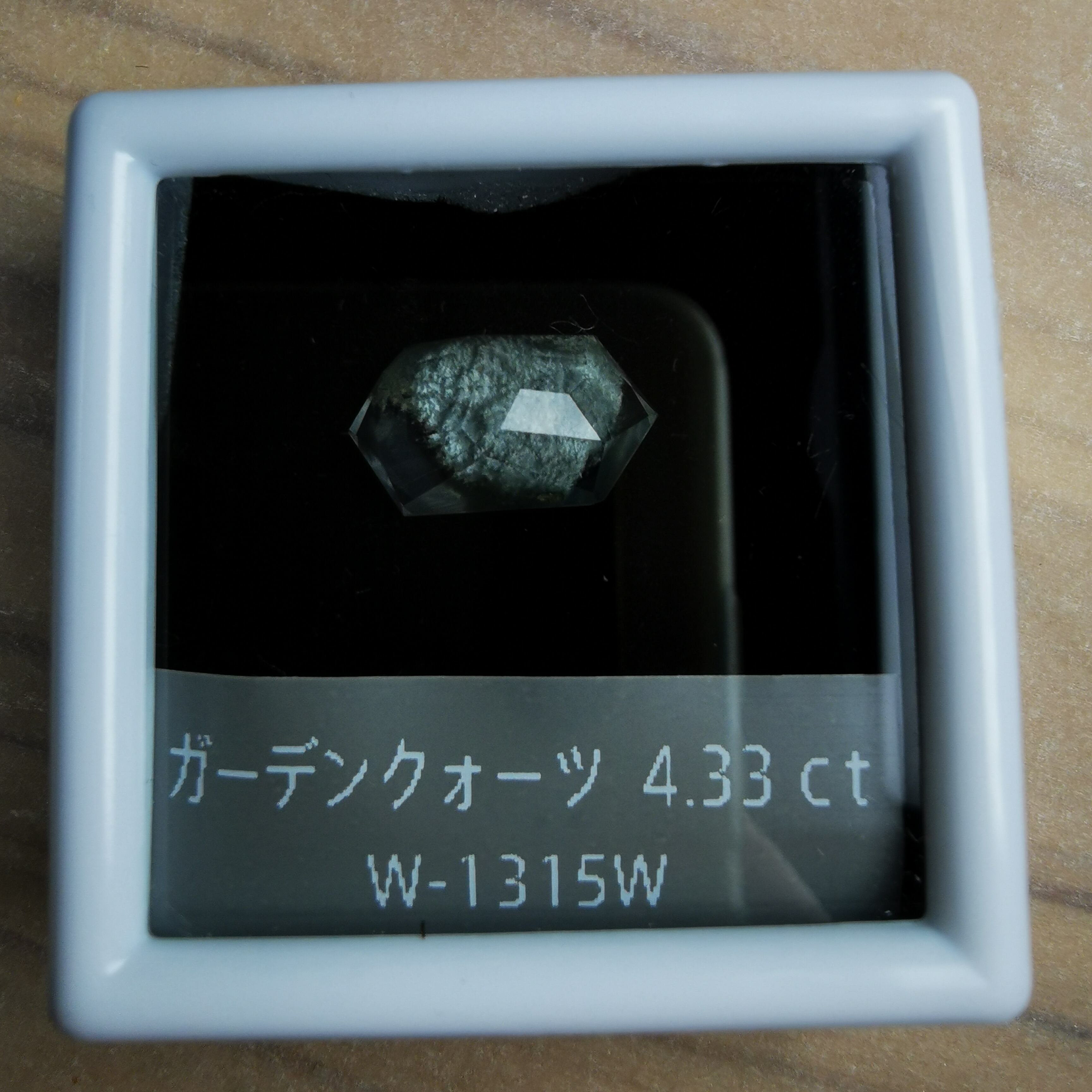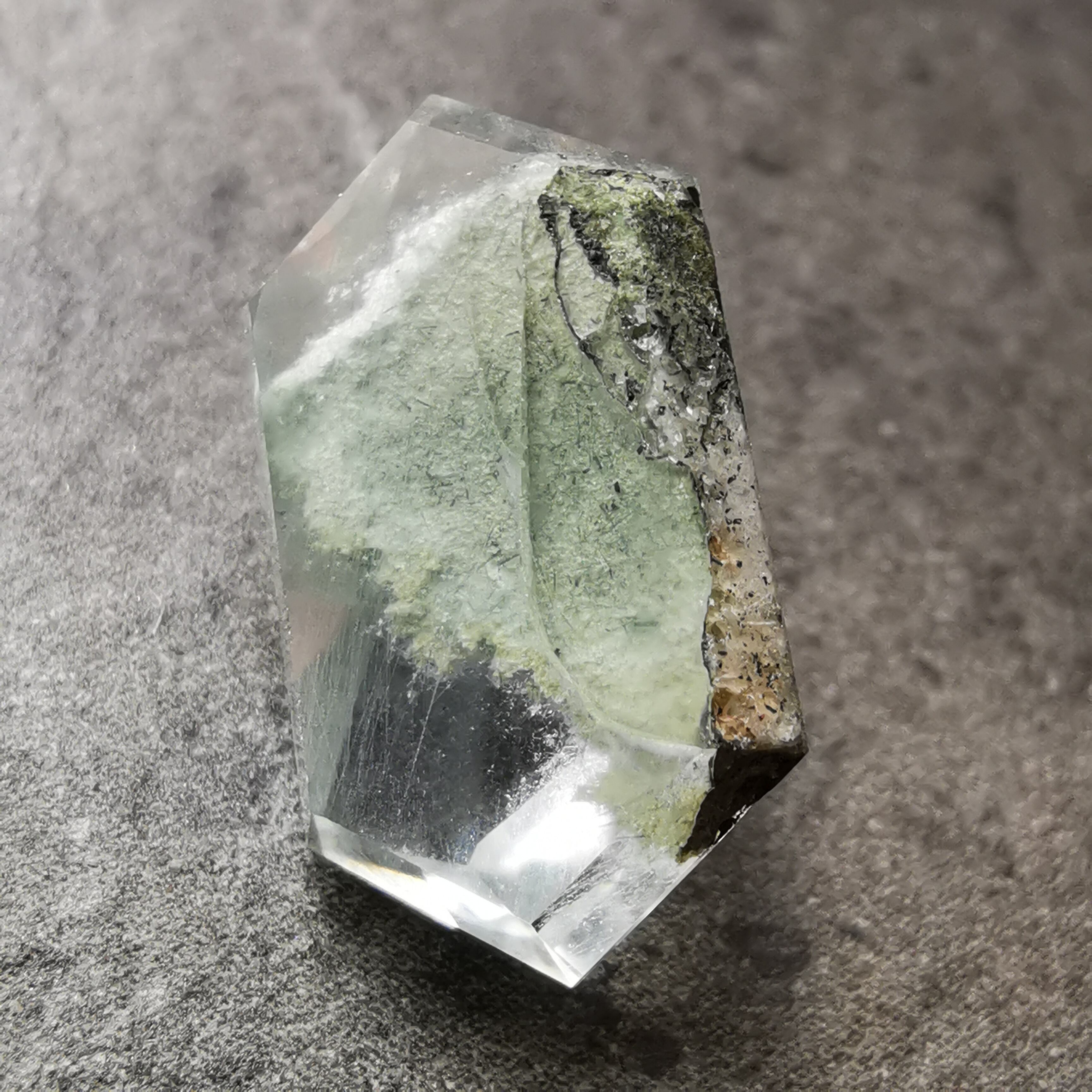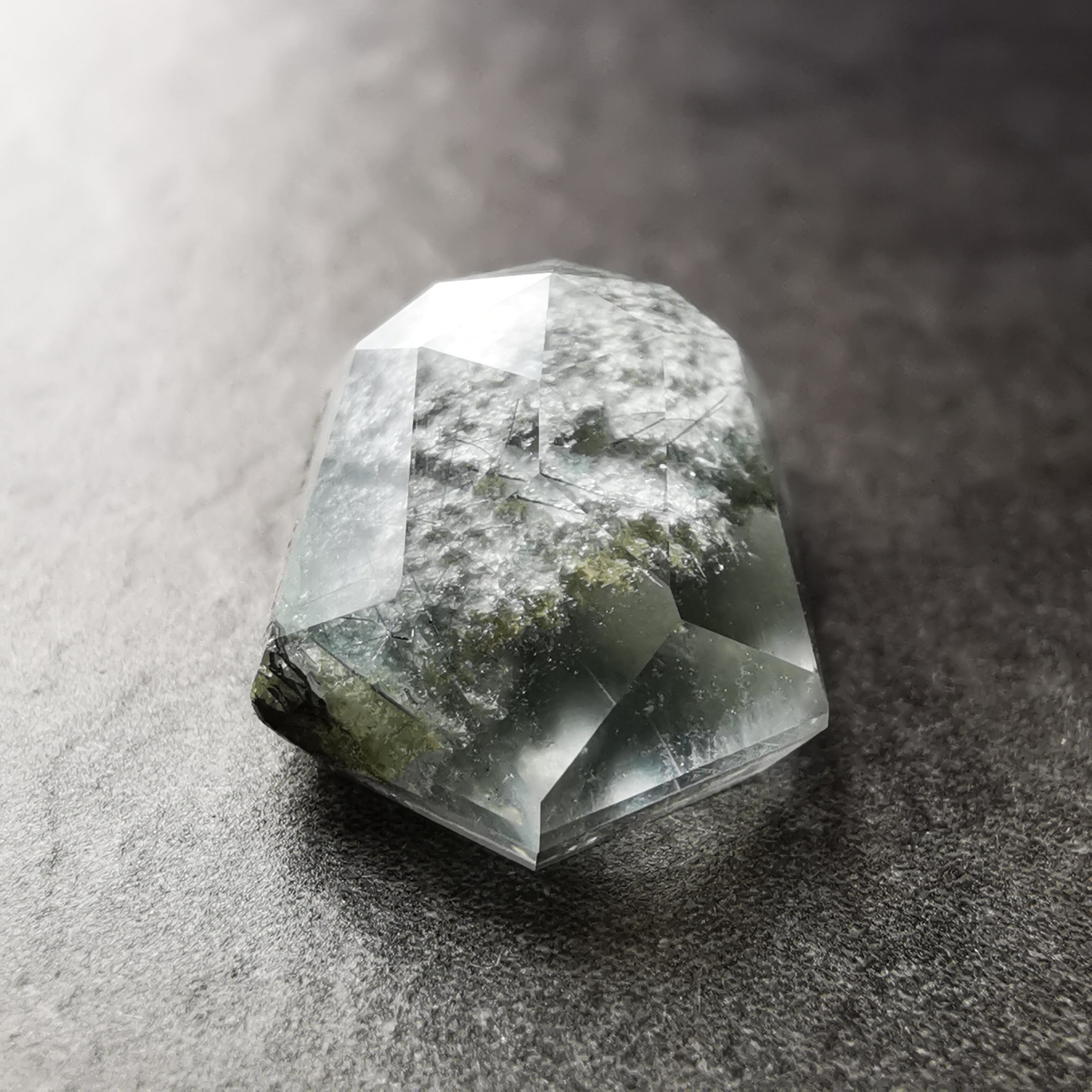 クリーンなクォーツに、クローライトという苔のような内包物が入ったガーデンクォーツと呼ばれるクォーツです。