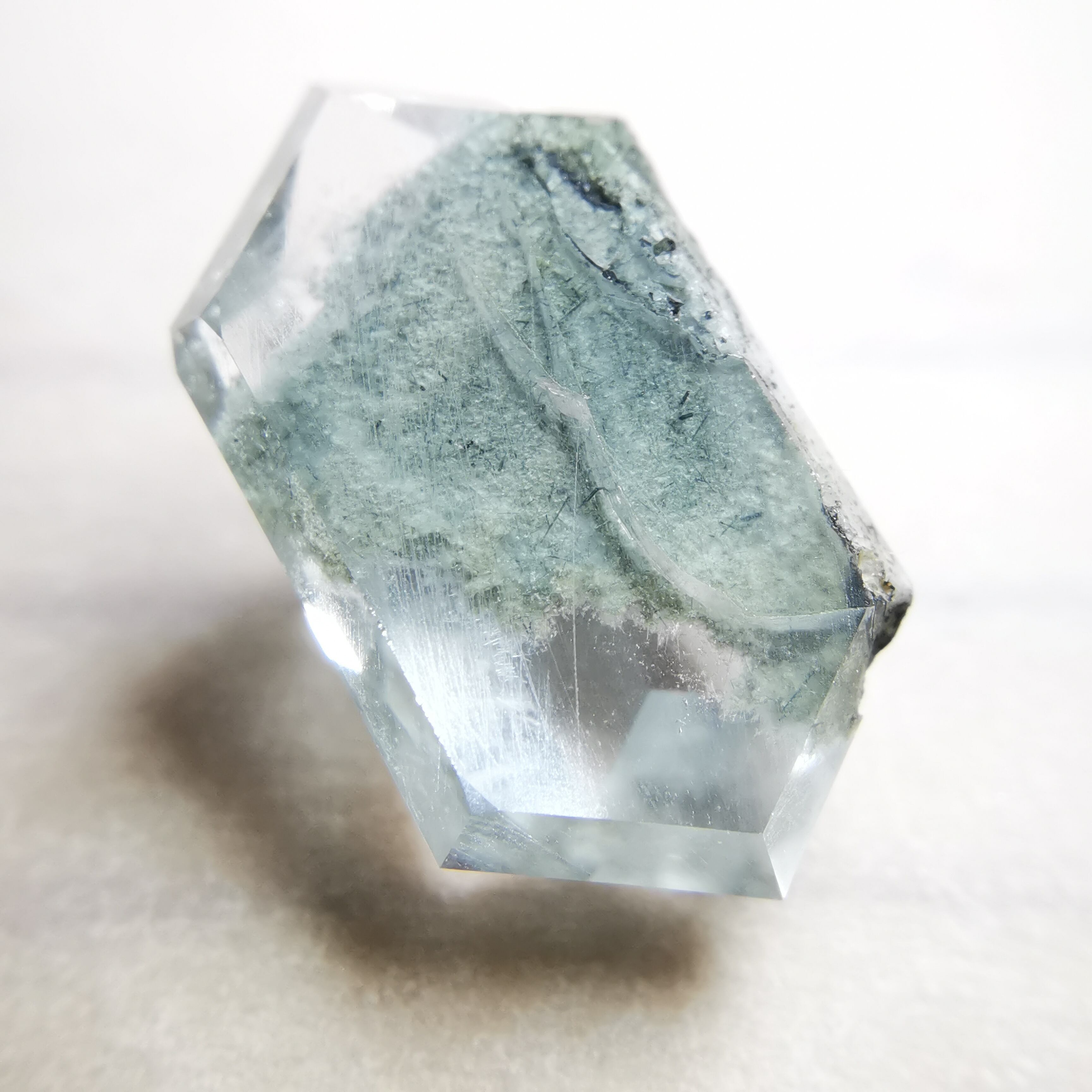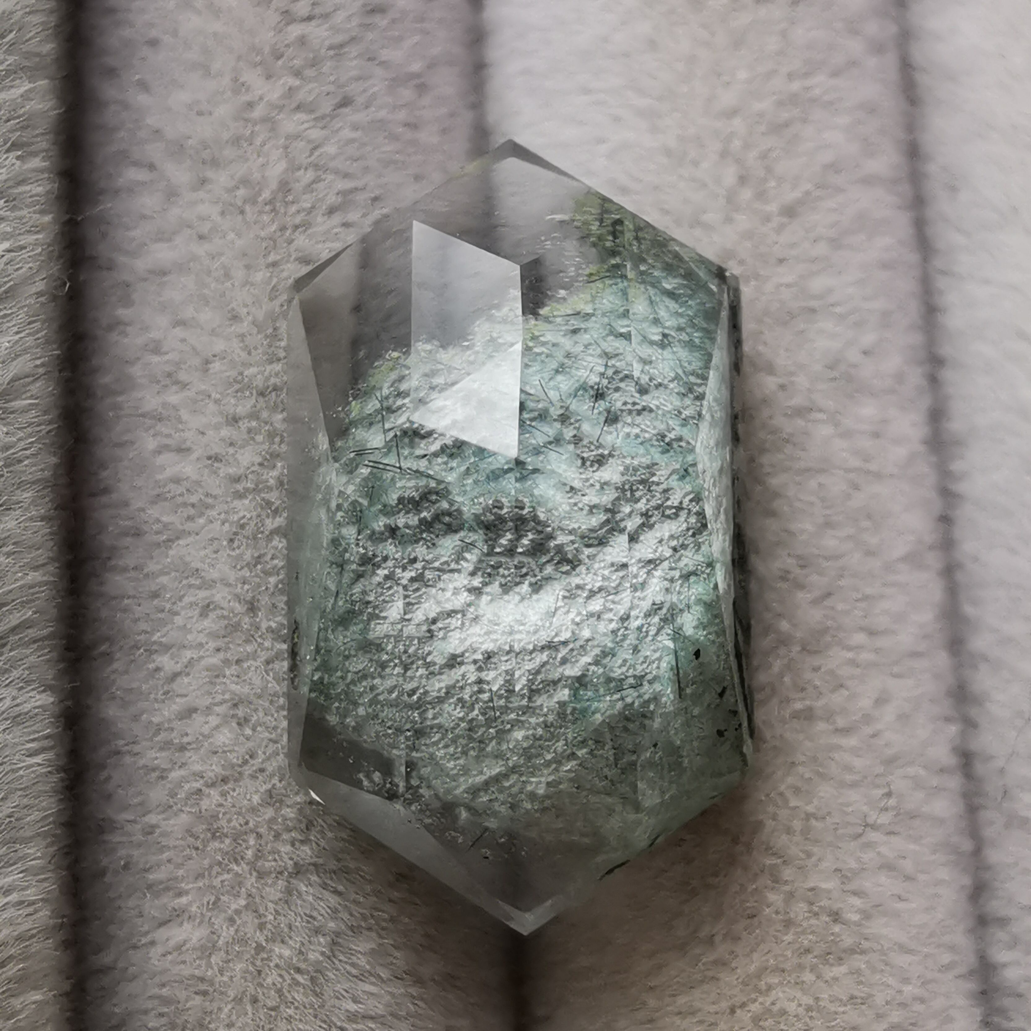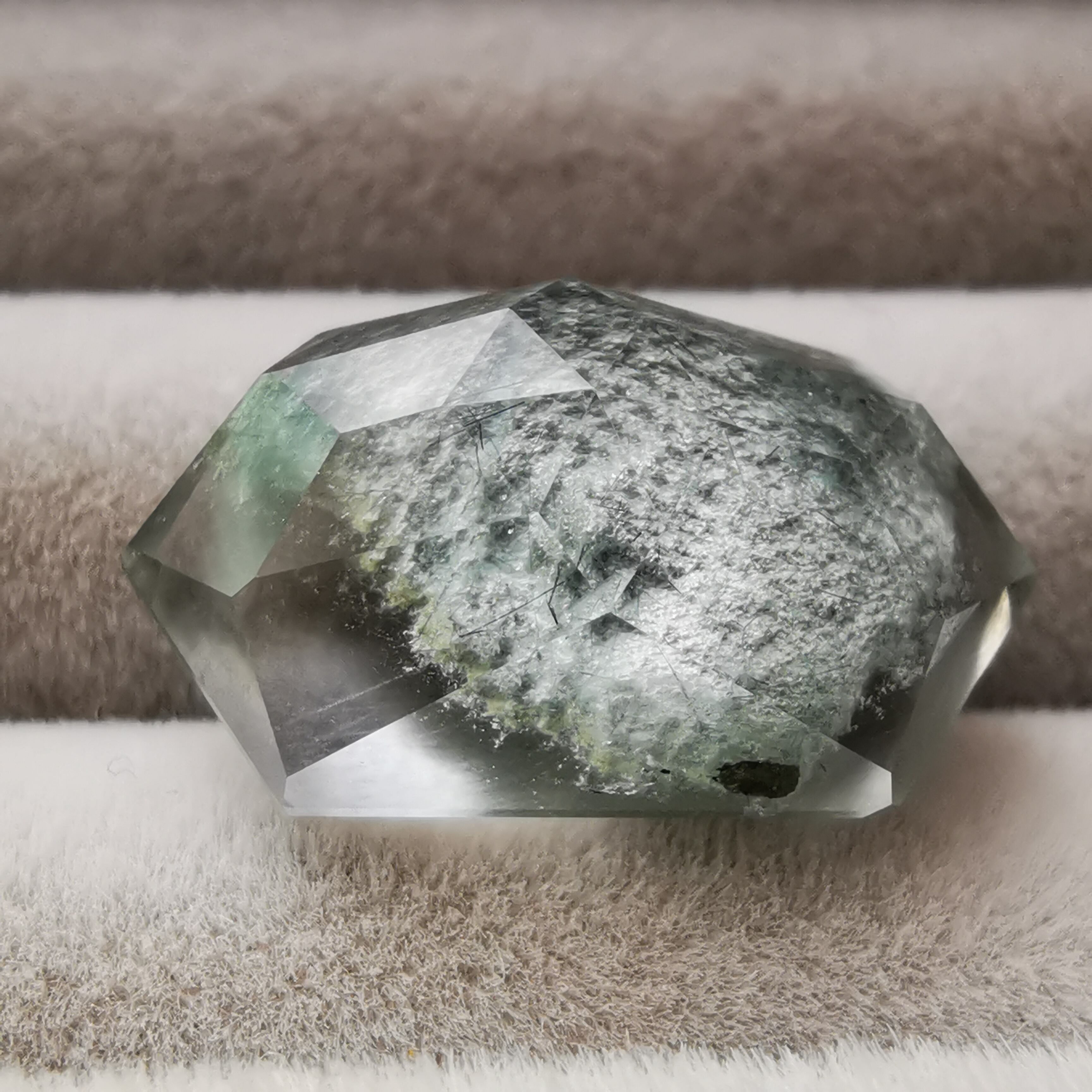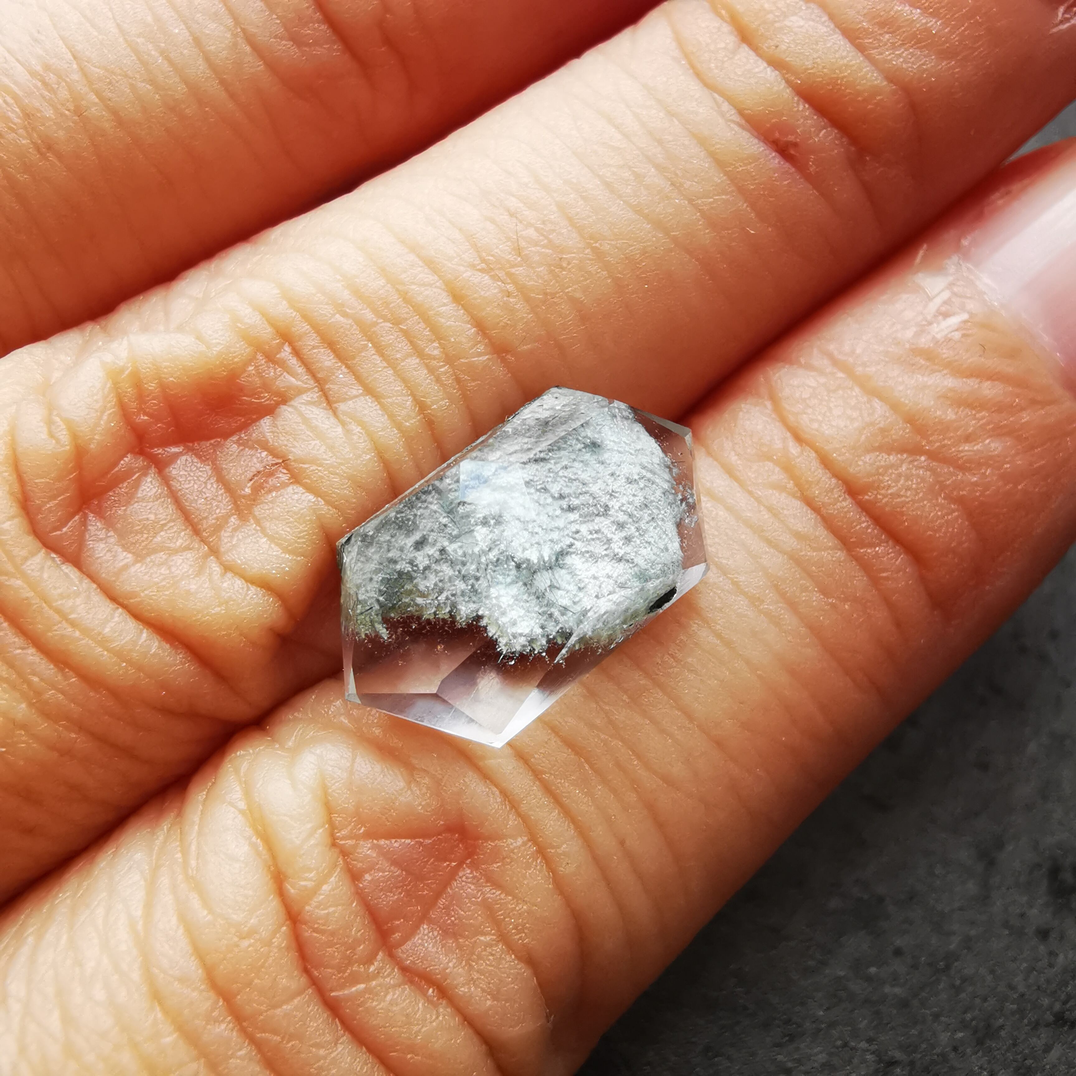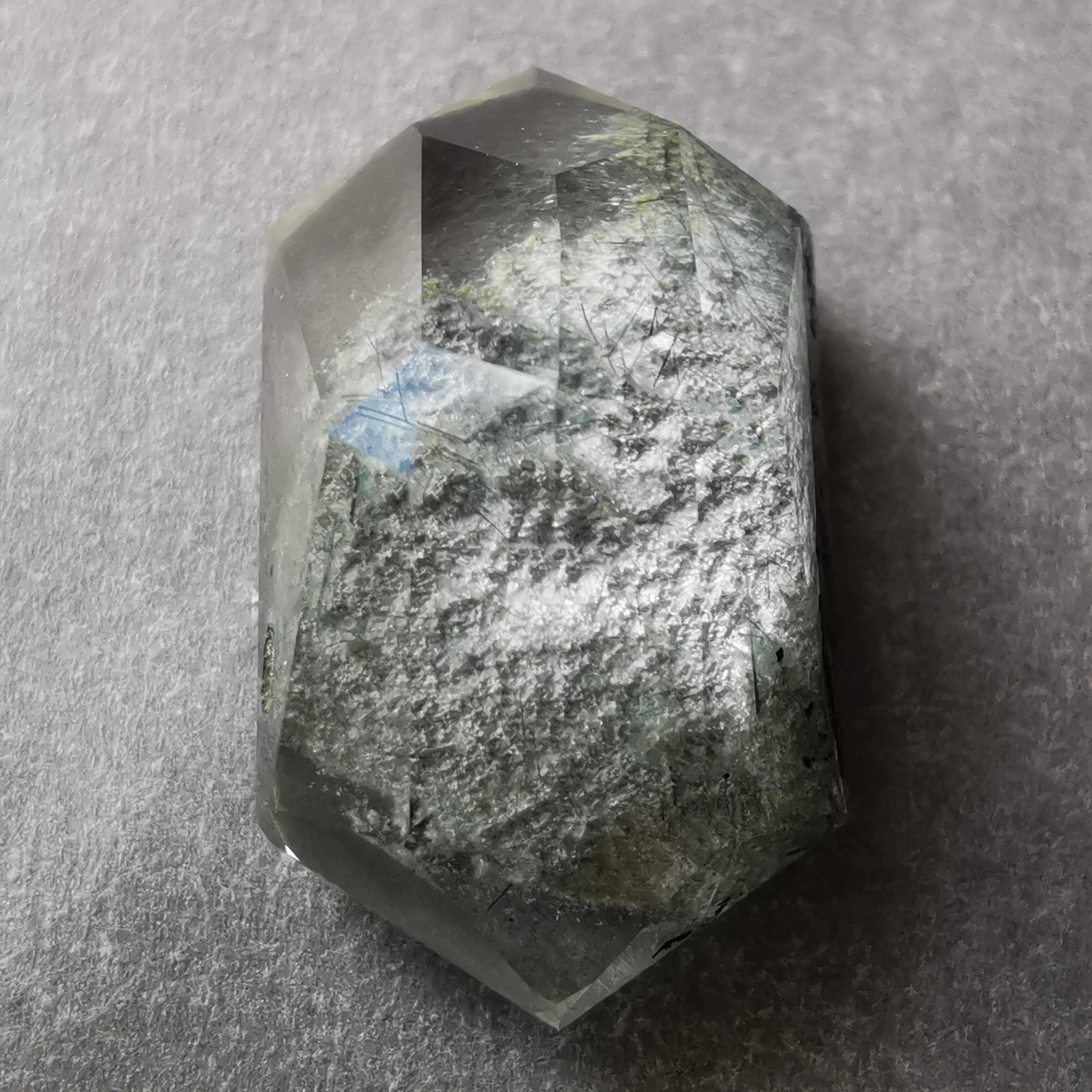 クリーンなクォーツに、クローライトという苔のような内包物が入ったガーデンクォーツと呼ばれるクォーツです。