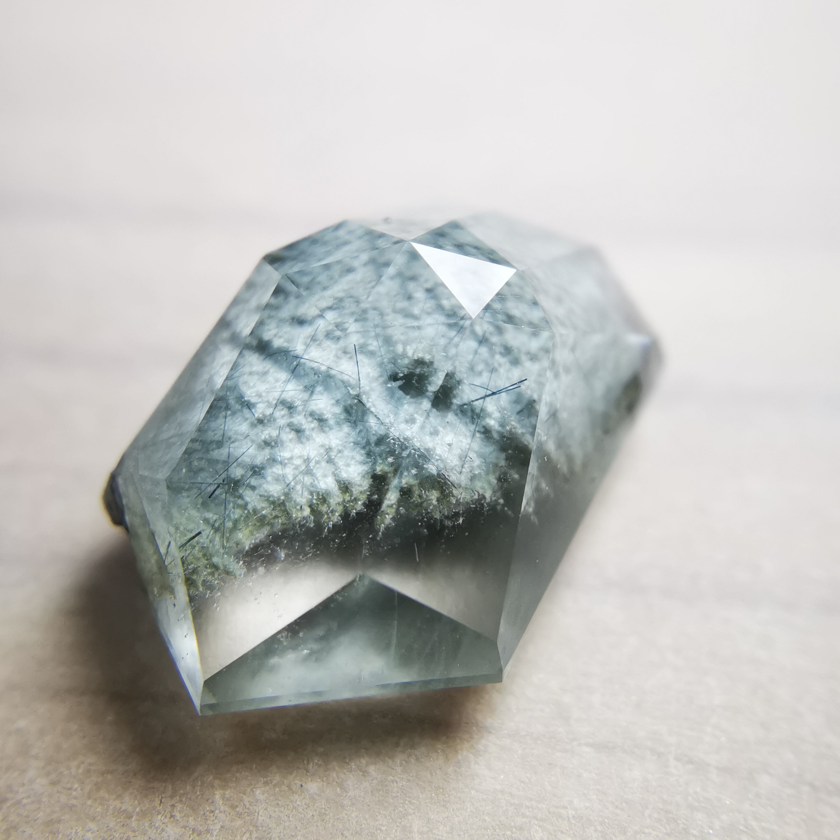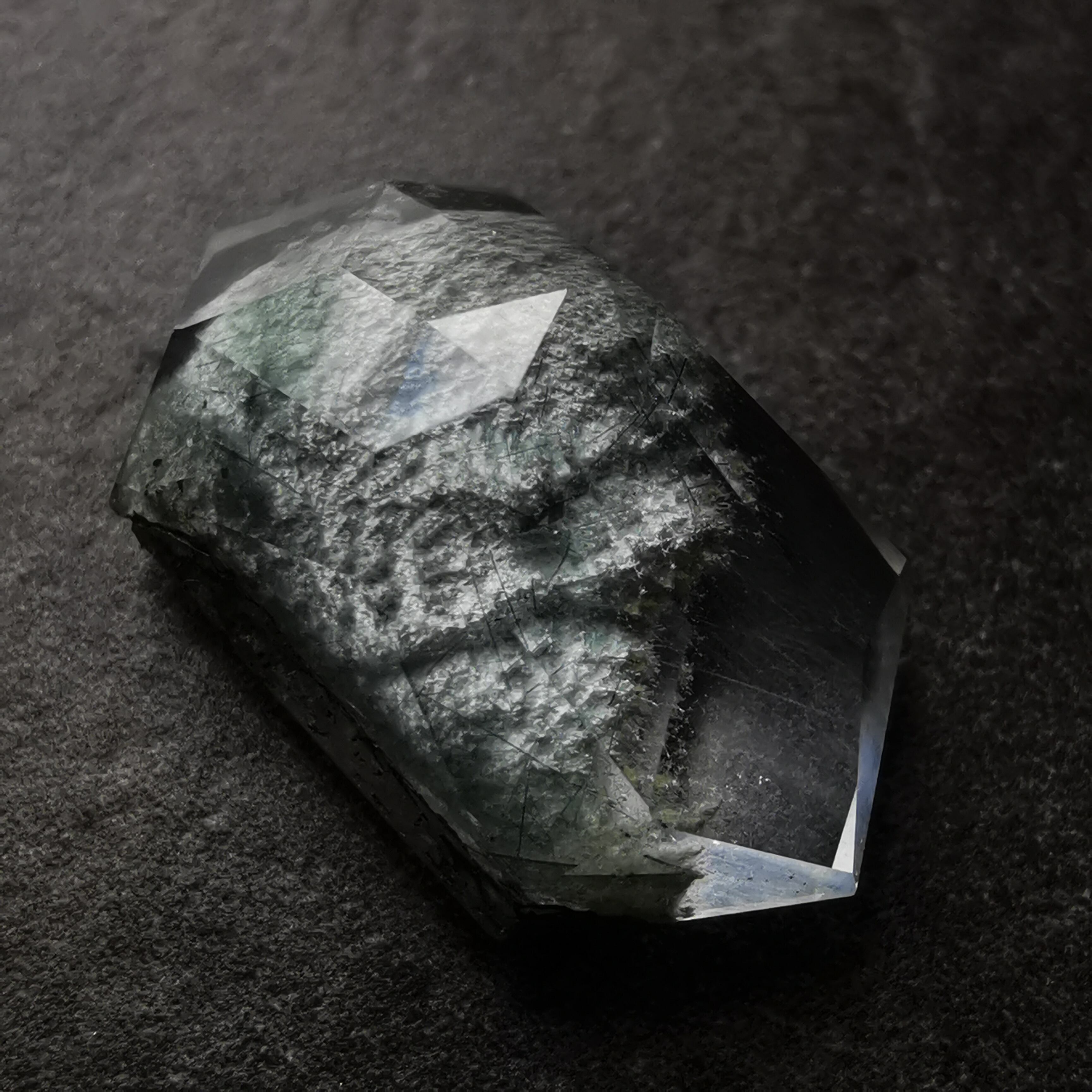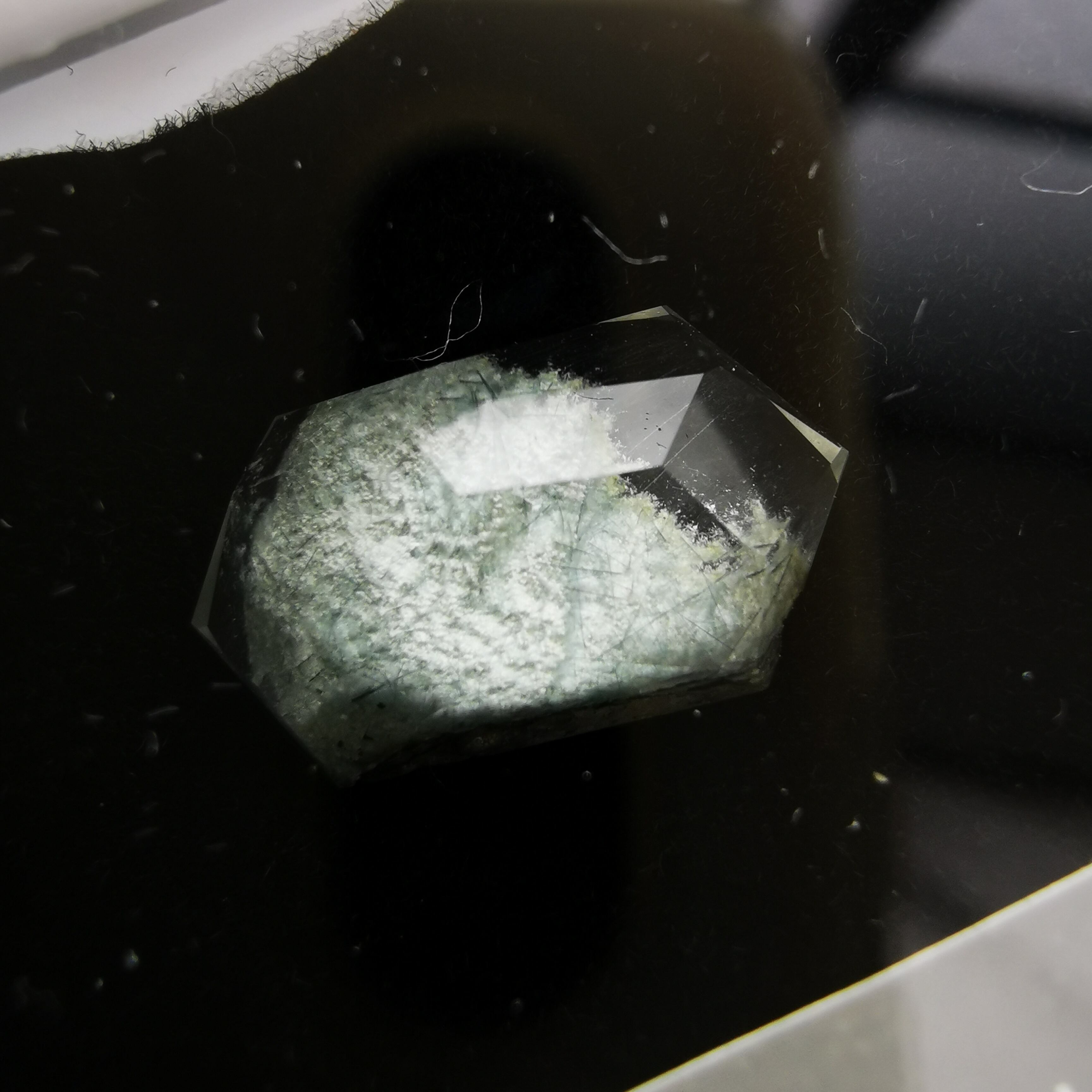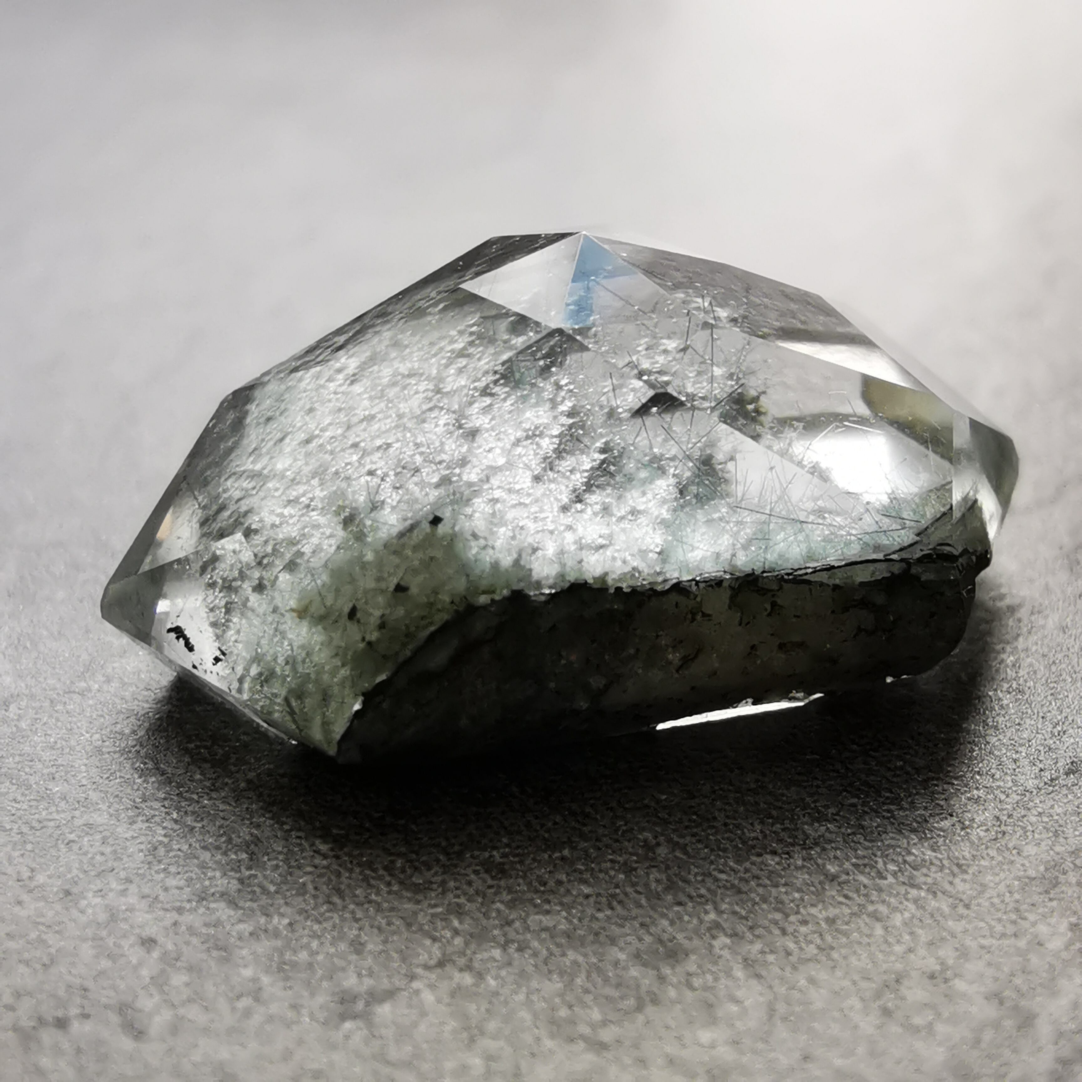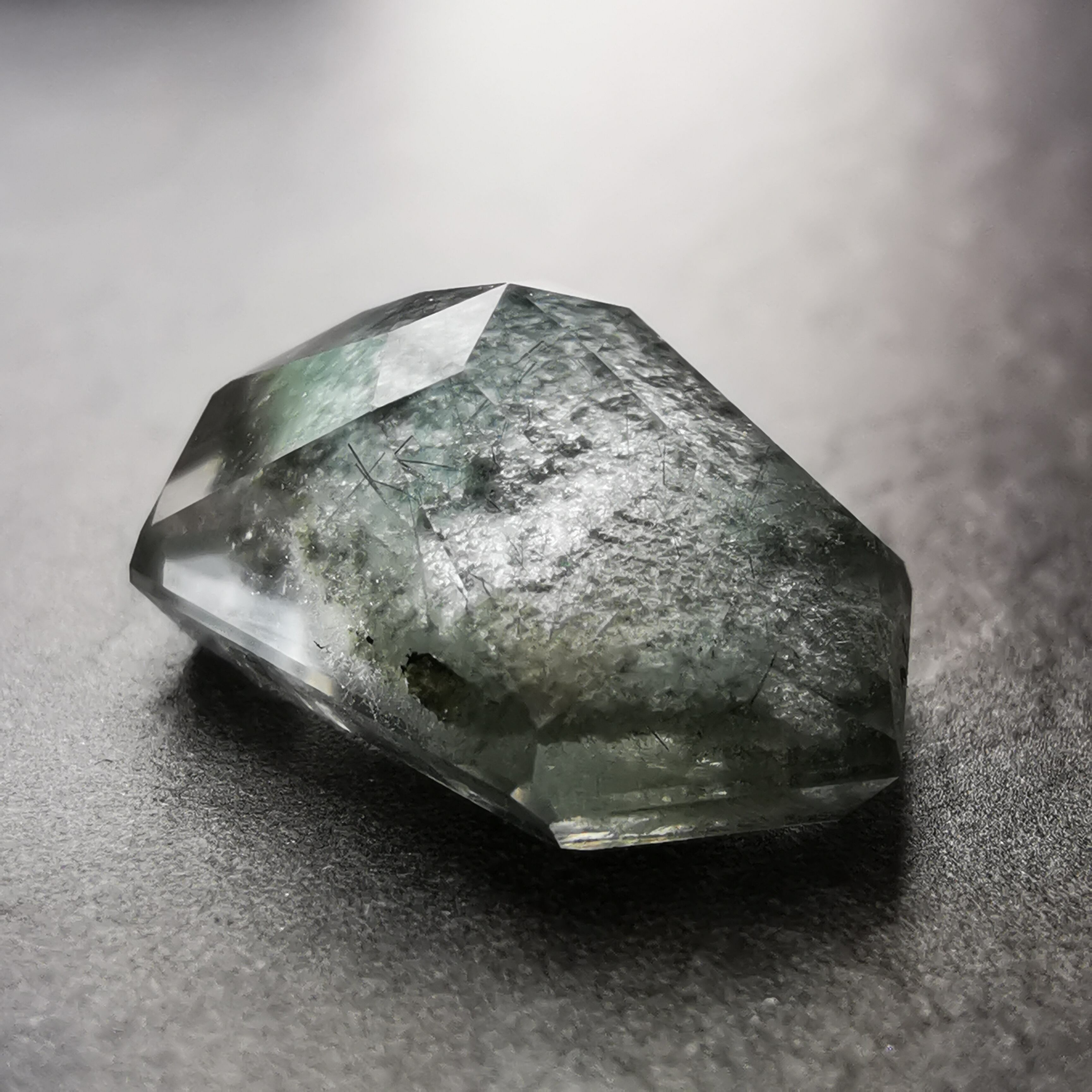 クリーンなクォーツに、クローライトという苔のような内包物が入ったガーデンクォーツと呼ばれるクォーツです。