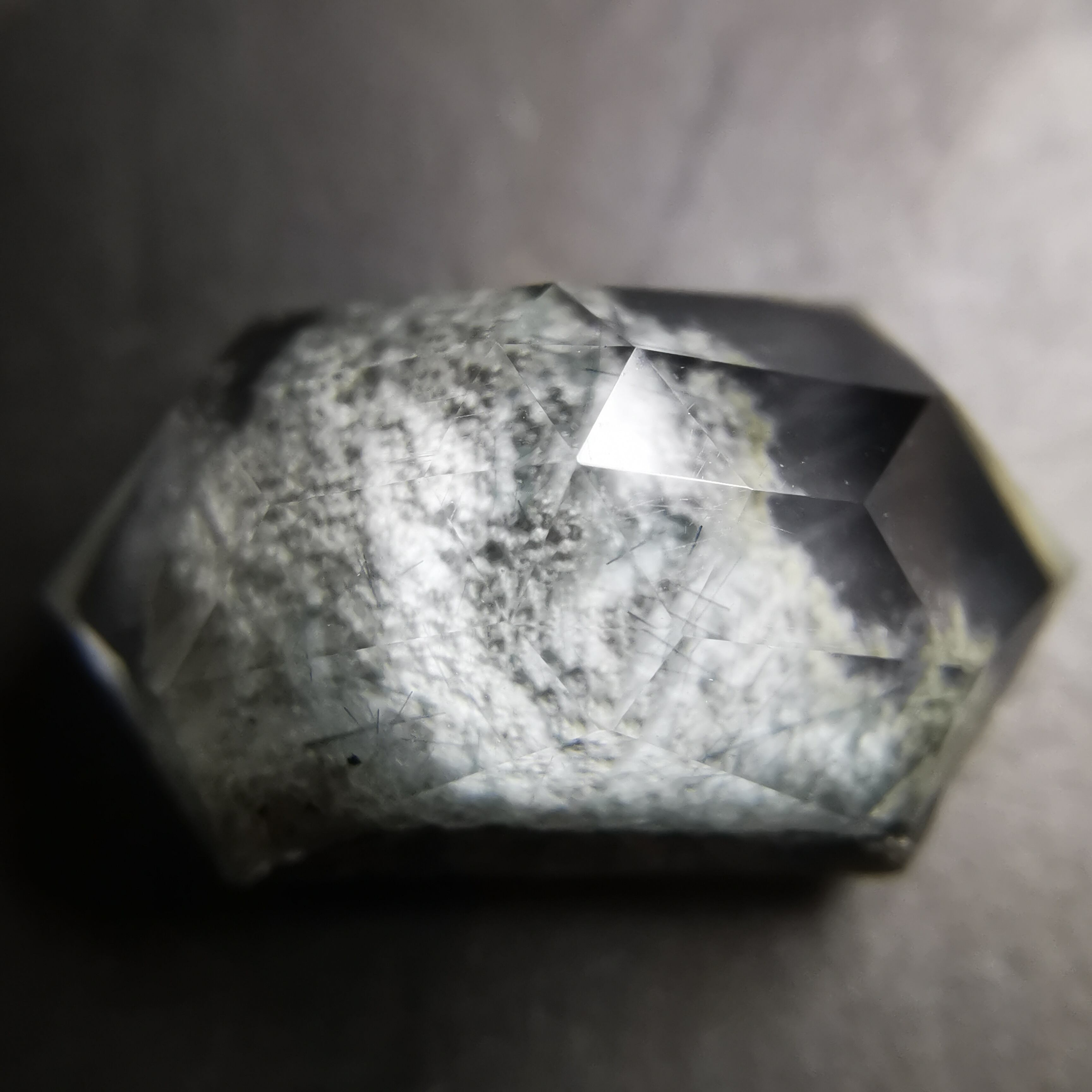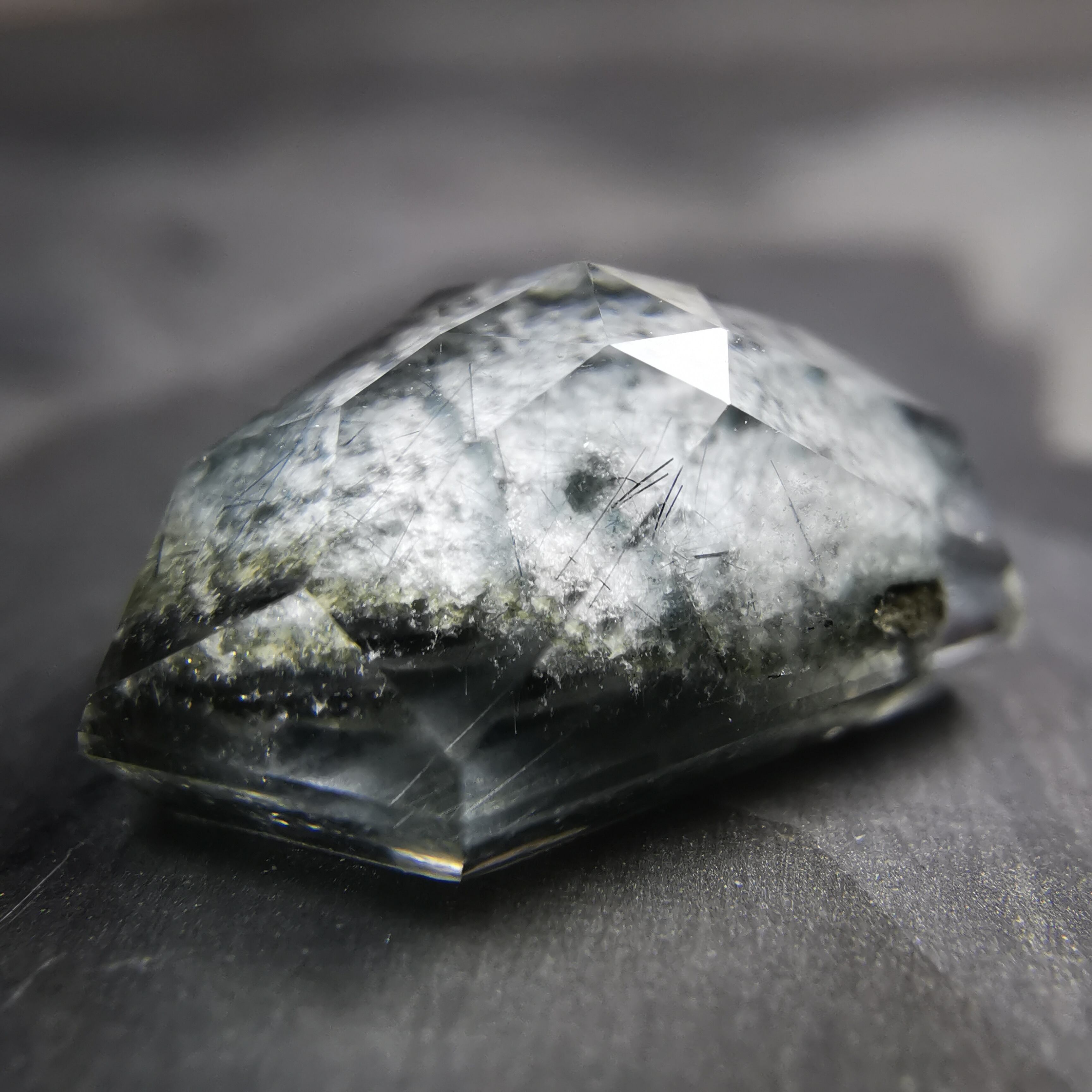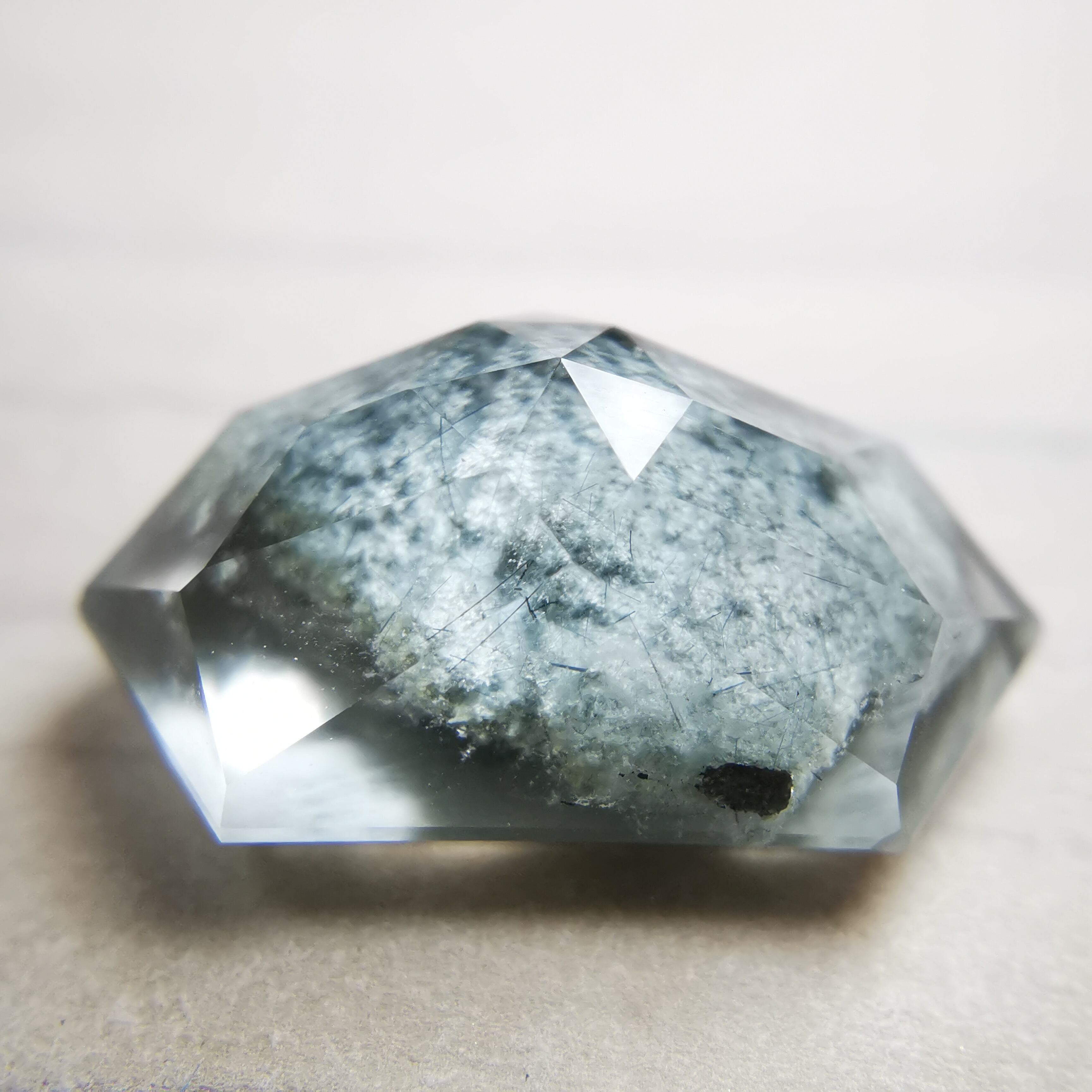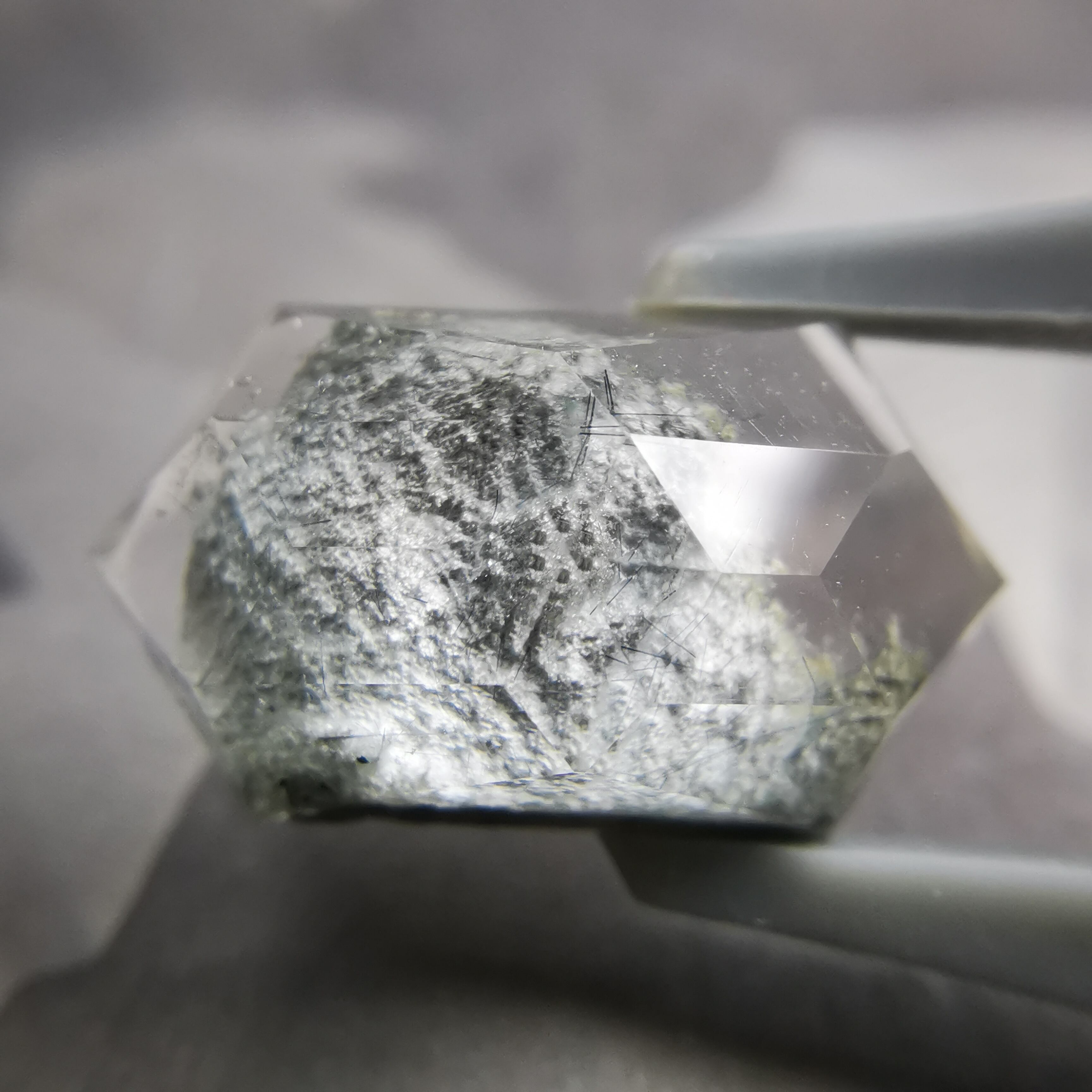 もこもこと湧き上がり、迫りくるような迫力の内包物が、クリーンなクォーツの中で様々な景色を見せます。