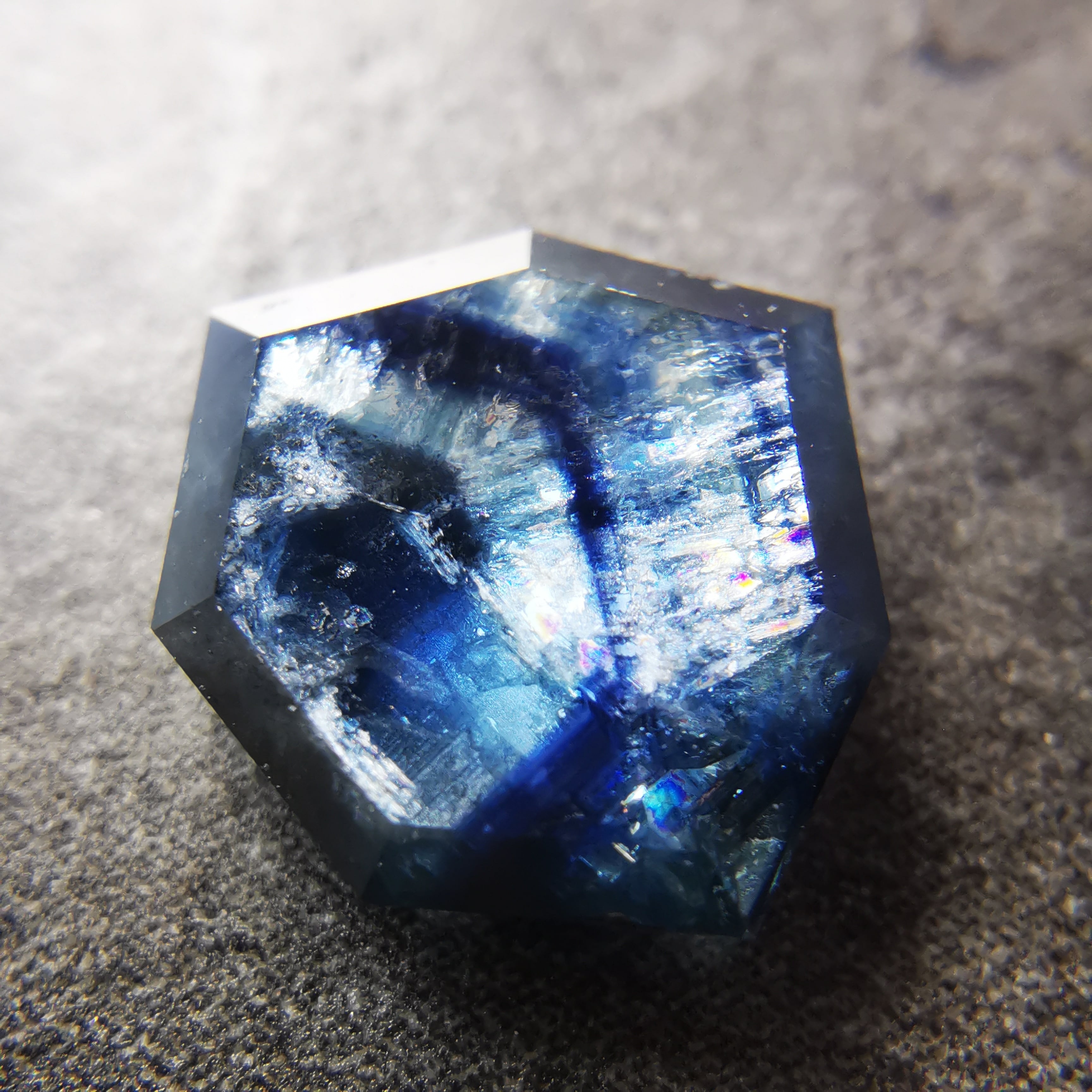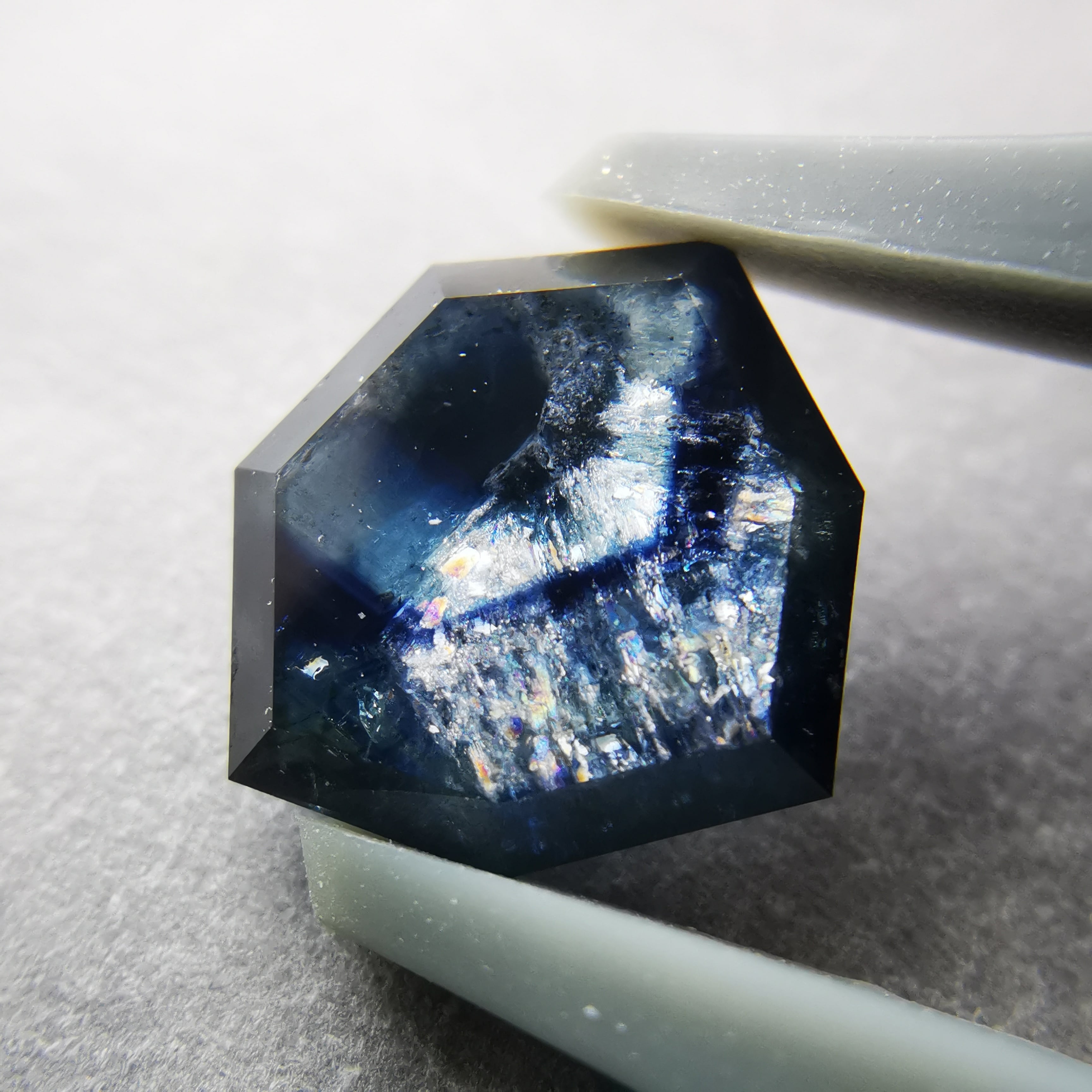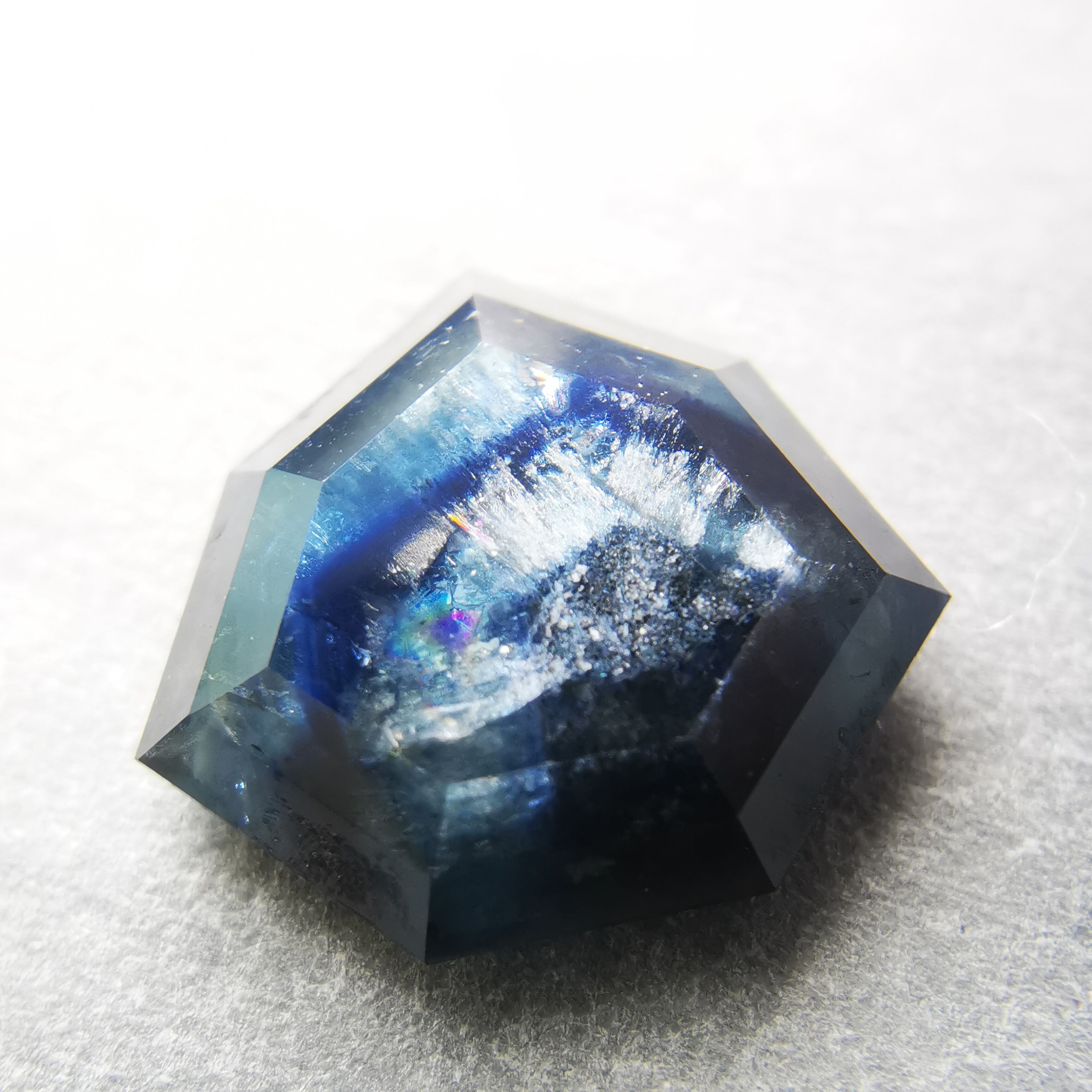 さらに、表面に一定方向から光が当たると、トラピッチェの模様に沿って、内包物がシルバーホワイトに輝き、虹も見えるという情報量の多さです。