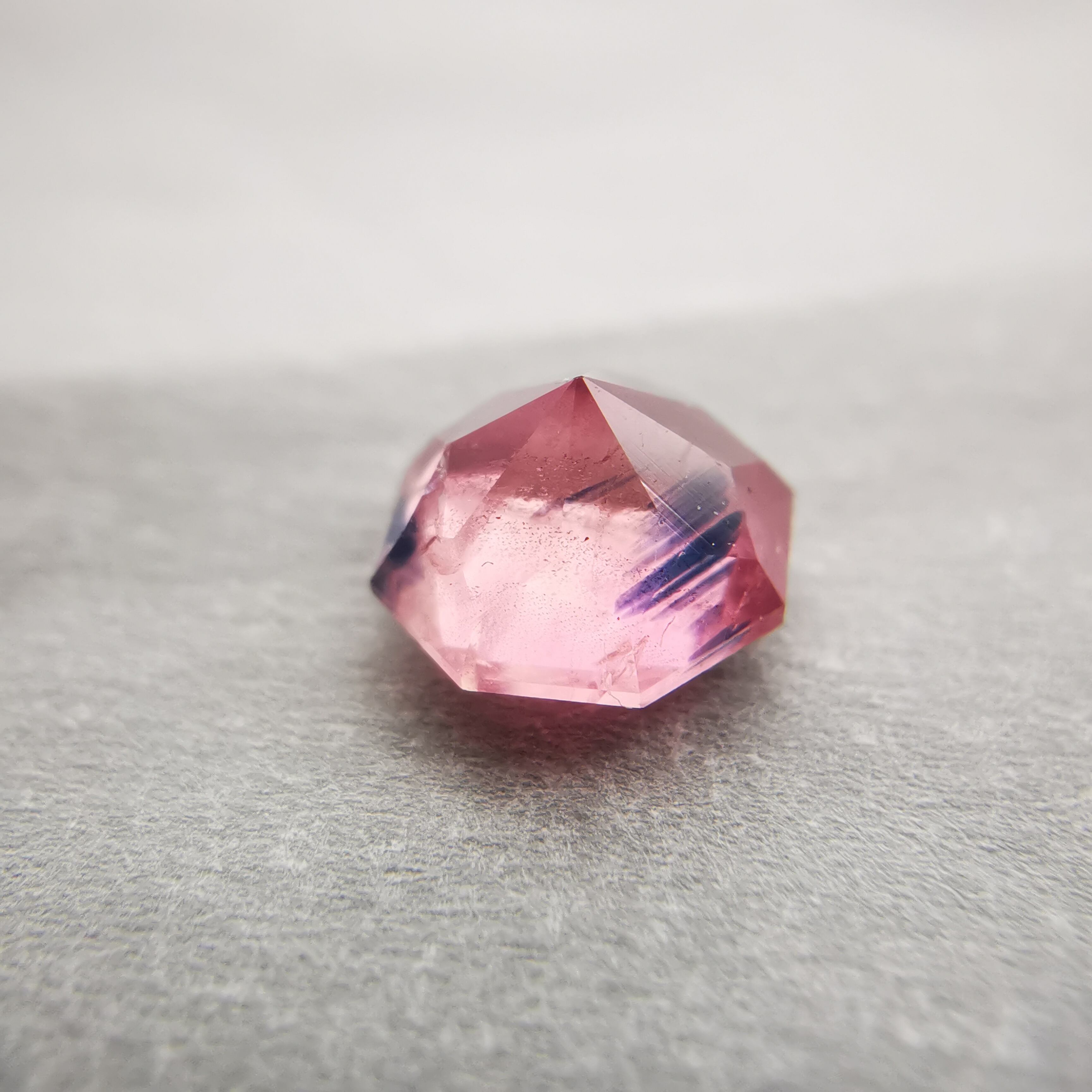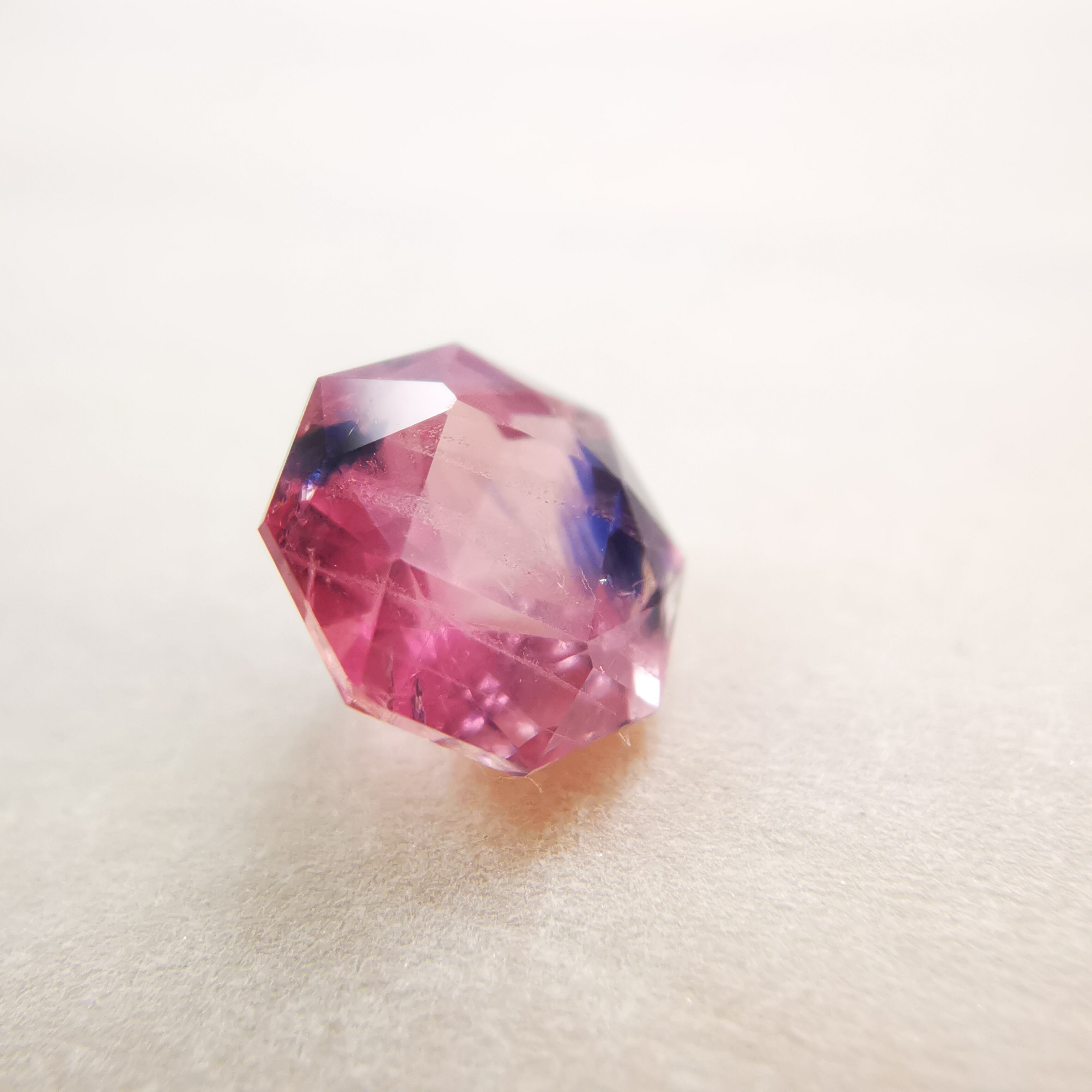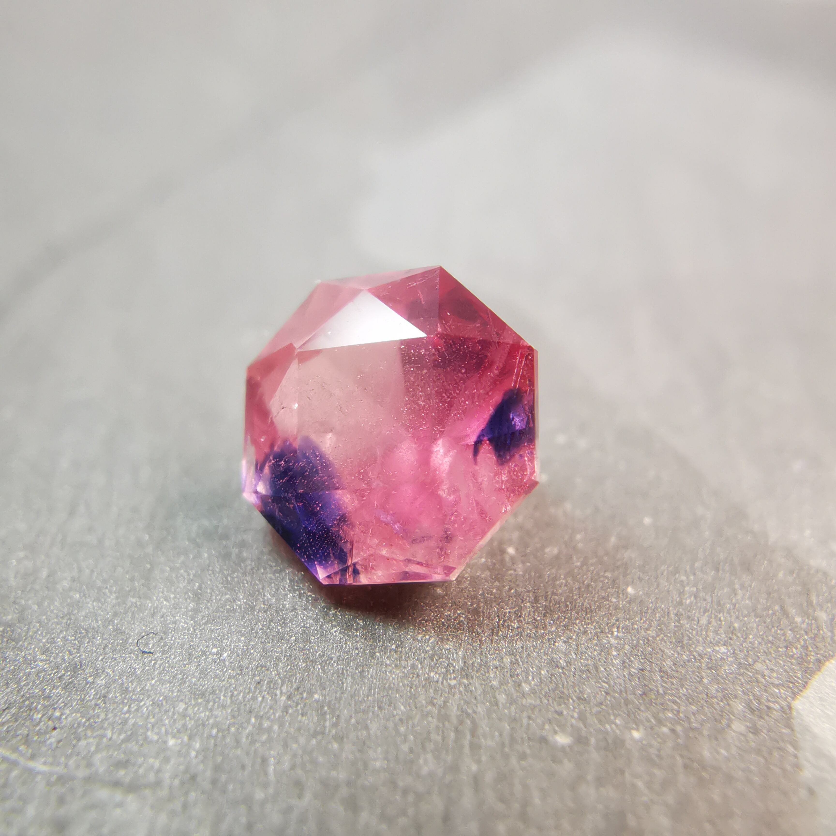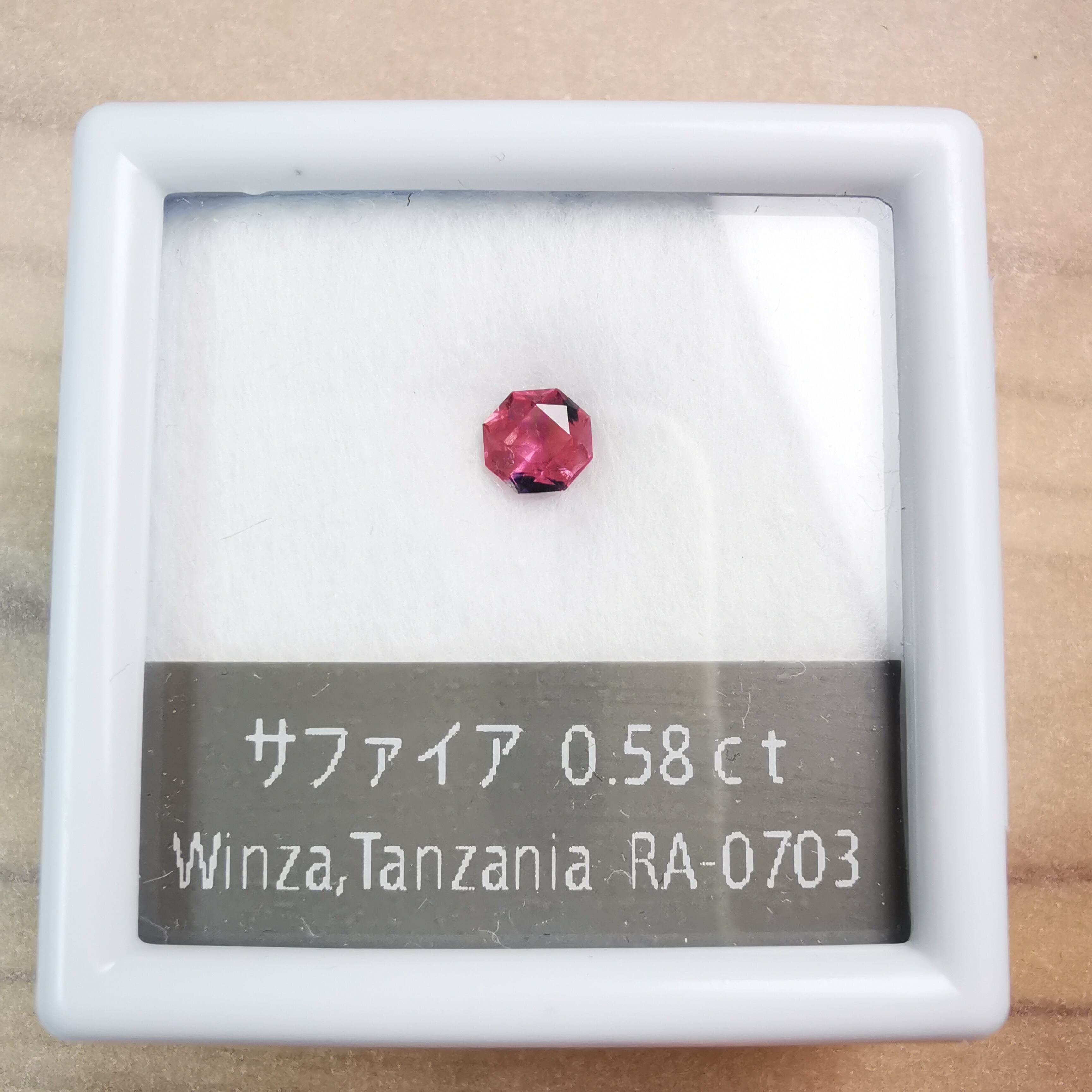 もやっとした石の中から、チェリーピンクがきらめき、ちょんと二か所入った濃いブルーが主張するサファイアです。