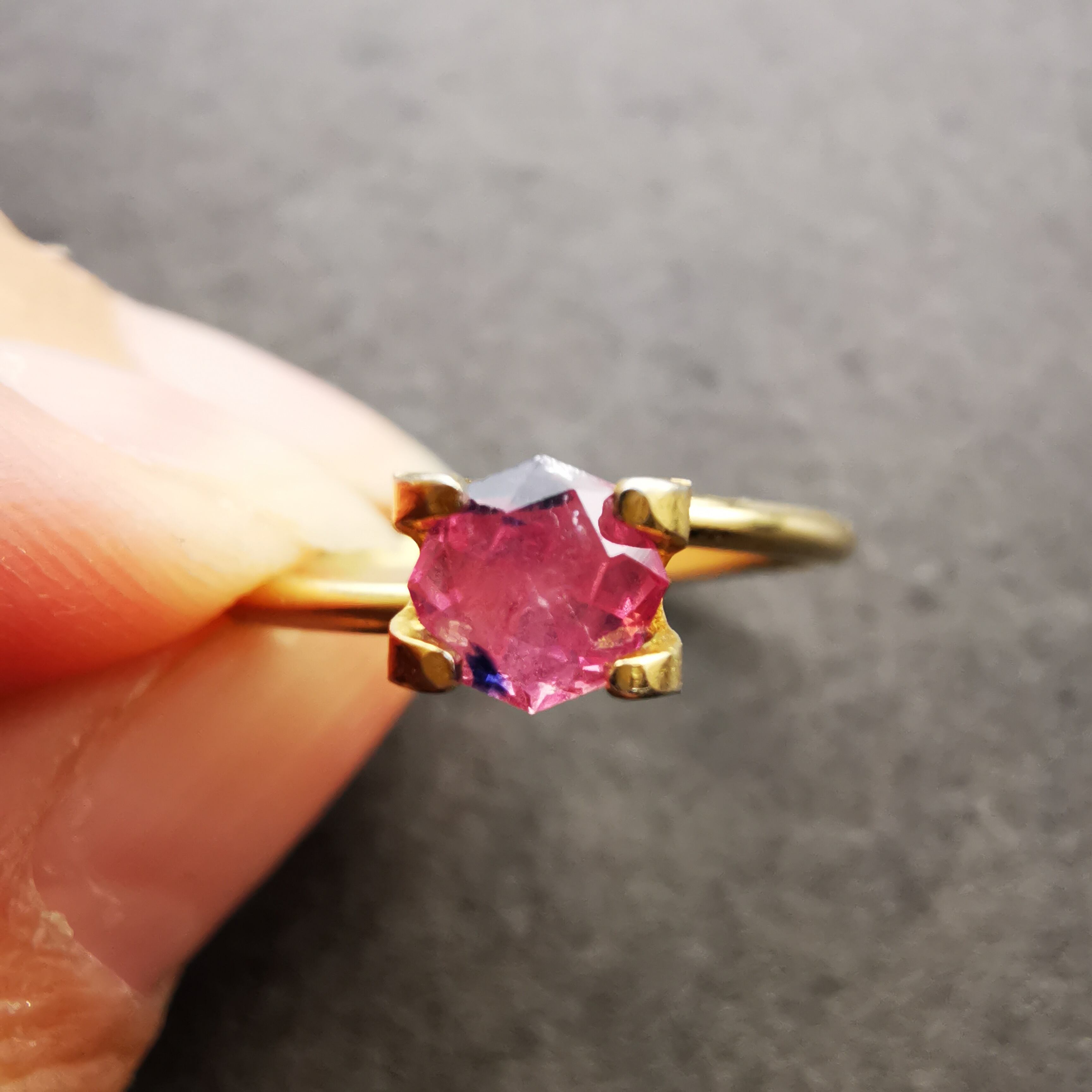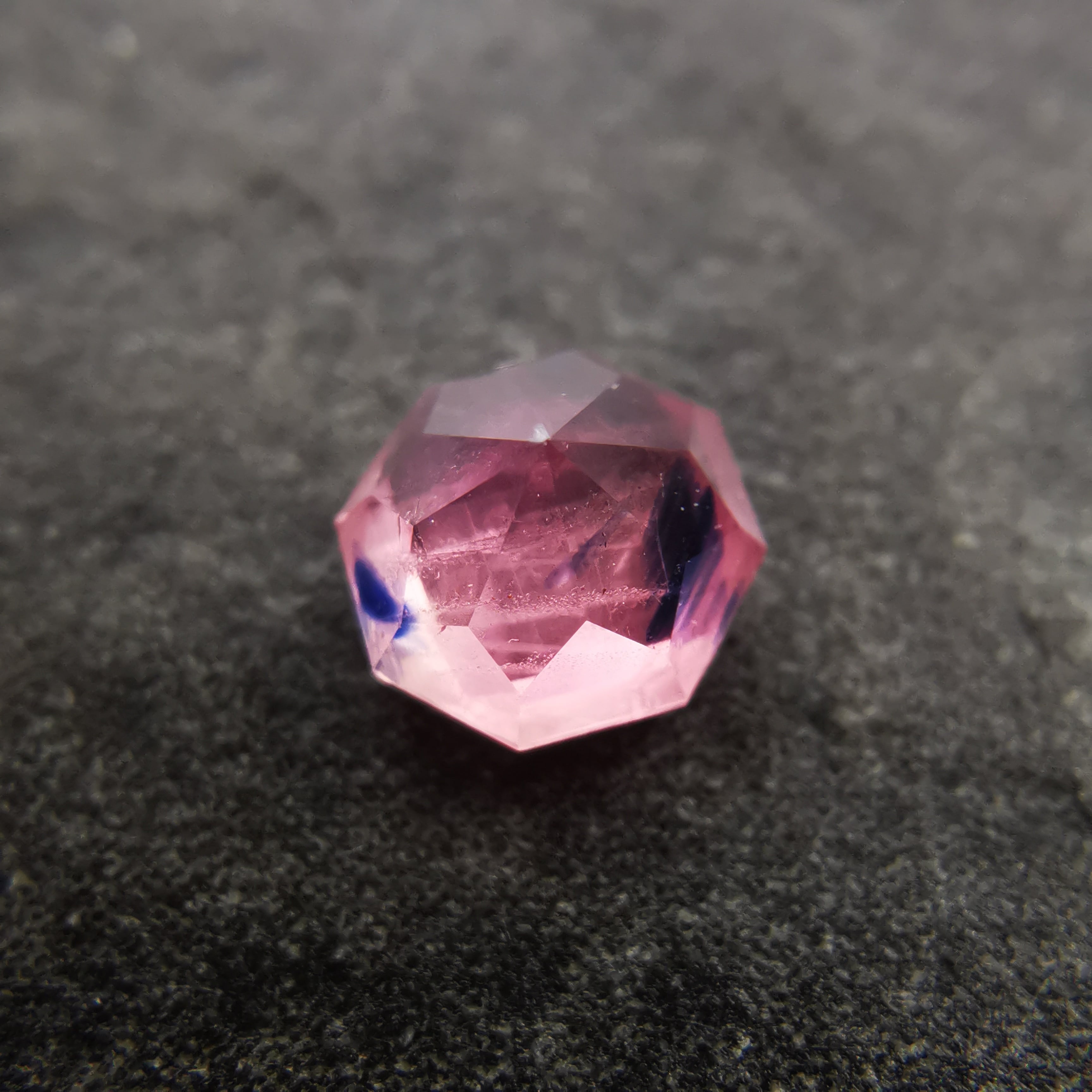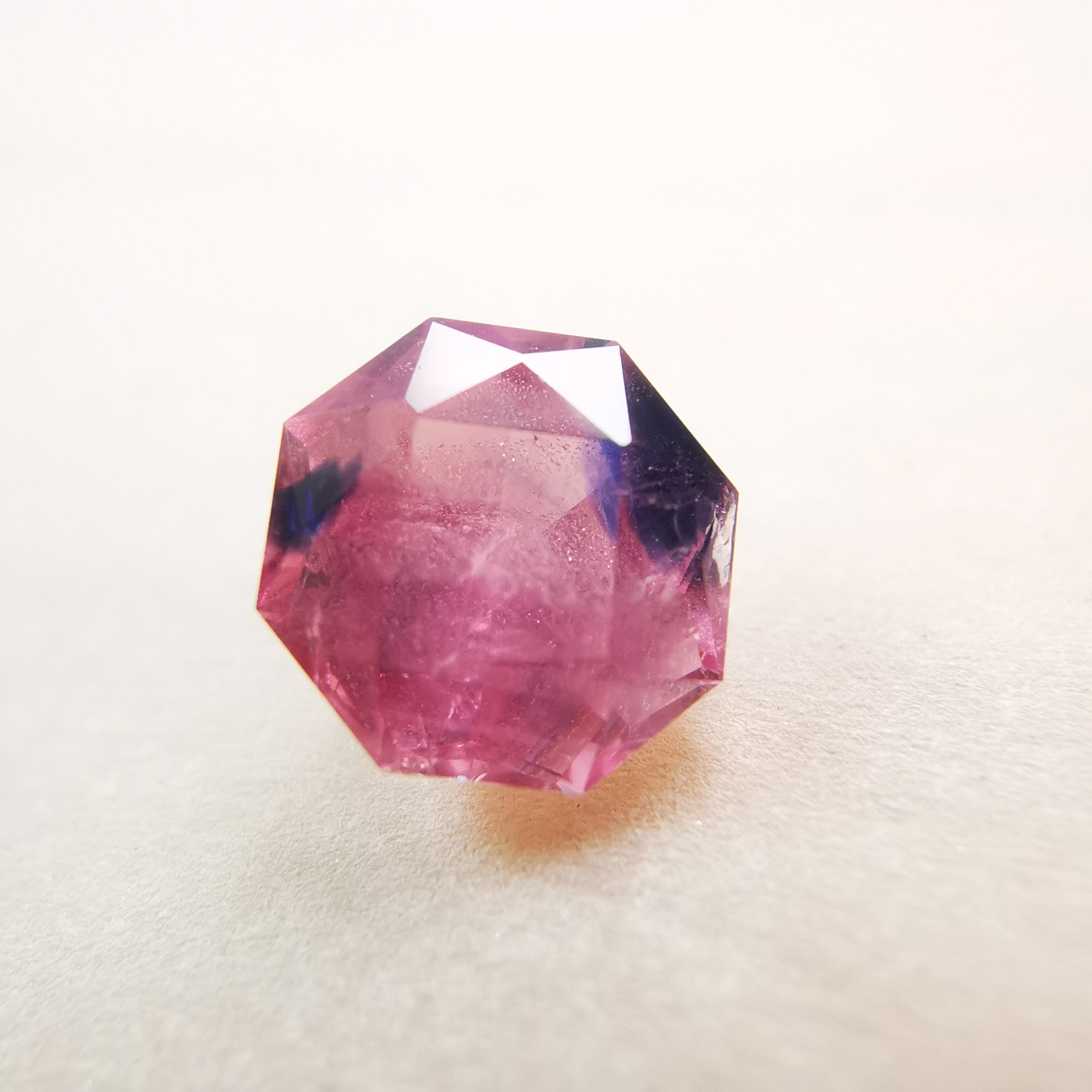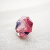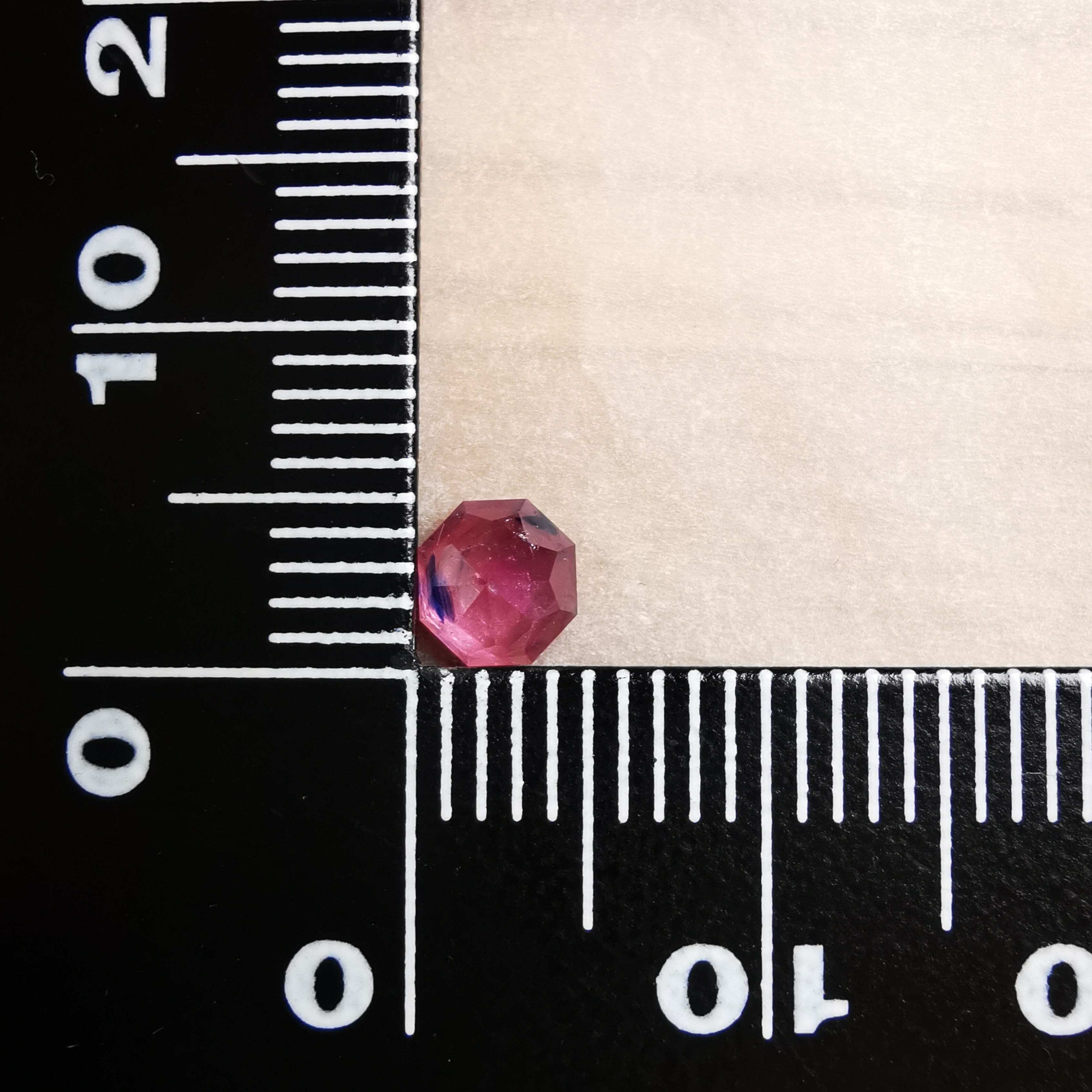 もやっとした石の中から、チェリーピンクがきらめき、ちょんと二か所入った濃いブルーが主張するサファイアです。